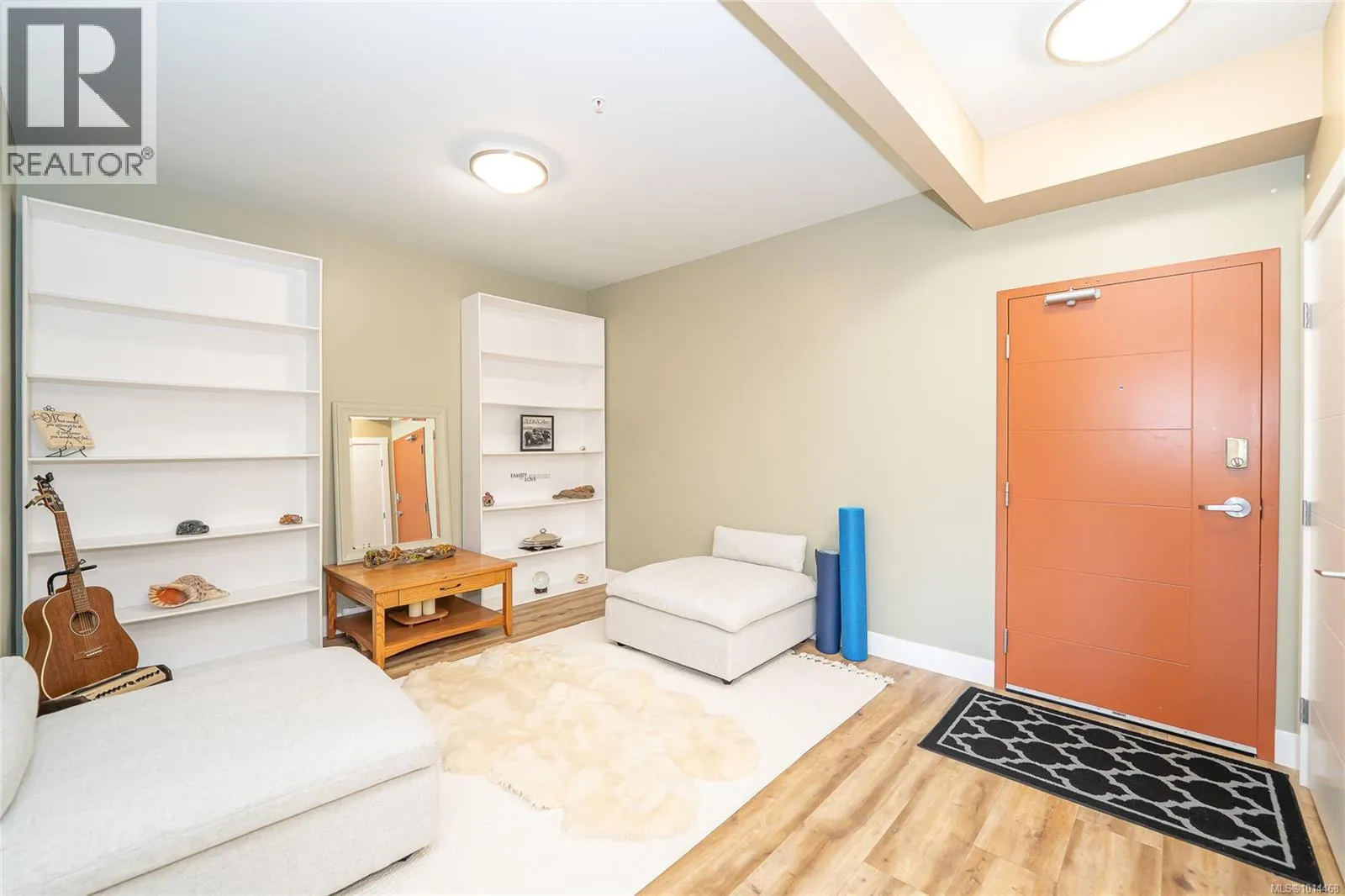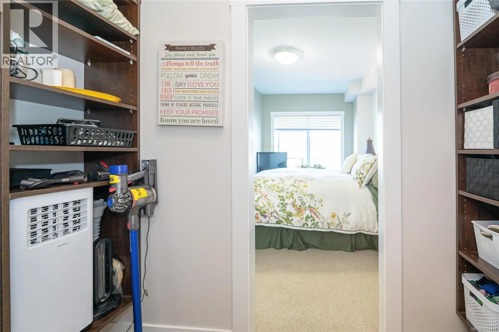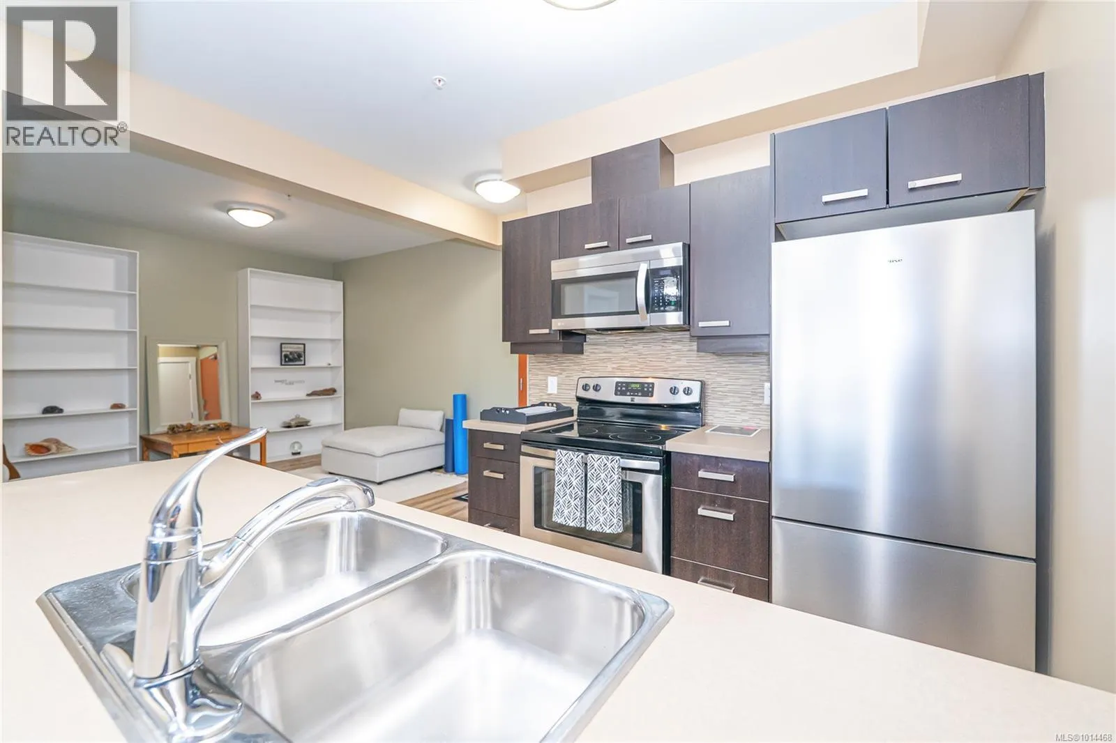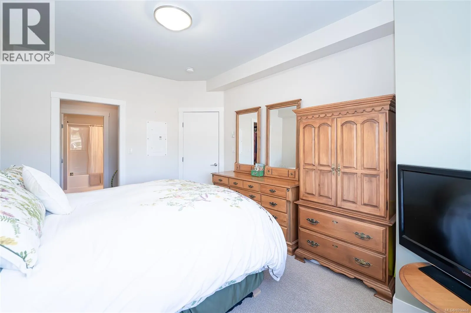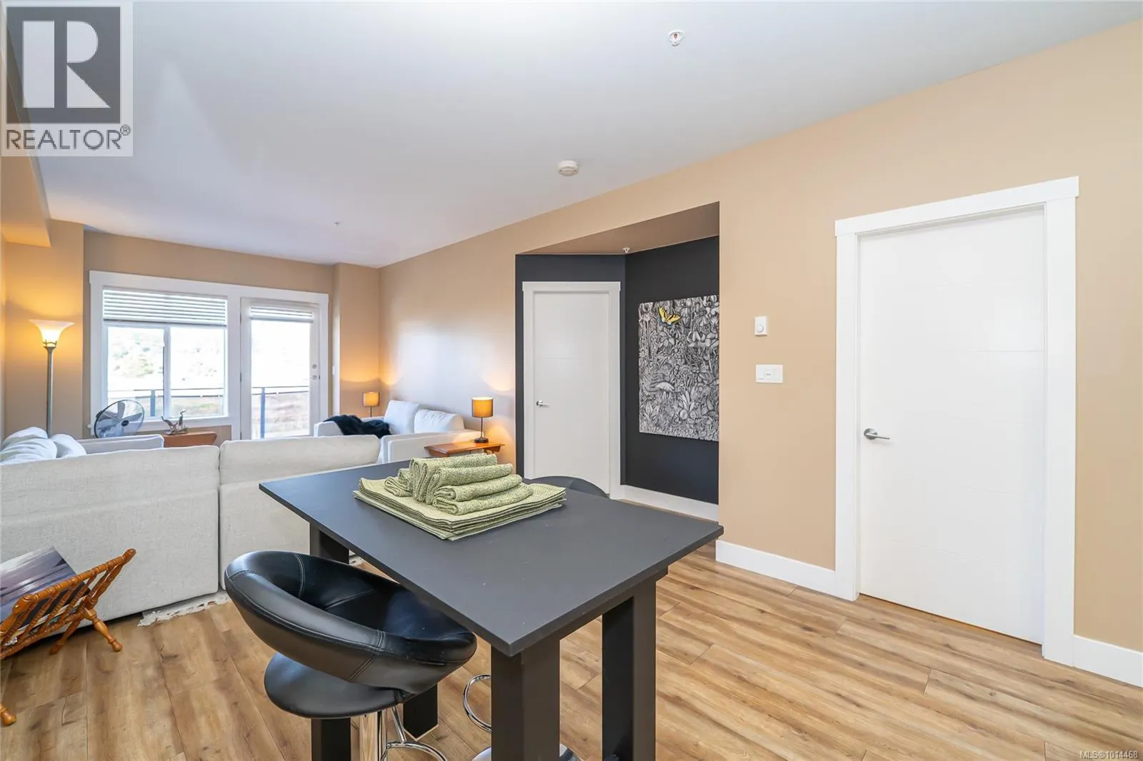 Captivating Sunset Views of Mt. Prevost! This beautiful bright 960 sq. ft. corner condo combines affordability and style with no age restriction, a low strata fee, and flexible rental optionsâideal for investors, first-time buyers, or downsizers. The contemporary 1-bedroom + den layout features 9' ceilings, wide-plank flooring, and a sleek kitchen with eating bar. The bedroom offers a walk-in closet and easy access to the 4-piece bath, while the den is perfect for an office, studio, or guest space. Extras include in-suite laundry, a large storage room with newer hot water tank, built in shelving for storage, and a sunny west-facing balcony to soak in those sunsets. The Rossco provides secure entry and parking, bike storage, a gym, and a rooftop patio for BBQs or gardening. Cats and dogs welcome (no size limit). Walk to the rec centre, library, theatre, VIU, shops, and diningâthis home truly checks all the boxes! (id:27476)