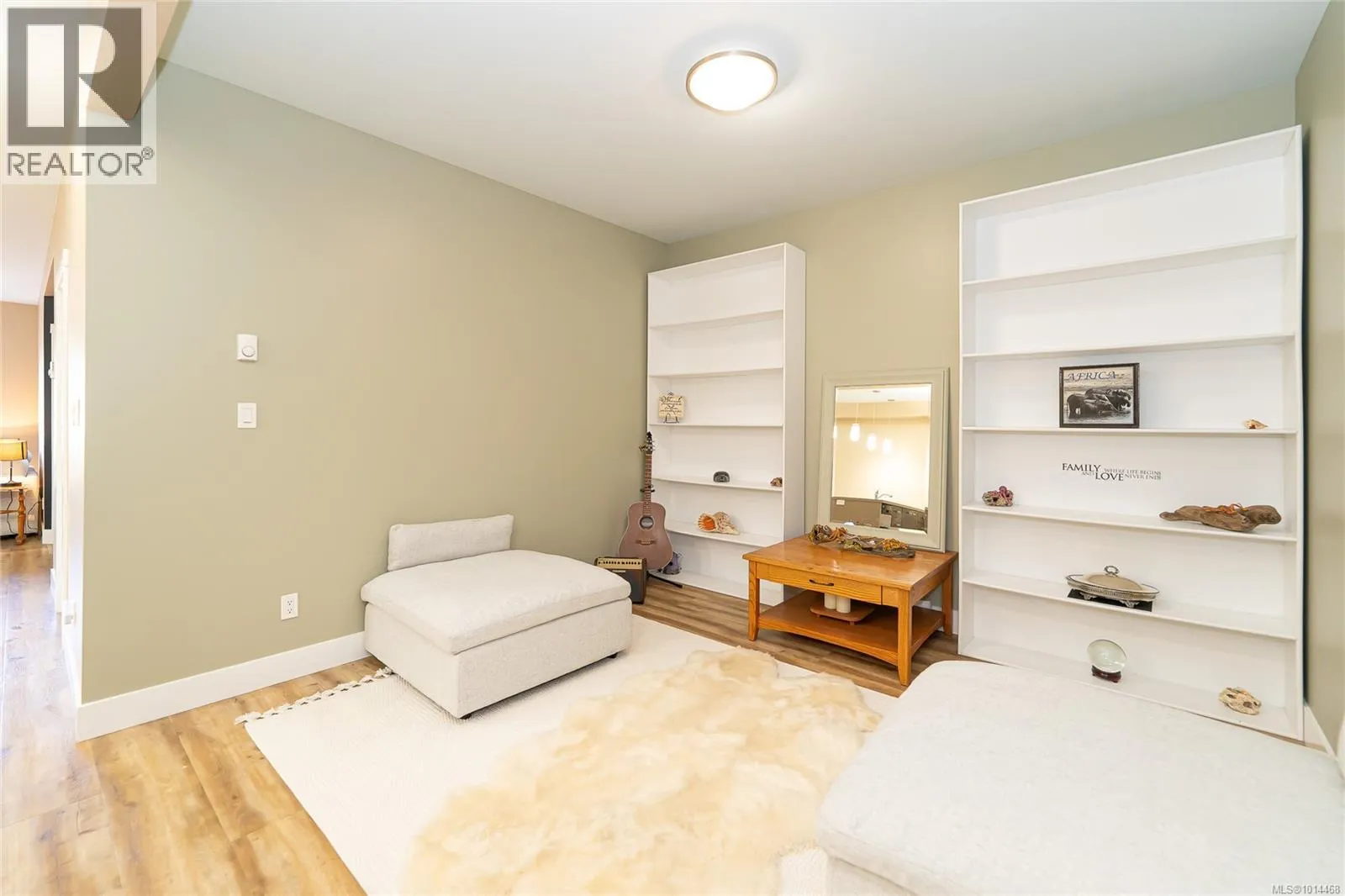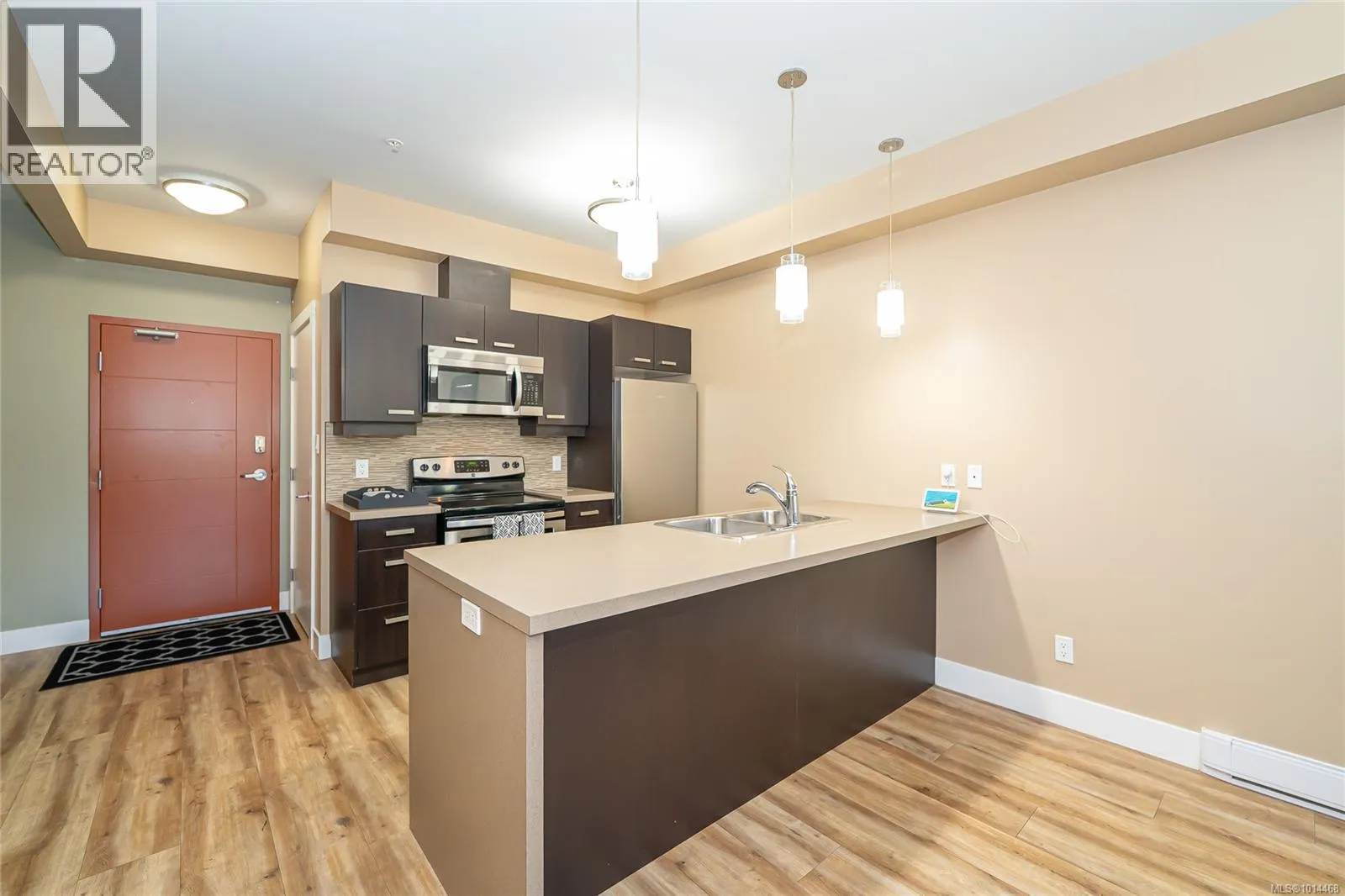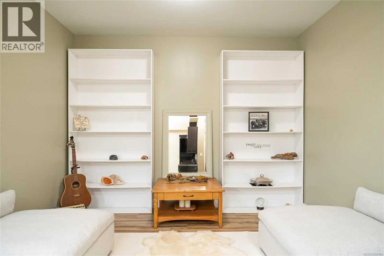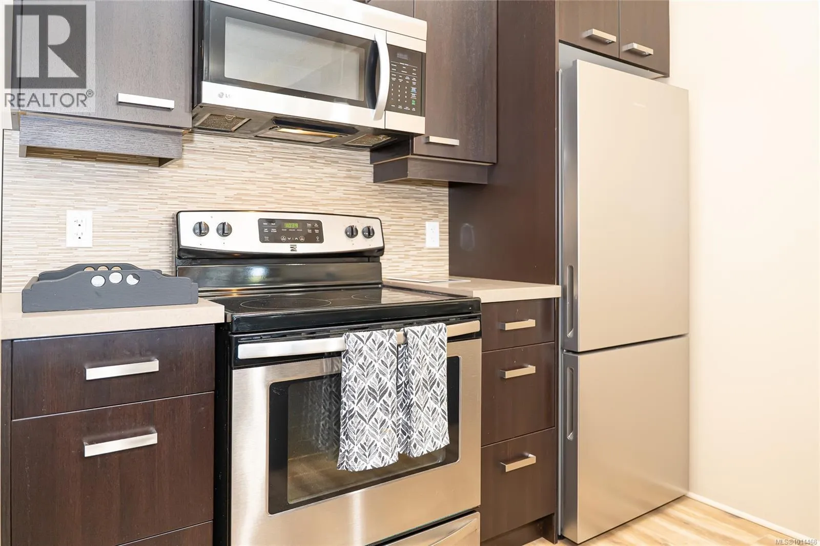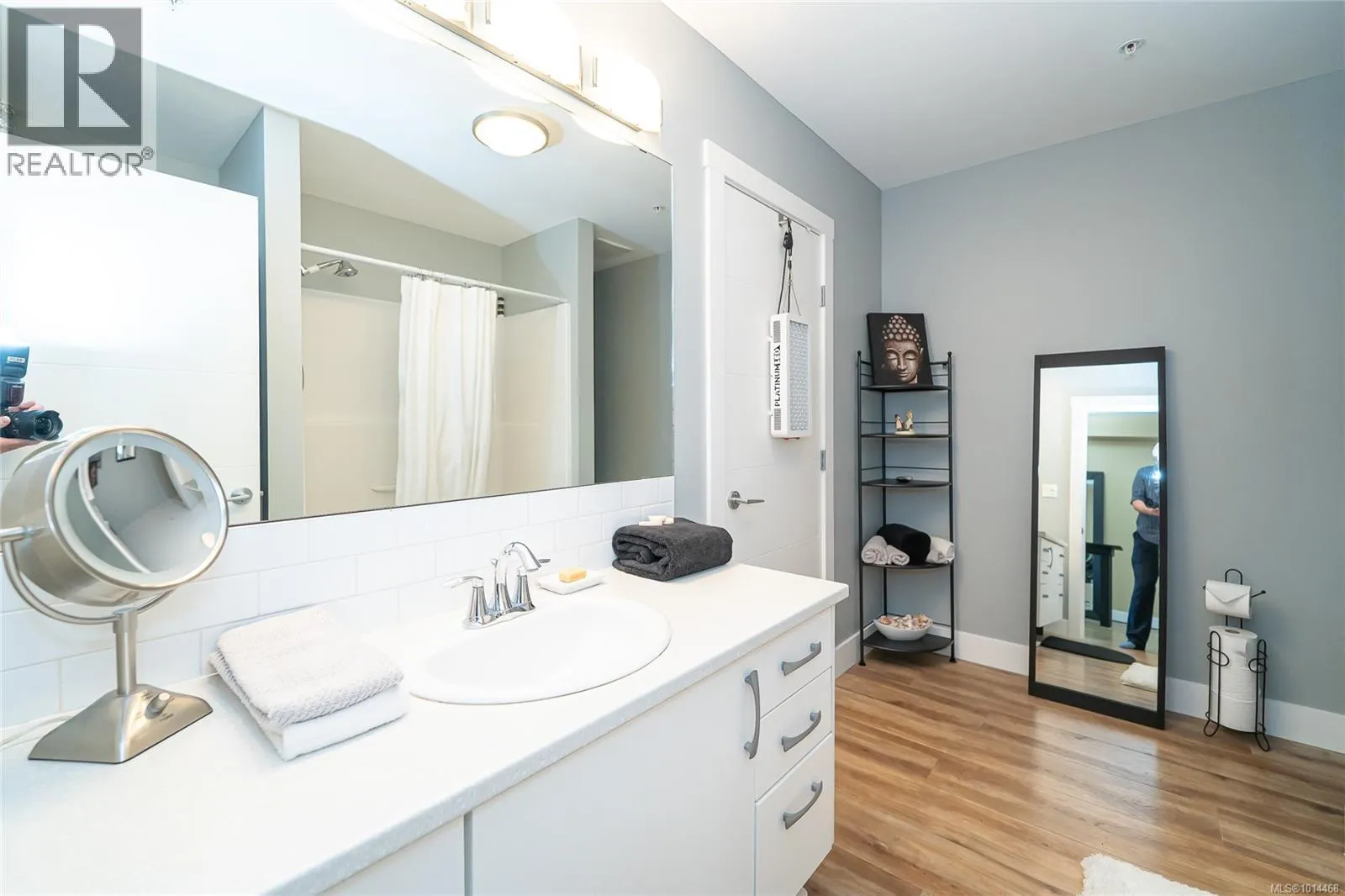 Captivating Sunset Views of Mt. Prevost! This beautiful bright 960 sq. ft. corner condo combines affordability and style with no age restriction, a low strata fee, and flexible rental optionsâideal for investors, first-time buyers, or downsizers. The contemporary 1-bedroom + den layout features 9' ceilings, wide-plank flooring, and a sleek kitchen with eating bar. The bedroom offers a walk-in closet and easy access to the 4-piece bath, while the den is perfect for an office, studio, or guest space. Extras include in-suite laundry, a large storage room with newer hot water tank, built in shelving for storage, and a sunny west-facing balcony to soak in those sunsets. The Rossco provides secure entry and parking, bike storage, a gym, and a rooftop patio for BBQs or gardening. Cats and dogs welcome (no size limit). Walk to the rec centre, library, theatre, VIU, shops, and diningâthis home truly checks all the boxes! (id:27476)