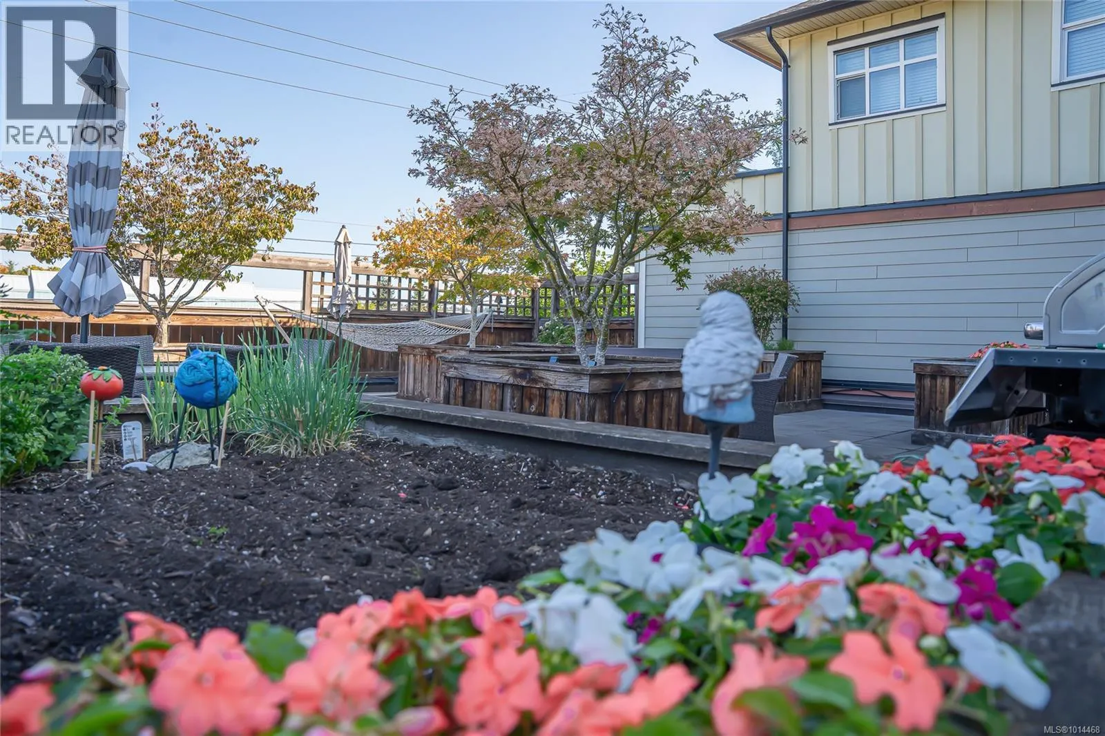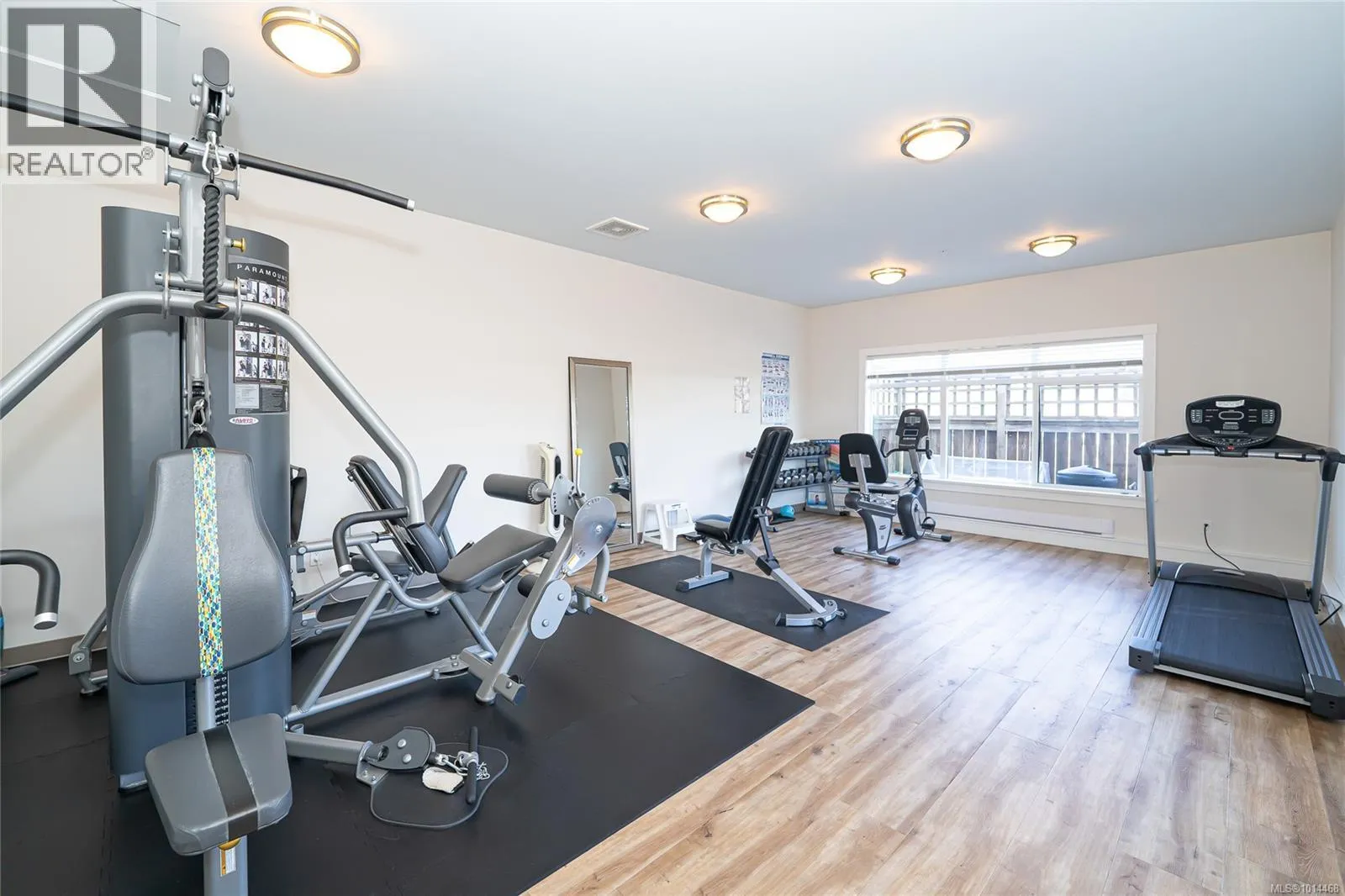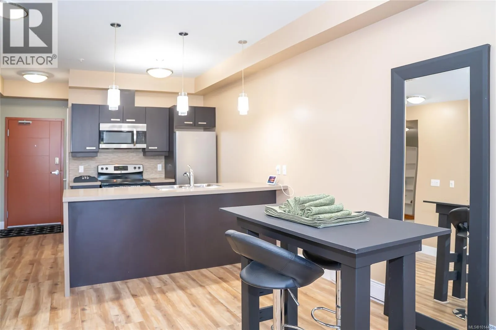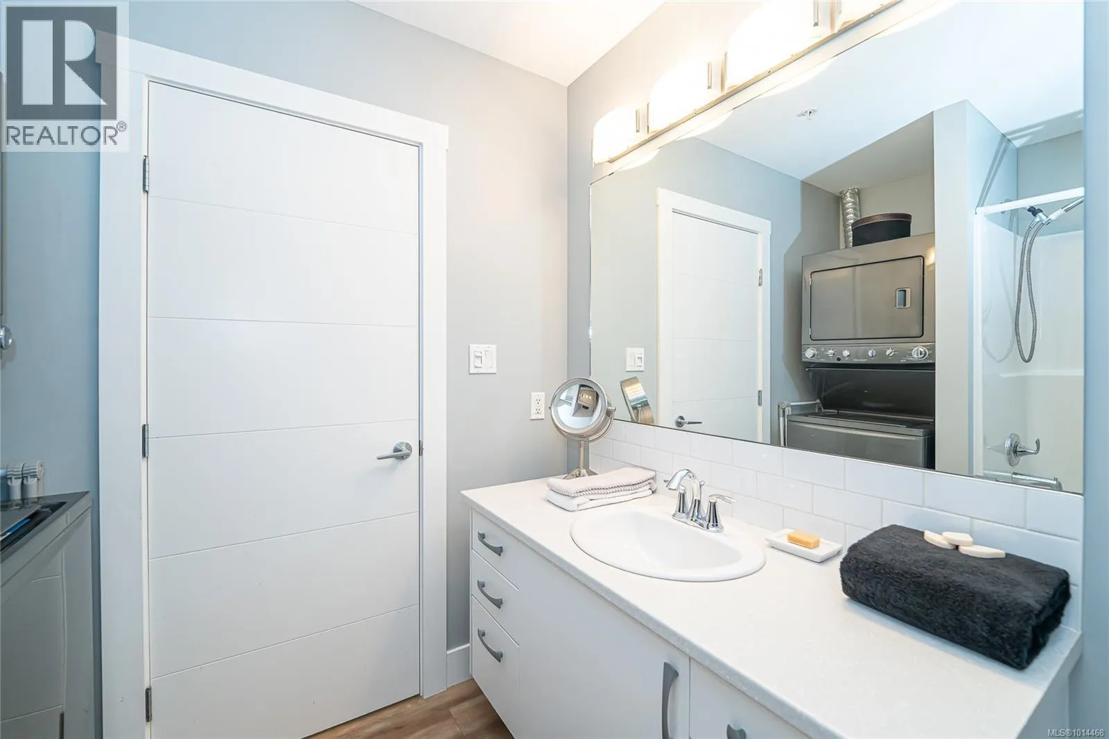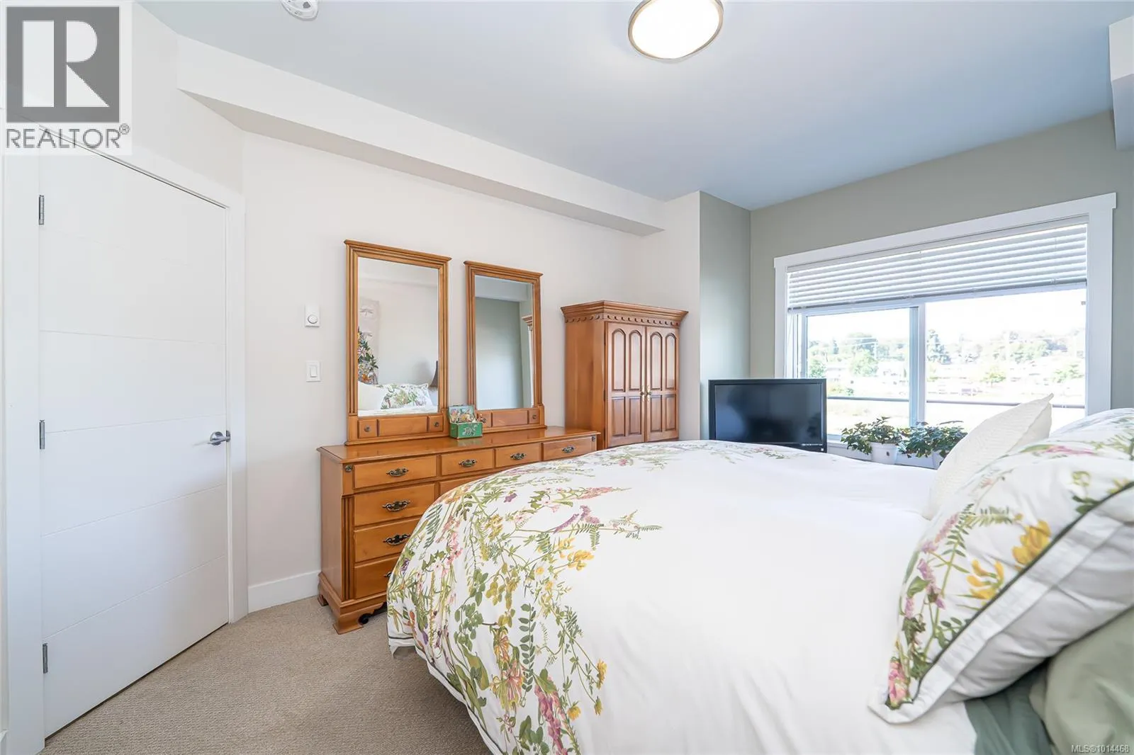 Captivating Sunset Views of Mt. Prevost! This beautiful bright 960 sq. ft. corner condo combines affordability and style with no age restriction, a low strata fee, and flexible rental optionsâideal for investors, first-time buyers, or downsizers. The contemporary 1-bedroom + den layout features 9' ceilings, wide-plank flooring, and a sleek kitchen with eating bar. The bedroom offers a walk-in closet and easy access to the 4-piece bath, while the den is perfect for an office, studio, or guest space. Extras include in-suite laundry, a large storage room with newer hot water tank, built in shelving for storage, and a sunny west-facing balcony to soak in those sunsets. The Rossco provides secure entry and parking, bike storage, a gym, and a rooftop patio for BBQs or gardening. Cats and dogs welcome (no size limit). Walk to the rec centre, library, theatre, VIU, shops, and diningâthis home truly checks all the boxes! (id:27476)
