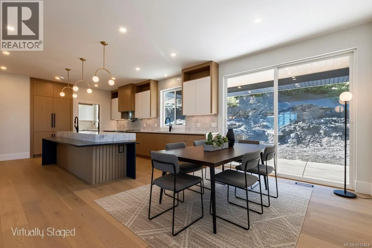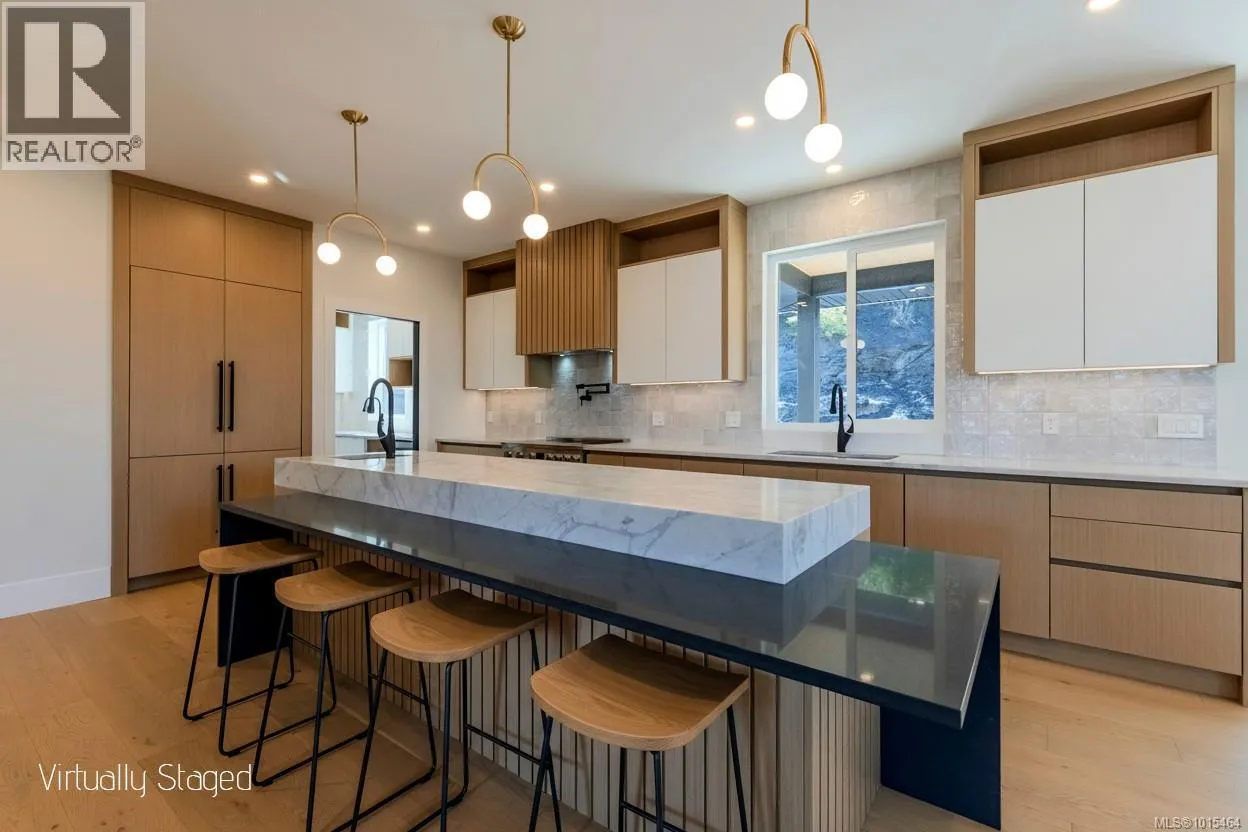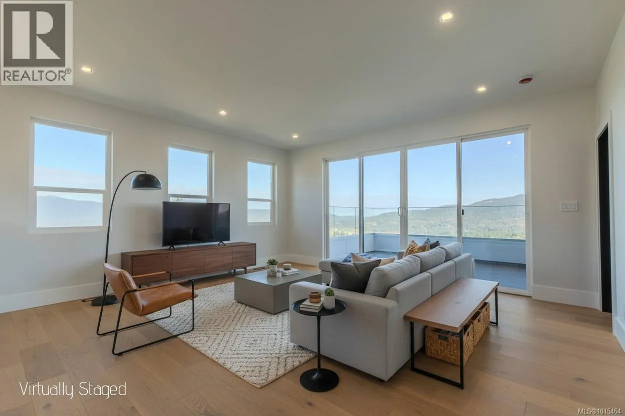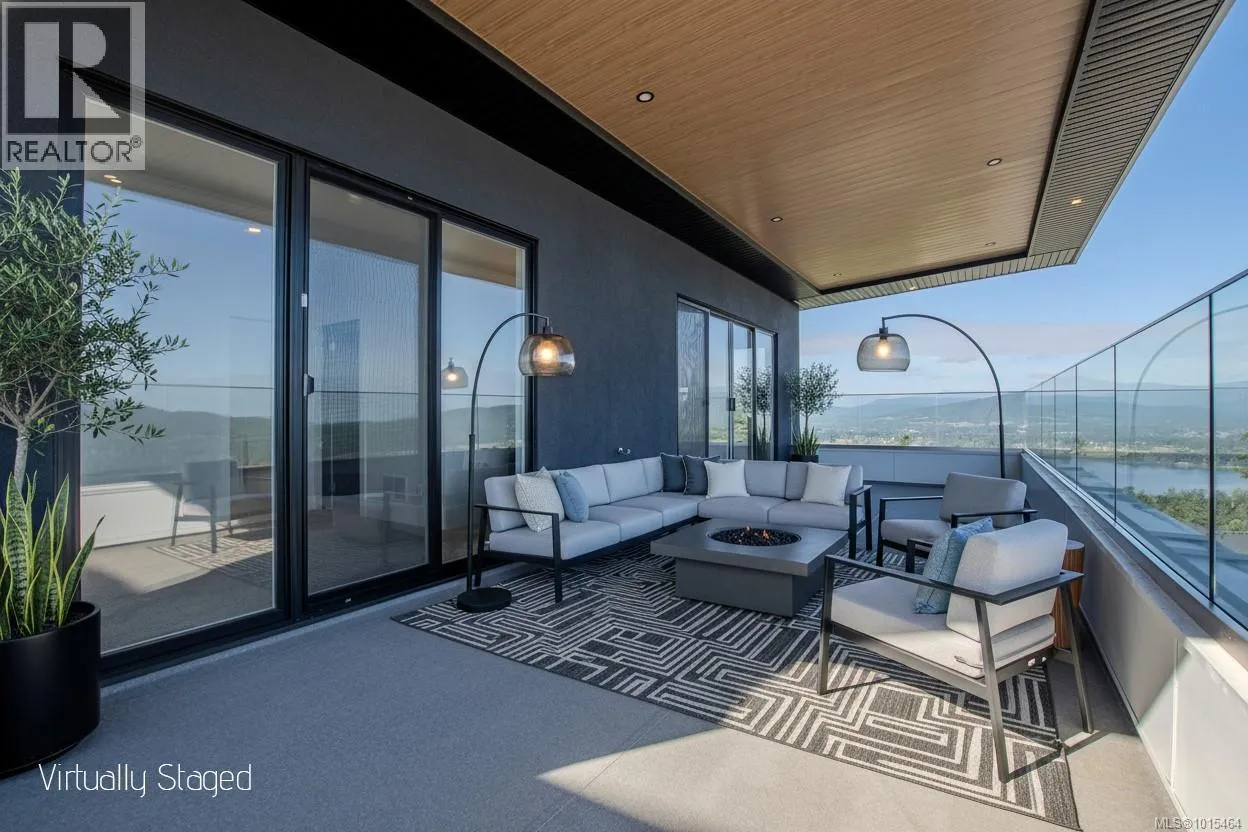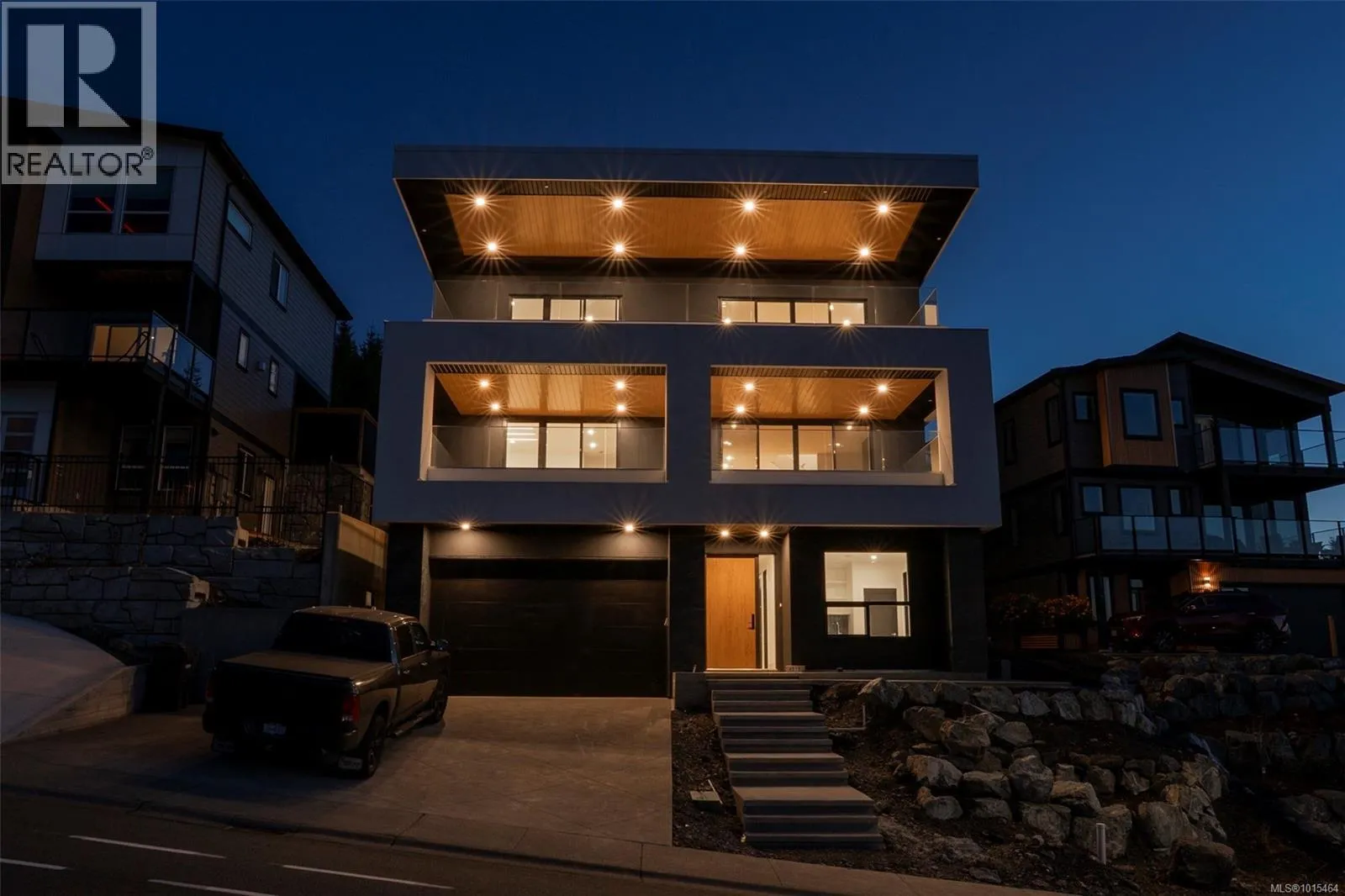 The Sky Houseâan executive-class residence in the prestigious Kingsview subdivisionâis now complete and ready to welcome its first owners. Offering over 4,000 sq. ft. of beautifully finished living space including a 722 sq. ft. 2-bedroom legal suite, and views to die for, this home delivers luxury, function, and income potential all in one. The main floor is anchored by the chefâs kitchen with walk-in butlerâs pantry. The expansive island has a unique waterfall quartz countertop with a prep sink and seating for 5. Top-end appliances, including a Dacor fridge and Electrolux induction range, bar fridge and dishwasher. Stunning cabinetry with face matched fridge, dishwasher and hood fan; tile backsplash with pot filler for convenience. The kitchen flows effortlessly to the dining and living room. The living room features herringbone engineered hardwood floors, gas fireplace with floor-to-ceiling tiled hearth and custom cabinetry, including a convenient computer station. The primary suite has custom integrated ceiling lighting a spa-inspired 5-piece ensuite with a glass-walled shower, rain shower head and an automated smart toilet, and walk-in closet. Upstairs, three generous bedrooms (two with walk-in closets, one with its own ensuite) surround a spacious lounge/TV area, making it the perfect family hub. Sliding glass doors lead to the huge 12â X 34â deck with the extraordinary views and the striking cantilevered roof. The lower level offers a media/office room with custom wet bar and heated tile floors. There is also a 3-piece bath with glass walled shower and access to the double garage. Also on the lower lever there is a fully self-contained 2-bedroom legal suite with its own private entrance and in-suite laundry. With breathtaking views, high-end finishes throughout, a prime location near town and Maple Bay, and a thoughtfully designed legal suite, The Sky House is a rare opportunity to own one of Kingsviewâs finest homes. (id:27476)