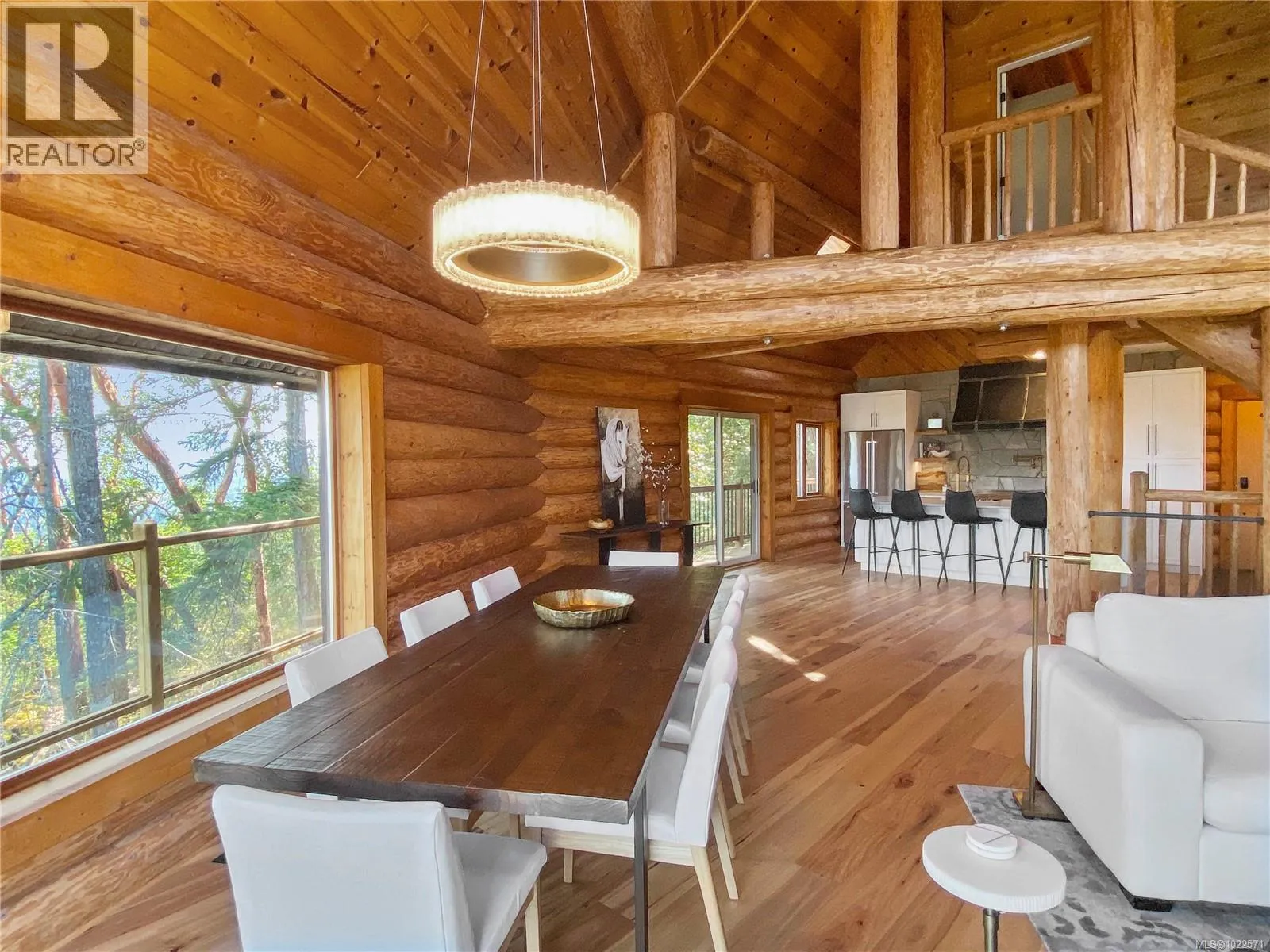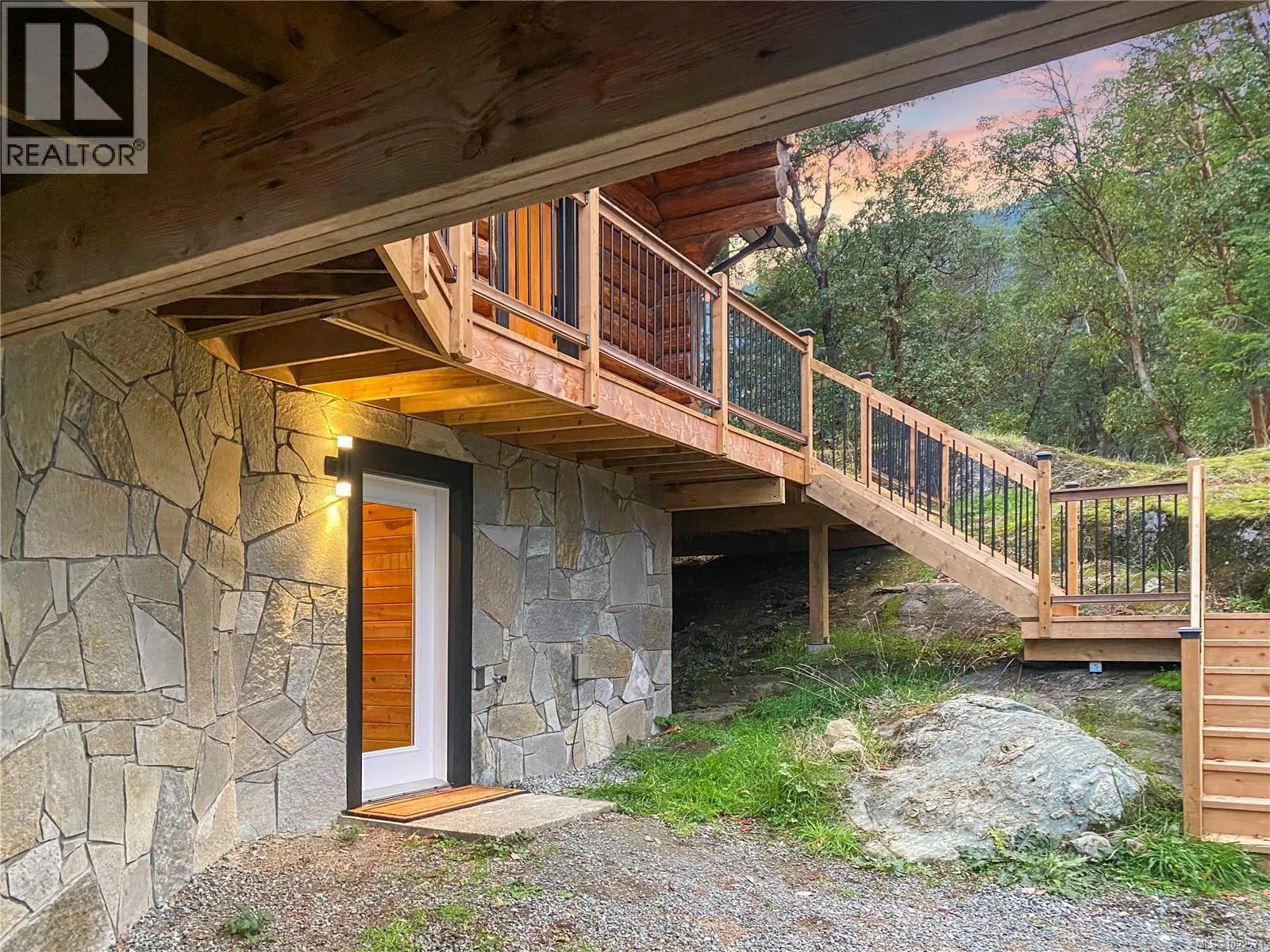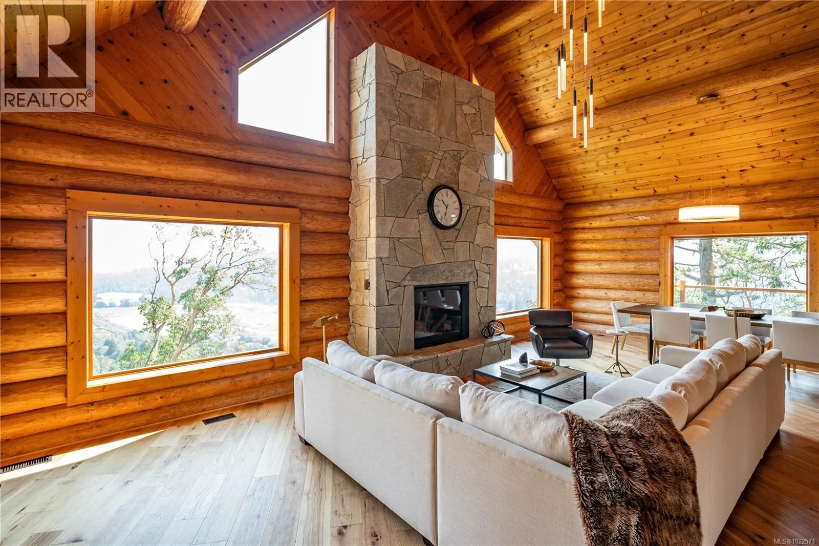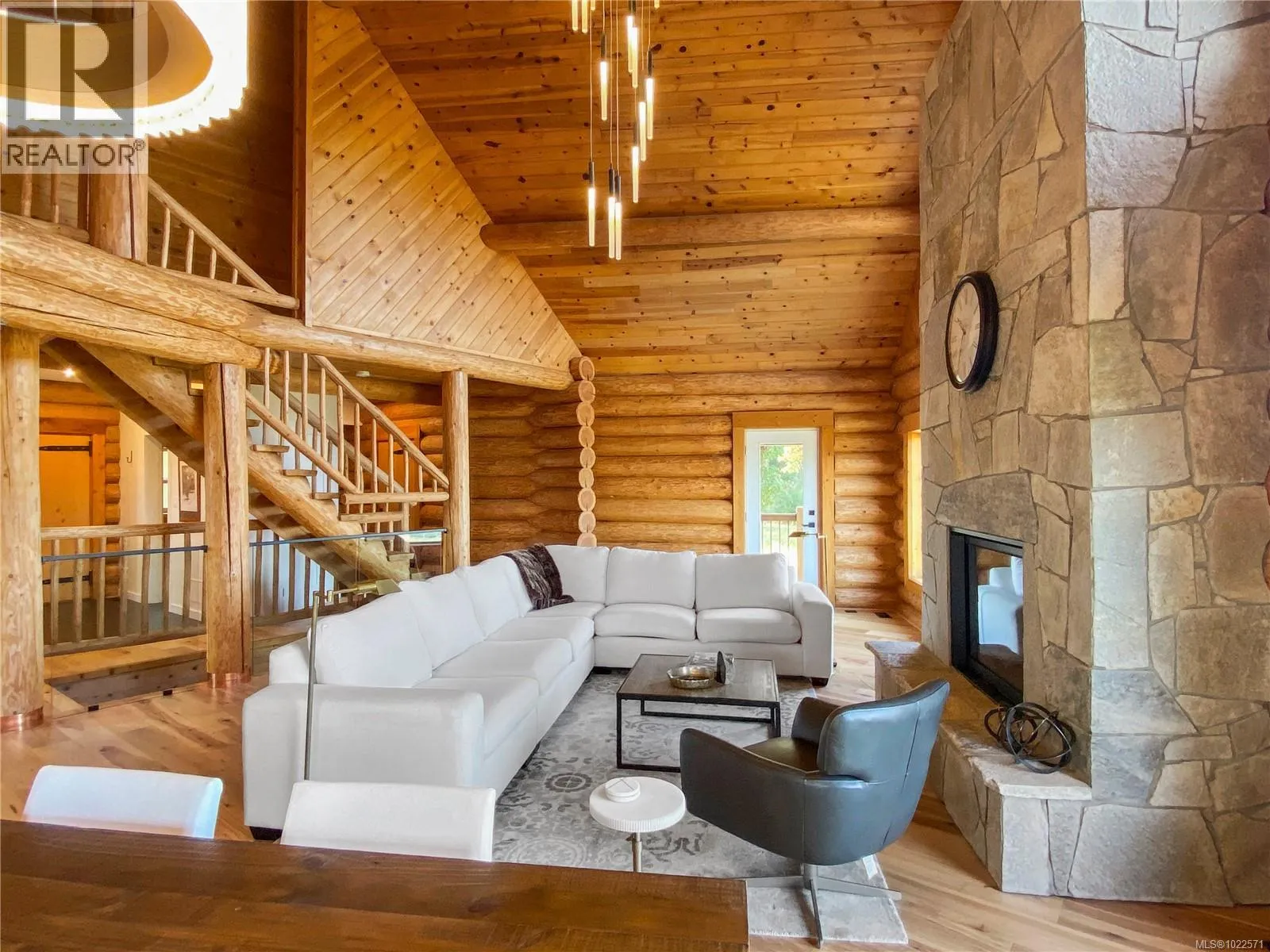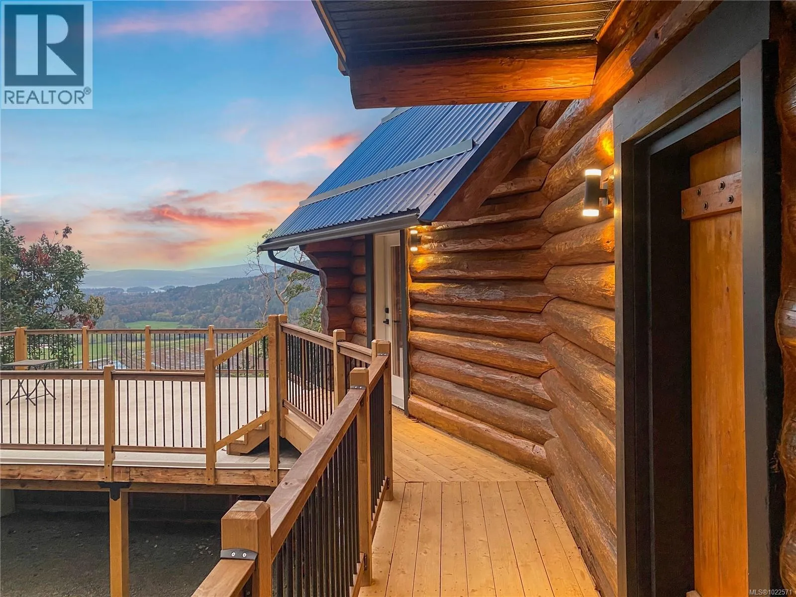 Set high above Vancouver Islandâs breathtaking terrain, this exceptional 16+ acre property offers uninterrupted views of the ocean, forested valleys, and distant mountain peaks. The fully updated 3-bedroom, 2.5-bath log home blends authentic West Coast character with sophisticated modern comforts. Inside, dramatic vaulted ceilings, warm hardwood floors, and a cozy fireplace create an inviting main level designed for both comfort and connection, perfect for hosting. The open-concept kitchen, living, and dining areas are complemented by quartz countertops, maple cabinetry, and refined custom finishes that elevate everyday living and entertaining alike. Upstairs, the primary suite is a peaceful escape featuring a spa-inspired ensuite and a freestanding soaker tub strategically placed to enjoy the sweeping valley-to-ocean vistas. The Lower level offers 2 bedrooms, 4 piece bath and large den/living room! Expansive decks provide the ideal setting to unwind, entertain, or simply soak in the natural beauty that surrounds you. Whether envisioned as a private forever home or an exceptional opportunity with tremendous revenue potential, this is a truly rare offering where privacy, views, and lifestyle come together seamlessly. (id:27476)