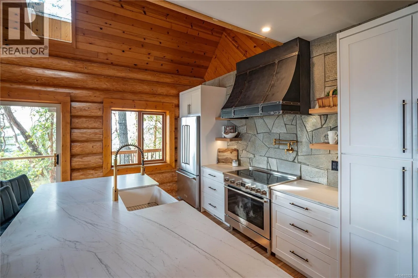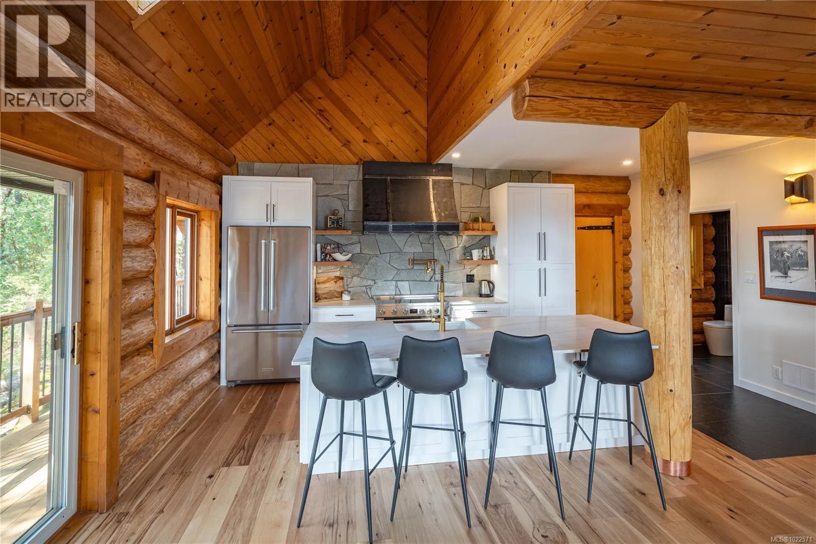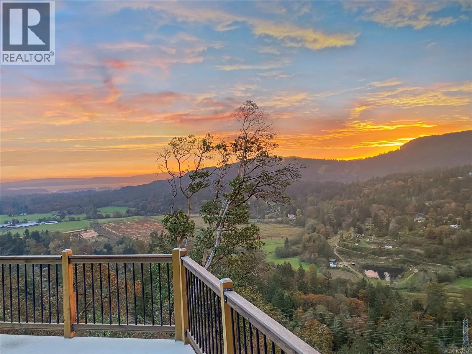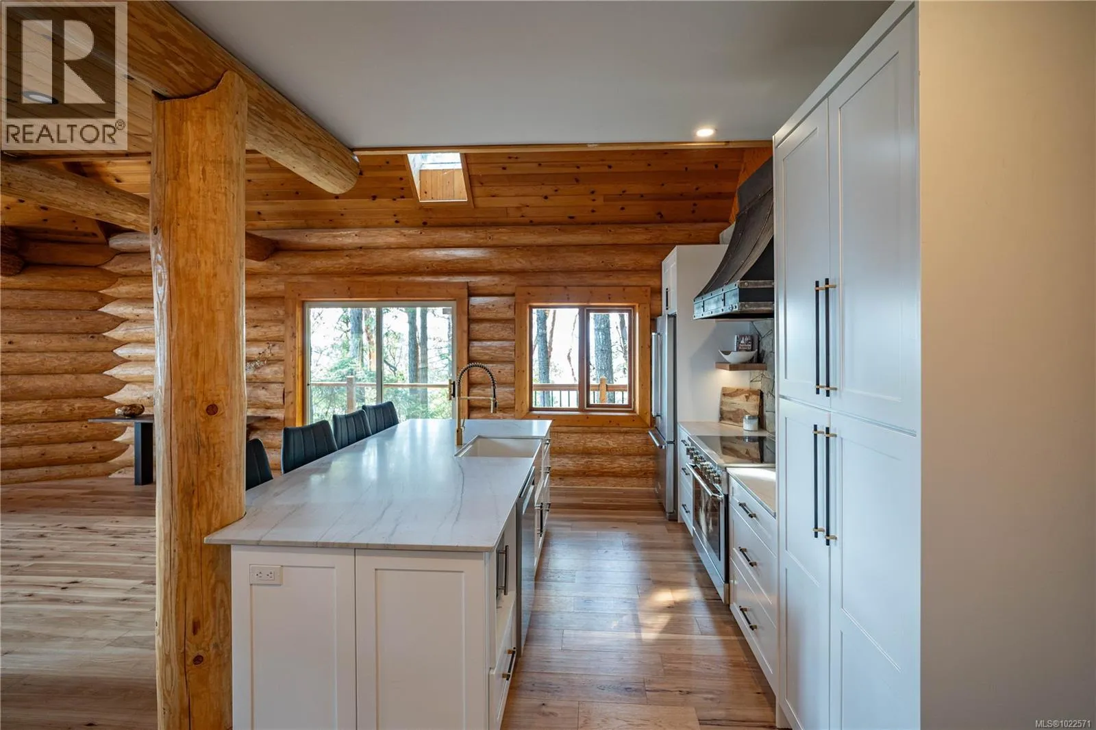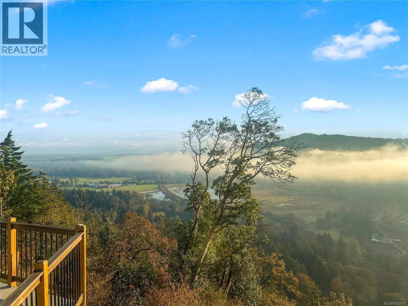 Set high above Vancouver Islandâs breathtaking terrain, this exceptional 16+ acre property offers uninterrupted views of the ocean, forested valleys, and distant mountain peaks. The fully updated 3-bedroom, 2.5-bath log home blends authentic West Coast character with sophisticated modern comforts. Inside, dramatic vaulted ceilings, warm hardwood floors, and a cozy fireplace create an inviting main level designed for both comfort and connection, perfect for hosting. The open-concept kitchen, living, and dining areas are complemented by quartz countertops, maple cabinetry, and refined custom finishes that elevate everyday living and entertaining alike. Upstairs, the primary suite is a peaceful escape featuring a spa-inspired ensuite and a freestanding soaker tub strategically placed to enjoy the sweeping valley-to-ocean vistas. The Lower level offers 2 bedrooms, 4 piece bath and large den/living room! Expansive decks provide the ideal setting to unwind, entertain, or simply soak in the natural beauty that surrounds you. Whether envisioned as a private forever home or an exceptional opportunity with tremendous revenue potential, this is a truly rare offering where privacy, views, and lifestyle come together seamlessly. (id:27476)