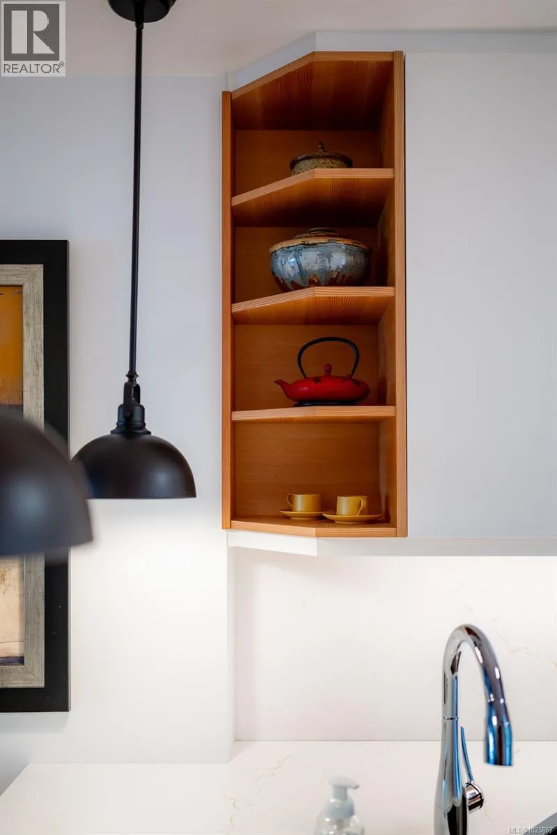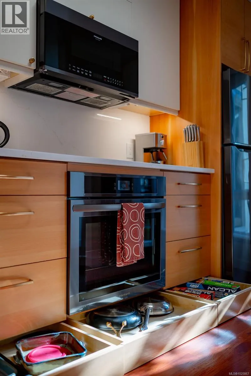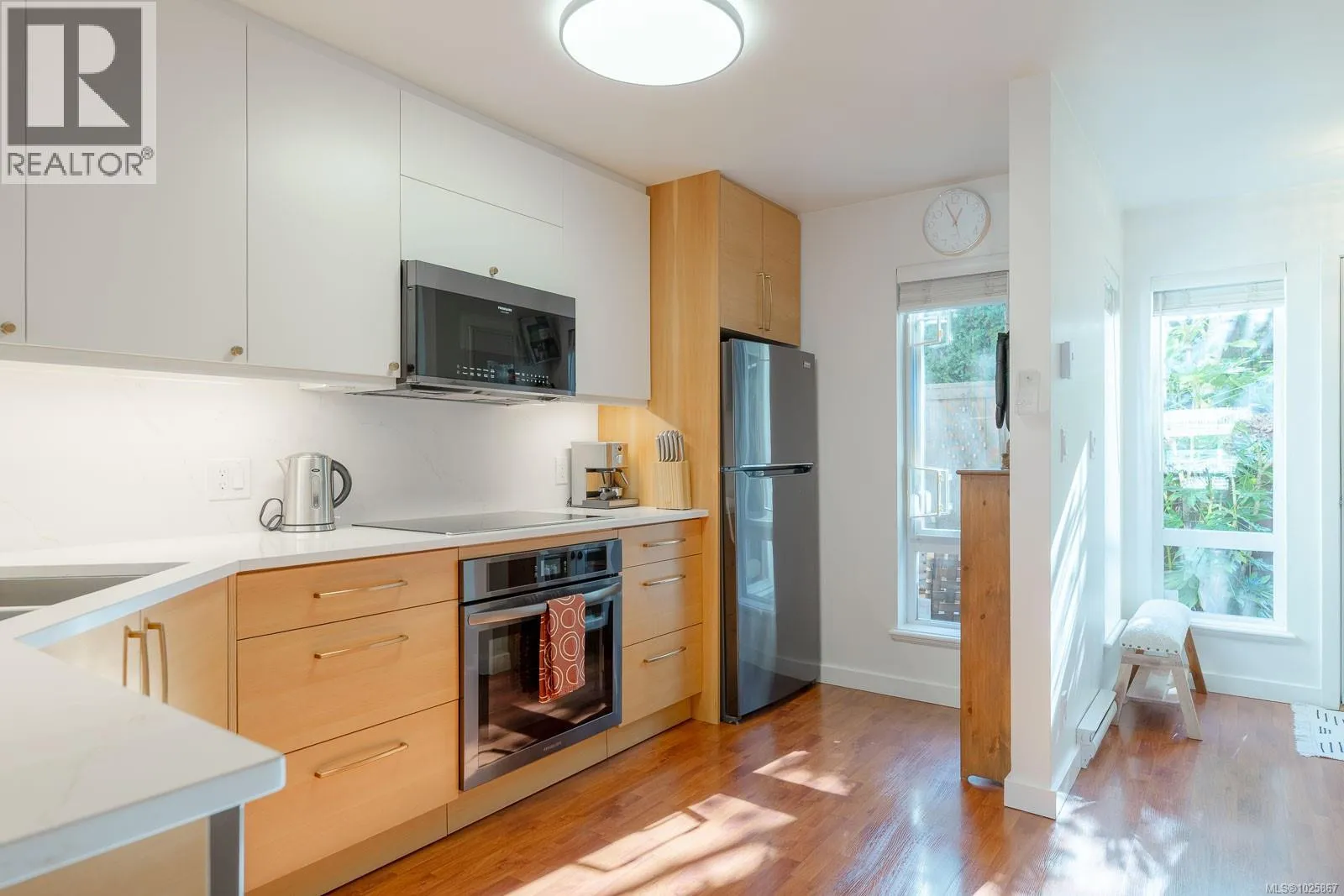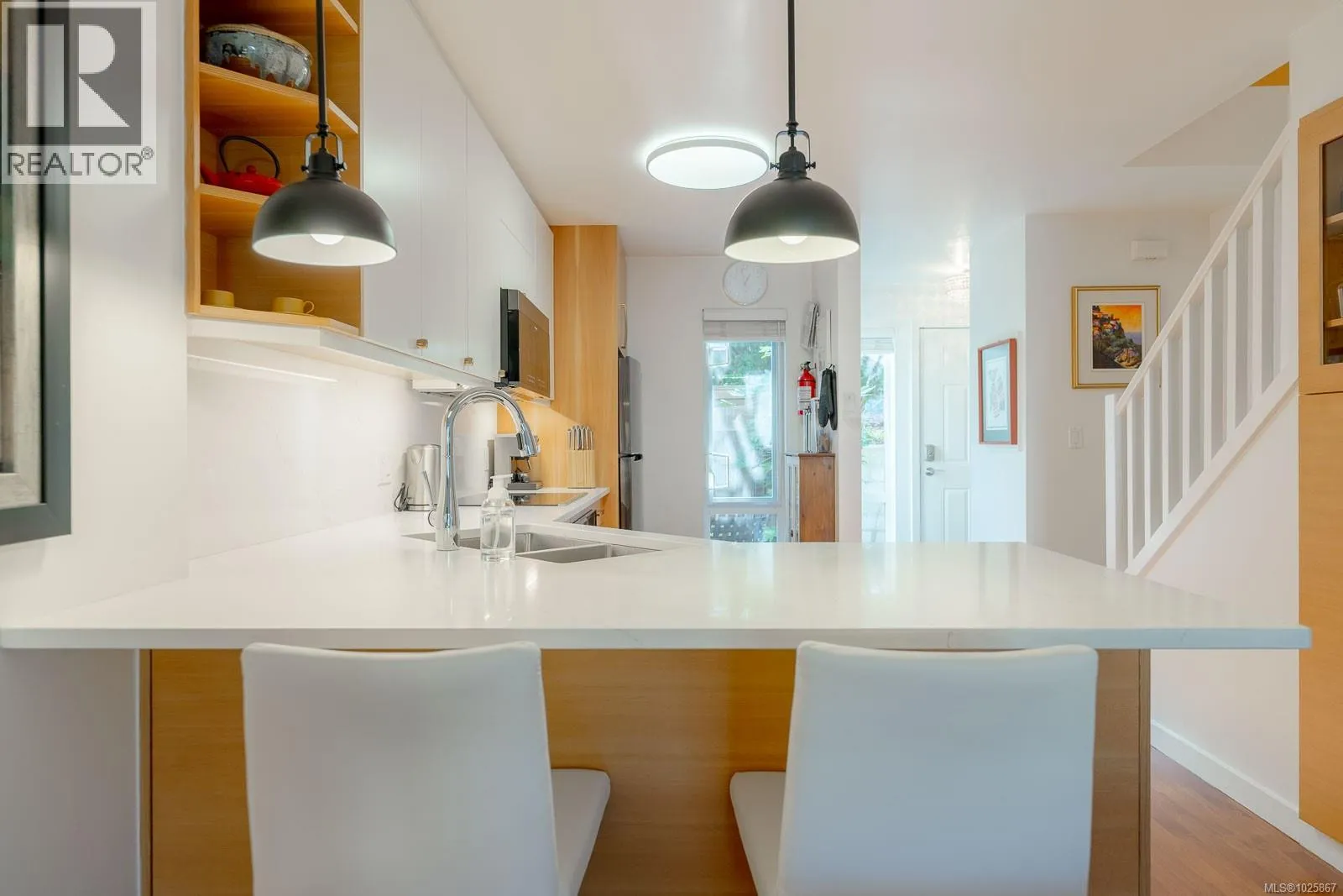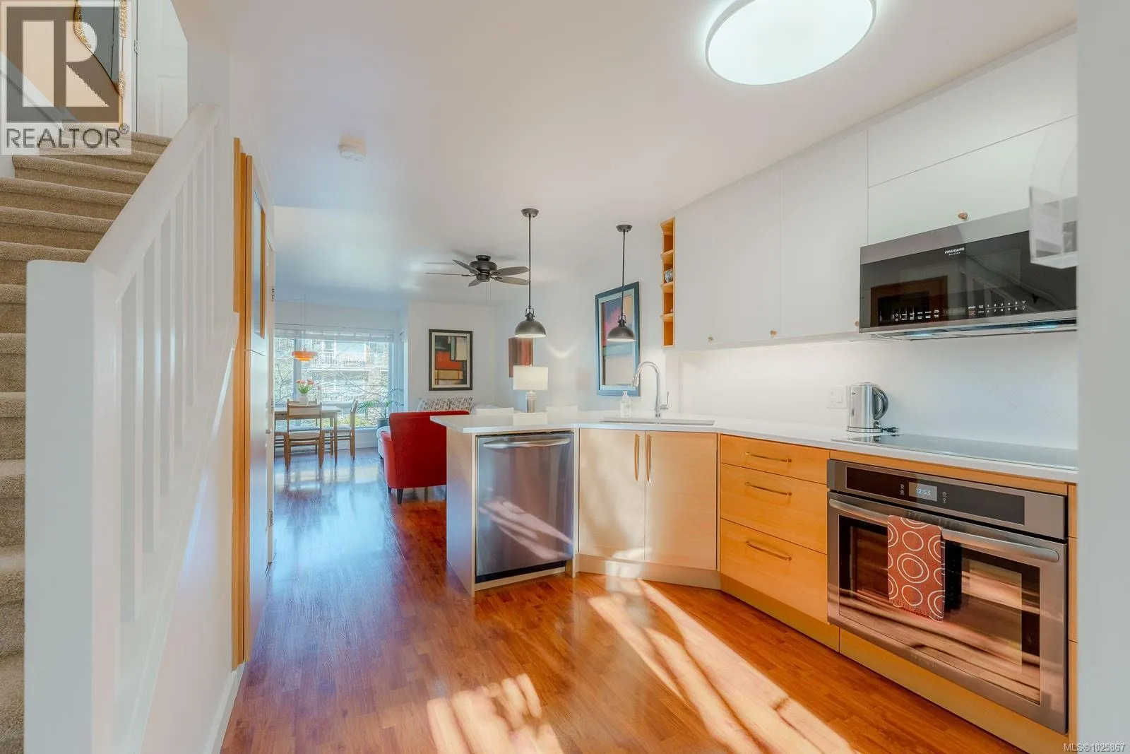 A contemporary urban two-level townhouse in the heart of Duncan, artfully designed to capture maximum sunlight throughout the day. Clean architectural lines and expansive windows create a bright, uplifting atmosphere that feels both modern and welcoming.The newly reimagined chef-style kitchen is a true centerpiece, featuring sleek quartz countertops, touch-to-open cabinetry and drawers, and a painted valence with slim under-cabinet lighting. An 18 gauge double sink, new designer lighting, and premium appliancesâincluding an induction cooktop and convection ovenâcomplement the sit up peninsula, perfect for casual dining or entertaining.The open-concept living room is airy and spacious, ideal for relaxed evenings or lively gatherings. Upstairs, the primary bedroom offers soaring ceilings, clerestory windows, and a private balconyâan inviting retreat for morning coffee. The beautifully updated bathroom showcases a floating marble-top vanity, porcelain tile, and a dual-flush toilet. A second bedroom at the rear provides a peaceful sanctuary. Plush eco-friendly carpeting warms the bedrooms, hallway, and stairs, while easy-care laminate flooring enhances the main level. Additional features include an AC unit in the upper bedroom and high-quality new blinds throughout. Step outside to a fully fenced back patio set against a serene natural backdrop. With shopping, cafés, and newly installed bike lanes connecting to trail systems just beyond your door, this home offers refined living in an unbeatable location. (id:27476)