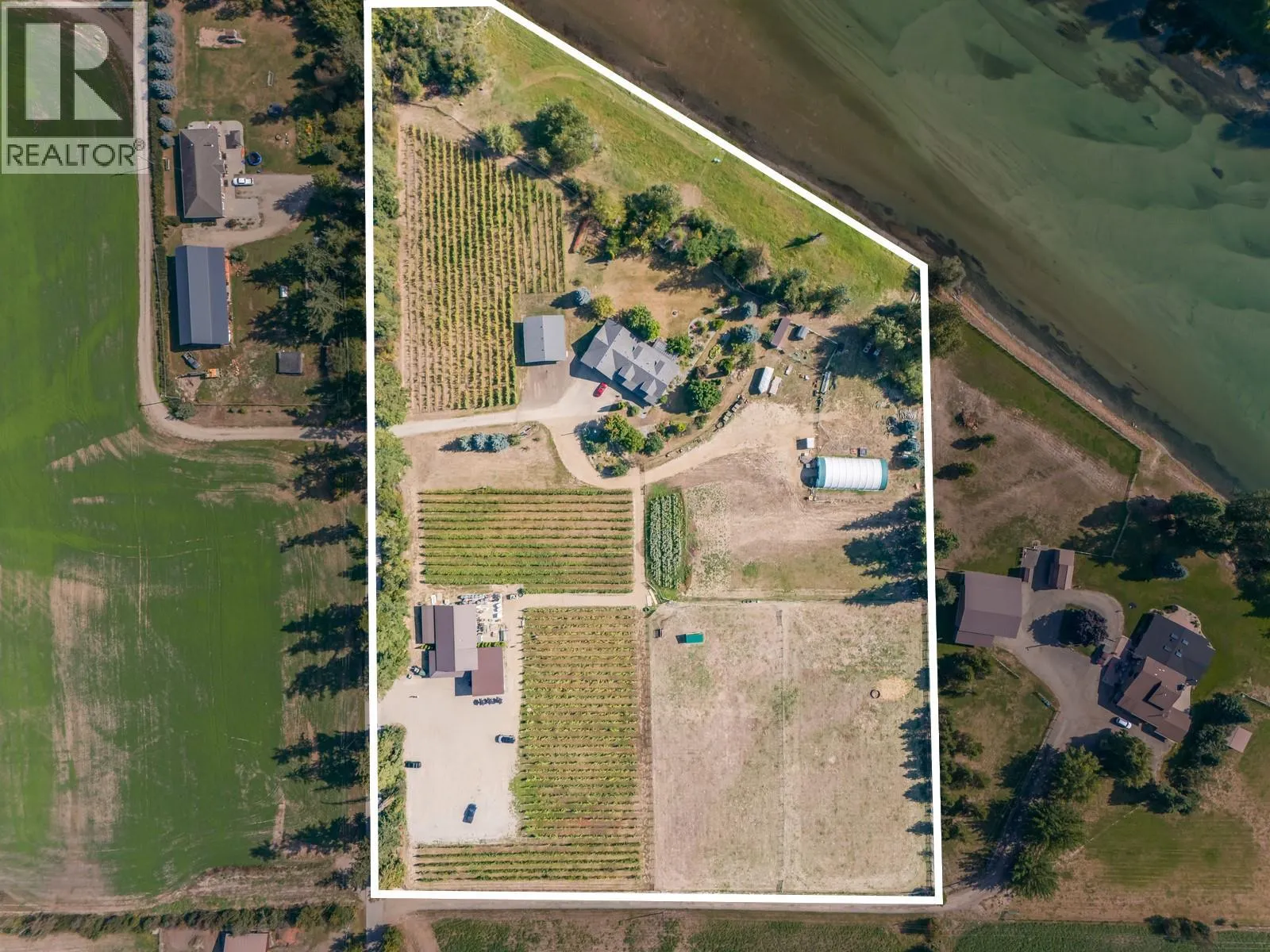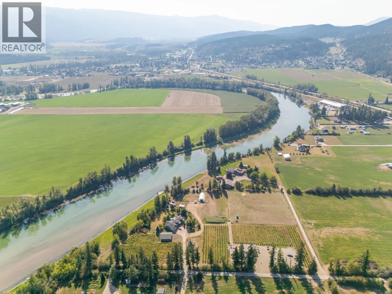 A once-in-a-generation riverfront estate set on 9.14 private acres along the Shuswap River! With over 500 feet of shoreline, breathtaking Enderby Cliff views, and complete privacy, this is a property that simply cannot be replicated. The main residence offers over 4,500 sq. ft. of thoughtfully designed living space, ideal for both everyday comfort and elevated entertaining. Featuring five bedrooms plus a den and three full bathrooms, the home balances impressive scale with a warm, inviting atmosphere. At its heart is a chef-inspired kitchen with a commercial gas range, generous prep areas, and gathering spaces designed for hosting. Expansive living areas flow effortlessly to a screened-in patio with outdoor kitchen, creating the perfect setting for long summer evenings surrounded by nature. The fully fenced and irrigated acreage provides exceptional versatility. A newly built 36â x 40â insulated shop, large coverall barn, and paddocks make the property ideal for horses, livestock, hobby farming, or recreation. Approximately 6.5 acres are planted with a mix of red and white varietals, complemented by fruit trees and cultivated fields, creating a landscape that is both productive and picturesque. A 2,600 sq. ft. insulated secondary building further enhances the propertyâs flexibility and long-term value. Previously configured with tasting and event-style spaces, food service facilities, and a covered patio, it offers exciting potential as a private event venue, creative studio, boutique hospitality concept, or business headquarters (buyer to verify permitted uses). Whether envisioned as a private riverfront retreat, working acreage, or family compound, this remarkable estate offers rare beauty, usable land, and lasting versatilityâa true legacy property for generations to come. ++List price is for the land and buildings -- does not include business & assets. Potential to purchase business & assets outside of property sale++ (id:27476)