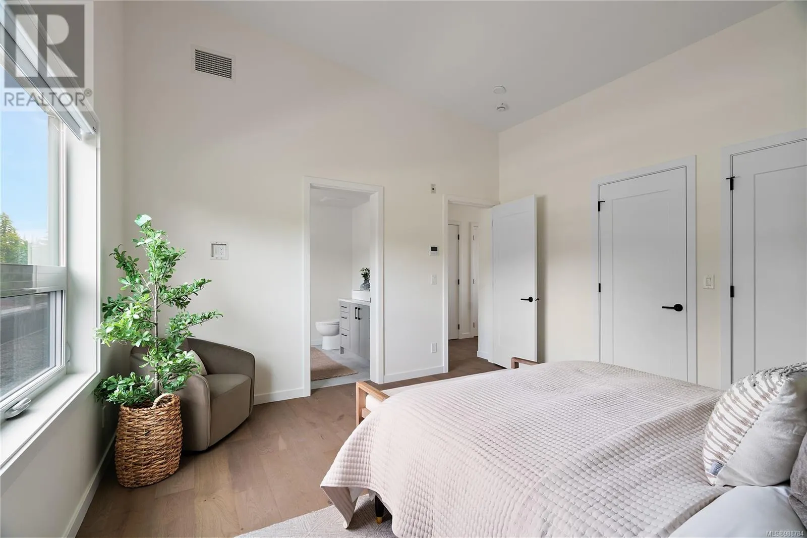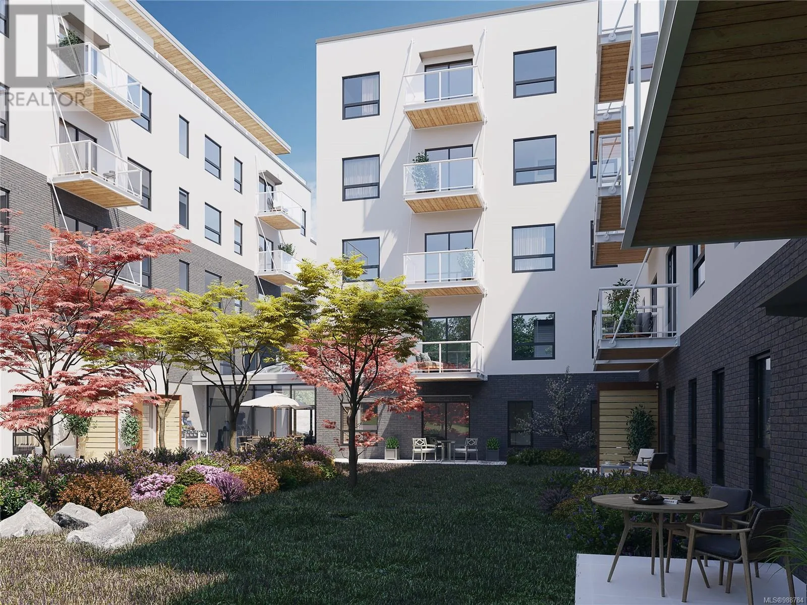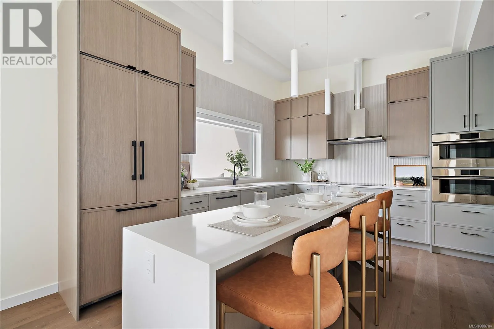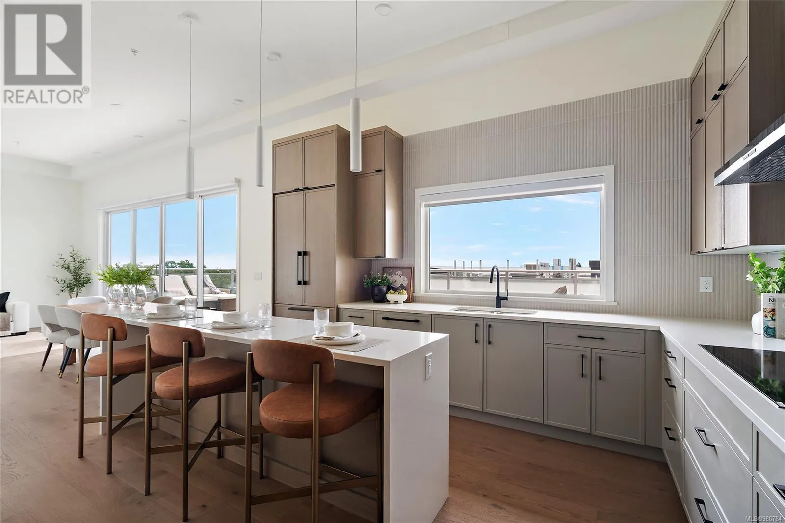 Step into a life of luxury in the south facing 2 bed + den, 3 bath Bellus penthouse unit at The Proxima. This unit truly has it all from the massive 621 sqft, sun-drenched balcony w/ straight view down to the ocean, to the soaring vaulted ceilings, oak engineered hardwood flooring, and two parking spots. Superior space planning & modern finishes by Spaciz Design, the kitchen offers two-toned cabinetry, quartz countertops, a large waterfall eat-in island, and top of the line stainless steel Fisher & Paykel appliances. Located in the heart of Esquimalt Village, The Proxima is perfectly positioned for a life full of adventure, experiences, & amenities w/ Saxe Point Park, local breweries, Esquimalt Market, shopping, & the Archie Browning Sports Centre just a stoneâs throw away. Brought to life by GT Mann Contracting, whether relaxing on the sunny balcony, working out in the state-of-the-art gym, visiting the atrium or courtyard, residents can live life their way at The Proxima. (id:27476)