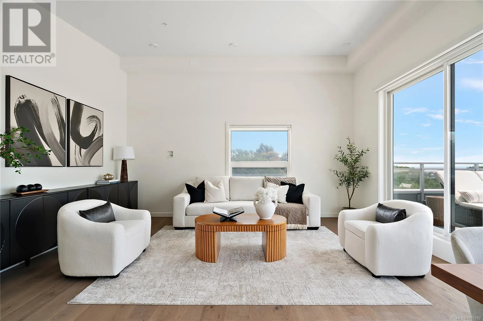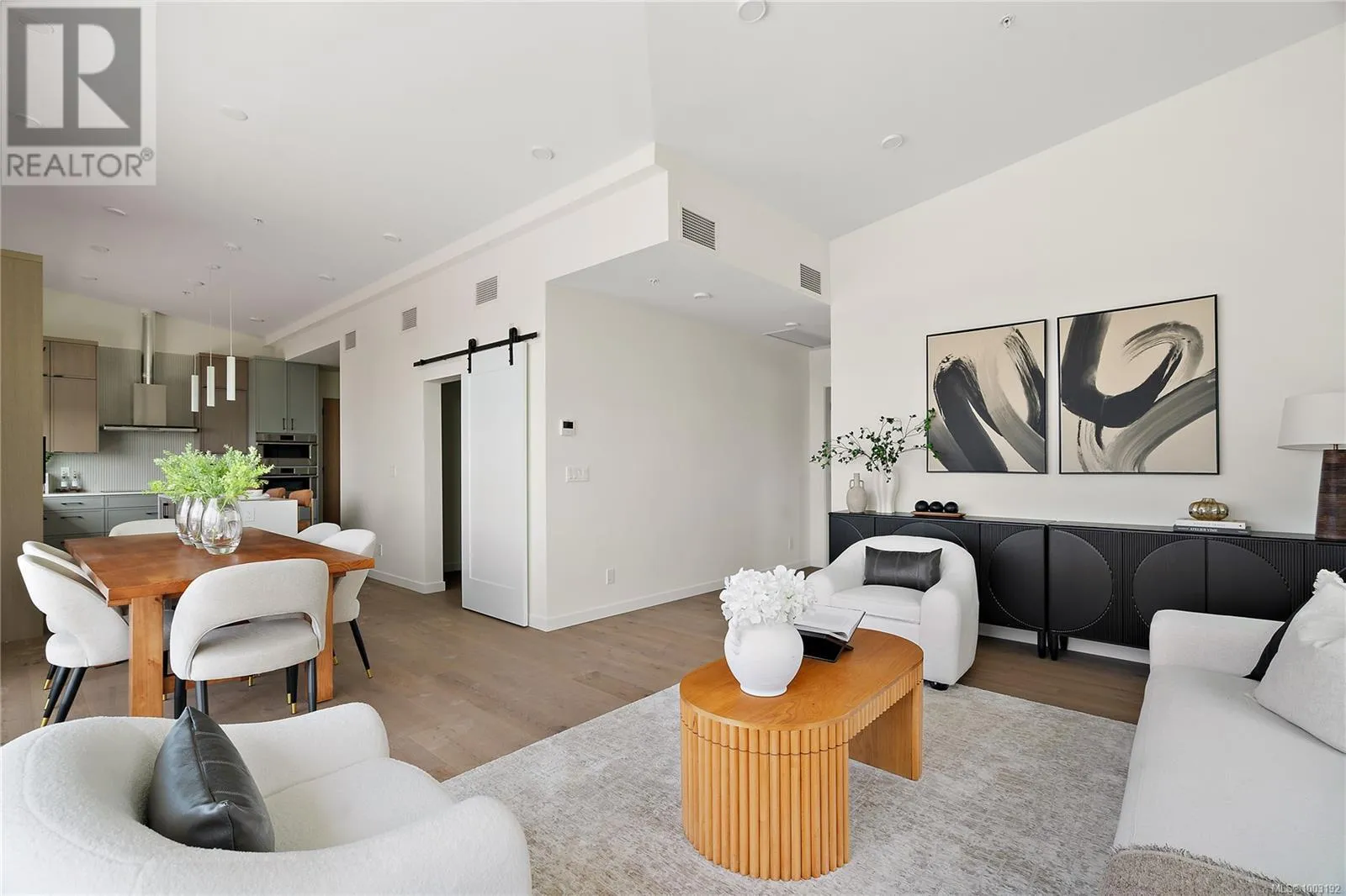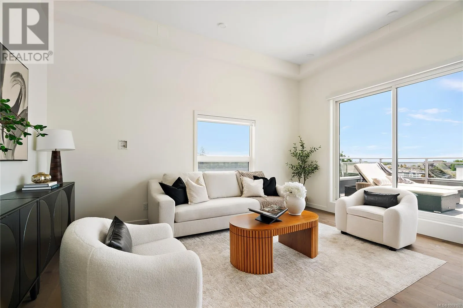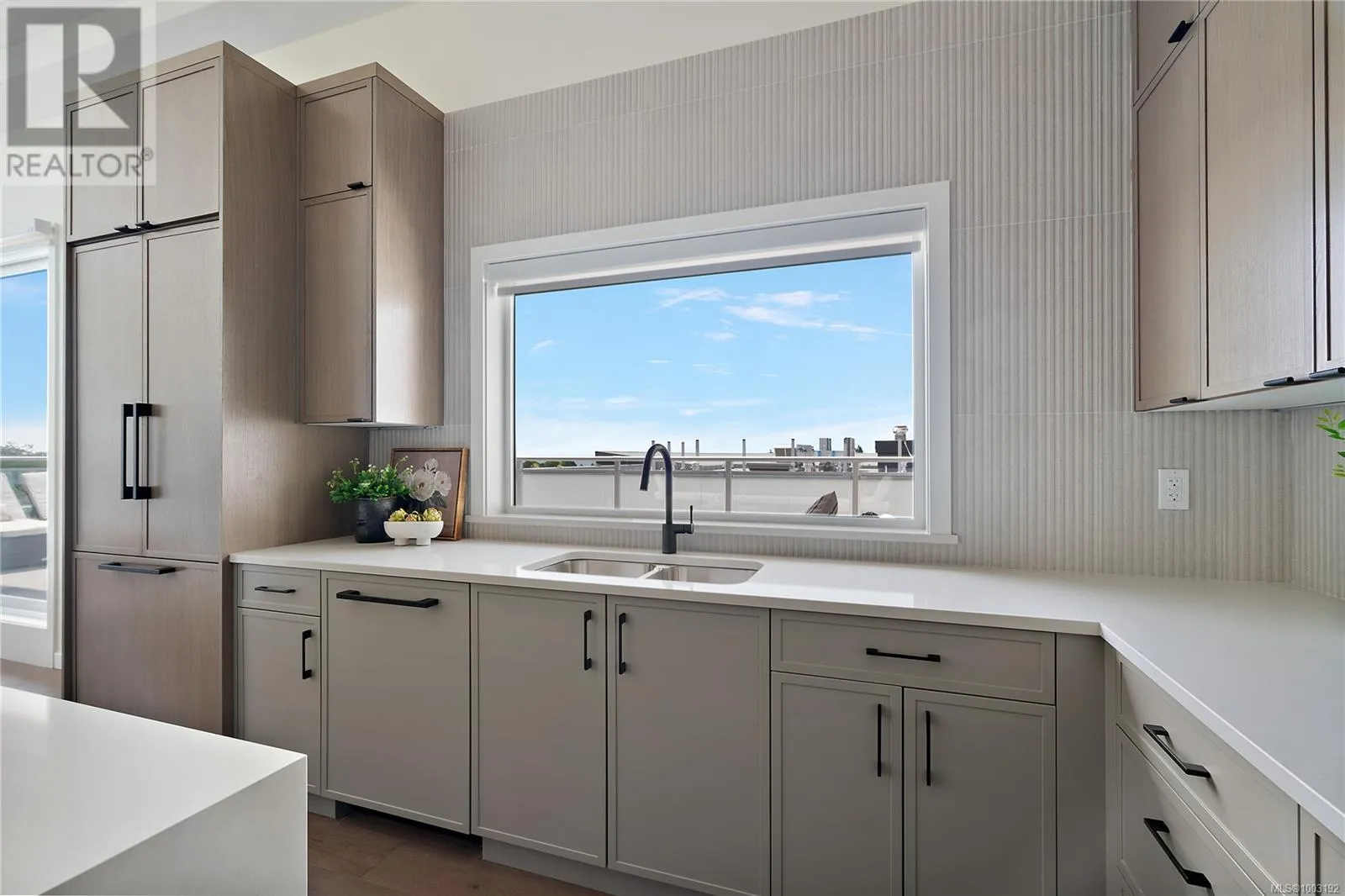 Step into a life of luxury in the south facing 2 bed + den, 3 bath Bellus penthouse unit at The Proxima. This unit truly has it all from the massive 445 sqft, sun-drenched balcony w/ straight view down to the ocean, to the soaring vaulted ceilings, oak engineered hardwood flooring, and two parking spots. Finished in our Lumen colour scheme by Spaciz Design, the kitchen offers two-toned cabinetry, quartz countertops, a large waterfall eat-in island, and top of the line stainless steel Fisher & Paykel appliances. Located in the heart of Esquimalt Village, The Proxima is perfectly positioned for a life full of adventure, experiences, & amenities w/ Saxe Point Park, local breweries, Esquimalt Market, shopping, & the Archie Browning Sports Centre just a stoneâs throw away. Brought to life by GT Mann Contracting, whether relaxing on the sunny balcony, working out in the state-of-the-art gym, visiting the atrium or courtyard, residents can live life their way at The Proxima. (id:27476)