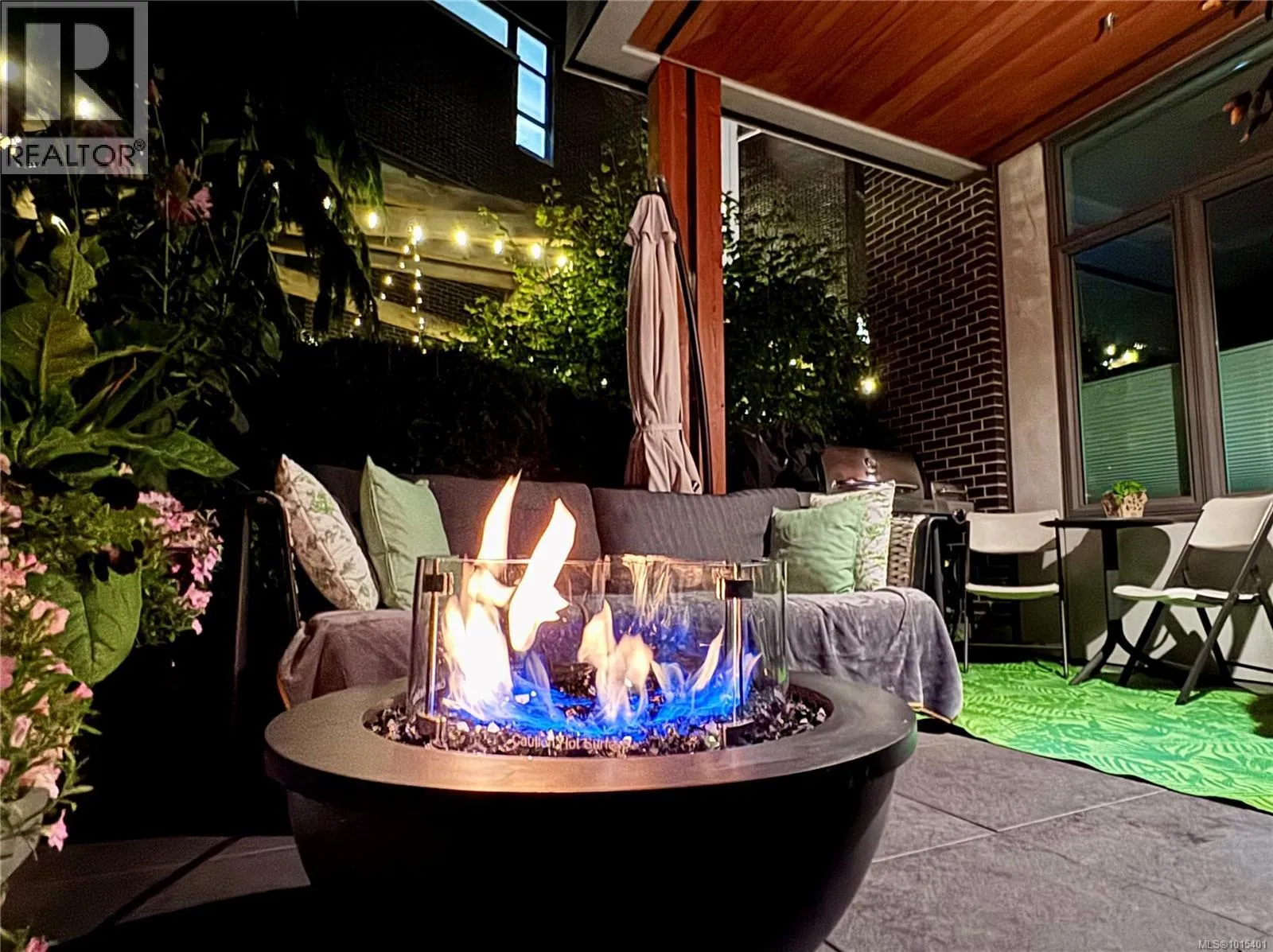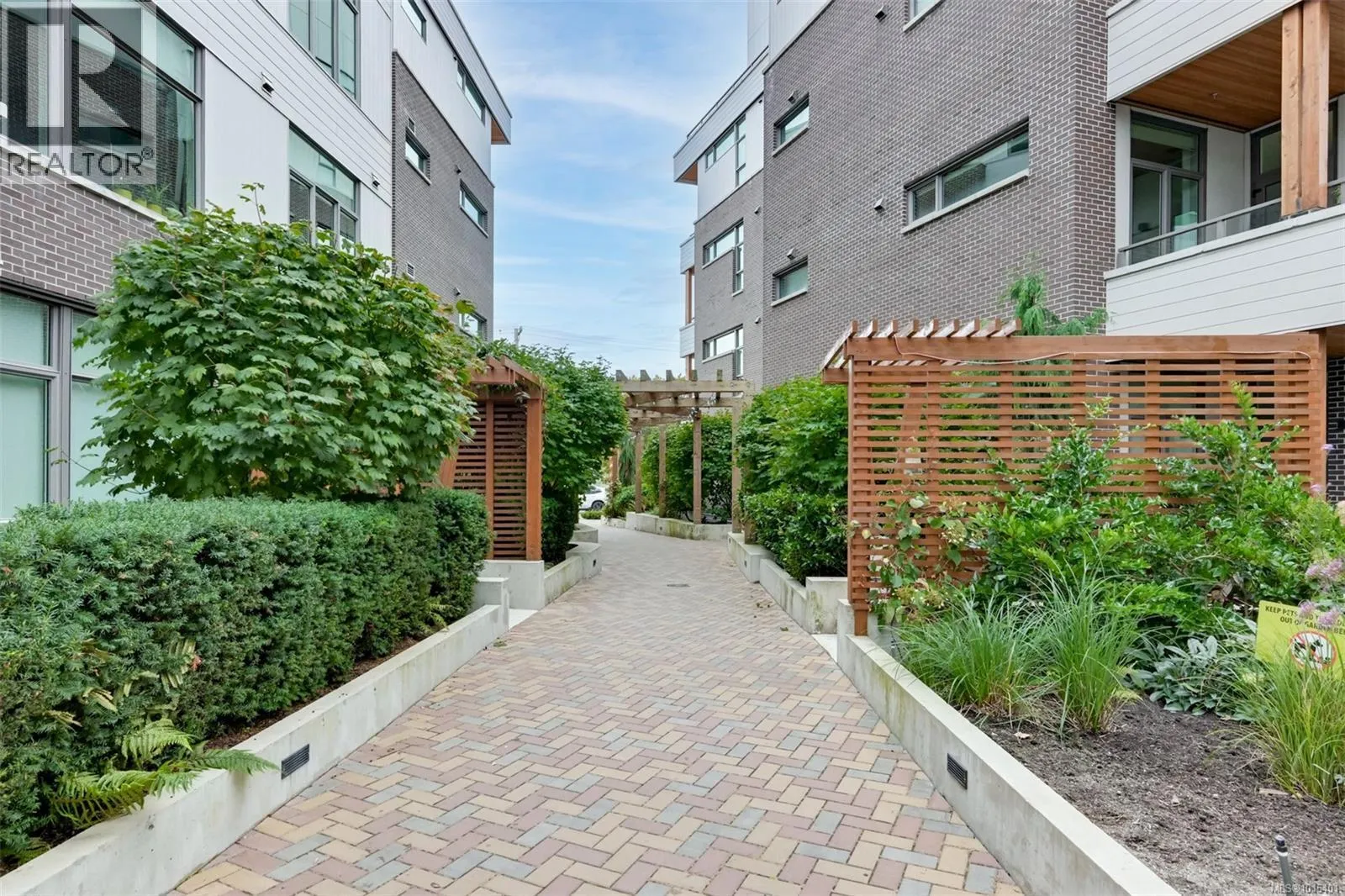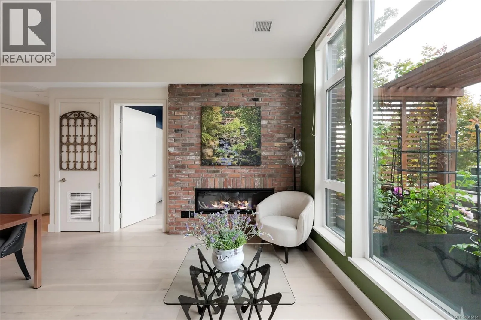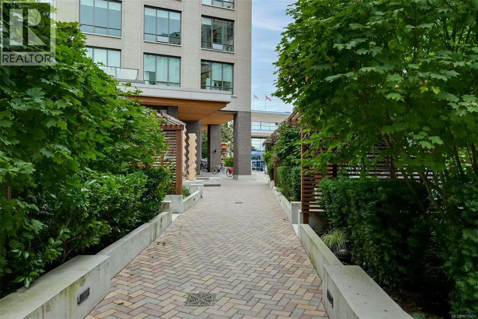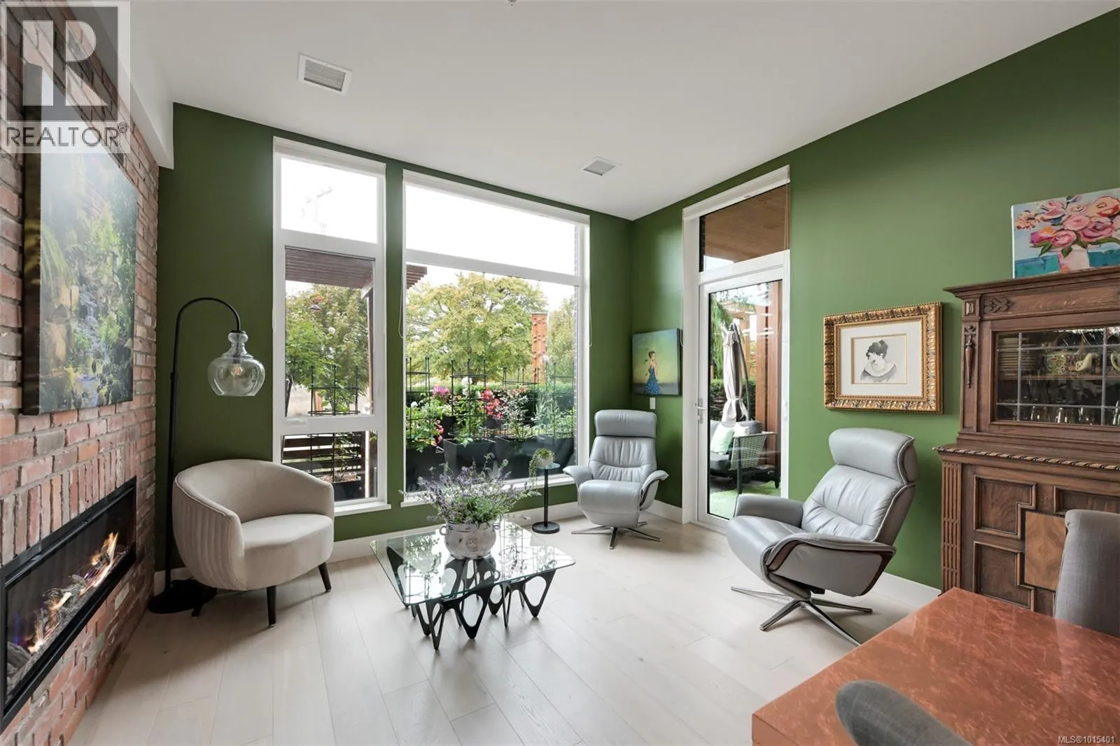 This spacious walk up luxury condo lives more like a single level townhome. Ideally located at Esquimalt Town Square, a masterplanned community built by Aragon; the quality in craftsmanship, design and materials are evident throughout the home, building and community. This 2 bed, 2 bath south facing garden home has every amenity at your doorstep. Over height 9'9'' ceilings and expansive picture windows flood this elegant corner home with natural light. A tranquil, tucked away patio provides privacy, easy indoor / outdoor living and walk-out access - a beautiful spot to host and a pet owners dream. The large living / dining area boasts a reclaimed brick feature wall with a fireplace and enough space to host a full sized dining table. Other features include engineered oak flooring, luxury appliances, heated bathroom flooring, custom window coverings, storage locker & secure underground parking with dedicated EV charger - this is a must-see. Itâs more than a condo - itâs a lifestyle. (id:27476)