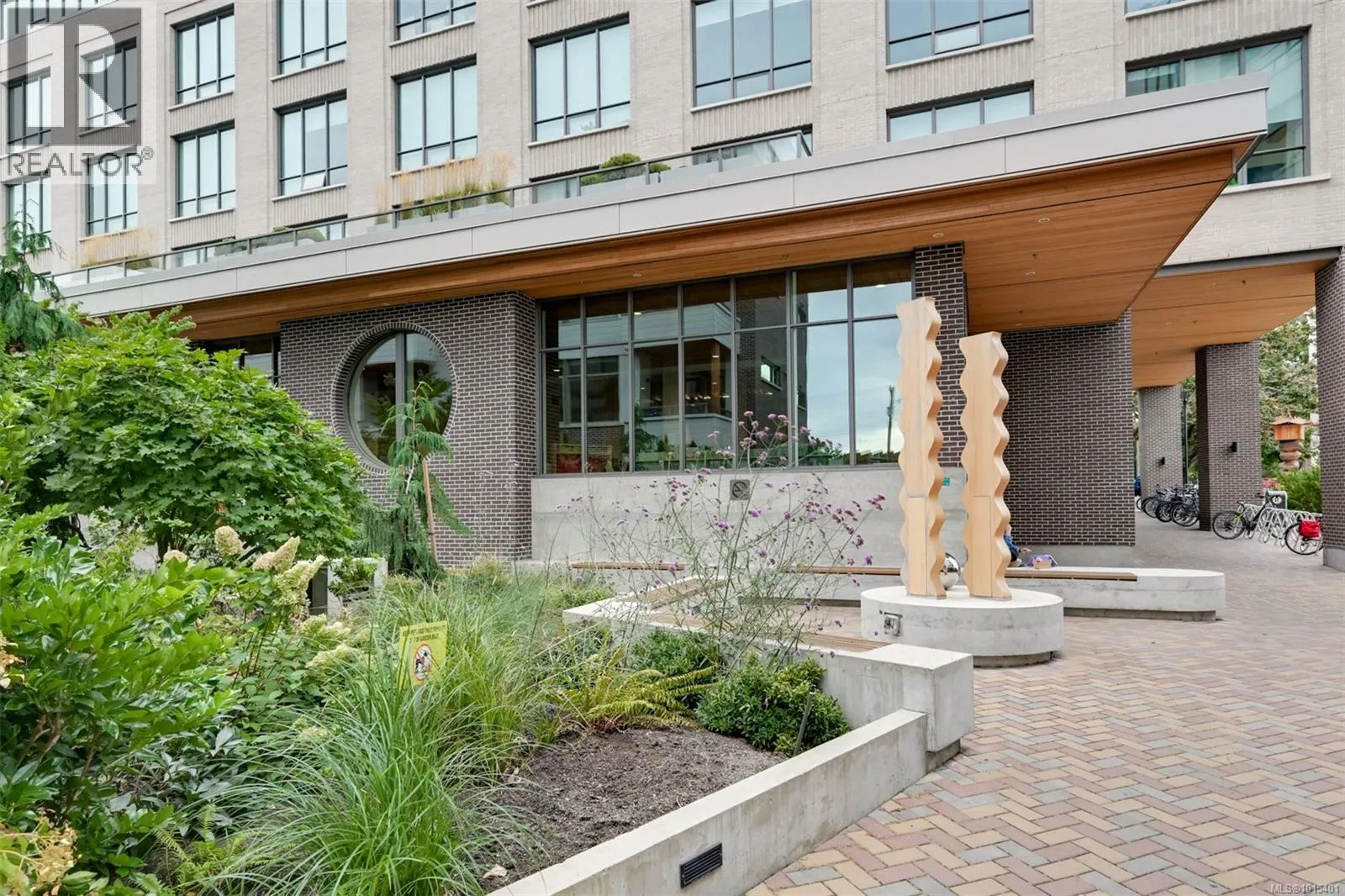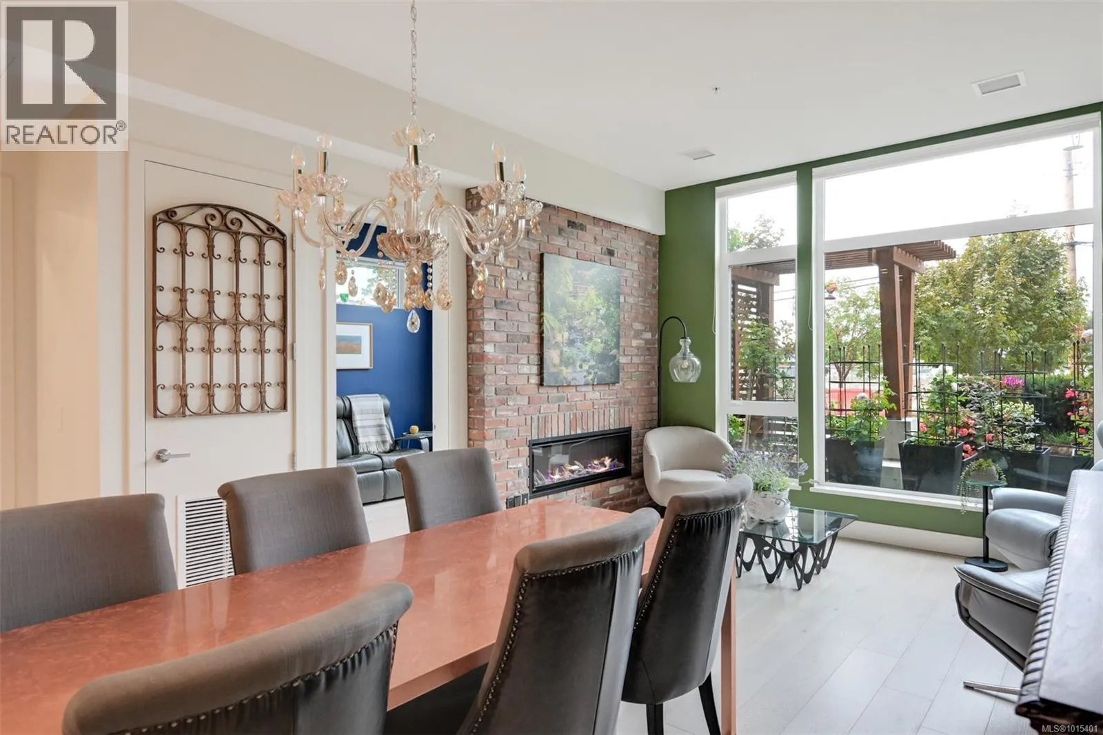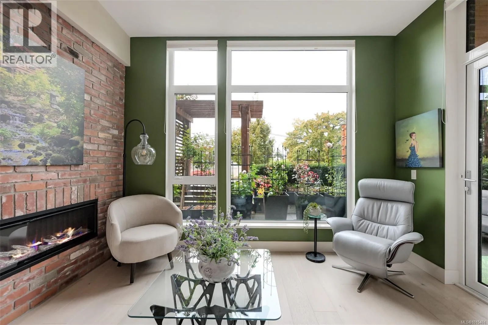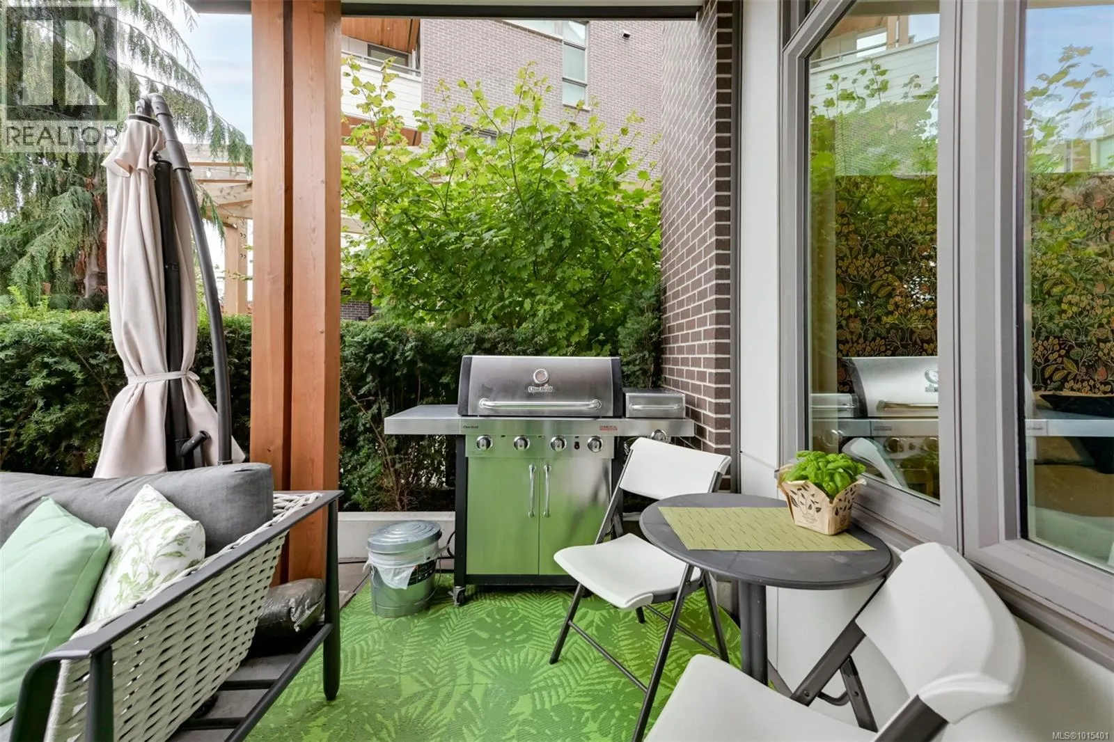 This spacious walk up luxury condo lives more like a single level townhome. Ideally located at Esquimalt Town Square, a masterplanned community built by Aragon; the quality in craftsmanship, design and materials are evident throughout the home, building and community. This 2 bed, 2 bath south facing garden home has every amenity at your doorstep. Over height 9'9'' ceilings and expansive picture windows flood this elegant corner home with natural light. A tranquil, tucked away patio provides privacy, easy indoor / outdoor living and walk-out access - a beautiful spot to host and a pet owners dream. The large living / dining area boasts a reclaimed brick feature wall with a fireplace and enough space to host a full sized dining table. Other features include engineered oak flooring, luxury appliances, heated bathroom flooring, custom window coverings, storage locker & secure underground parking with dedicated EV charger - this is a must-see. Itâs more than a condo - itâs a lifestyle. (id:27476)