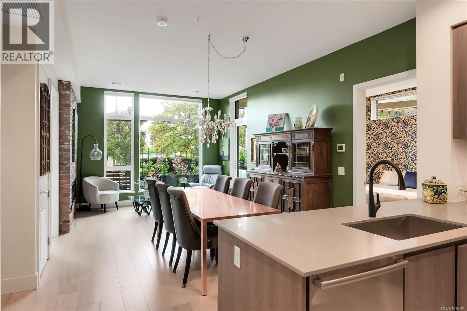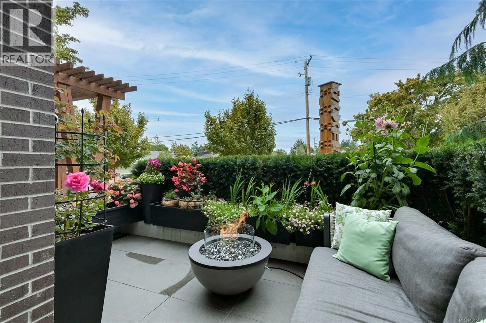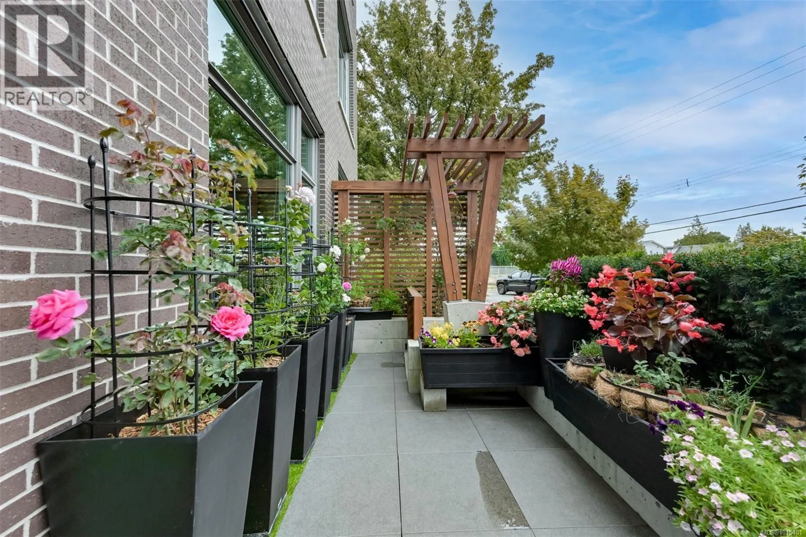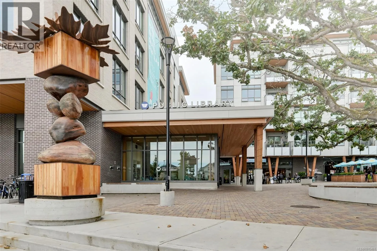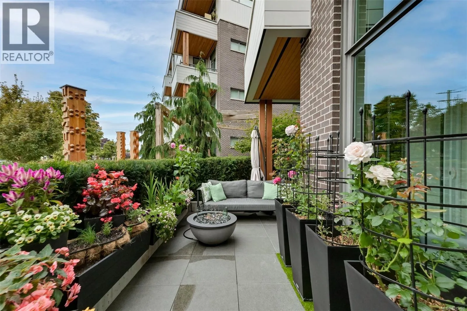 This spacious walk up luxury condo lives more like a single level townhome. Ideally located at Esquimalt Town Square, a masterplanned community built by Aragon; the quality in craftsmanship, design and materials are evident throughout the home, building and community. This 2 bed, 2 bath south facing garden home has every amenity at your doorstep. Over height 9'9'' ceilings and expansive picture windows flood this elegant corner home with natural light. A tranquil, tucked away patio provides privacy, easy indoor / outdoor living and walk-out access - a beautiful spot to host and a pet owners dream. The large living / dining area boasts a reclaimed brick feature wall with a fireplace and enough space to host a full sized dining table. Other features include engineered oak flooring, luxury appliances, heated bathroom flooring, custom window coverings, storage locker & secure underground parking with dedicated EV charger - this is a must-see. Itâs more than a condo - itâs a lifestyle. (id:27476)