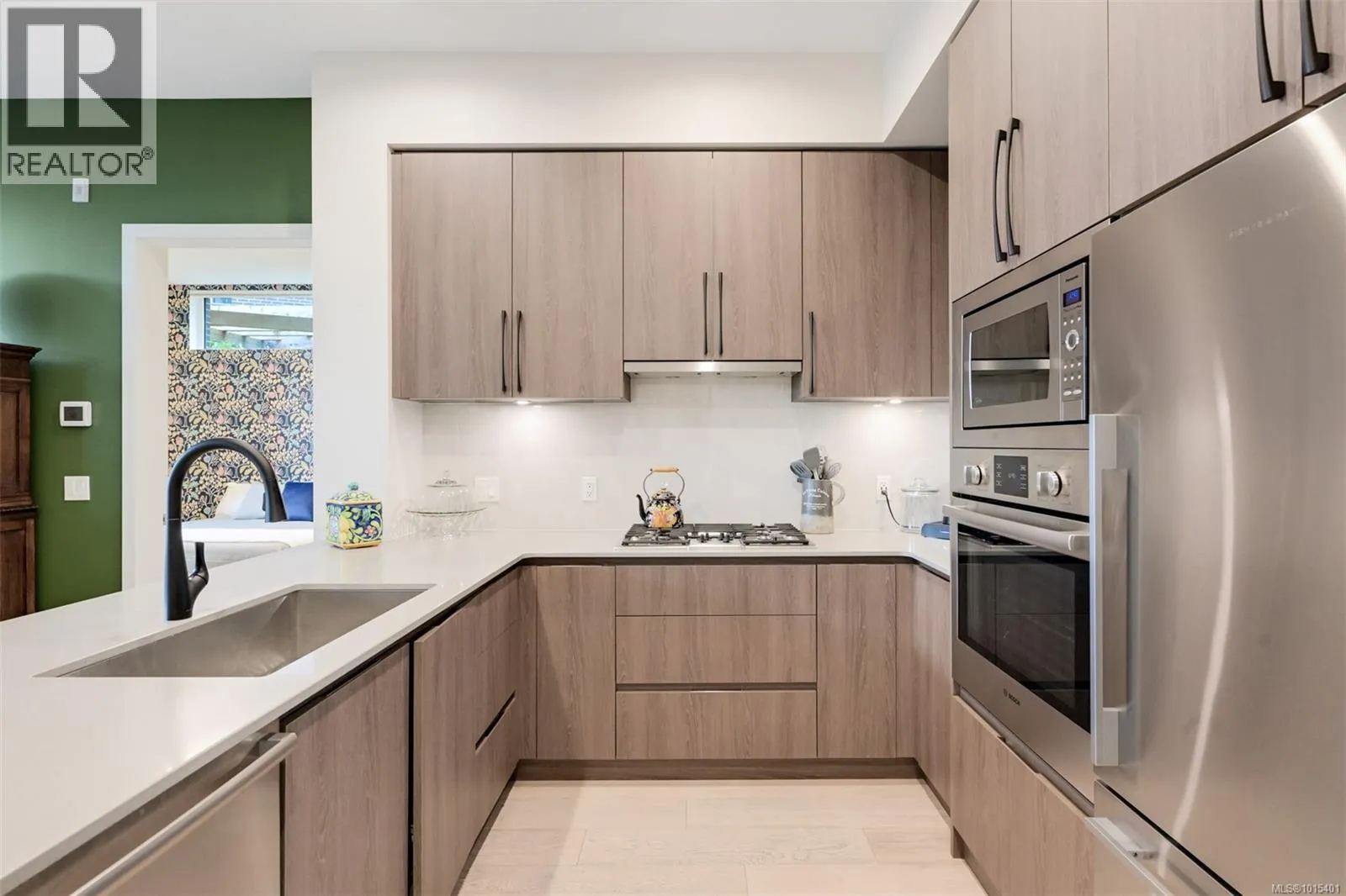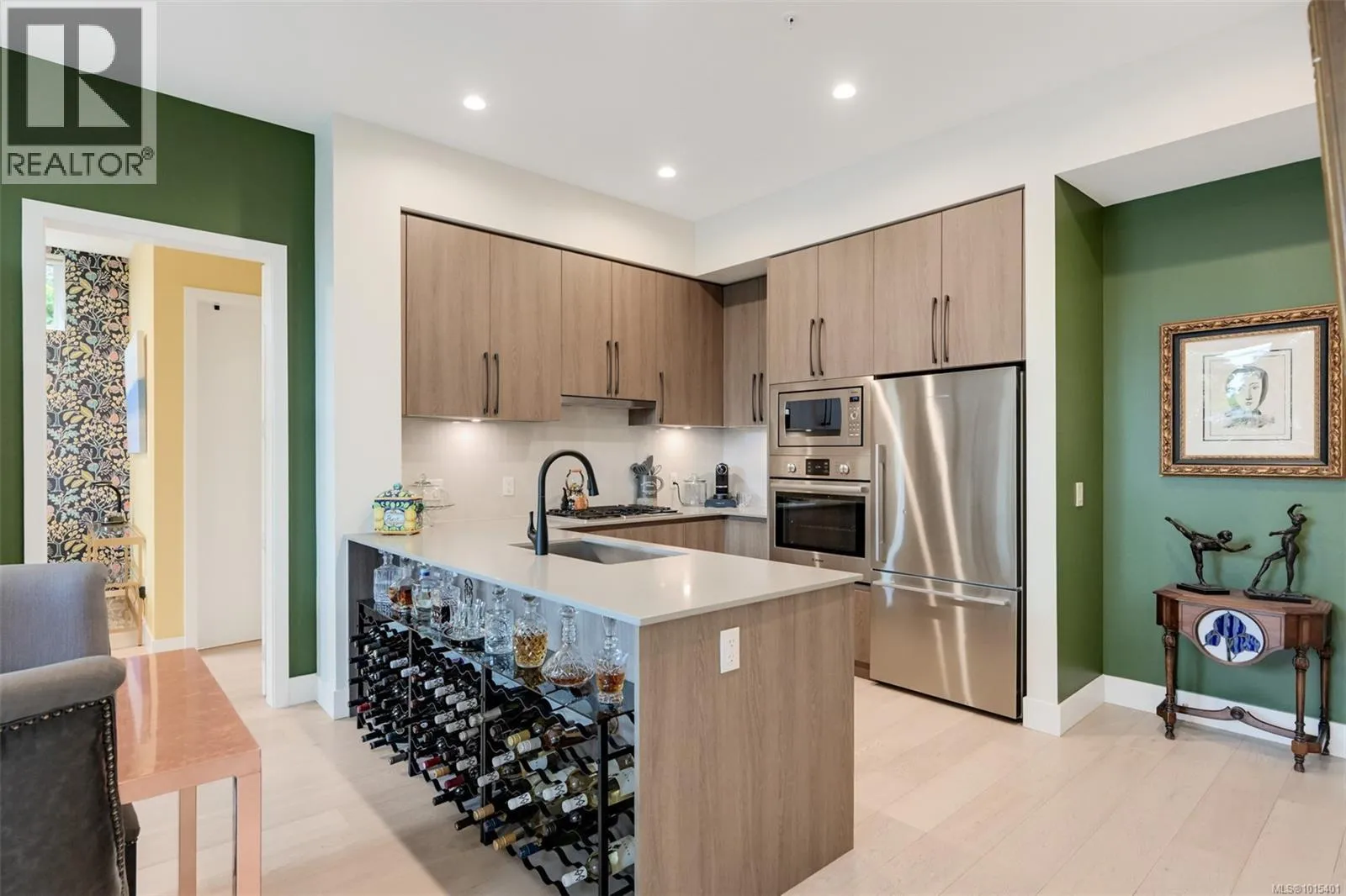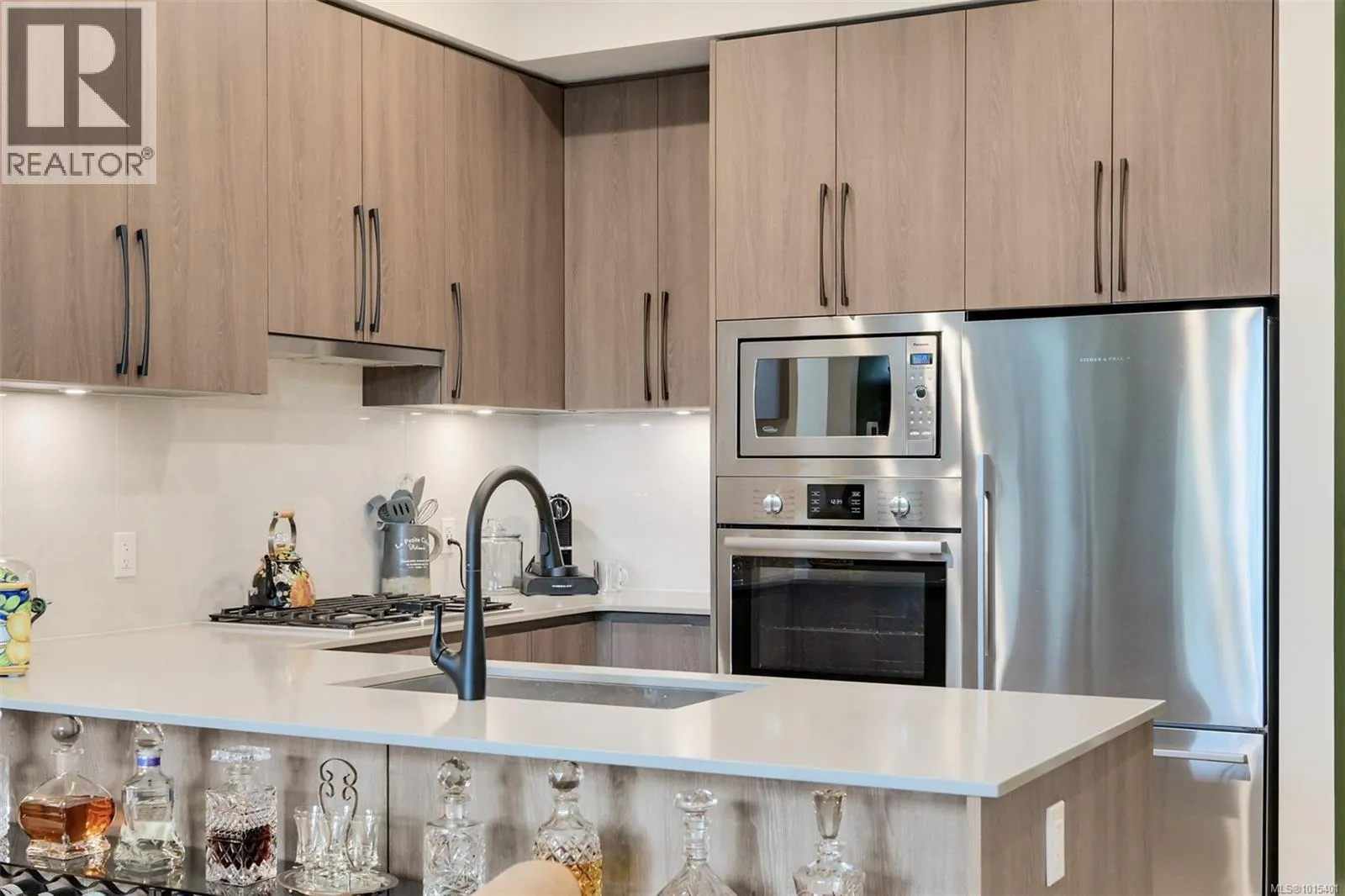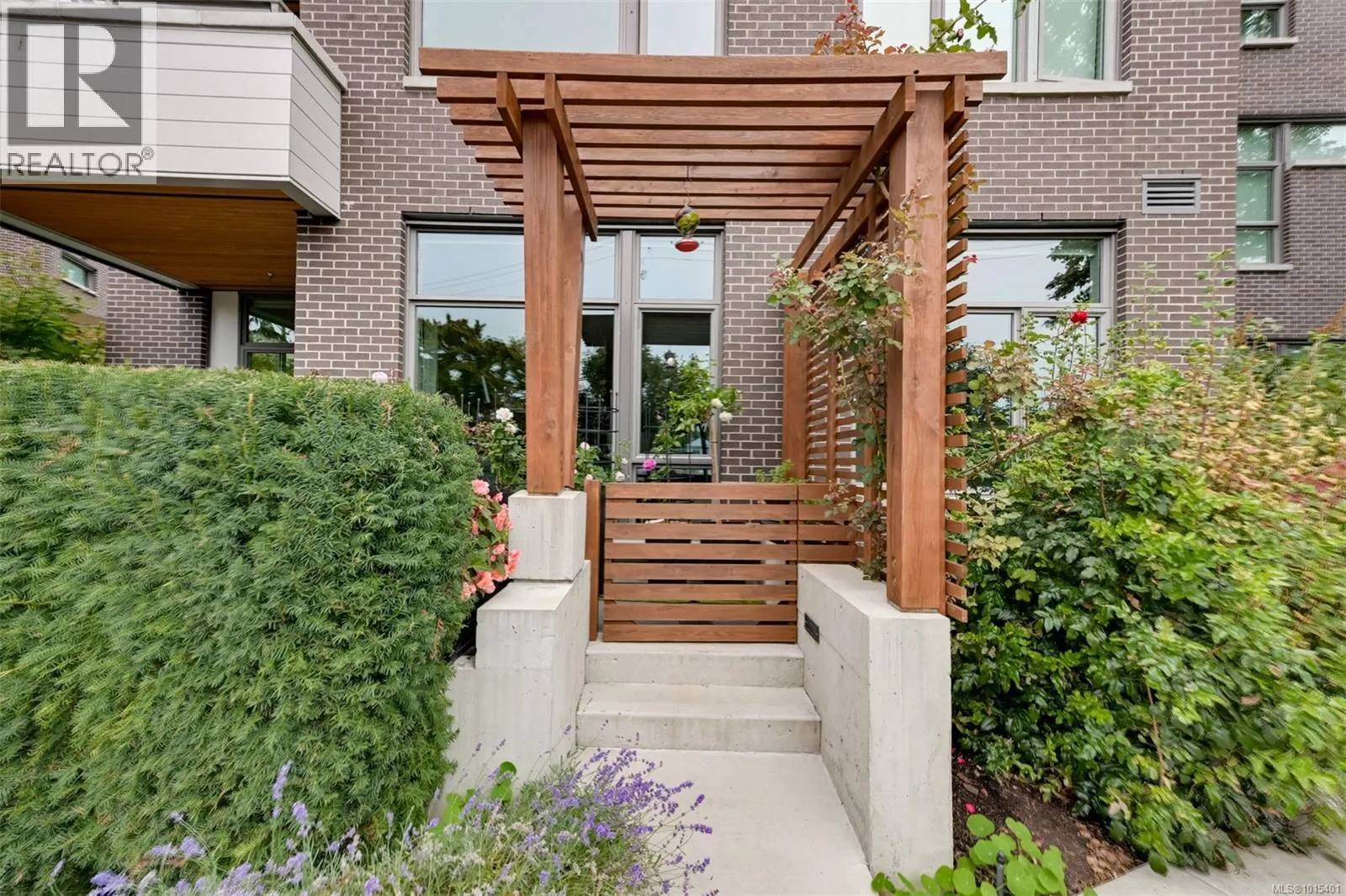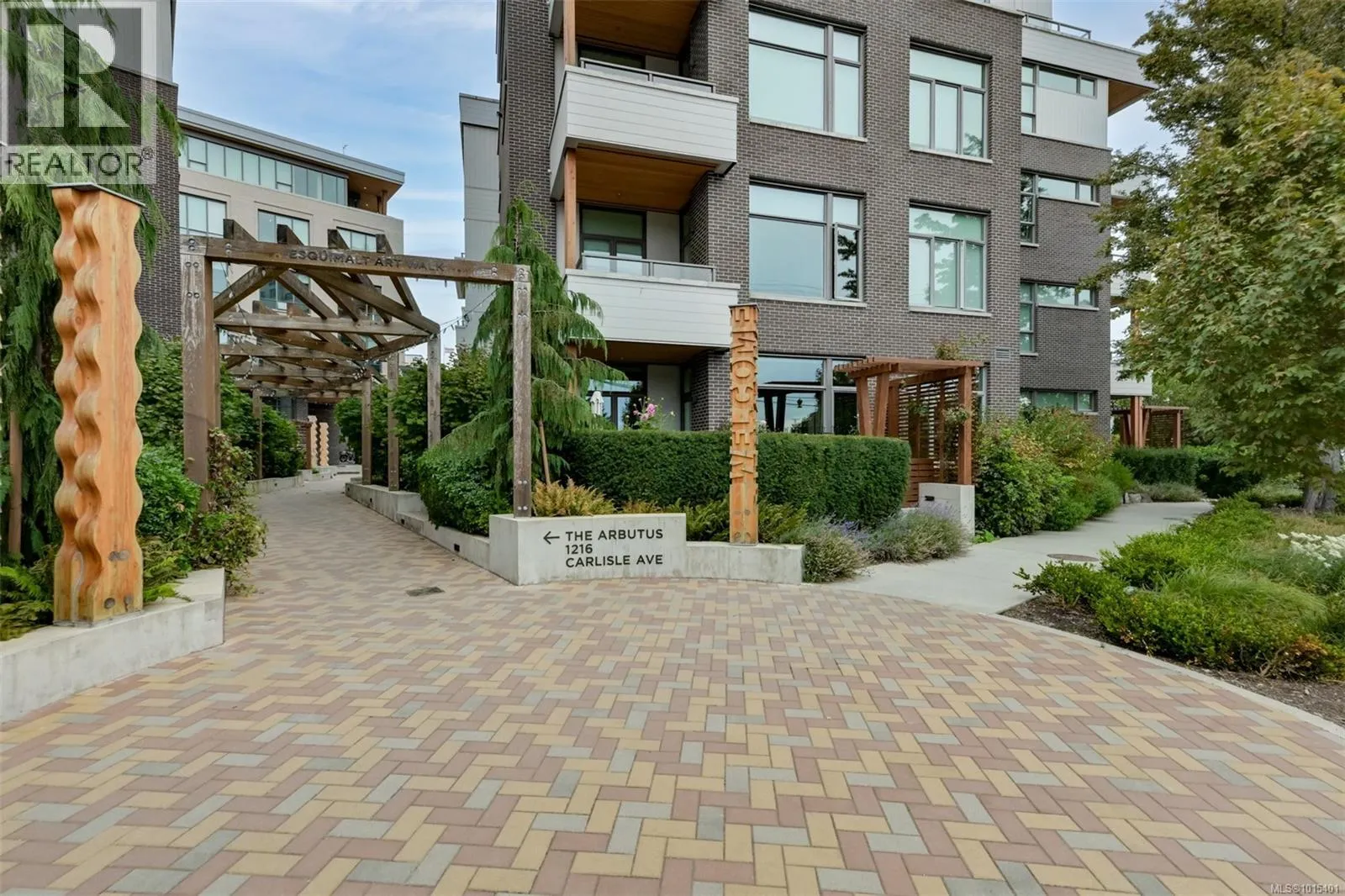 This spacious walk up luxury condo lives more like a single level townhome. Ideally located at Esquimalt Town Square, a masterplanned community built by Aragon; the quality in craftsmanship, design and materials are evident throughout the home, building and community. This 2 bed, 2 bath south facing garden home has every amenity at your doorstep. Over height 9'9'' ceilings and expansive picture windows flood this elegant corner home with natural light. A tranquil, tucked away patio provides privacy, easy indoor / outdoor living and walk-out access - a beautiful spot to host and a pet owners dream. The large living / dining area boasts a reclaimed brick feature wall with a fireplace and enough space to host a full sized dining table. Other features include engineered oak flooring, luxury appliances, heated bathroom flooring, custom window coverings, storage locker & secure underground parking with dedicated EV charger - this is a must-see. Itâs more than a condo - itâs a lifestyle. (id:27476)