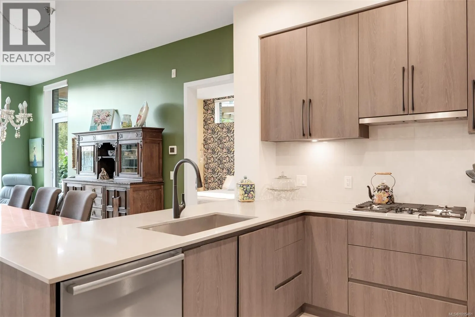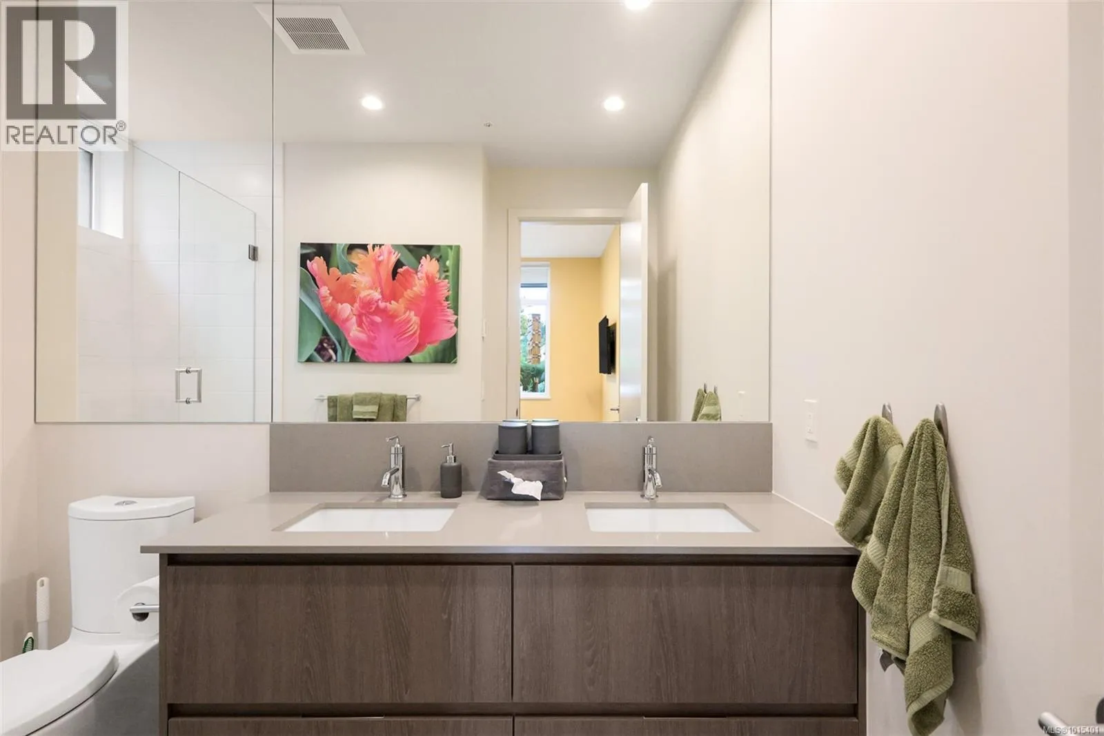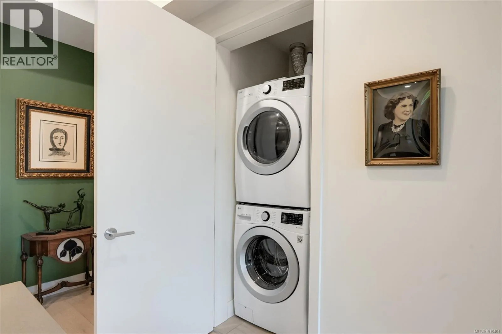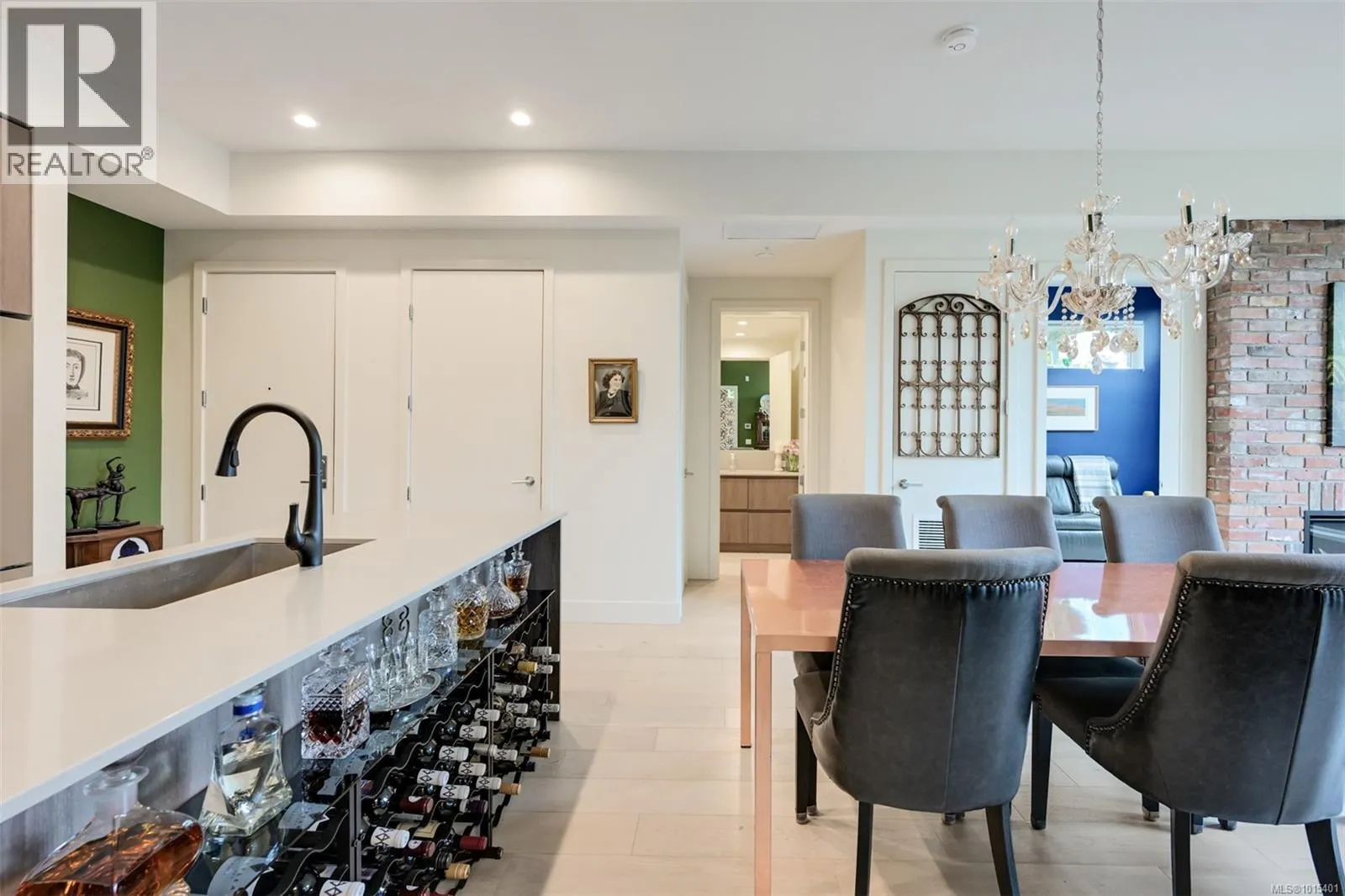 This spacious walk up luxury condo lives more like a single level townhome. Ideally located at Esquimalt Town Square, a masterplanned community built by Aragon; the quality in craftsmanship, design and materials are evident throughout the home, building and community. This 2 bed, 2 bath south facing garden home has every amenity at your doorstep. Over height 9'9'' ceilings and expansive picture windows flood this elegant corner home with natural light. A tranquil, tucked away patio provides privacy, easy indoor / outdoor living and walk-out access - a beautiful spot to host and a pet owners dream. The large living / dining area boasts a reclaimed brick feature wall with a fireplace and enough space to host a full sized dining table. Other features include engineered oak flooring, luxury appliances, heated bathroom flooring, custom window coverings, storage locker & secure underground parking with dedicated EV charger - this is a must-see. Itâs more than a condo - itâs a lifestyle. (id:27476)