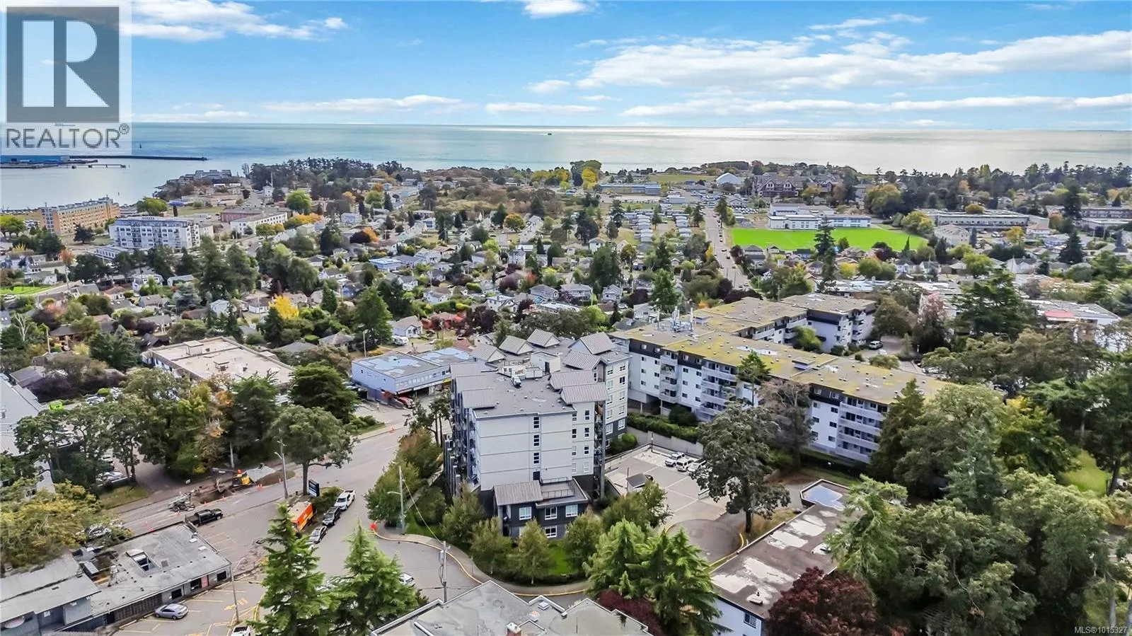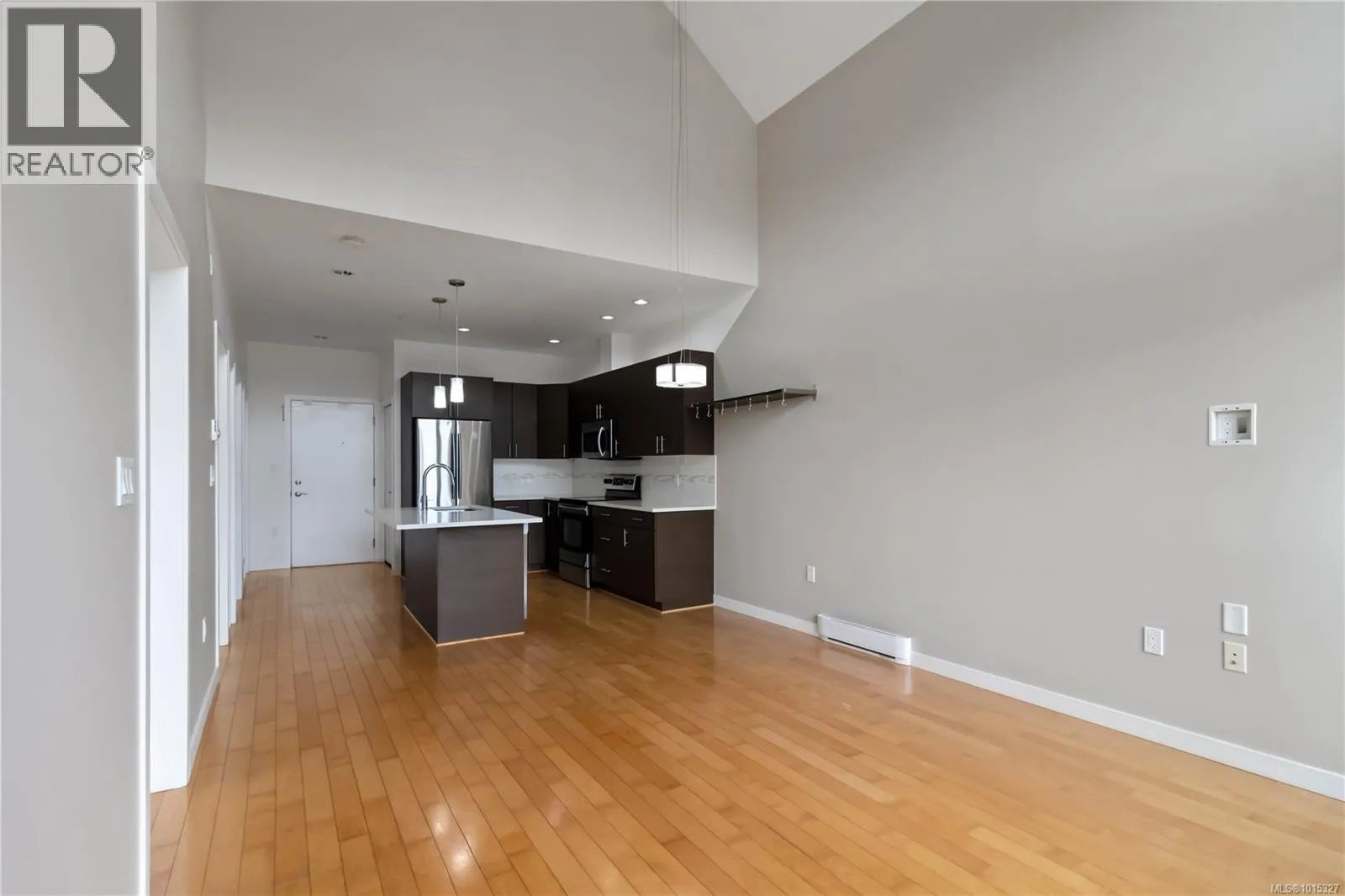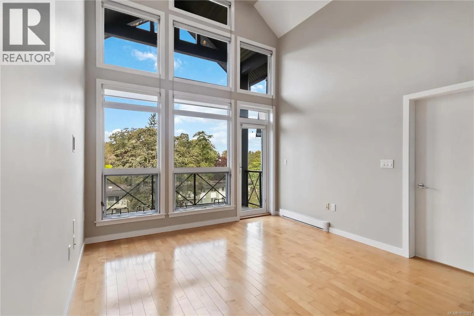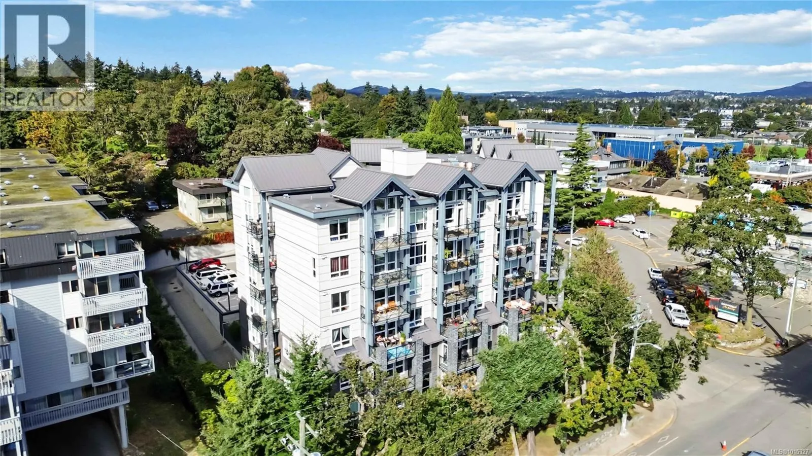 Soaring above buildings and treetops is this beautiful 2 bedroom, top floor unit in Skyline Residences. This condo is uniquely designed and offers a wonderful open-concept floor plan with modern kitchen, quartz countertops, stainless steel appliances and kitchen island which blends modern living with functionality. Natural light pours through the floor to ceilings windows in the living room featuring 16ft vaulted ceilings. Large primary bedroom with an abundance of light with ensuite, second bedroom with second bathroom and laundry round out this well designed condo. Located on the quiet side of the building and including secured underground parking spot as well as a storage locker. Bonus - roof top patio with inner harbour views for your enjoyment with a location is perfectly located just minutes to downtown Victoria, shops, restaurants, parks, the military base, école Victor-Brodeur and buses. Rentals permitted and pets allowed! Vacant with quick possession! (id:27476)