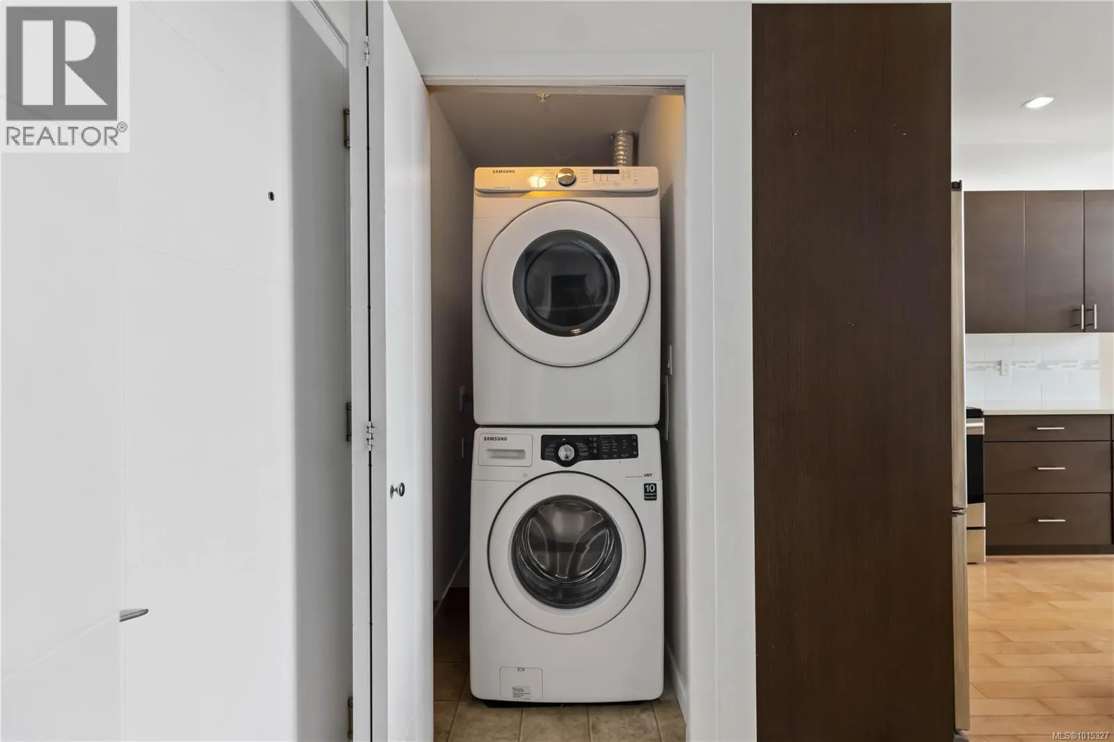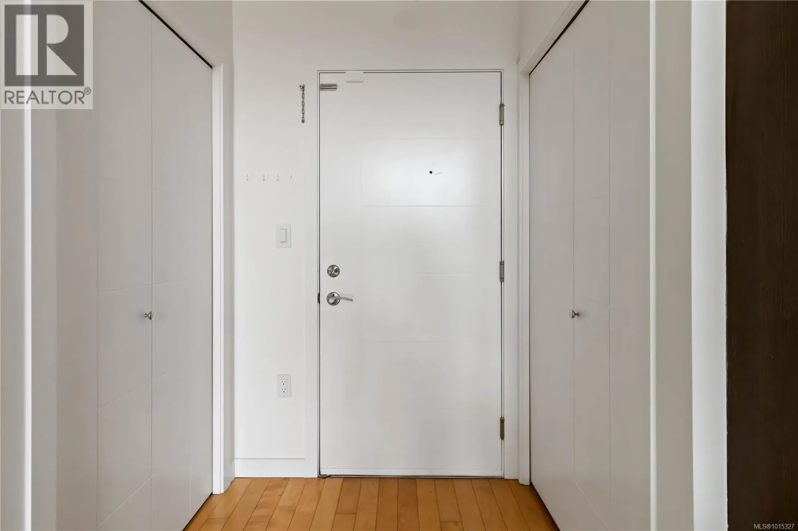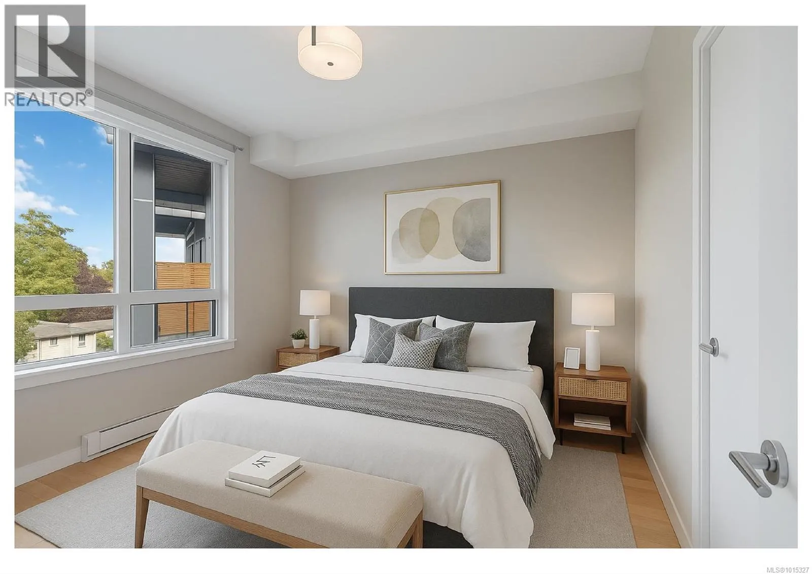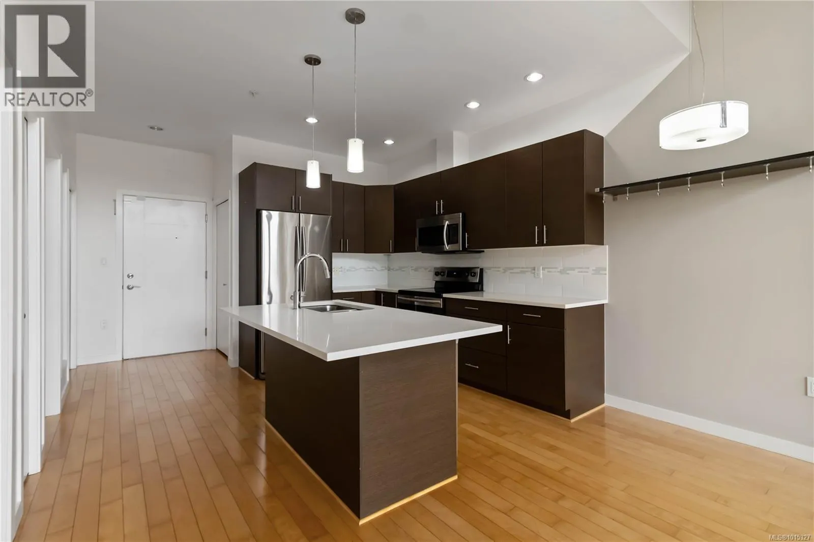 Soaring above buildings and treetops is this beautiful 2 bedroom, top floor unit in Skyline Residences. This condo is uniquely designed and offers a wonderful open-concept floor plan with modern kitchen, quartz countertops, stainless steel appliances and kitchen island which blends modern living with functionality. Natural light pours through the floor to ceilings windows in the living room featuring 16ft vaulted ceilings. Large primary bedroom with an abundance of light with ensuite, second bedroom with second bathroom and laundry round out this well designed condo. Located on the quiet side of the building and including secured underground parking spot as well as a storage locker. Bonus - roof top patio with inner harbour views for your enjoyment with a location is perfectly located just minutes to downtown Victoria, shops, restaurants, parks, the military base, école Victor-Brodeur and buses. Rentals permitted and pets allowed! Vacant with quick possession! (id:27476)