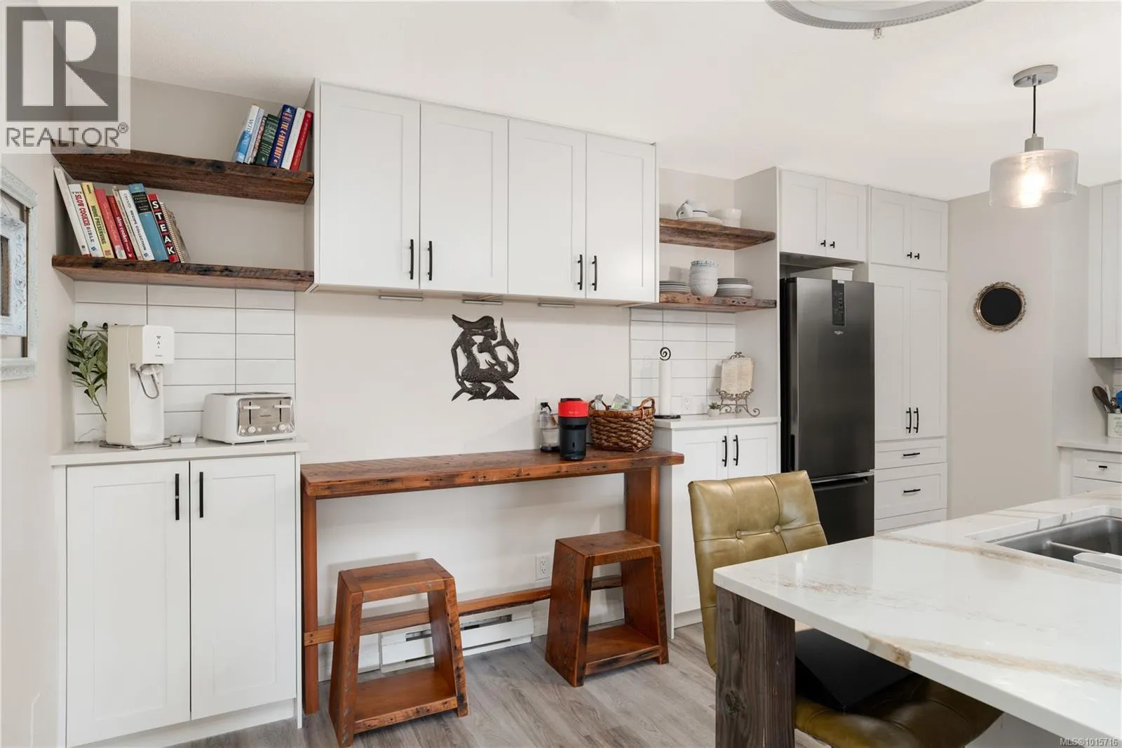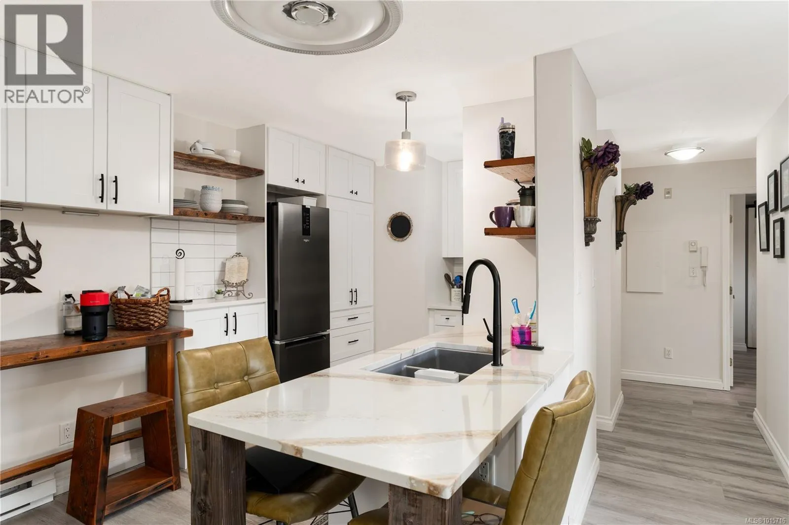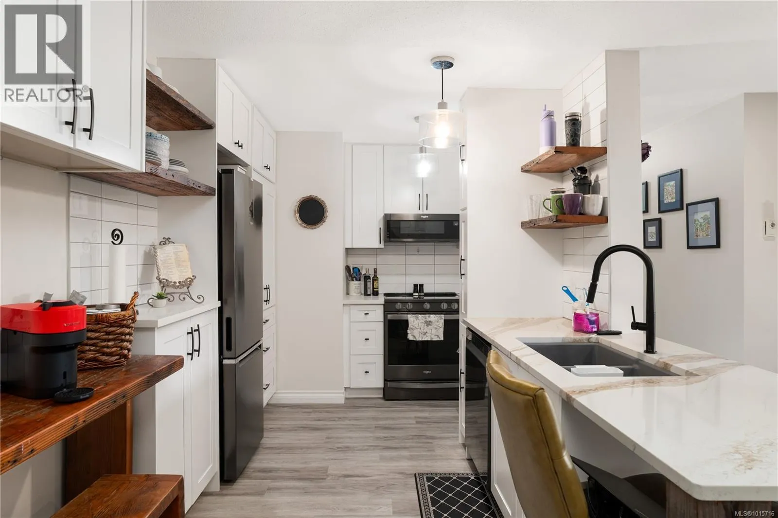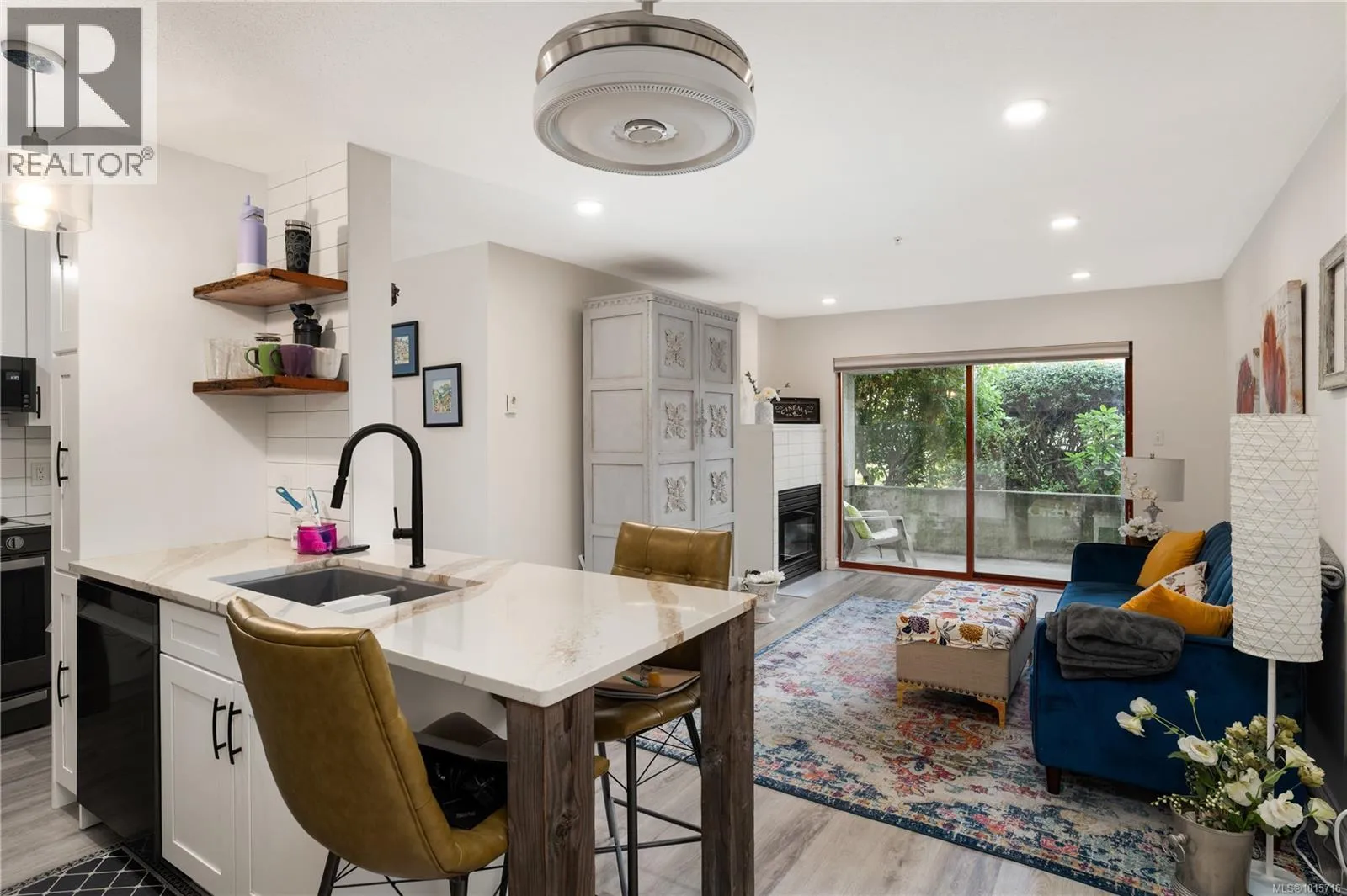 Step into this charming ground-floor condo in the heart of Esquimalt, where thoughtful updates meet effortless living. The reimagined kitchen is a true centerpiece, featuring sleek cabinetry, modern appliances, and an open layout that invites connection while you cook or entertain. New laminate flooring flows throughout the home, creating a cohesive and modern feel. The living area features a cozy gas fireplace, and sliding doors open to a private 12 x 6 patio, ideal for morning coffee or simply soaking in the fresh air. The primary bedroom offers a serene retreat with its own 3-piece ensuite, while the second bedroom and full bathroom provide flexibility for guests, a home office, or hobbies. In-suite laundry and smart renovations make daily life easy and convenient. The buildingâs south-facing rooftop patio delivers sweeping views of the ocean, mountains, and city skyline, a perfect backdrop for gatherings or quiet reflection. With the waterfront, recreation centre, restaurants, shops, and transit nearby, and downtown Victoria only minutes away, this condo offers a comfortable and stylish home in a vibrant neighbourhood. (id:27476)