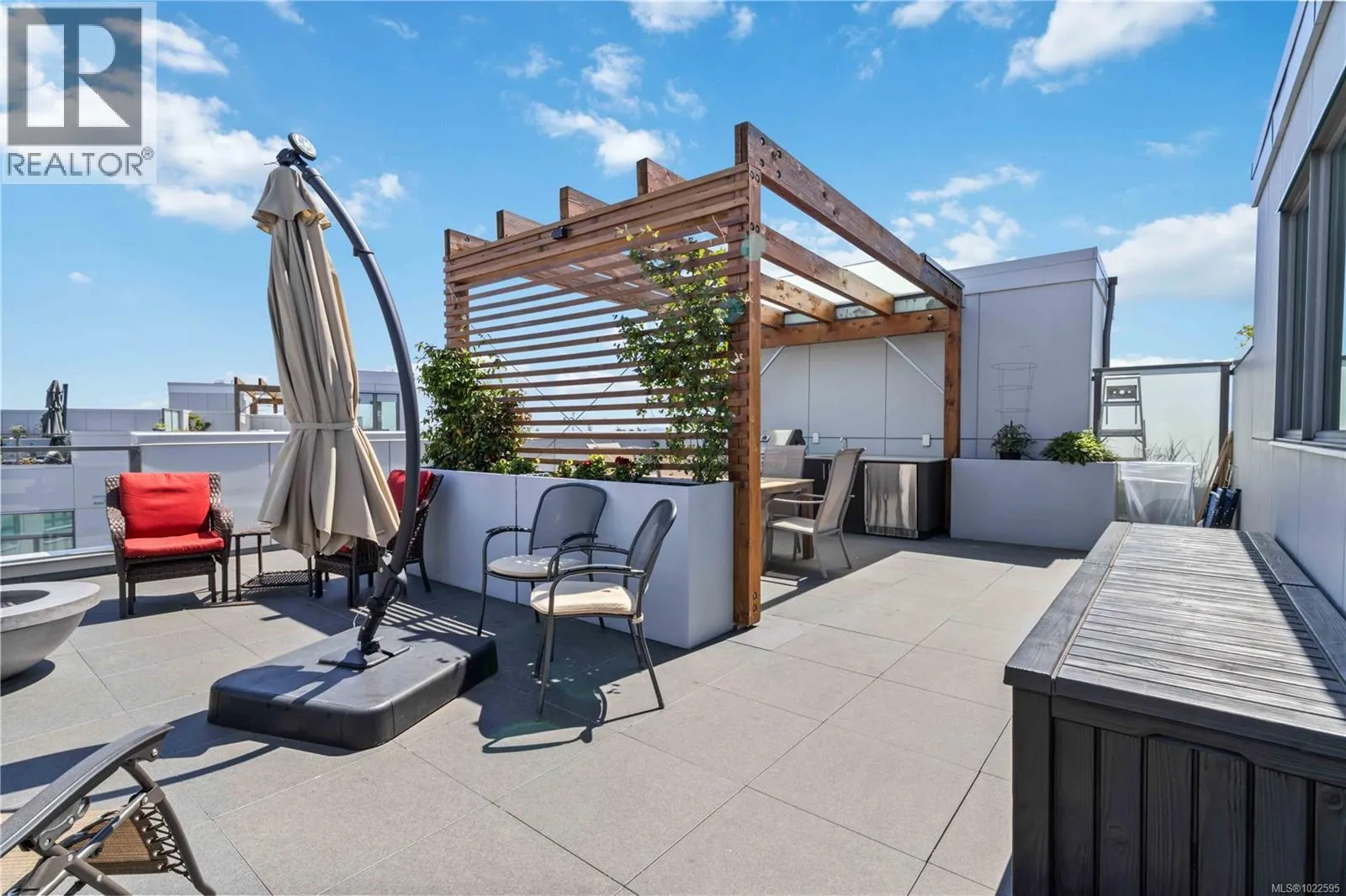 In the newly bustling upwardly mobile community of Esquimalt, blocks to World renowned Saxe Point Park and 9-12 minutes to downtown Victoria Harbour and the Parliament buildings you will find a treasure at The Douglas at Esquimalt Town Square, by Aragon Properties. In addition to the 1178 sq. ft. rooftop patio which includes a gas bib, water, BBQ, and floating porcelain tile, this 2 bed 2 bath Penthouse home has over height 9â6â ceilings, and expansive windows. The interior features custom built-ins through-out, wide-plank oak engineered hardwood floors, premium appliance package (Fisher & Paykel, Bosch wall oven, gas range, and dishwasher), Benson custom cabinetry, and a full-size LG washer & dryer. The living room features locally sourced brick feature wall with electric fireplace. NU-Heat in ensuite. Amenities include geothermal heating & cooling, bike room, elevator, 1 parking stall, 1 bike storage, 1 storage locker, pets happily encouraged! Close to the ocean, parks, shopping and amazing walking and biking trails, home doesn't get better than this! (id:27476)