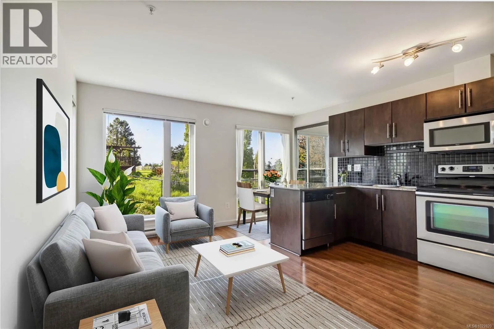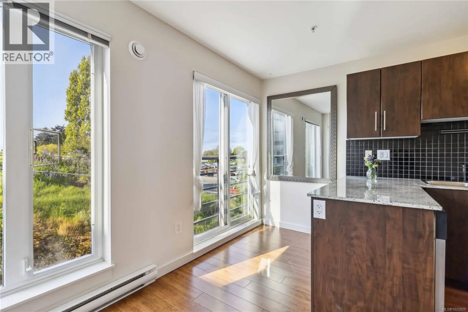 2010 boutique Saxe Point condo with the best views in the building. Close to the ocean and a corner unit. Calm, serene look out over Ken Hill Park with fabulous sunrises in your south facing home. Beautiful, sunny and bright with the park providing a peaceful and green backdrop replete with wildlife sightings from eagles and deer to many types of local birds. Very quiet part of the building so you can enjoy glimpses of the Olympic mountains. Freshly painted in a warm and neutral colour for an expansive feel. Stainless Steel appliances, in-suite laundry and granite counters. 1 parking spot included. Locked bike storage & large storage unit. Common roof top deck with complete panoramic views. For convenience: bus outside to UVic and downtown. Cats and dogs allowed (no weight limits, 2 pets) in this great location: parks, off leash areas, groceries, rec centre, library & great coffee all within walking distance. Also close to Saxe Point with the dog beach, swimming and stunning views. (id:27476)