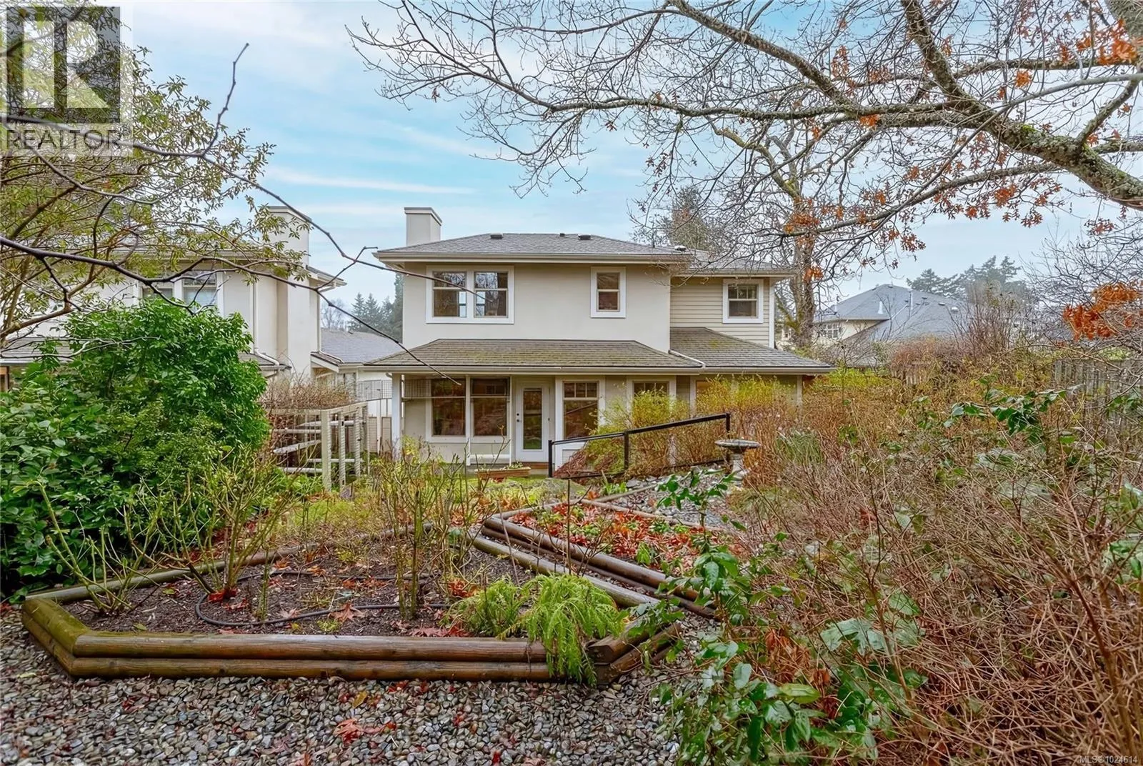 Stylish Fully Detached Townhome in Quiet Esquimalt Enclave  Discover a rare opportunity to own a fully detached, 2-storey townhome that lives like a house in a peaceful Esquimalt location, just minutes from downtown Victoria and CFB Esquimalt. This light-filled 2,048 sq ft 3 bed, 3 bath home on a whopping 6,607 sq ft lot blends comfort, style, and thoughtful updates with a uniquely private, low-maintenance garden setting.  Inside, vaulted ceilings and abundant windows create an airy, welcoming feel. The rear-facing kitchen overlooks the gorgeous backyard and features upgraded quartz countertops and sinks, along with a sunny breakfast area that opens to the family roomâan ideal layout for everyday living & casual entertaining. Multiple access points to the outdoor patios make it easy to extend your living space on warm days.  Living flexibility abounds with the primary bedroom on the main & 2 nice size bedrooms for guests or a home office upstairs. A heat pump offers efficient heating in winter & refreshing air conditioning in the summer months, ensuring year-round comfort.  The outdoor space is truly special. A private rock garden with fruit trees, raised garden beds, underground sprinklers & well-established shrubs & perennials create a lush, serene retreat. Designed for easy care & enjoyment, the fenced yard offers privacy & is landscaped with gravel walkways & no grass/lawn to mow! Bonus: maintained 100% organically, with no chemicals used plus an impressive 85 species of birds recorded! Practical features include a catio, 2-car garage & recently installed Tesla EV charger, making this home both future-forward & functional. Tucked in a quiet spot yet close to amenities, transit & main commuter routes, this location offers an easy drive or bike ride to downtown Victoria or the Base.  If youâre seeking a stylish, move-in-ready detached townhome with modern comforts & a standout garden sanctuary, this lovely home deserves your attention. (id:27476)