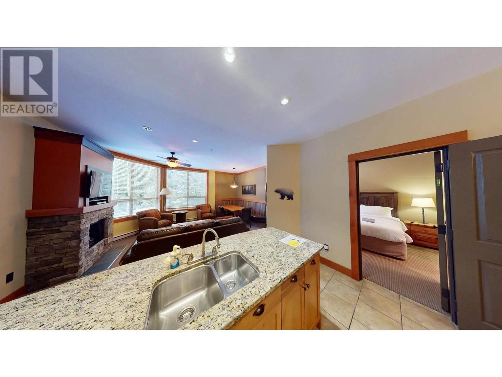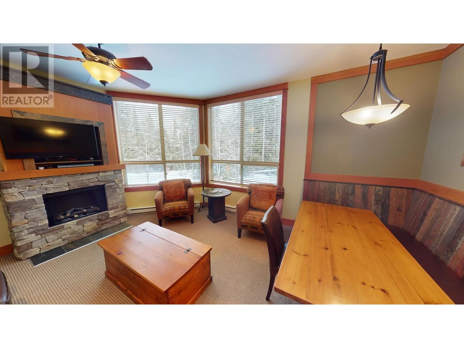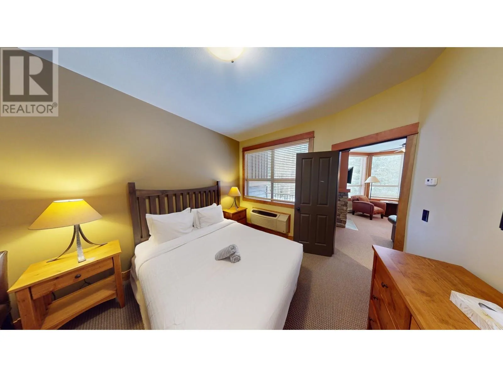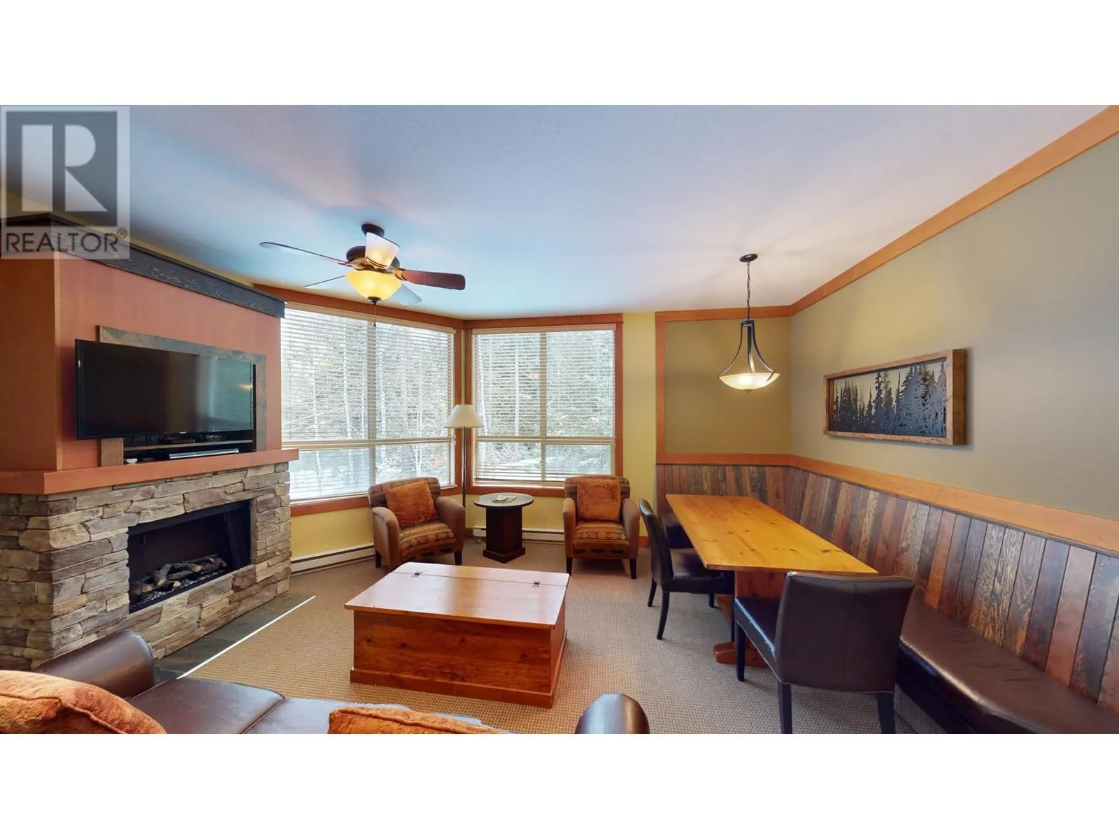 This stunning two-bedroom condo is situated on the second floor of Juniper Lodge, located on Timberline Crescent. Enter the building via a covered walkway that leads you into a welcoming lobby, complete with a spacious elevator for easy access to your unit. Start your day by sipping coffee while enjoying the morning sunlight streaming through every corner of this beautiful home. The dining area features built-in bench seating, while the cozy living room is centered around a charming fireplace, perfect for gathering. The condo offers two bedrooms and two bathrooms, both with heated tile flooring, as well as in-unit laundry. Step out onto the covered, all-season balcony, which boasts serene forest views. The unit's clever lock-off design allows it to be rented as either a one or two-bedroom suite, offering incredible flexibility. On-site amenities include a heated outdoor pool (open year-round), fitness room, spa, hot tubs, games rooms, and much more, ensuring an exceptional and affordable vacation experience. Additionally, you have the option to rent through the on-site property manager or exchange with other resorts worldwide. (id:27476)