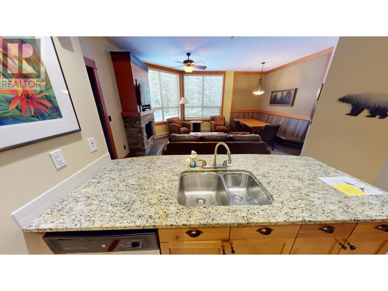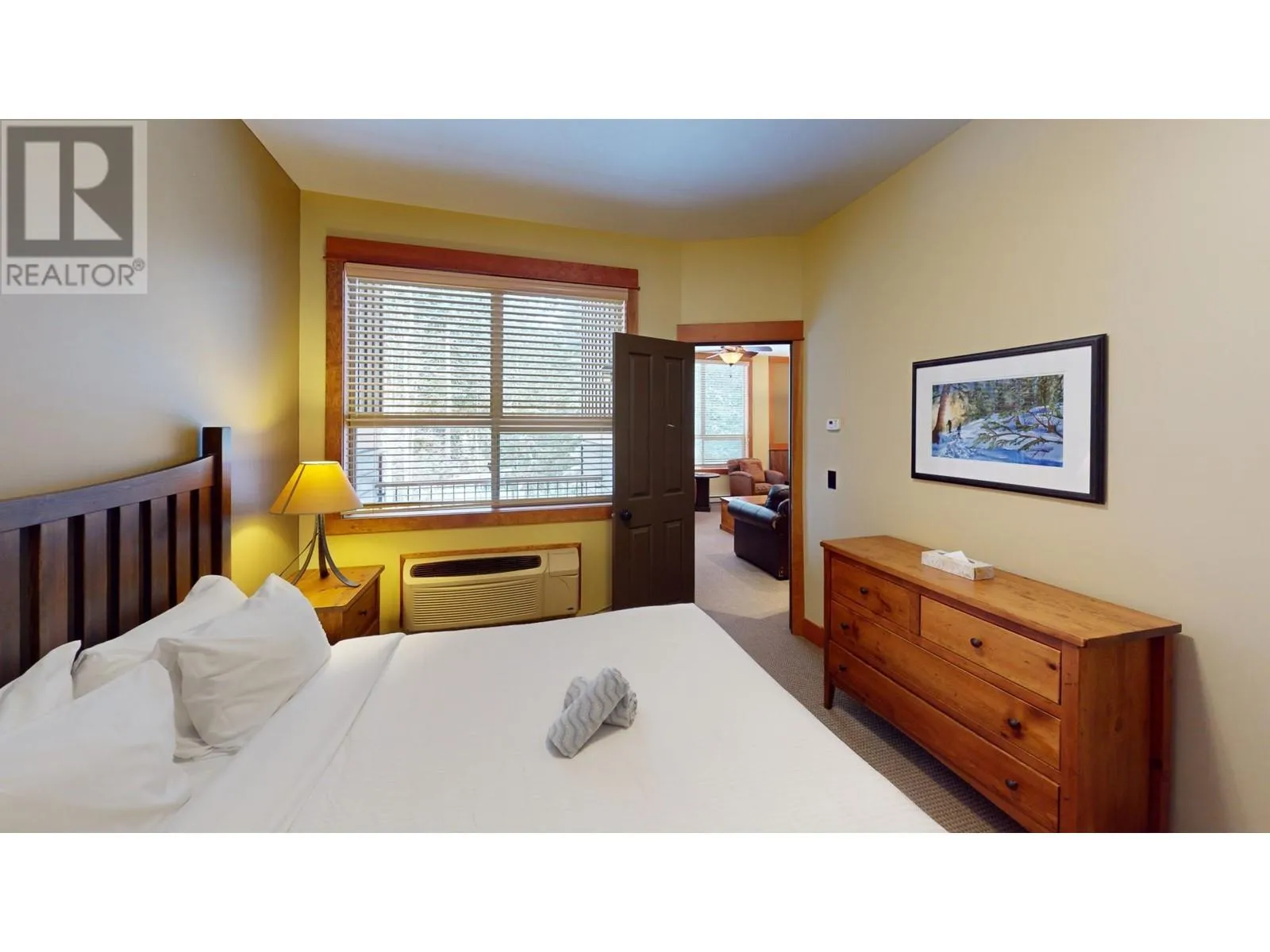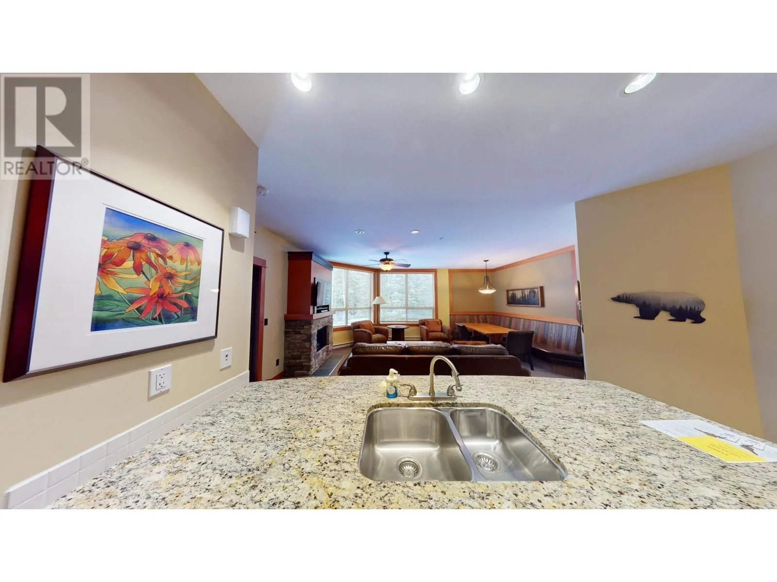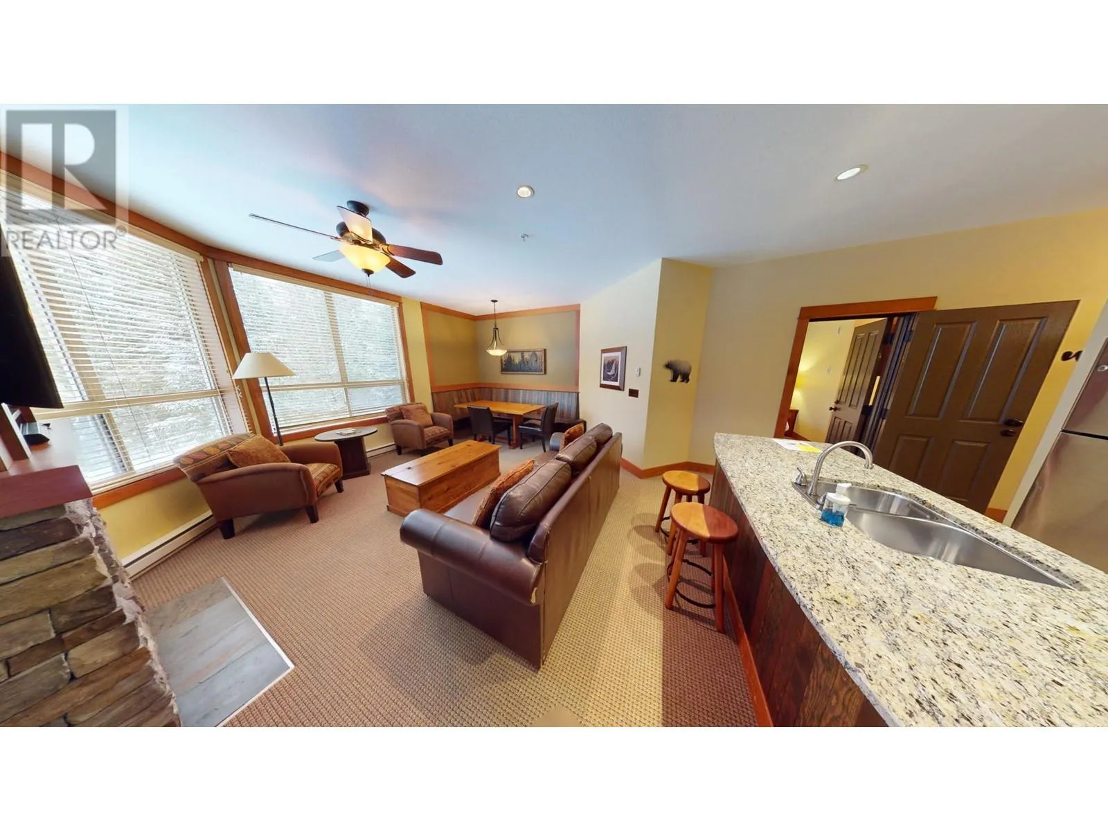 This stunning two-bedroom condo is situated on the second floor of Juniper Lodge, located on Timberline Crescent. Enter the building via a covered walkway that leads you into a welcoming lobby, complete with a spacious elevator for easy access to your unit. Start your day by sipping coffee while enjoying the morning sunlight streaming through every corner of this beautiful home. The dining area features built-in bench seating, while the cozy living room is centered around a charming fireplace, perfect for gathering. The condo offers two bedrooms and two bathrooms, both with heated tile flooring, as well as in-unit laundry. Step out onto the covered, all-season balcony, which boasts serene forest views. The unit's clever lock-off design allows it to be rented as either a one or two-bedroom suite, offering incredible flexibility. On-site amenities include a heated outdoor pool (open year-round), fitness room, spa, hot tubs, games rooms, and much more, ensuring an exceptional and affordable vacation experience. Additionally, you have the option to rent through the on-site property manager or exchange with other resorts worldwide. (id:27476)