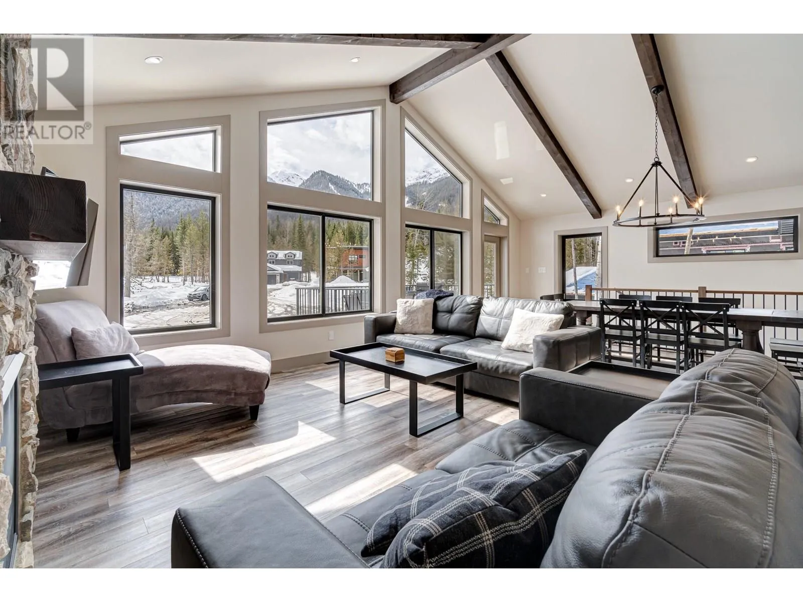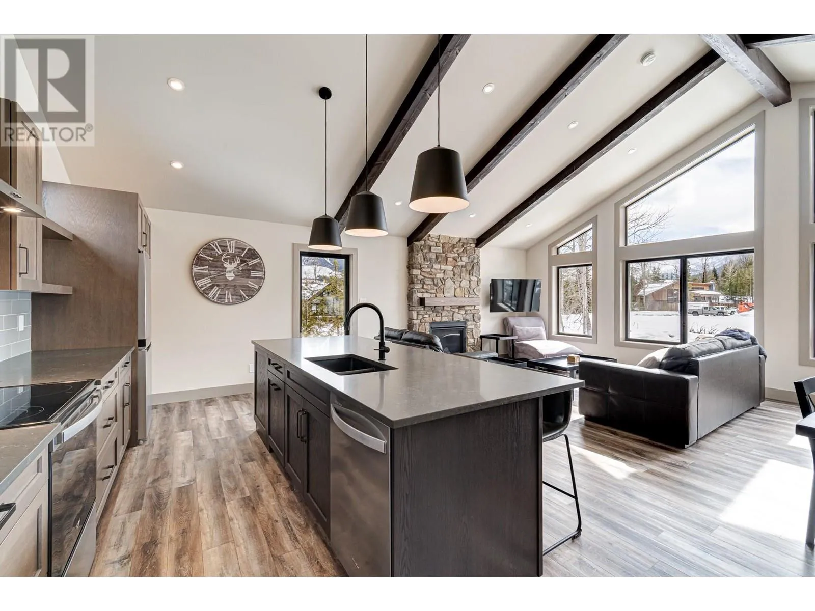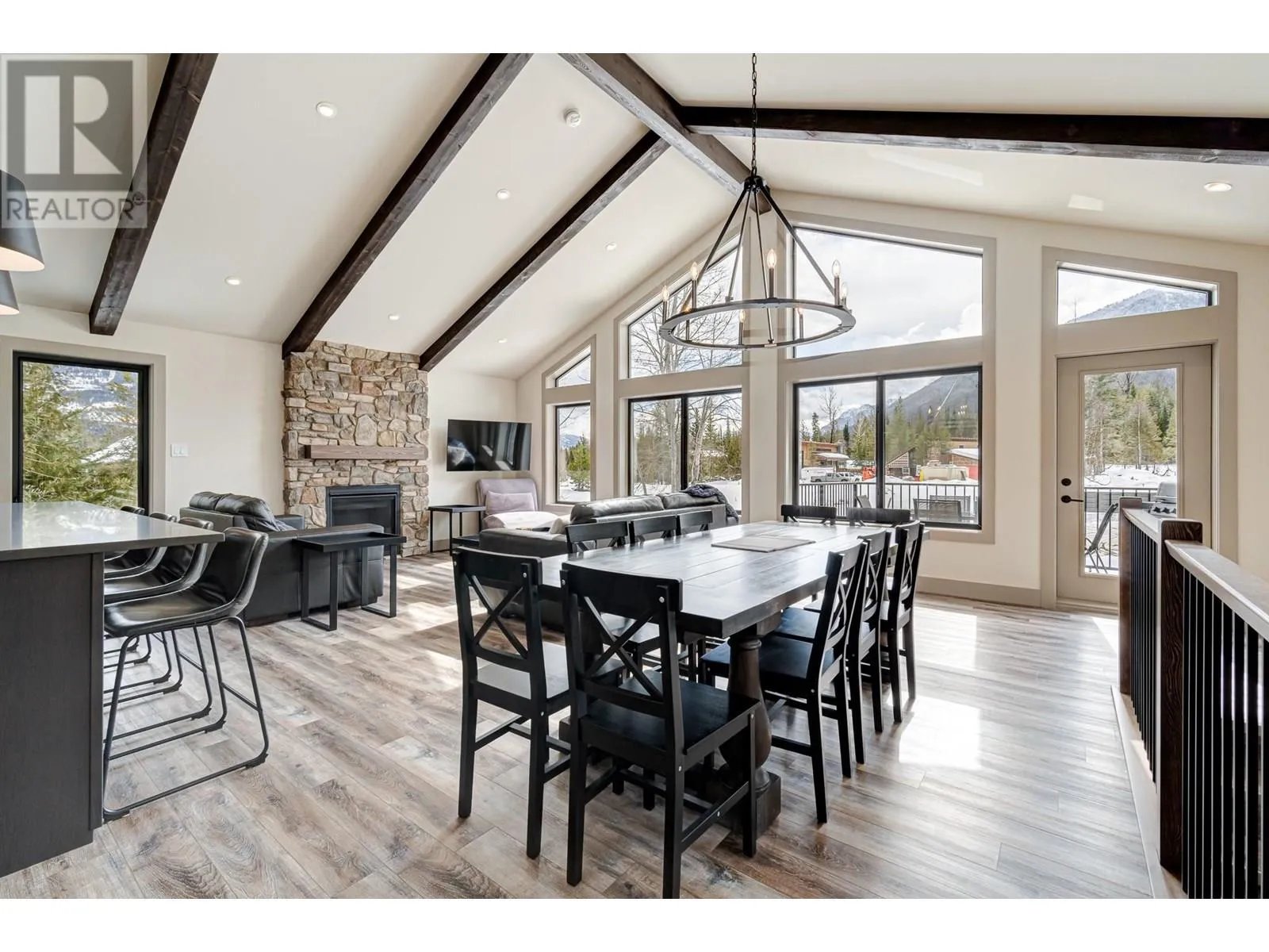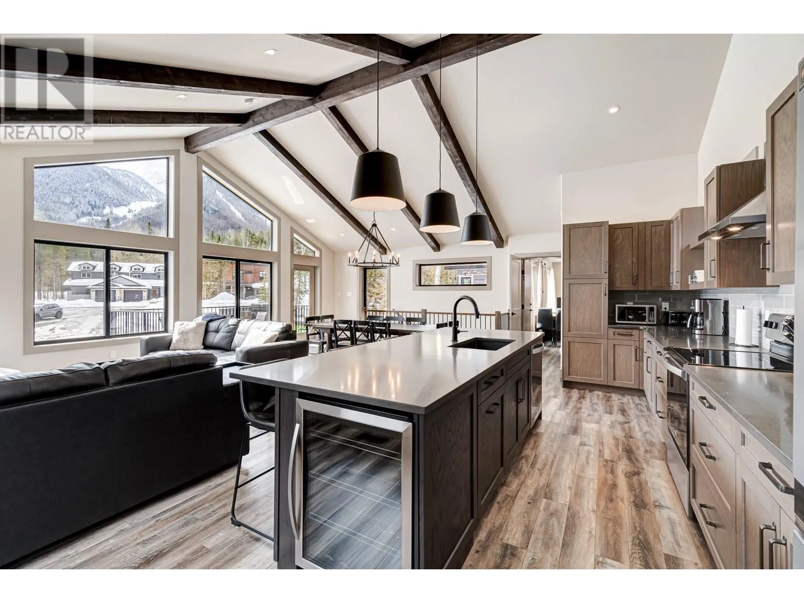 Step inside this 2024 built home in Timber Landing, ideally located on a quiet cul-de-sac and backing onto the ski out trail at the world famous Fernie Alpine Resort. This 5-bedroom, 4.5-bathroom home is tastefully designed and offers everything you need from a vacation getaway. The large driveway can play host to many vehicles or escape the snow in the spacious double garage. A large storage room located within the garage is the perfect place to store gear, valuables or supplies. The main floor offers a bright and functional entryway and a large rear mudroom with access to a back deck and hot tub, the master bedroom & ensuite and a guest bedroom and bathroom. The upper level features a grand, open concept main living room featuring warm neutral tones in the wood cabinets and stone fireplace surround. The gourmet kitchen, vaulted ceilings and large windows create a bright an inviting space to eat, relax and entertain. This level also features a 2-bedroom lock-off suite with a separate entrance, laundry, kitchen and living room with stone fireplace. Use it for revenue or as an extension of your main home! The basement level features a game and entertainment room, large bunk room, full bathroom and laundry & utility space. Don't miss your opportunity to tour this mountain retreat; call your Realtor today! (id:27476)