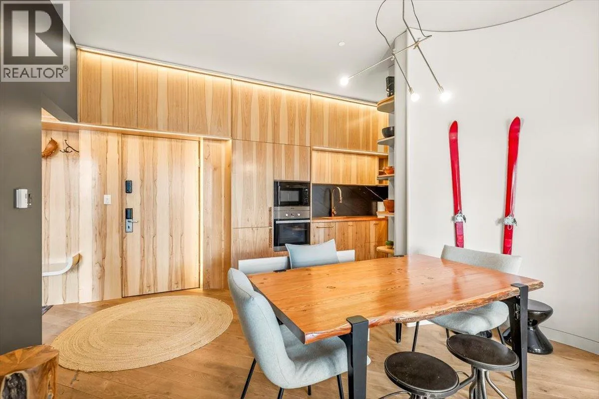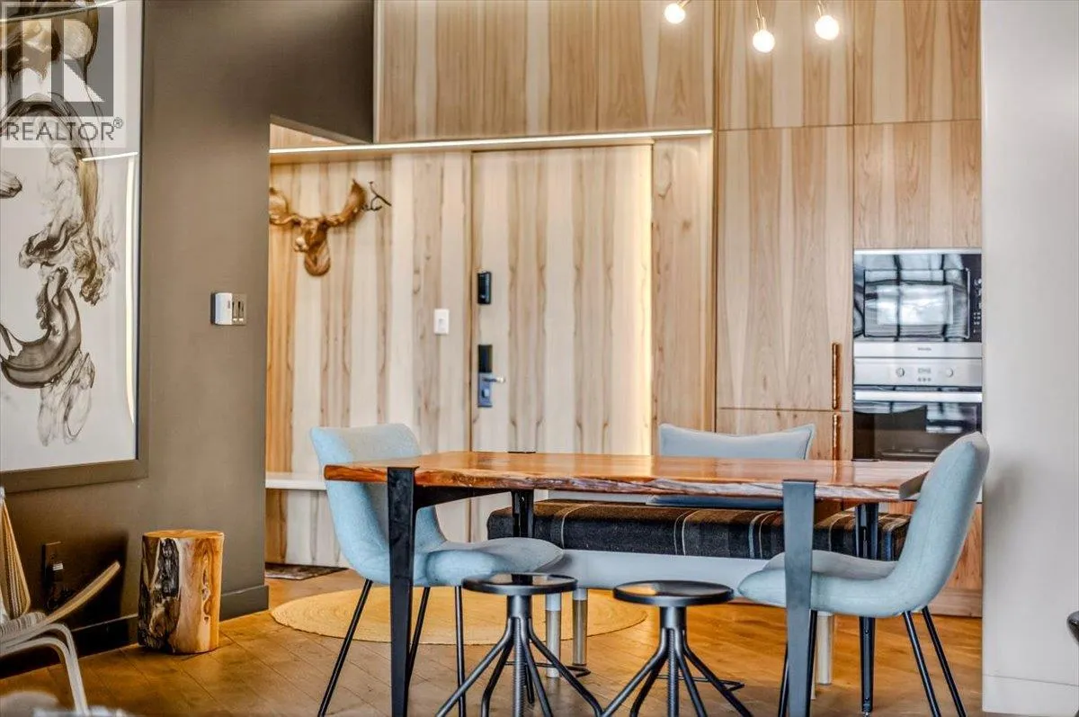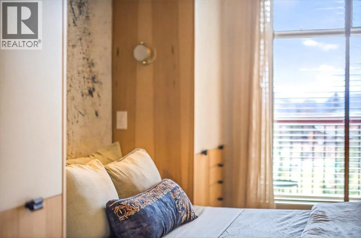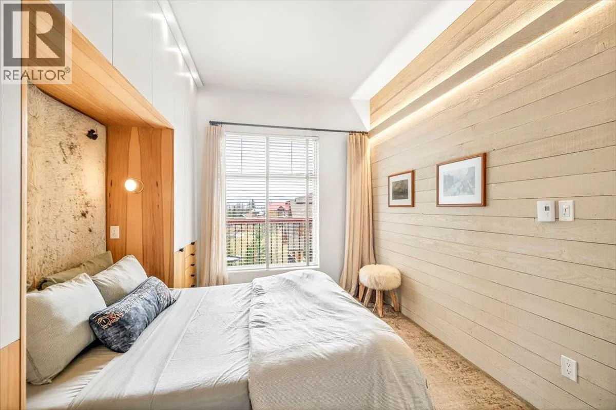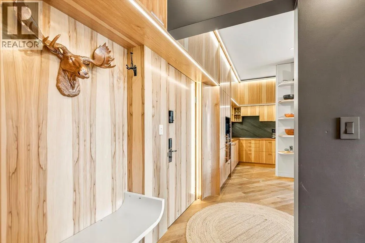 An unparalleled renovated urban-vibe unit within the coveted Snow Creek Lodge at Fernie Alpine Resortârare true ski-in/ski-out location, perfectly positioned overlooking the slopes. This 2-bedroom, 2-bath residence was completely gutted, reconfigured, and rebuilt to the highest standards. The ceiling was slightly lowered to incorporate advanced soundproofing from above, yet still provides a 9.5â ceiling height. Interior highlights include wide-plank oak flooring, custom hickory cabinetry, elegant curved walls and refined, custom design elements throughout. The dream kitchen features hidden Miele appliances, copper countertops and sink. Thoughtful hidden storage through out this unit is a welcome surprise. The primary suite is privately situated with custom built-ins, a cowhide headboard, and a spa-like ensuite boasting heated stone floors, petrified wood sink, Duravit toilet, and HansGrohe fixtures. The second bedroom offers flexible sleeping arrangements, with a cleverly designed nook perfect for children or guests, separated by custom barn doors. The second bath mirrors the same elevated finishes. Sold fully furnished, showcasing curated designer furnishings. Exceptional as a private retreat or investment, with no Airbnb restrictions. Excellent historical rental revenues. Complex amenities include secure entry, heated parkade, outdoor heated pool, hot tubs, BBQ area, and a welcoming indoor lounge with a stunning fireplace. A rare opportunity for the discerning buyer. (id:27476)