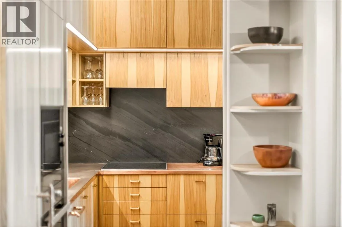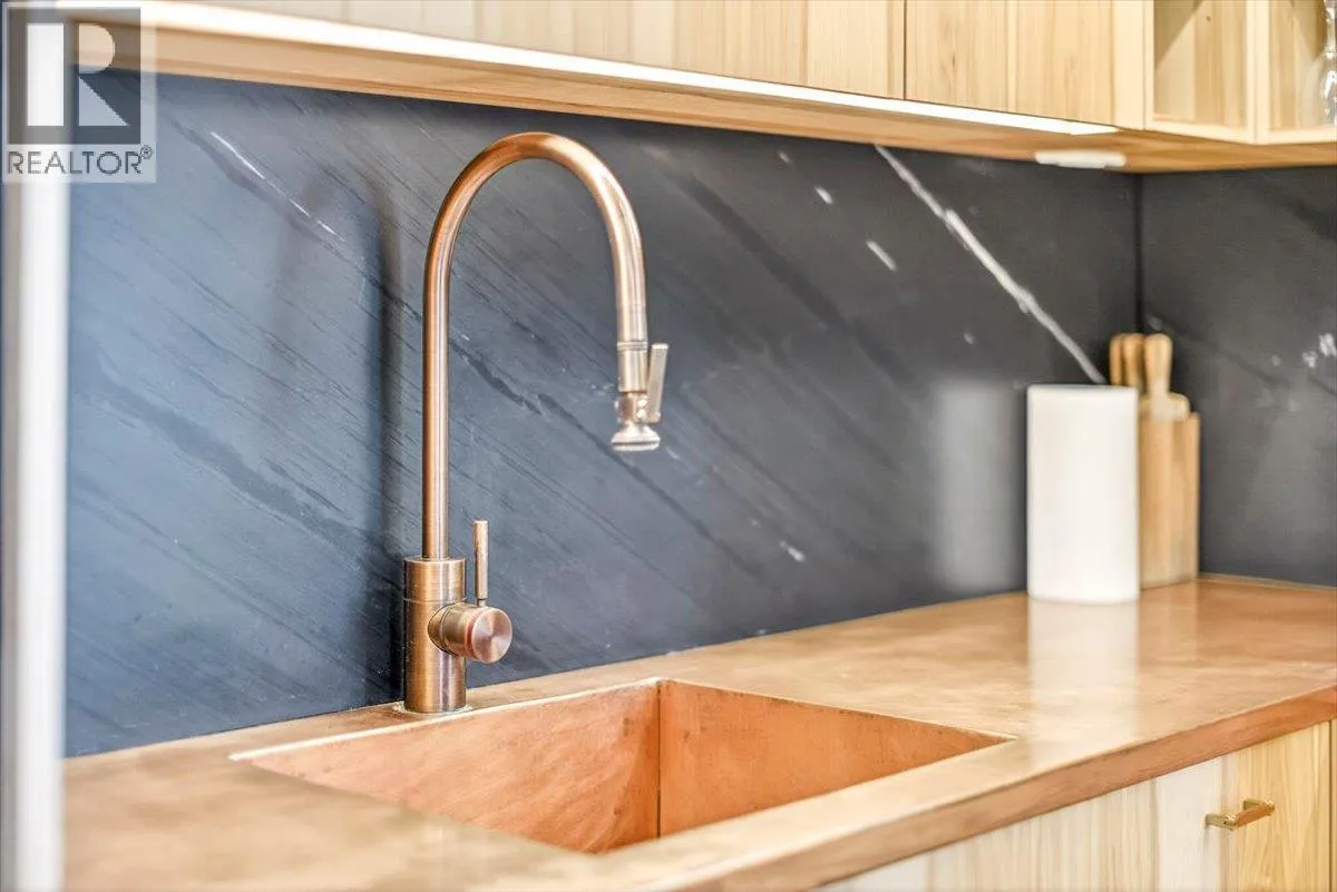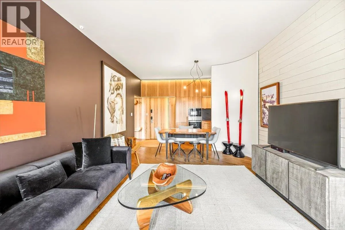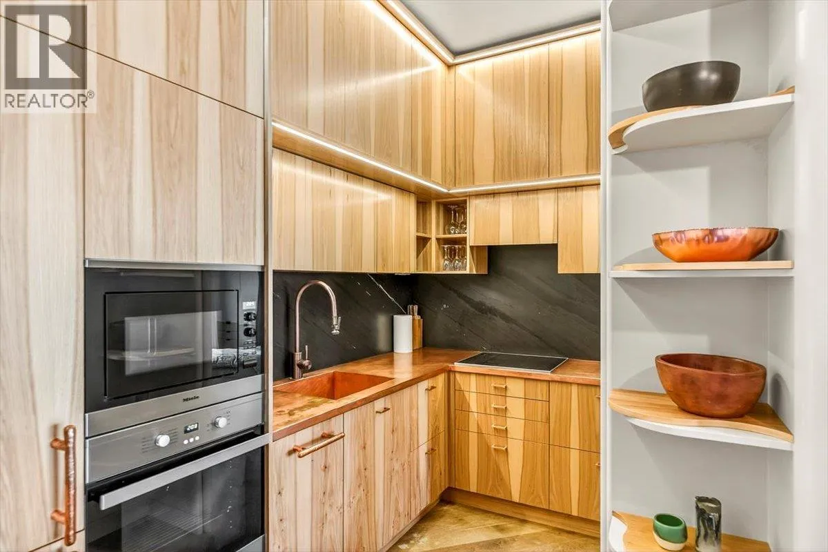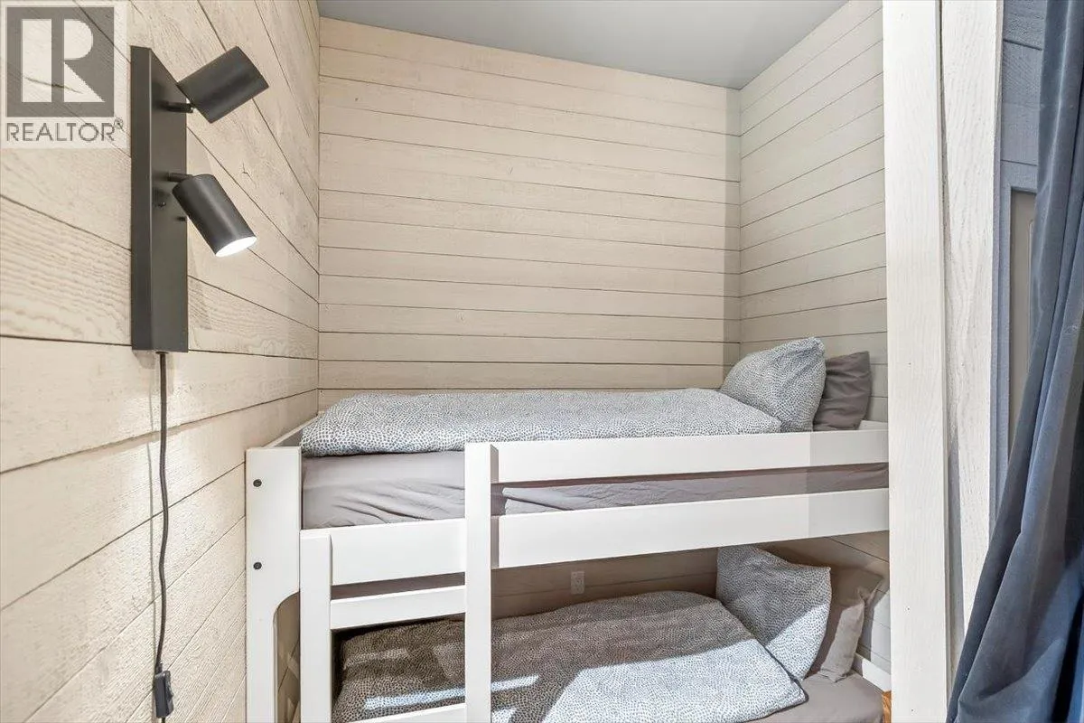 An unparalleled renovated urban-vibe unit within the coveted Snow Creek Lodge at Fernie Alpine Resortârare true ski-in/ski-out location, perfectly positioned overlooking the slopes. This 2-bedroom, 2-bath residence was completely gutted, reconfigured, and rebuilt to the highest standards. The ceiling was slightly lowered to incorporate advanced soundproofing from above, yet still provides a 9.5â ceiling height. Interior highlights include wide-plank oak flooring, custom hickory cabinetry, elegant curved walls and refined, custom design elements throughout. The dream kitchen features hidden Miele appliances, copper countertops and sink. Thoughtful hidden storage through out this unit is a welcome surprise. The primary suite is privately situated with custom built-ins, a cowhide headboard, and a spa-like ensuite boasting heated stone floors, petrified wood sink, Duravit toilet, and HansGrohe fixtures. The second bedroom offers flexible sleeping arrangements, with a cleverly designed nook perfect for children or guests, separated by custom barn doors. The second bath mirrors the same elevated finishes. Sold fully furnished, showcasing curated designer furnishings. Exceptional as a private retreat or investment, with no Airbnb restrictions. Excellent historical rental revenues. Complex amenities include secure entry, heated parkade, outdoor heated pool, hot tubs, BBQ area, and a welcoming indoor lounge with a stunning fireplace. A rare opportunity for the discerning buyer. (id:27476)