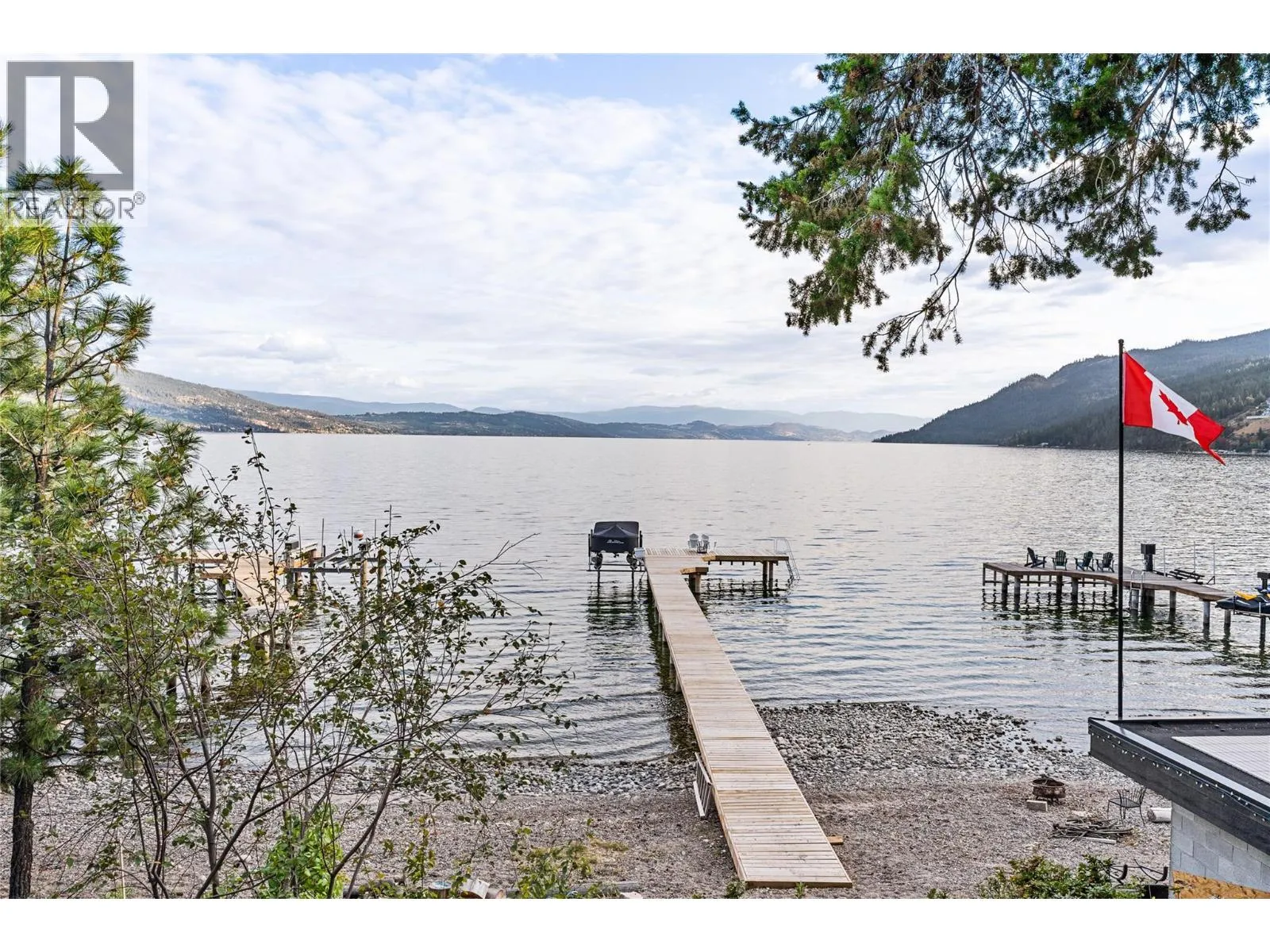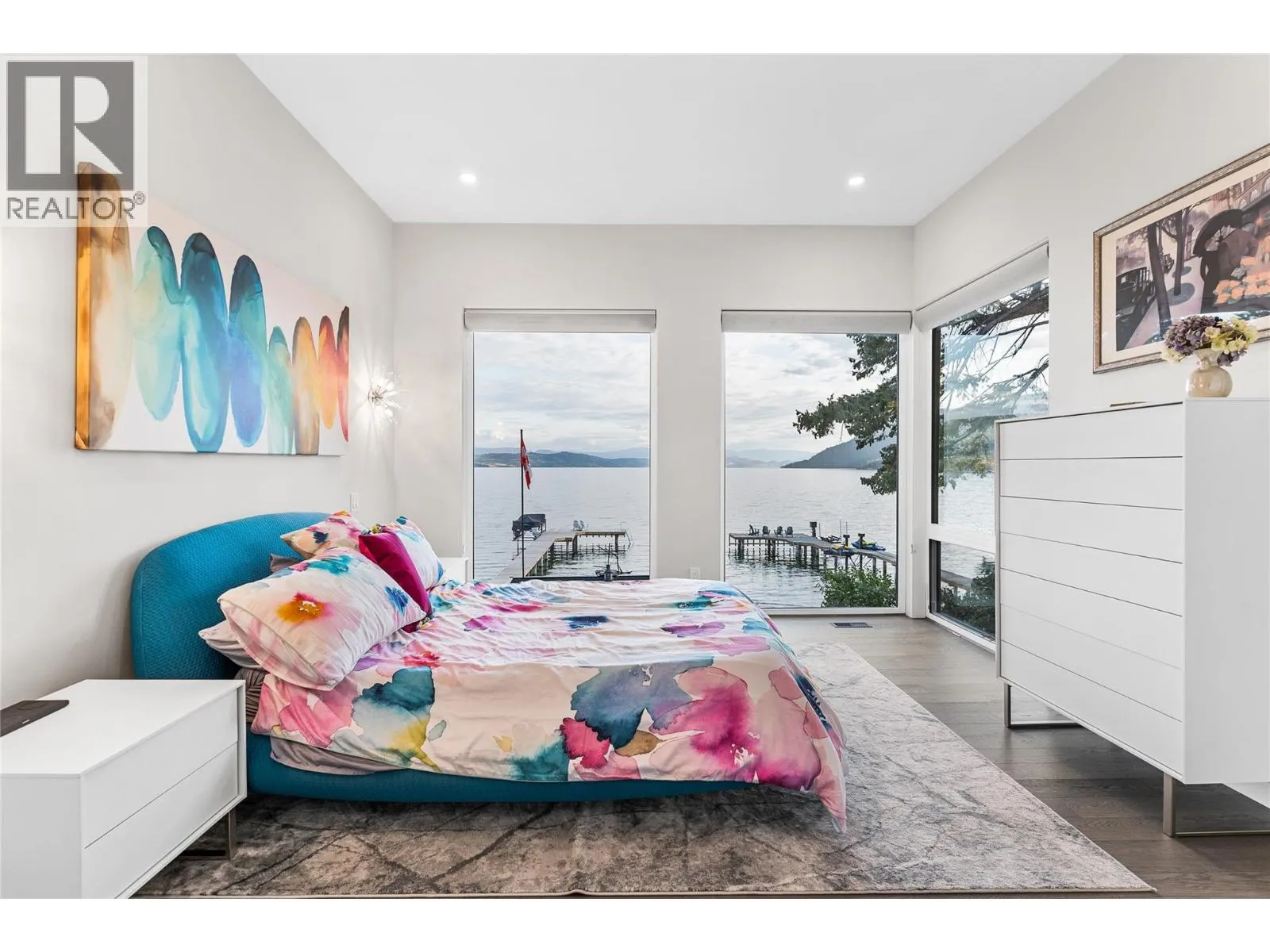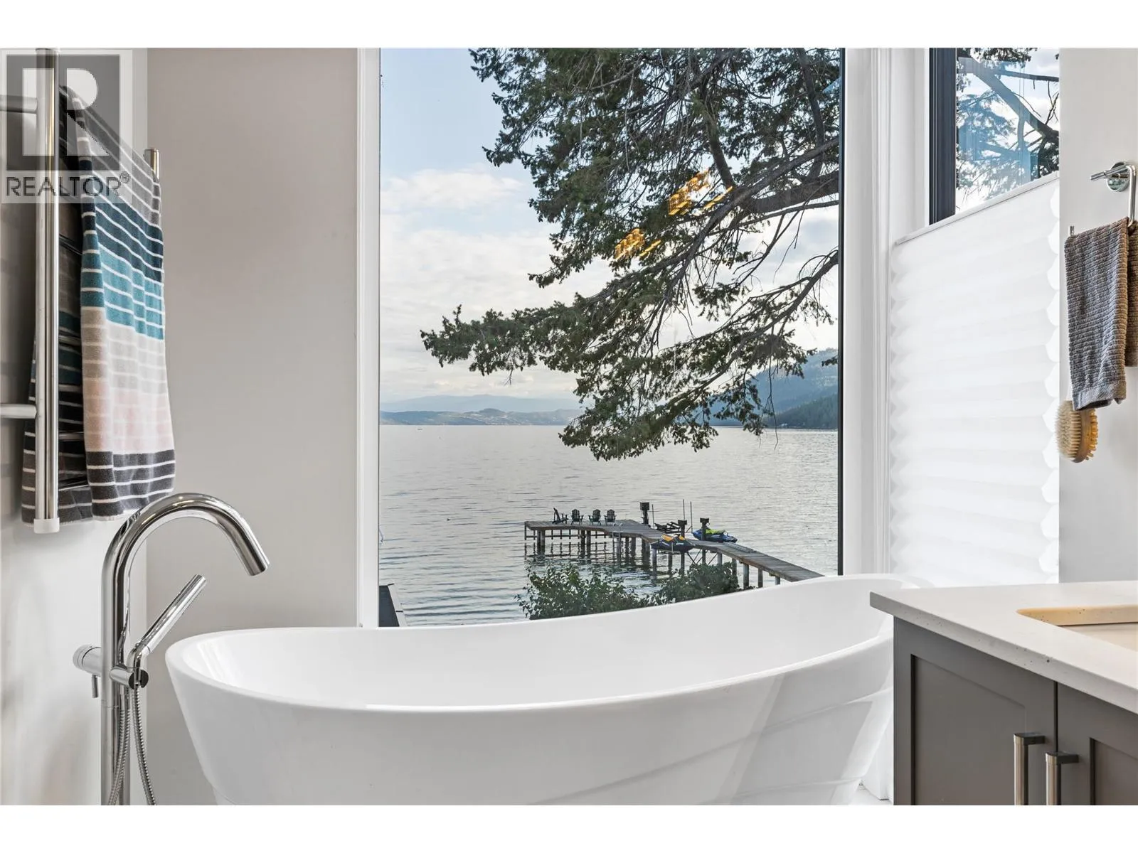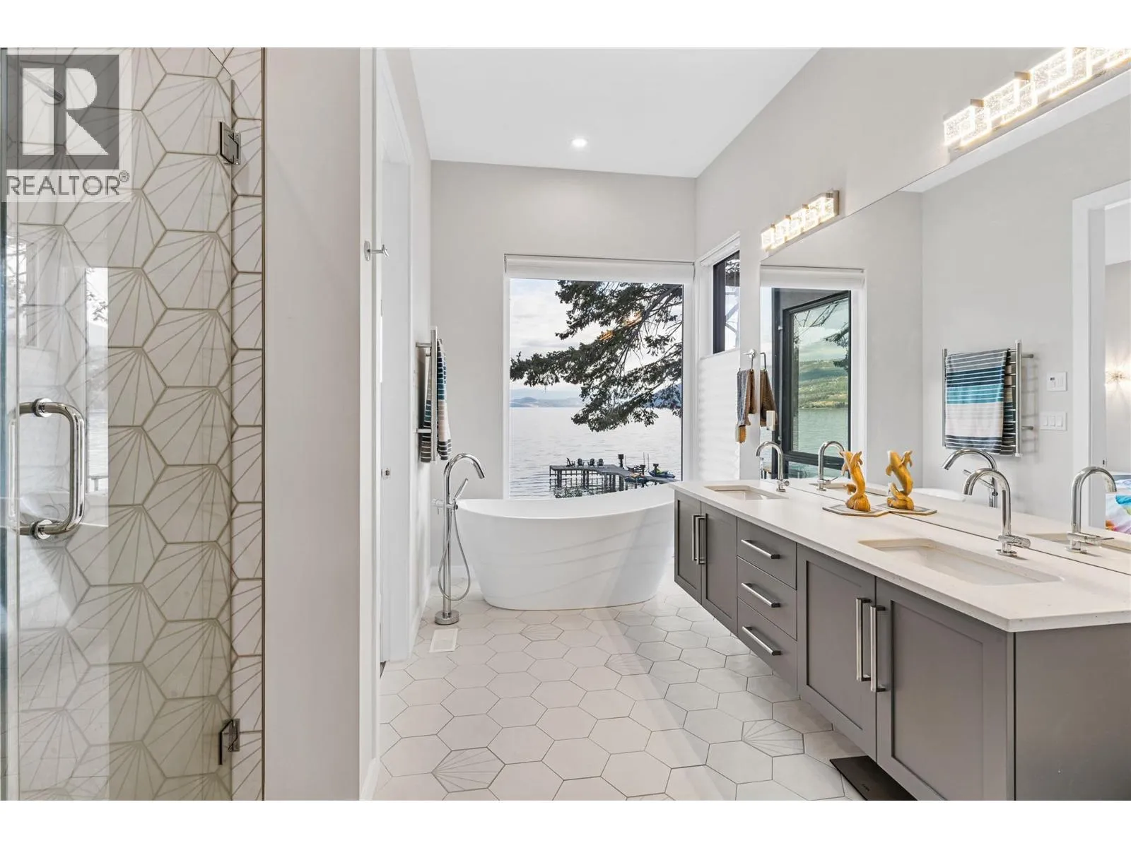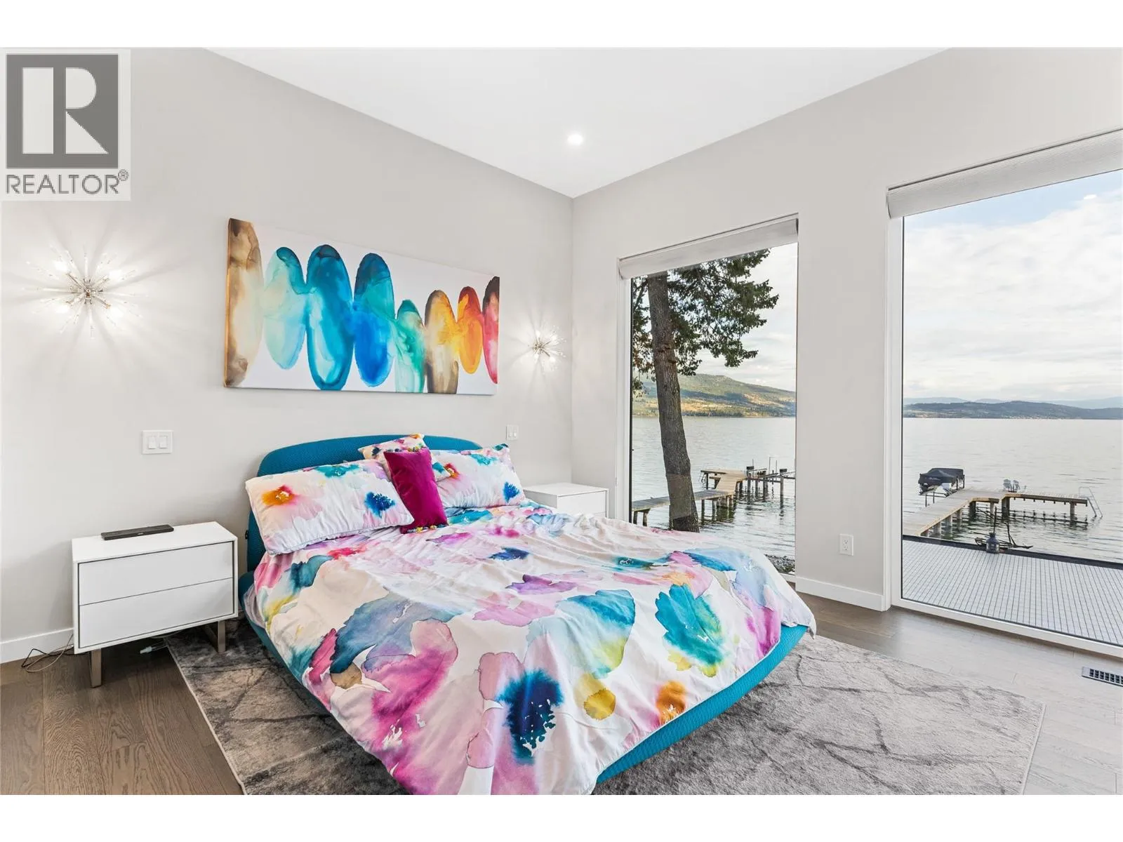 Experience the best of Okanagan lakefront living in this custom-built 4-bedroom, 3-bathroom, 2,755 sq. ft. walkout rancher on a flat lot with prime shoreline & breathtaking panoramic views. Inside, 14â ceilings and expansive windows flood the open concept living space with natural light, while the elegant kitchen seamlessly connects to the dining and living areas, all with stunning lake views. The main-level primary bedroom is a true retreat, featuring a spa-like ensuite with heated floors, a freestanding tub, oversized shower, heated towel bar, walk-in California Closet, and direct access to the laundry room. The lower level offers polished concrete floors, a spacious family room, 3 additional bedrooms, a full bathroom, and a versatile space beneath the suspended slab ready to be transformed into a theatre room or gym. A triple-car garage/workshop provides ample storage and workspace for hobbyists or outdoor gear. Outdoors, enjoy a 140-foot dock with a 6,000 lb solar-powered Paradise boat lift, expansive beach, firepit, covered deck with hot tub, and a heated outdoor shower. The lakeside boathouse, currently used for storage, includes 40-amp service and is ready to be reimagined as a shaded entertaining space or lakeside bar. Modern comforts include fibre optic internet, propane service, and full smart home features for security and convenience. Located outside the speculation tax zone, this home offers the perfect blend of year-round living or a luxury summer getaway. (id:27476)