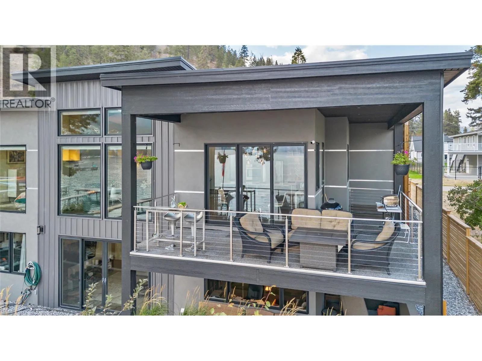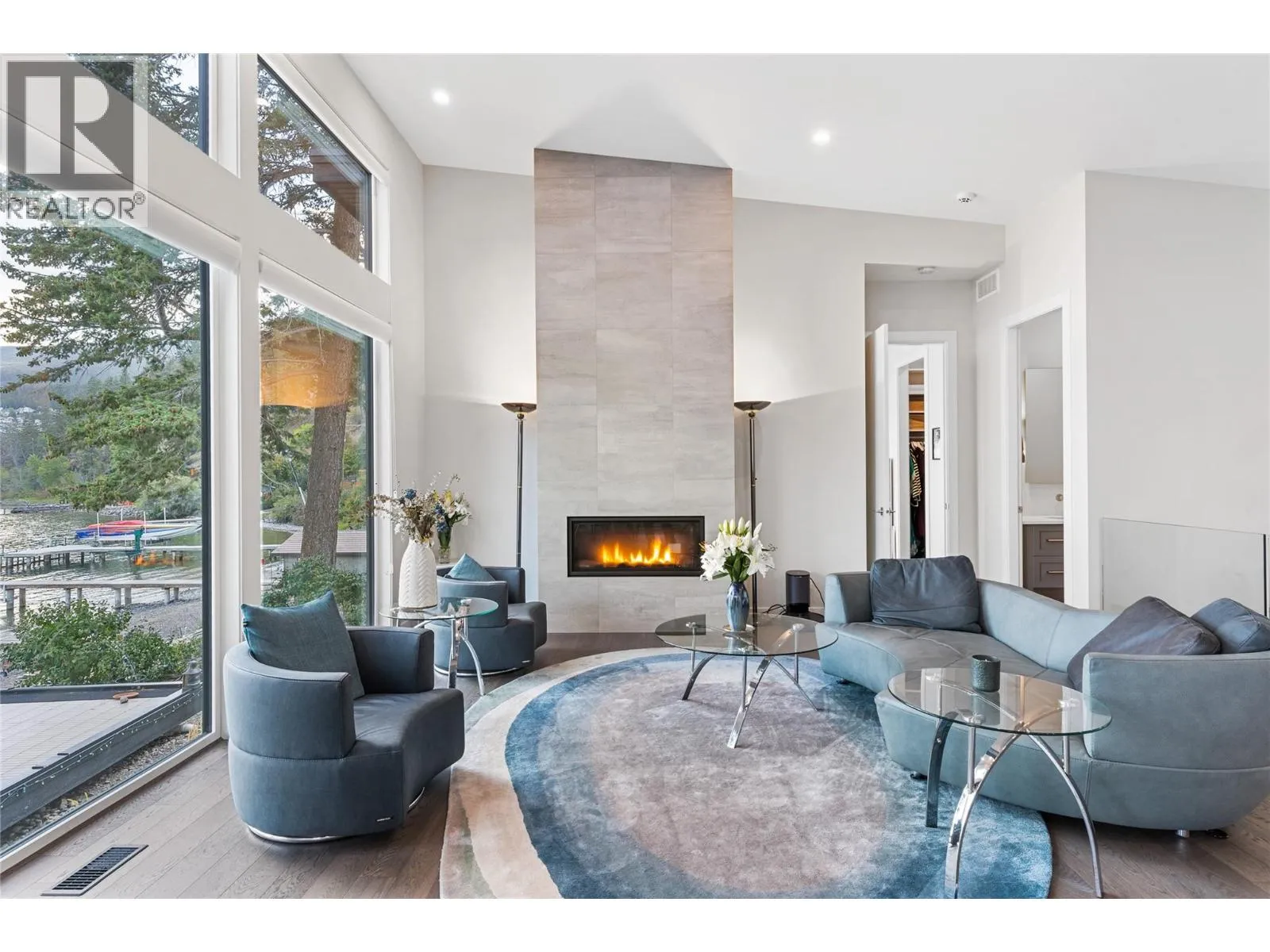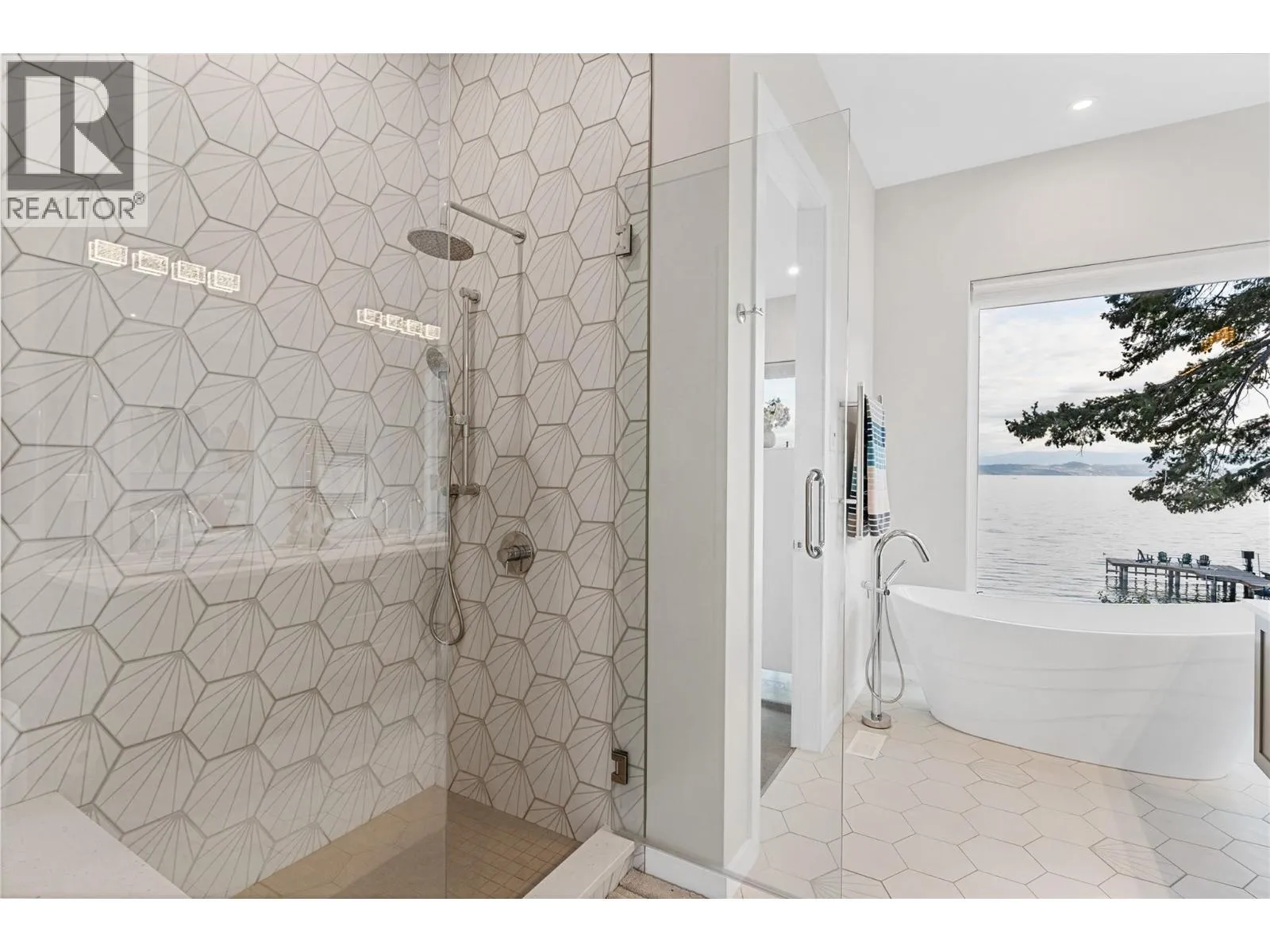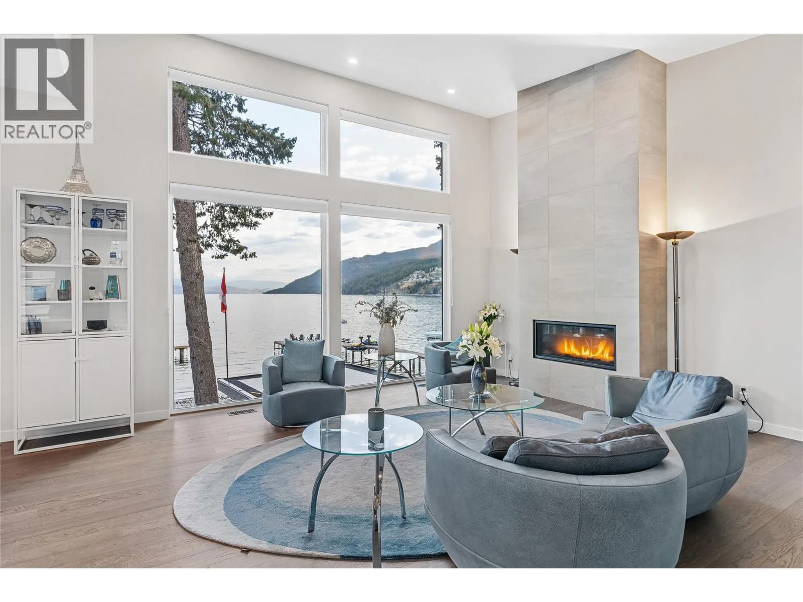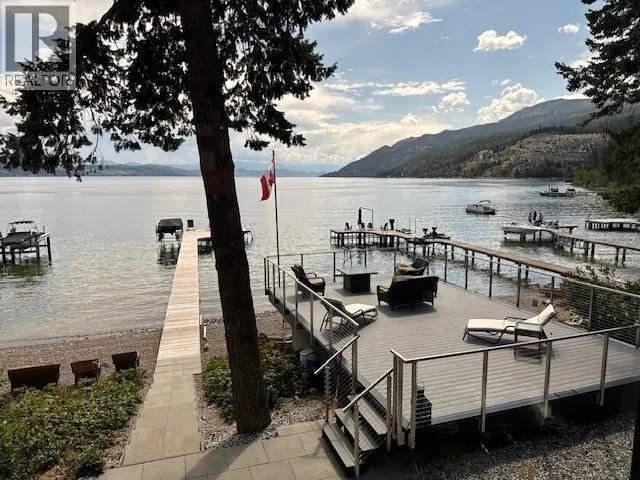 Experience the best of Okanagan lakefront living in this custom-built 4-bedroom, 3-bathroom, 2,755 sq. ft. walkout rancher on a flat lot with prime shoreline & breathtaking panoramic views. Inside, 14â ceilings and expansive windows flood the open concept living space with natural light, while the elegant kitchen seamlessly connects to the dining and living areas, all with stunning lake views. The main-level primary bedroom is a true retreat, featuring a spa-like ensuite with heated floors, a freestanding tub, oversized shower, heated towel bar, walk-in California Closet, and direct access to the laundry room. The lower level offers polished concrete floors, a spacious family room, 3 additional bedrooms, a full bathroom, and a versatile space beneath the suspended slab ready to be transformed into a theatre room or gym. A triple-car garage/workshop provides ample storage and workspace for hobbyists or outdoor gear. Outdoors, enjoy a 140-foot dock with a 6,000 lb solar-powered Paradise boat lift, expansive beach, firepit, covered deck with hot tub, and a heated outdoor shower. The lakeside boathouse, currently used for storage, includes 40-amp service and is ready to be reimagined as a shaded entertaining space or lakeside bar. Modern comforts include fibre optic internet, propane service, and full smart home features for security and convenience. Located outside the speculation tax zone, this home offers the perfect blend of year-round living or a luxury summer getaway. (id:27476)