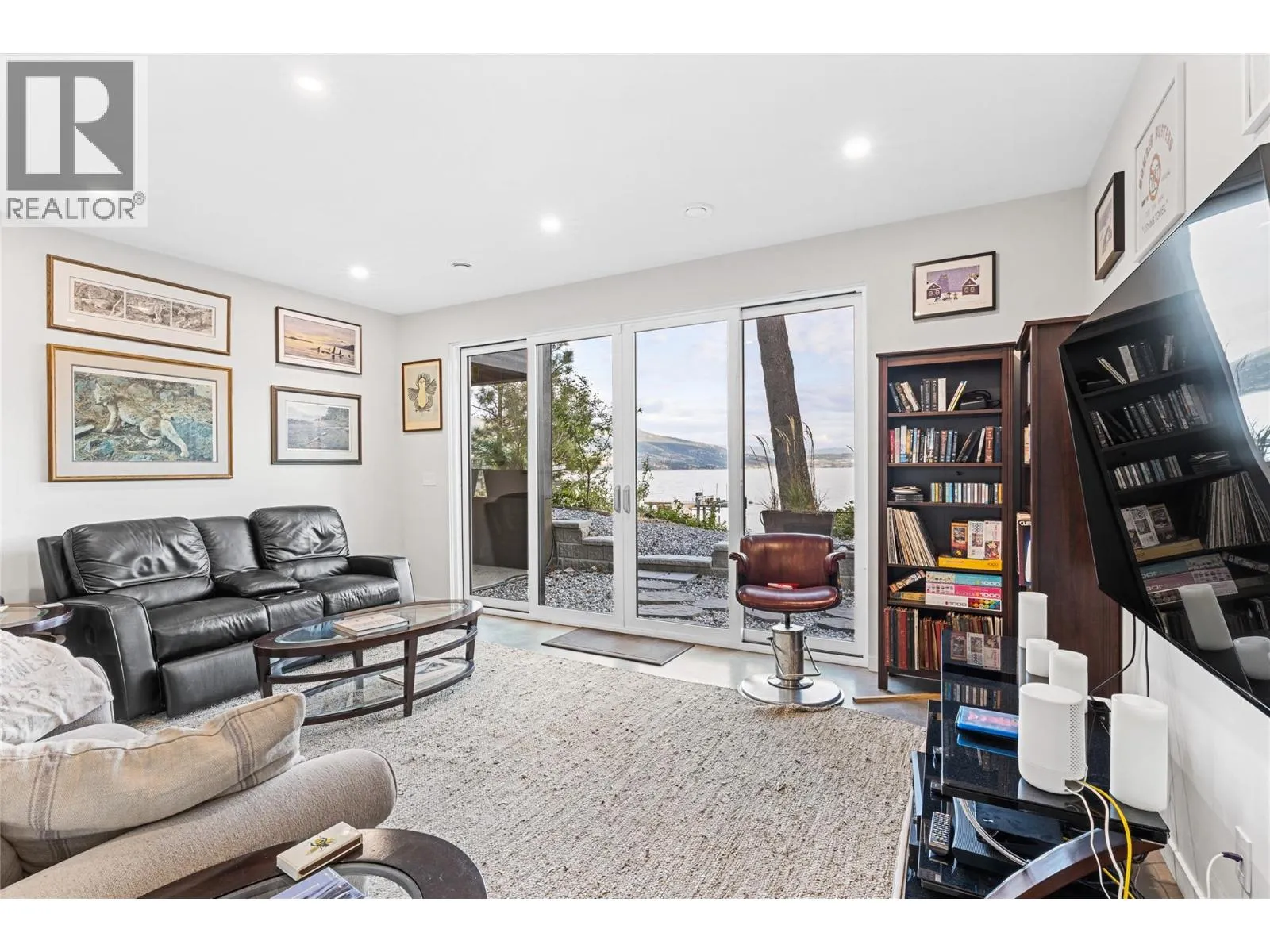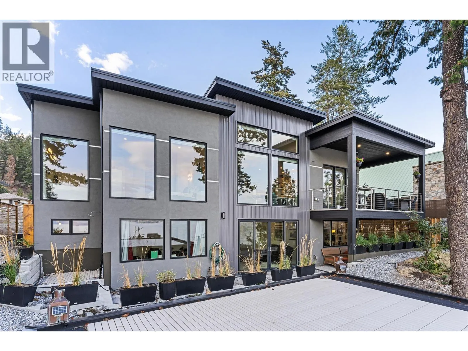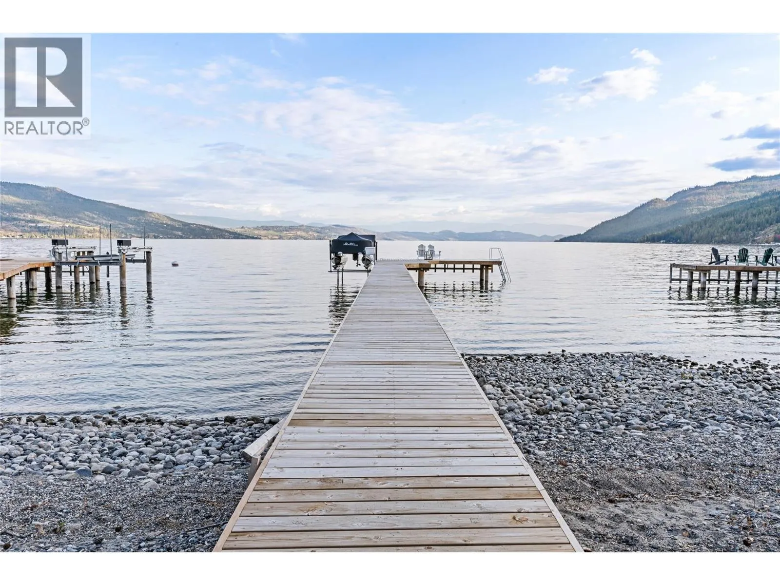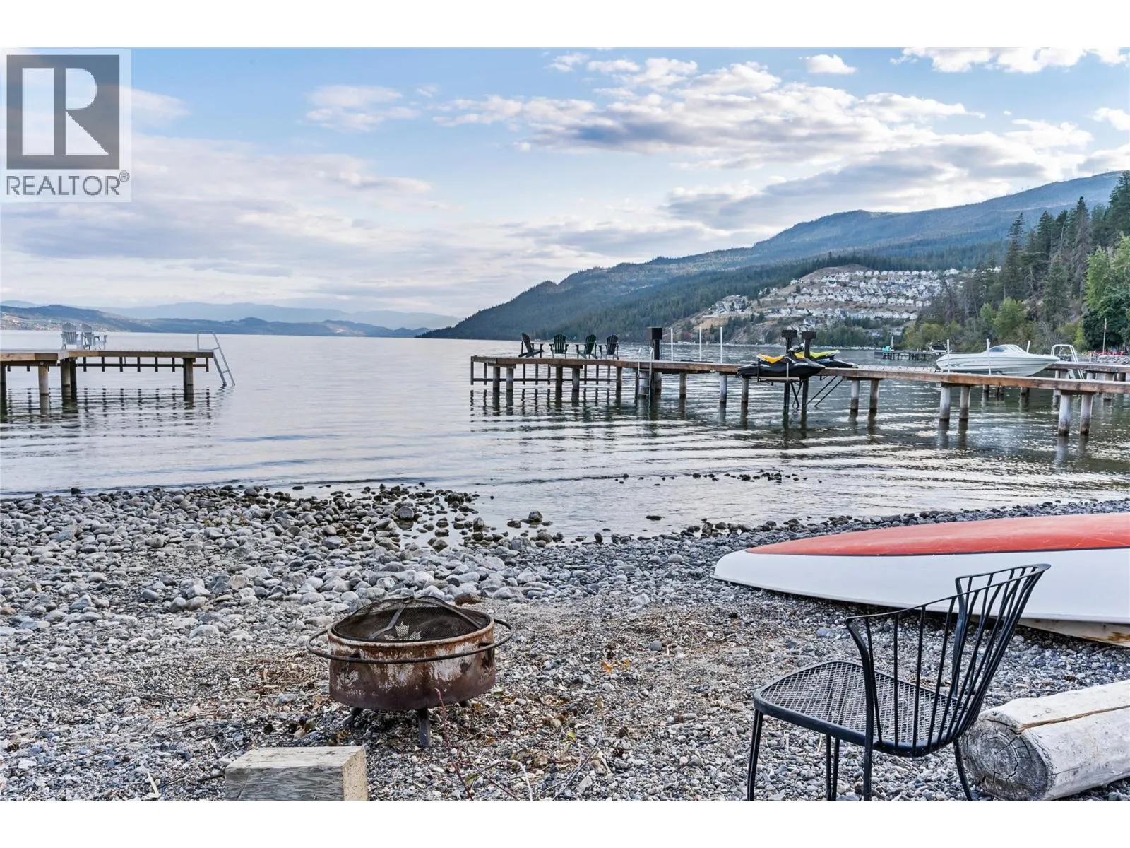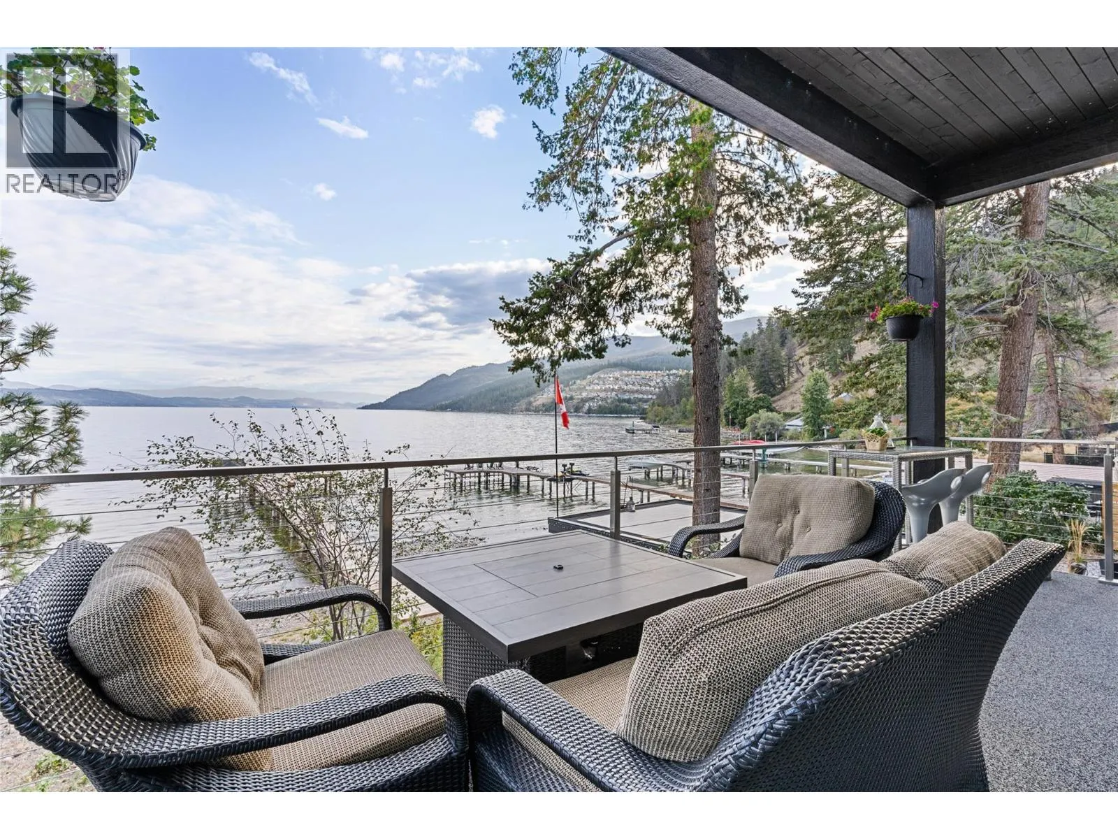 Experience the best of Okanagan lakefront living in this custom-built 4-bedroom, 3-bathroom, 2,755 sq. ft. walkout rancher on a flat lot with prime shoreline & breathtaking panoramic views. Inside, 14â ceilings and expansive windows flood the open concept living space with natural light, while the elegant kitchen seamlessly connects to the dining and living areas, all with stunning lake views. The main-level primary bedroom is a true retreat, featuring a spa-like ensuite with heated floors, a freestanding tub, oversized shower, heated towel bar, walk-in California Closet, and direct access to the laundry room. The lower level offers polished concrete floors, a spacious family room, 3 additional bedrooms, a full bathroom, and a versatile space beneath the suspended slab ready to be transformed into a theatre room or gym. A triple-car garage/workshop provides ample storage and workspace for hobbyists or outdoor gear. Outdoors, enjoy a 140-foot dock with a 6,000 lb solar-powered Paradise boat lift, expansive beach, firepit, covered deck with hot tub, and a heated outdoor shower. The lakeside boathouse, currently used for storage, includes 40-amp service and is ready to be reimagined as a shaded entertaining space or lakeside bar. Modern comforts include fibre optic internet, propane service, and full smart home features for security and convenience. Located outside the speculation tax zone, this home offers the perfect blend of year-round living or a luxury summer getaway. (id:27476)
