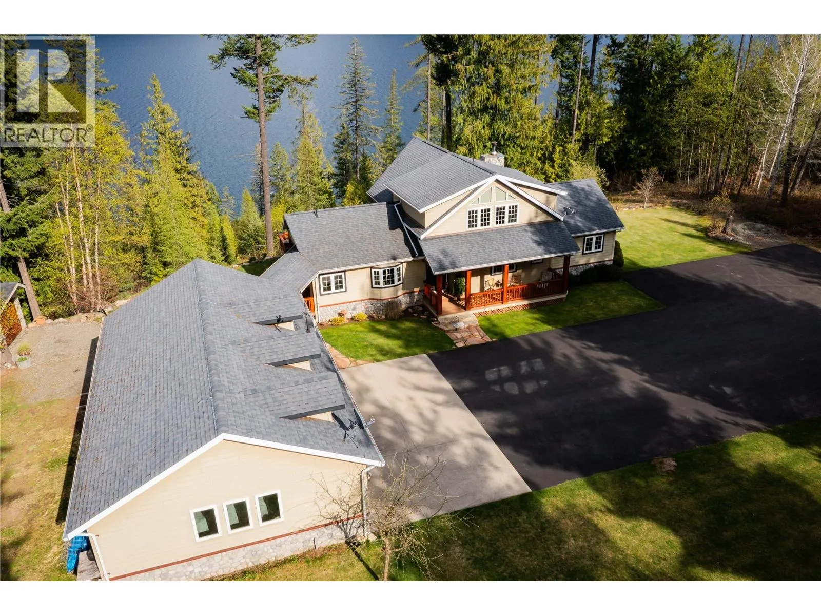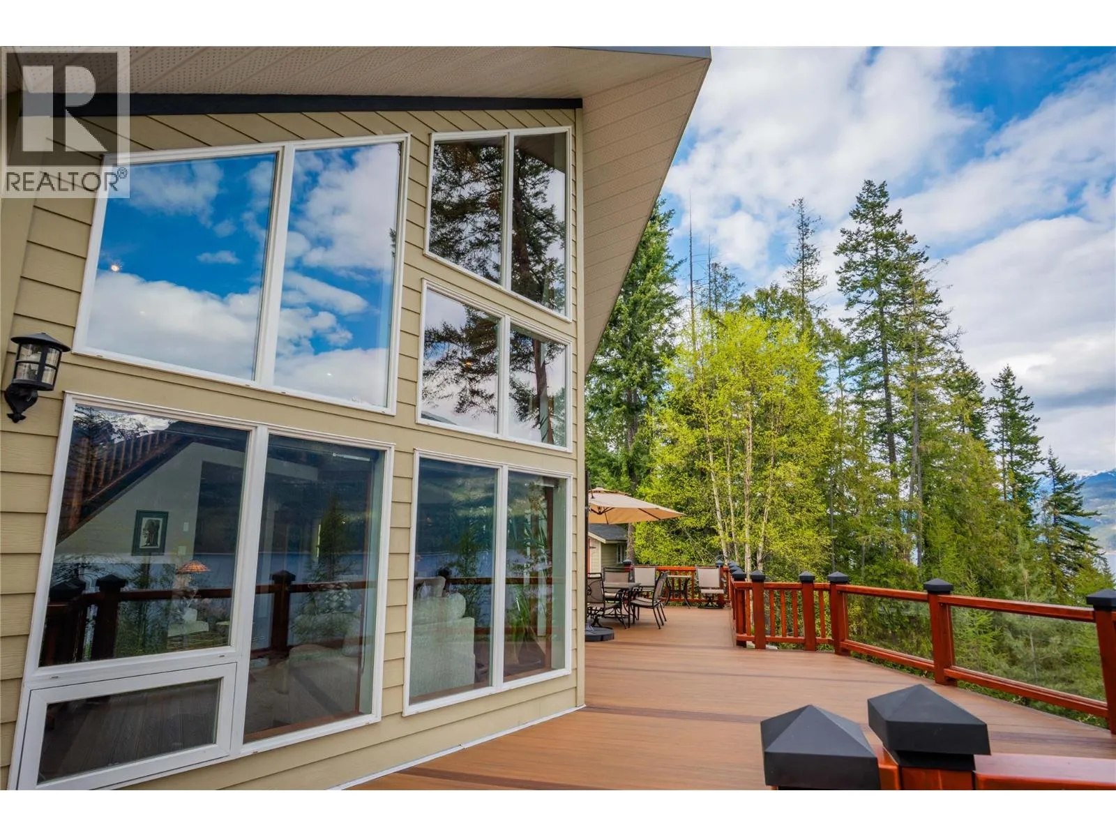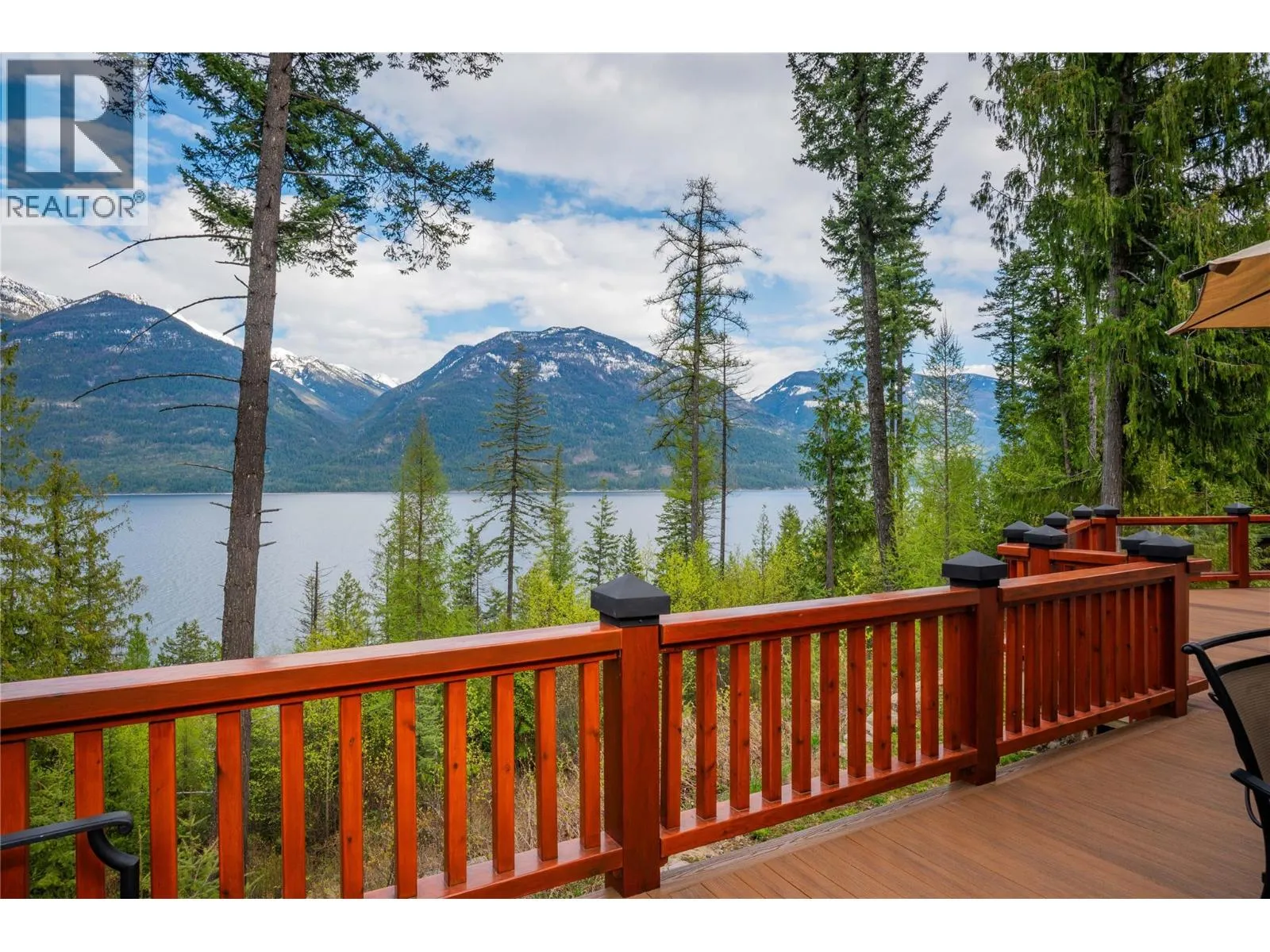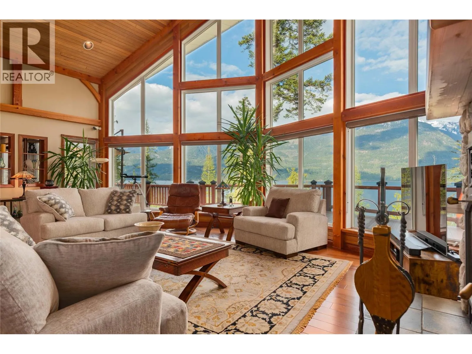This stunning 6.03-acre waterfront estate offers an exceptional blend of luxury, privacy, and breathtaking views of Kootenay Lake and the Purcell Mountains. Thoughtfully designed to embrace its spectacular setting, the home features floor-to-ceiling windows that flood the interior with natural light and frame panoramic lake and mountain vistas. The main living area is anchored by a dramatic floor-to-ceiling wood-burning fireplace, creating a warm and inviting atmosphere year-round. The kitchen boasts abundant counter space, generous storage, and an eating bar, perfect for entertaining. Off the dining room, French doors open to a wraparound deck, offering stunning outdoor living and entertaining spaces. The main level includes a spacious bedroom, full bathroom, laundry and mudroom, and a luxurious primary suite with full ensuite and direct deck access. The upper level, currently used as an office and family room with a 2-piece bathroom, offers flexibility as a guest suite or additional primary retreat. The lower level provides expansive recreation and games rooms, ample storage, utility space, and an additional bathroom. Completing the property are beautifully landscaped grounds, a triple-car detached garage with workshop, and a large quonset ideal for recreational vehicles, boat or a motorhome. With recent updates including a new heat pump and hot water tank (2024), this exceptional waterfront home must be seen to be truly appreciated. (id:27476)