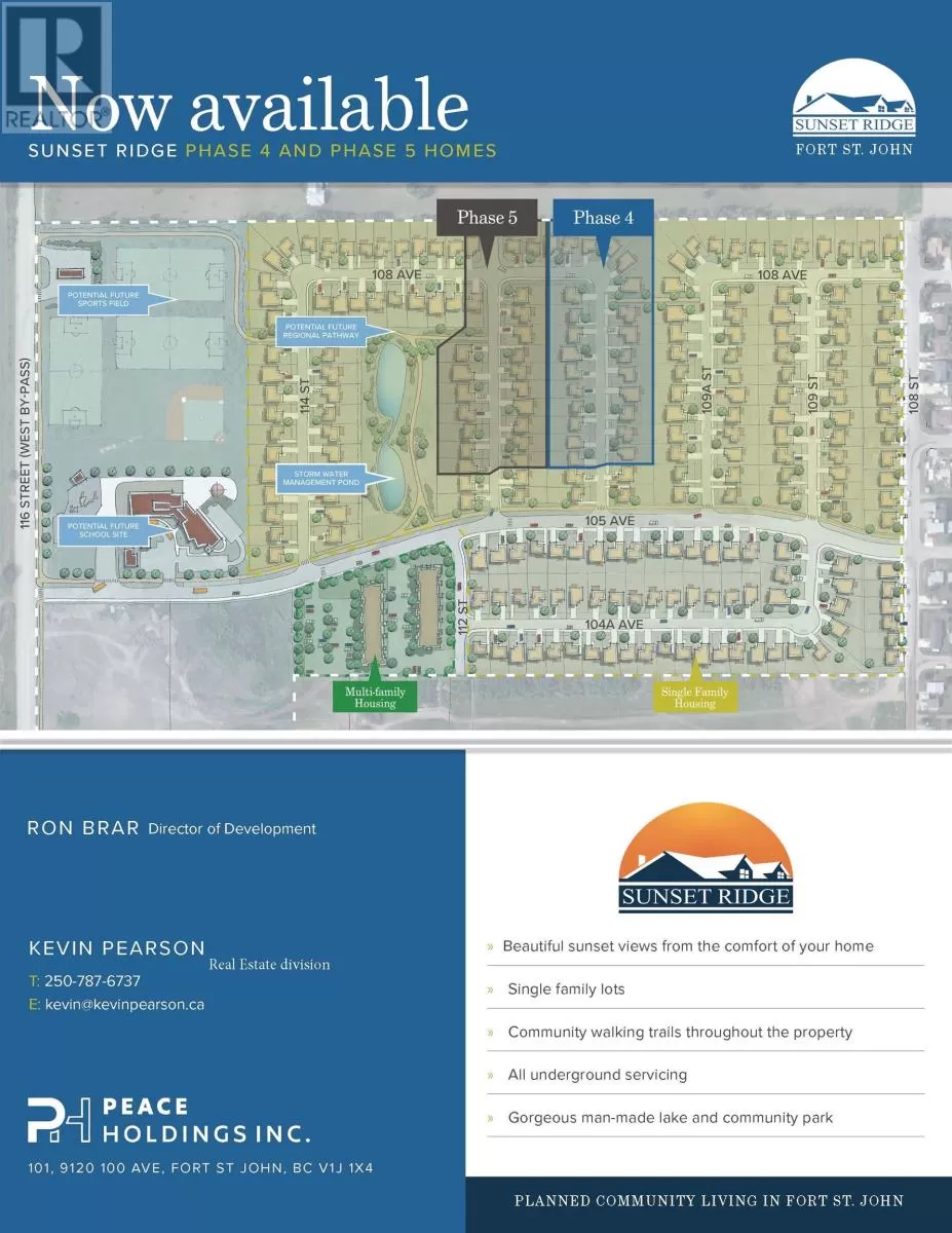 This property is currently under the ownership type of Freehold. The phase 4 lot in Sunset Ridge, located in Fort St. John's northwest quadrant near Finch Elementary School, is now available for purchase. This planned community consists of over 300 new homes and offers picturesque views of rolling hills, flowering trees, a man-made lake and park area, as well as interconnected walking trails throughout the subdivision that are linked to the city's network of paved walking trails. Additionally, residents can enjoy stunning sunset views. The architectural design of the homes is characterized by warmth, clean lines, contemporary style, and a focus on family living. (id:27476).