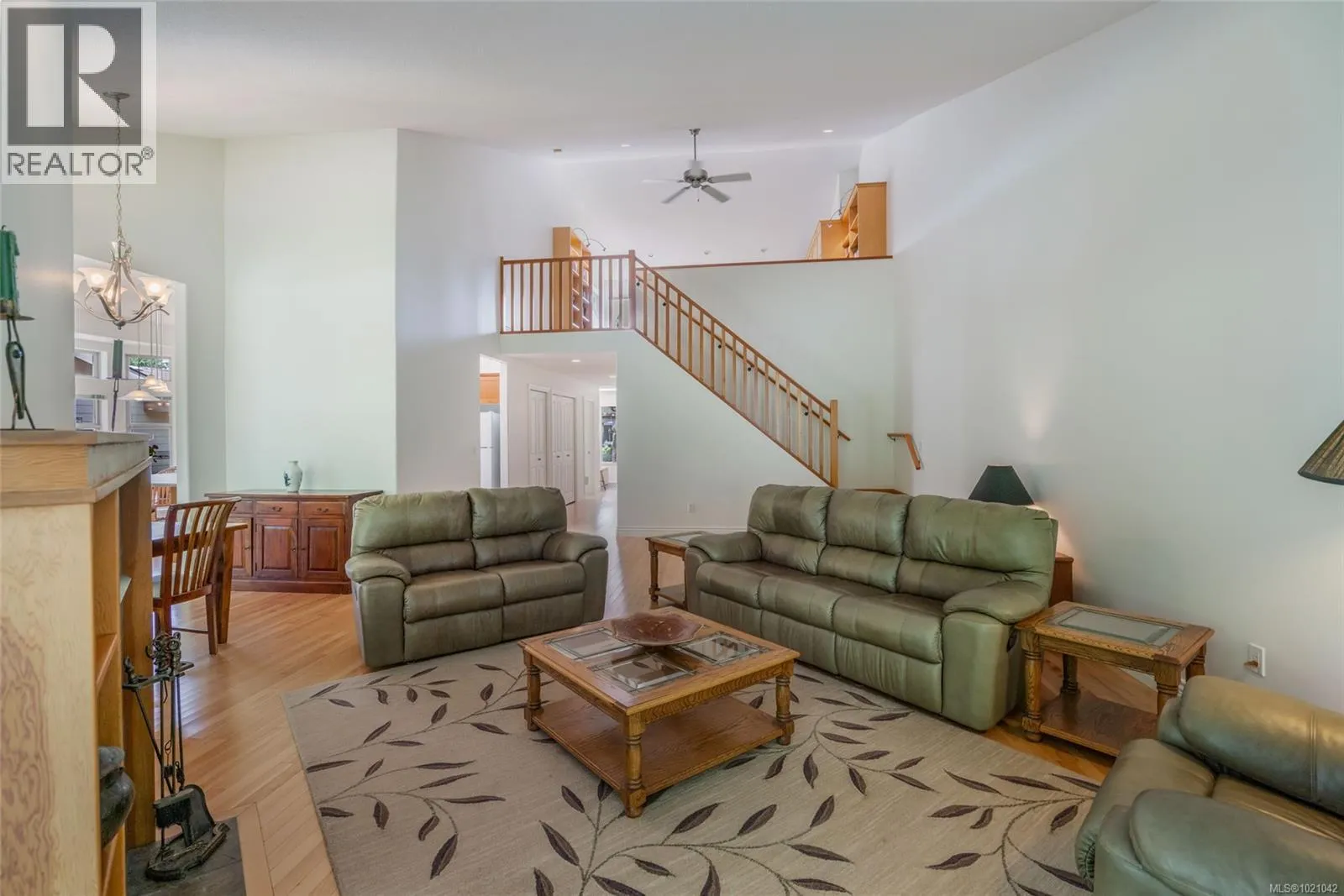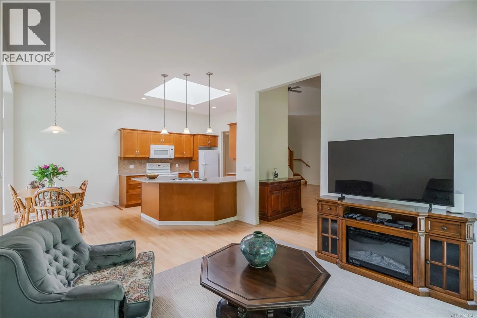 Discover bright, easy living in this spacious and well-maintained 2-bedroom, 2-bath townhome, perfectly suited to the Vancouver Island lifestyle. Hardwood floors, tiled entry, vaulted ceilings and skylights create an airy, light-filled feel. The open living and dining area features a cozy fireplace and space to showcase your art. Maple kitchen cabinetry and a family room lead to a large, private patio and garden area backing onto Morningstar Golf Course with gas BBQ hookup. The versatile loft includes a built-in wall unit and Murphy bed. A generous primary suite offers a 5-piece ensuite with soaker tub, walk-in shower, and walk-in closet. Large laundry room with sink and storage, second bedroom with adjacent bath, double garage, updated furnace (2019), hot water tank (2020), fresh paint, and cleaned carpets. No Poly-B plumbing. Close to amenities and ideal for relaxed Island living. (id:27476)