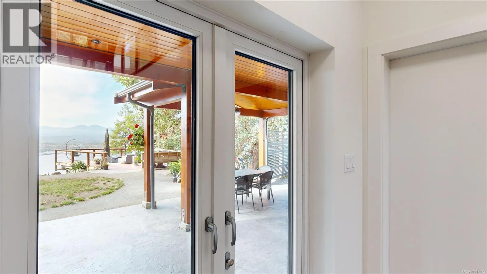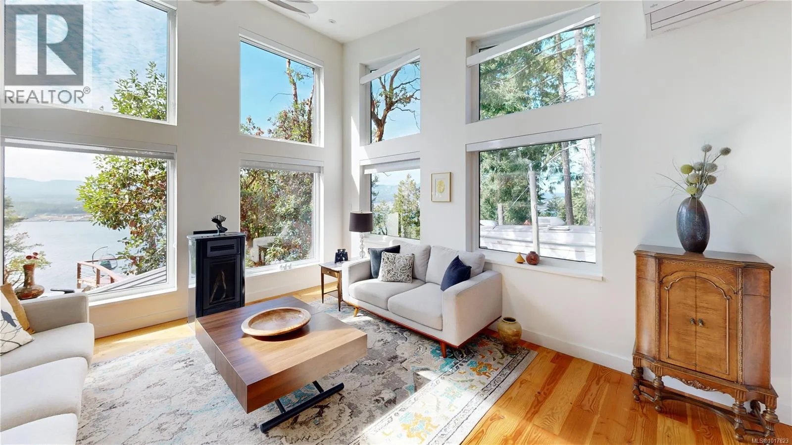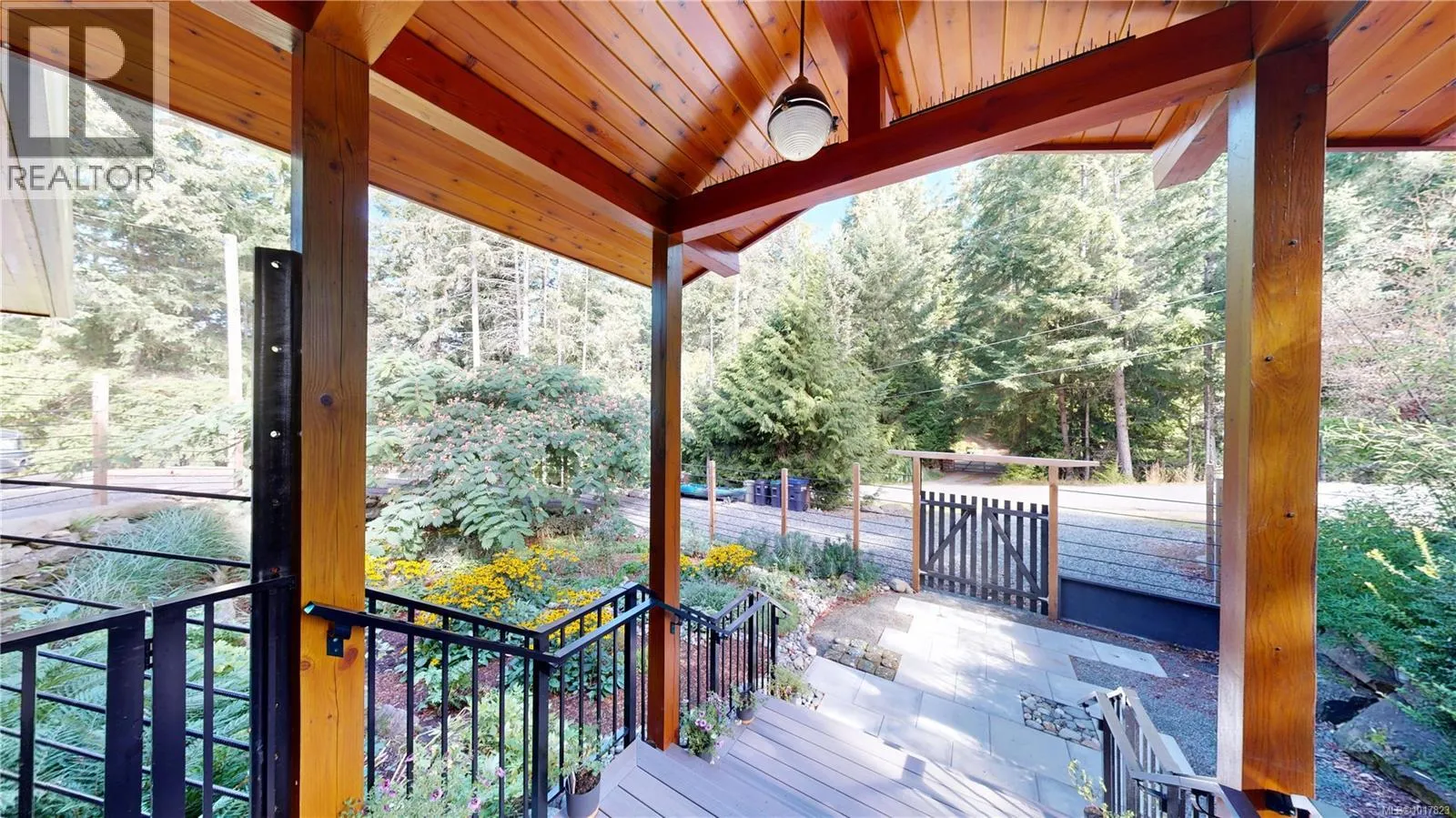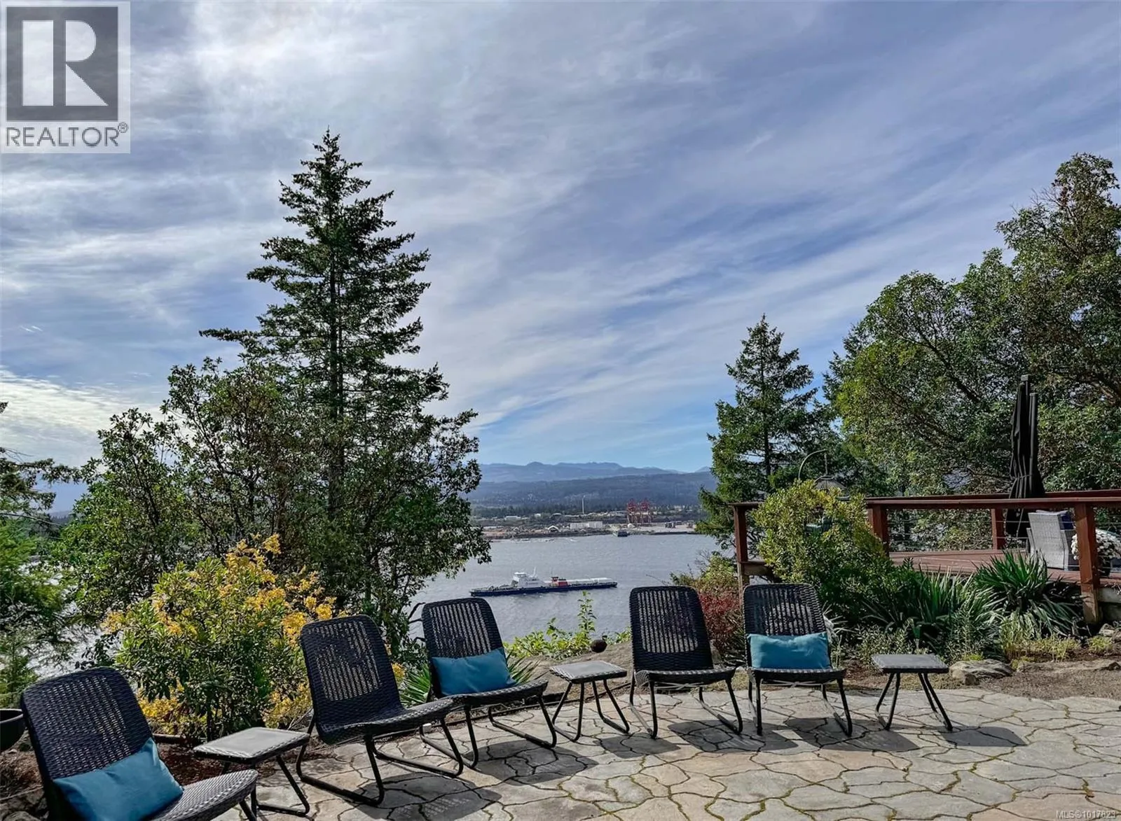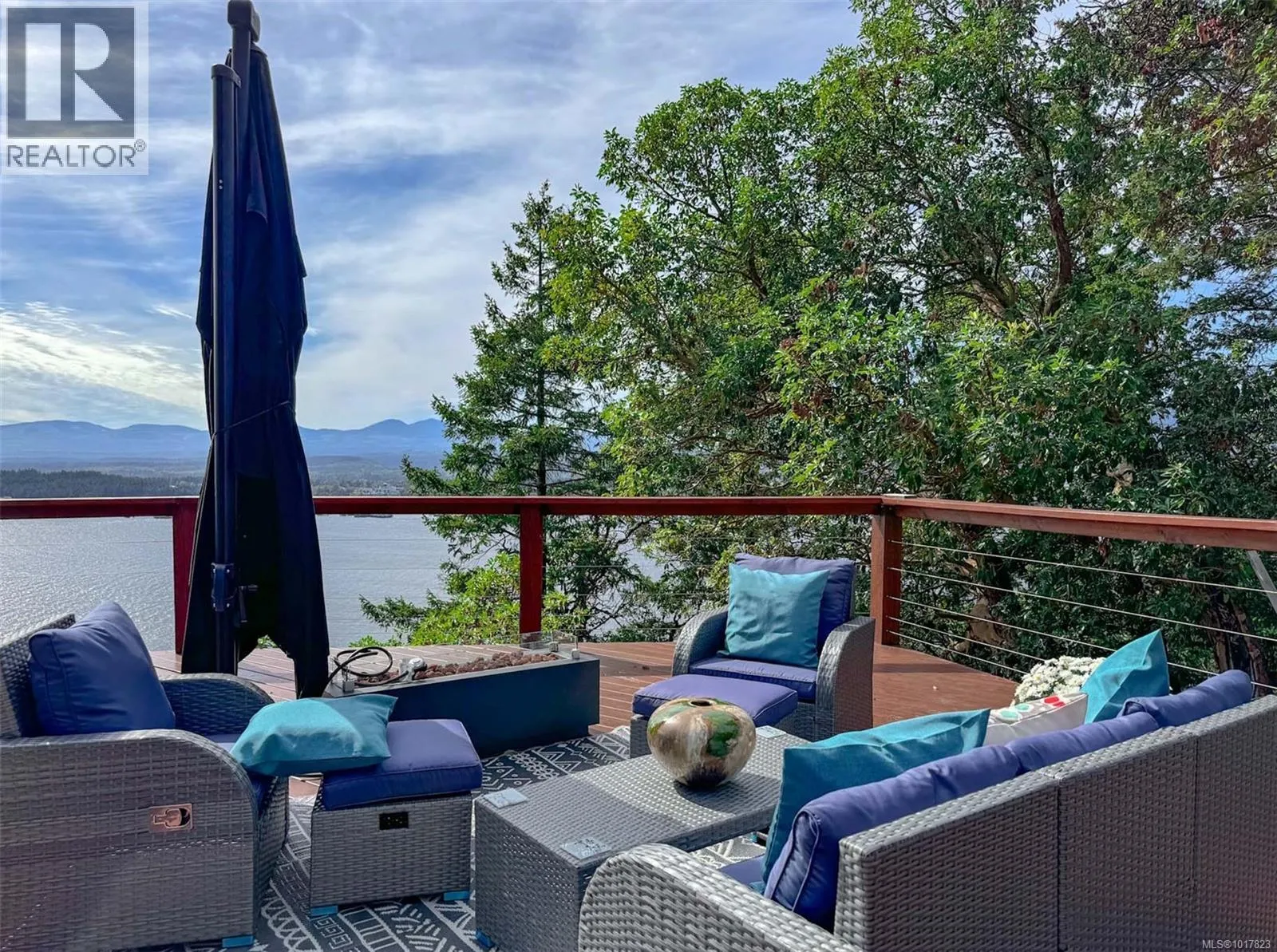 This beautifully crafted custom 2577sq.ft home perfectly combines modern design with natural beauty. Situated on a high-bank waterfront property, it showcases breathtaking ocean and mountain views through expansive windows. The exterior features a mix of metal and wood siding, while inside, you're welcomed by a grand entrance and a striking open staircase. The main living area includes wood floors, vaulted ceilings, two efficient heat pumps, a cozy propane fireplace, and a chefâs kitchen equipped with a propane cookstove, double ovens, pantry, and a wooden eating bar. Also on this floor, you'll find an office area, den, laundry room, and a spacious primary bedroom. The primary ensuite is a luxurious retreat, featuring a double vanity, glass shower, stunning tile work, and a relaxing soaker tub. The lower level is ideal for hosting guests, offering comfort, privacy, and direct access to the outdoors. There, youâll find an outdoor eating bar at the kitchen window, firepits, expansive decks, patios, and a garden area to explore on this 0.61 acre property. The property is mostly fenced and includes a storage shed, a Generac generator, a finished garage, and a dedicated RV site. To top it off, the home is designed for ease of living with an elevator, making this property truly move-in ready. (id:27476)