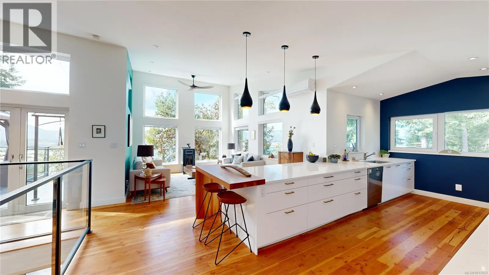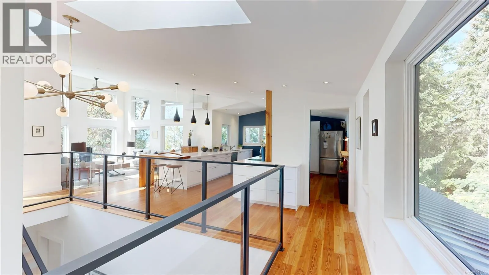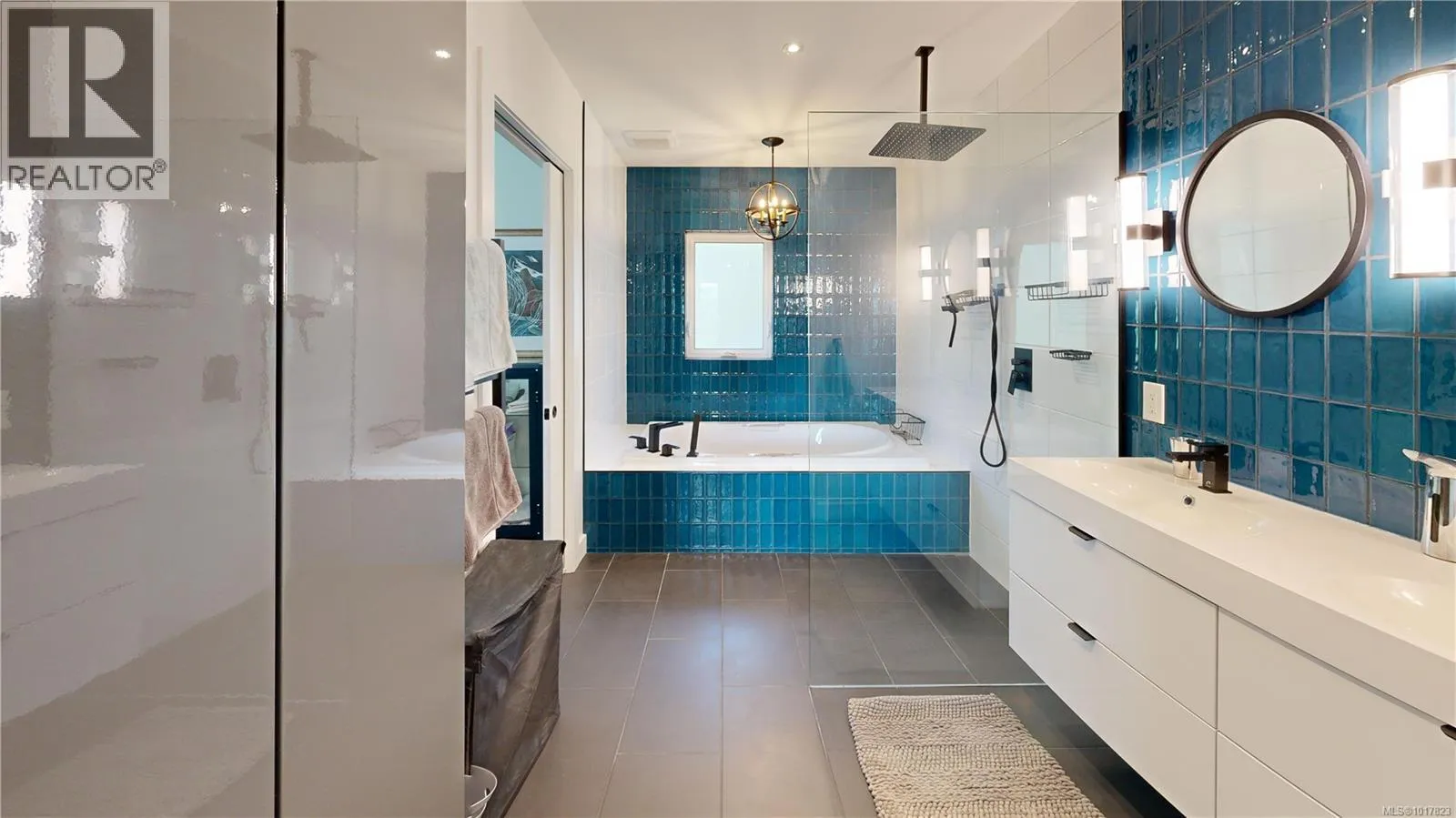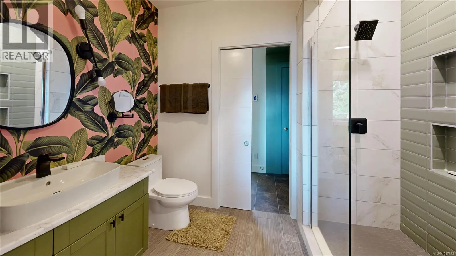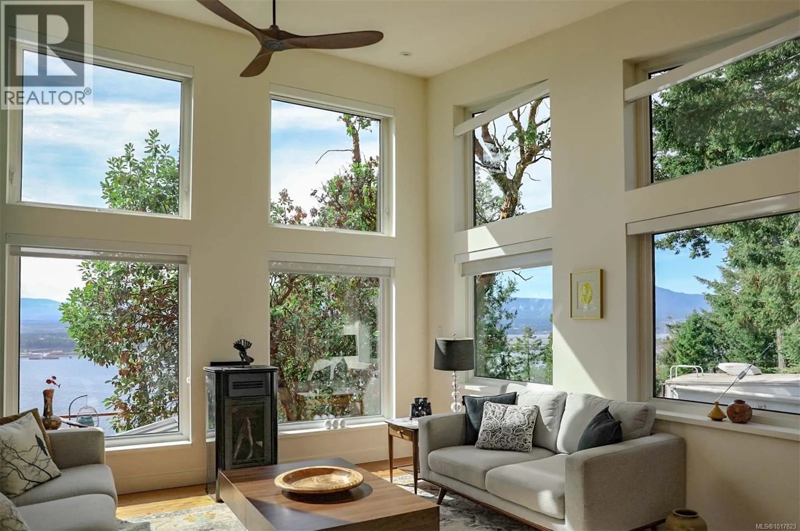 This beautifully crafted custom 2577sq.ft home perfectly combines modern design with natural beauty. Situated on a high-bank waterfront property, it showcases breathtaking ocean and mountain views through expansive windows. The exterior features a mix of metal and wood siding, while inside, you're welcomed by a grand entrance and a striking open staircase. The main living area includes wood floors, vaulted ceilings, two efficient heat pumps, a cozy propane fireplace, and a chefâs kitchen equipped with a propane cookstove, double ovens, pantry, and a wooden eating bar. Also on this floor, you'll find an office area, den, laundry room, and a spacious primary bedroom. The primary ensuite is a luxurious retreat, featuring a double vanity, glass shower, stunning tile work, and a relaxing soaker tub. The lower level is ideal for hosting guests, offering comfort, privacy, and direct access to the outdoors. There, youâll find an outdoor eating bar at the kitchen window, firepits, expansive decks, patios, and a garden area to explore on this 0.61 acre property. The property is mostly fenced and includes a storage shed, a Generac generator, a finished garage, and a dedicated RV site. To top it off, the home is designed for ease of living with an elevator, making this property truly move-in ready. (id:27476)