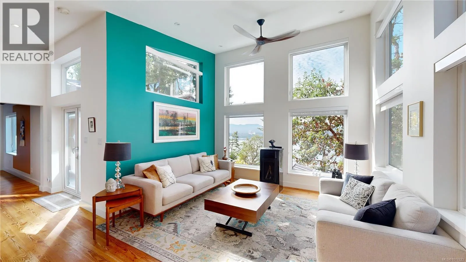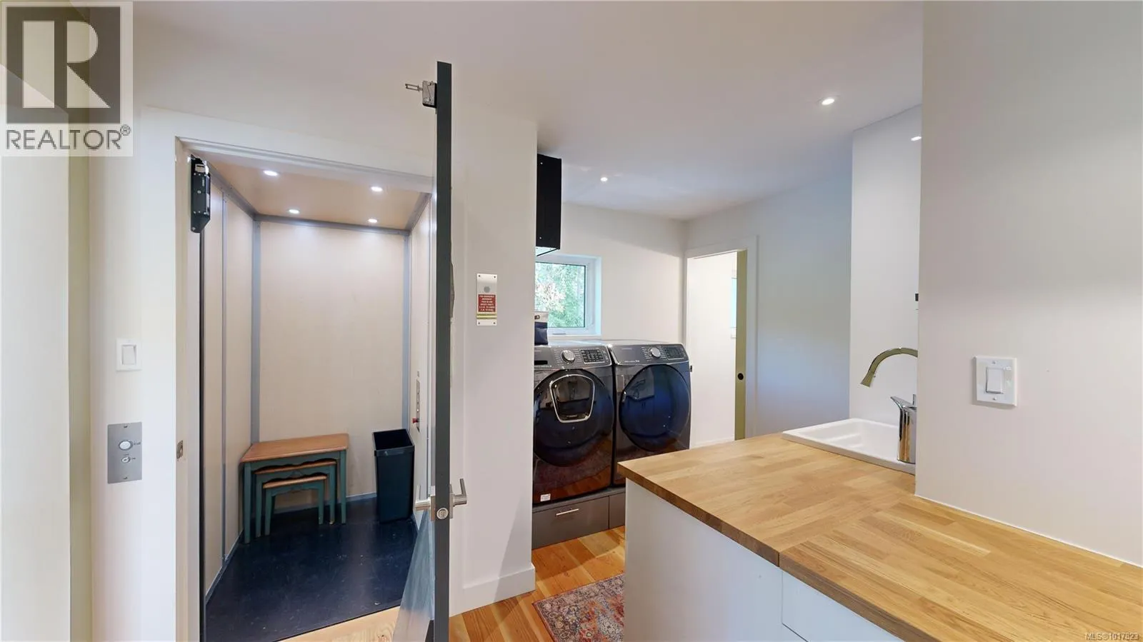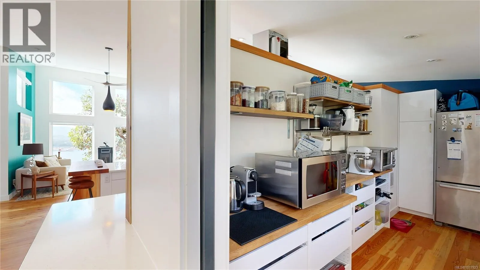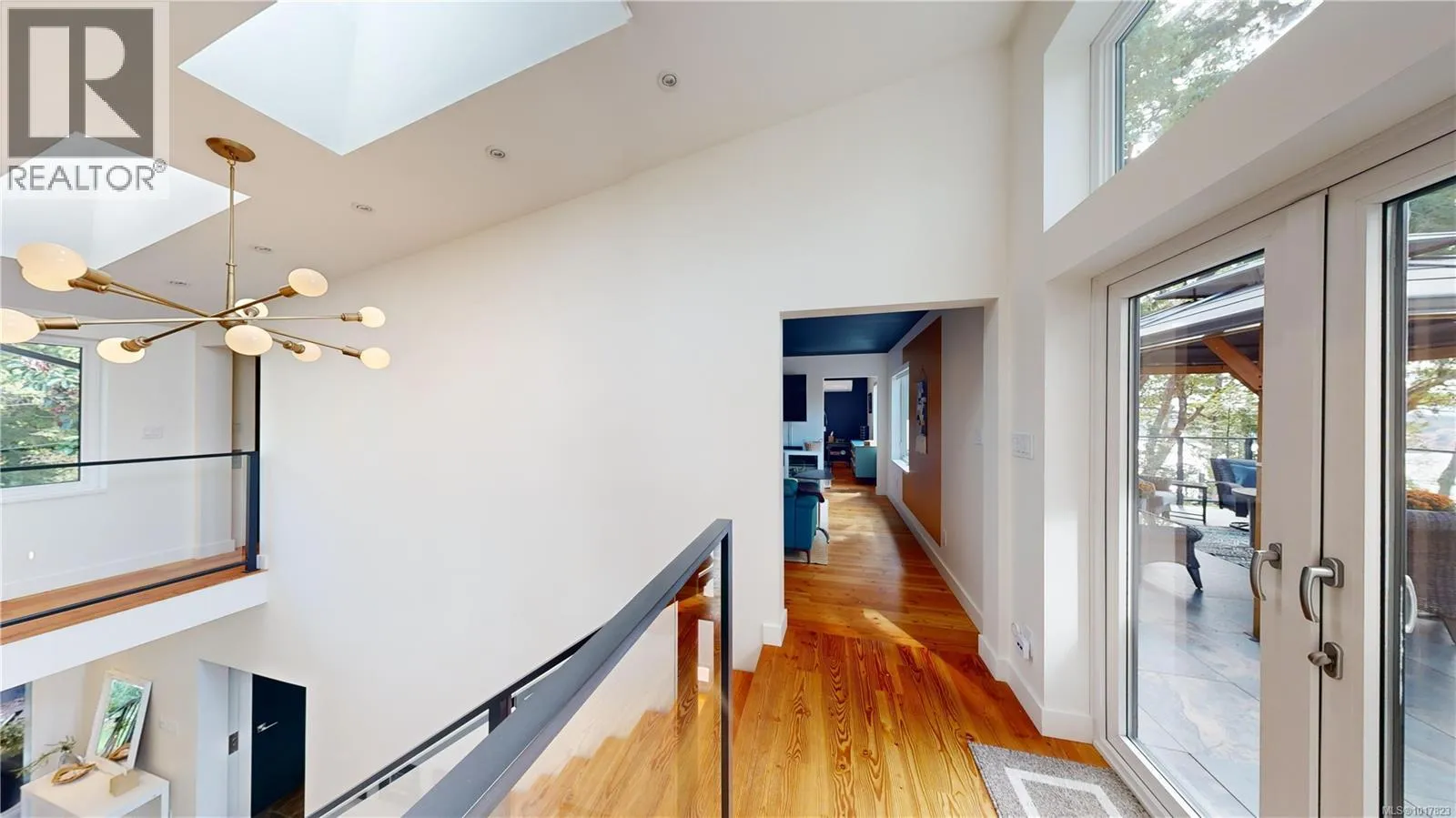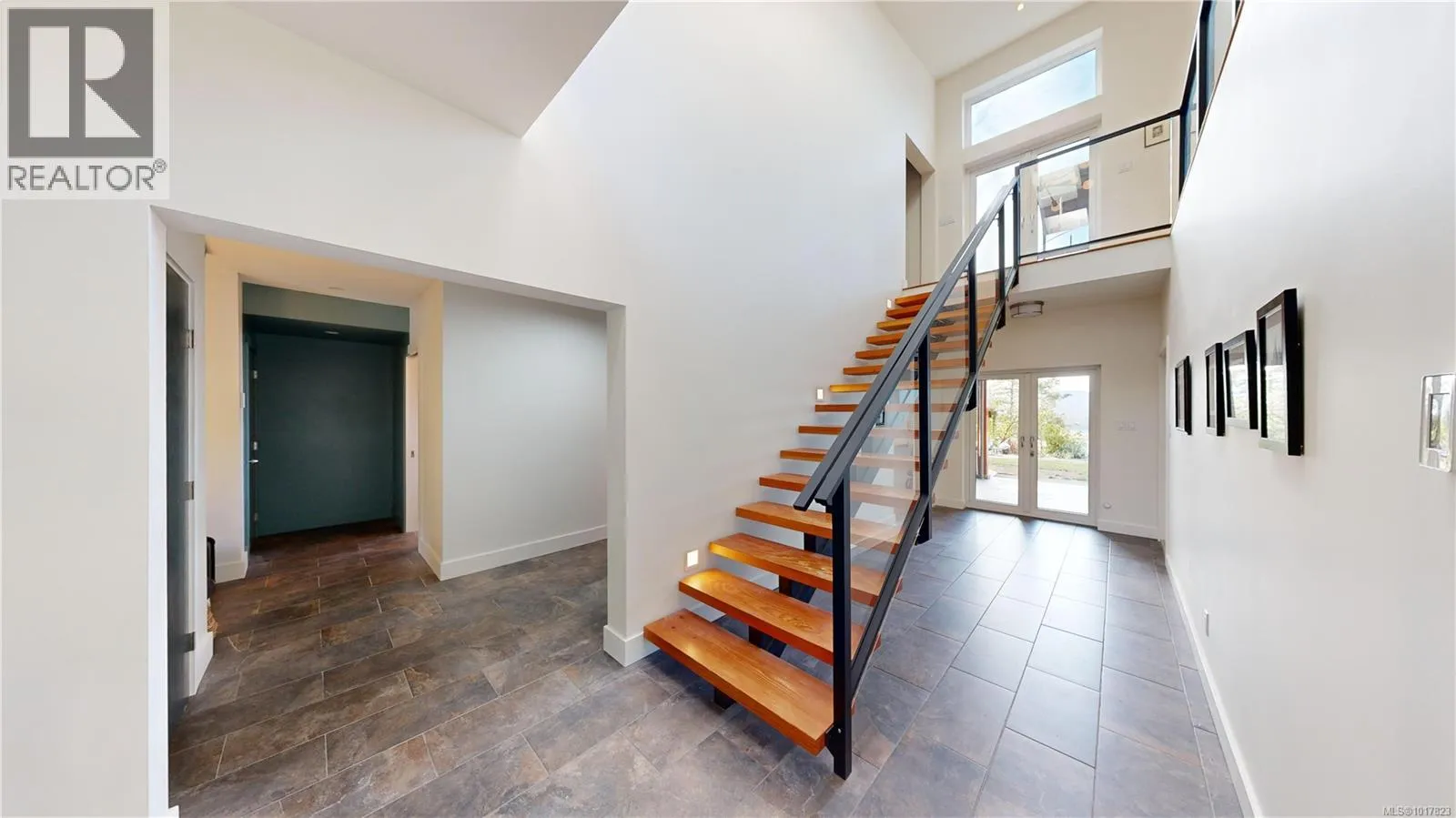 This beautifully crafted custom 2577sq.ft home perfectly combines modern design with natural beauty. Situated on a high-bank waterfront property, it showcases breathtaking ocean and mountain views through expansive windows. The exterior features a mix of metal and wood siding, while inside, you're welcomed by a grand entrance and a striking open staircase. The main living area includes wood floors, vaulted ceilings, two efficient heat pumps, a cozy propane fireplace, and a chefâs kitchen equipped with a propane cookstove, double ovens, pantry, and a wooden eating bar. Also on this floor, you'll find an office area, den, laundry room, and a spacious primary bedroom. The primary ensuite is a luxurious retreat, featuring a double vanity, glass shower, stunning tile work, and a relaxing soaker tub. The lower level is ideal for hosting guests, offering comfort, privacy, and direct access to the outdoors. There, youâll find an outdoor eating bar at the kitchen window, firepits, expansive decks, patios, and a garden area to explore on this 0.61 acre property. The property is mostly fenced and includes a storage shed, a Generac generator, a finished garage, and a dedicated RV site. To top it off, the home is designed for ease of living with an elevator, making this property truly move-in ready. (id:27476)