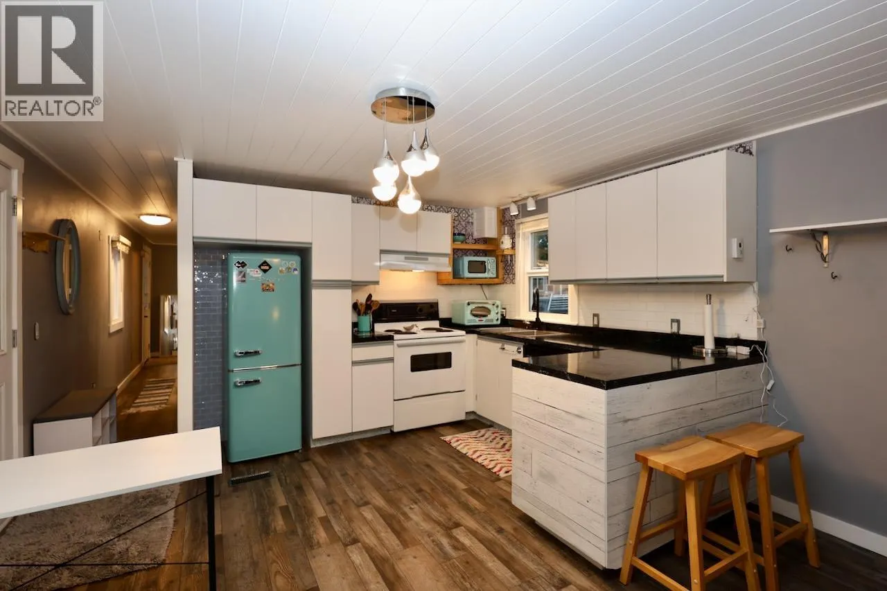 Discover this beautifully remodelled single-wide manufactured home, set on a spacious corner lot in a quiet, family-friendly, well-maintained park. Thoughtfully updated from top to bottom, this home is truly move-in ready. Inside, youâll find new flooring, fresh paint, solid wood ceilings, and stylish whitewashed barnwood accents that add warmth and character throughout. Updates include modern light fixtures, vinyl windows, an asphalt shingle roof, and refreshed sinks and plumbing fixtures. The turquoise toaster oven and microwave, which match perfectly, complement the retro fridge, adding a fun and unique touch to the kitchen. Youâll also love the versatile outdoor spaces. The back patio is currently set up as a âcatioâ and lined with low-maintenance astroturf, but it can easily be removed at the buyerâs request. Out front, the pressure-treated deck is an inviting extension of the living space. The gazebo, fire table, and outdoor patio heater are negotiable, allowing you to keep the space set up as you see it. BC Assessment has recognized the substantial updates; see the attached email in the documents for confirmation. (id:27476)
