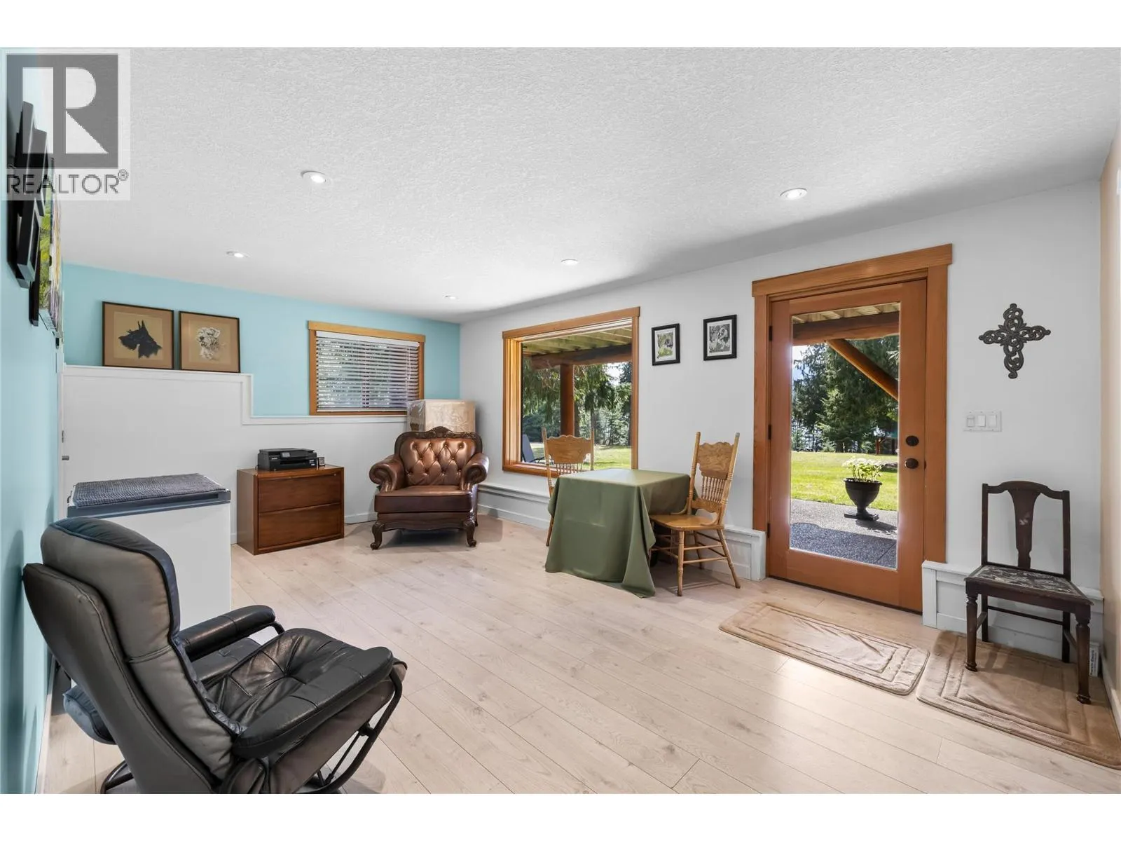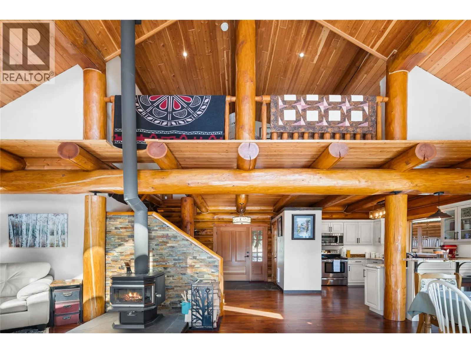 Stunning CUSTOM log home where craftsmanship and comfort meet. A grand entry welcomes you with a beautifully crafted fir door, soaring ceilings, and breathtaking views framed by every window- creating an immediate sense of warmth and space. The upgraded kitchen is a true showpiece, featuring elegant stone countertops, a distinctive copper sink, and soft-close cabinetry, perfect for both everyday living and entertaining. The main floor offers an open-concept design anchored by a cozy wood stove, ideal for gathering on cooler evenings. Upstairs, the spacious primary loft bedroom provides a peaceful retreat complete with a full ensuite. The fully finished lower level is perfectly suited for guests or extended living, offering an additional bedroom, a family room, and a versatile flex space ideal for a home office, hobby room, or extra family space. A convenient walkout provides direct access to the beautifully maintained yard. Outside, youâll find your own private oasis. Enjoy raised garden beds, irrigated flower beds, a fire pit, gazebo, and two large storage sheds! Located within a welcoming, close-knit strata on a quiet no-thru road, residents enjoy access to exceptional shared amenities including a WATERFRONT terrace, sauna, gazebo for gatherings, and a common garden area. With short-term rentals permitted, this property offers incredible flexibility as a full-time residence, vacation getaway, or income-generating investment. This is the kind of property that rarely comes available- donât miss your chance to make it yours! (id:27476)