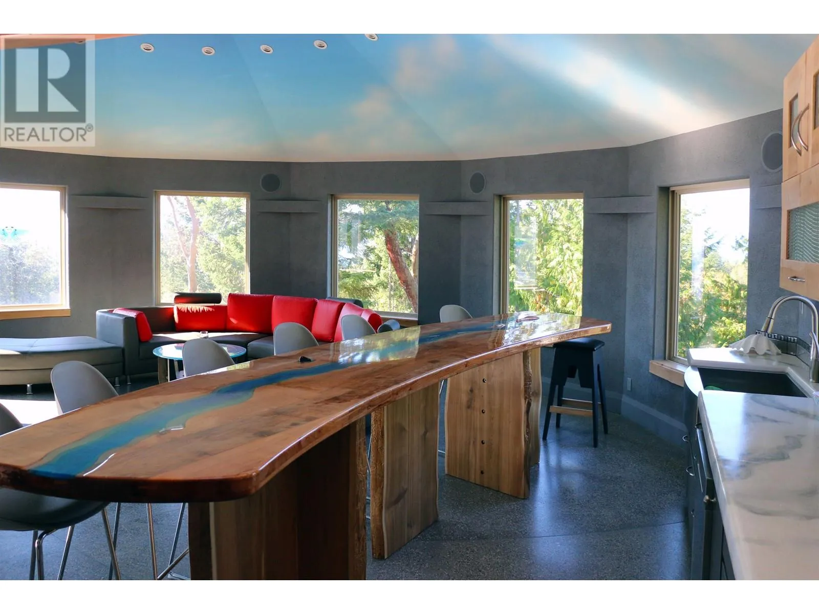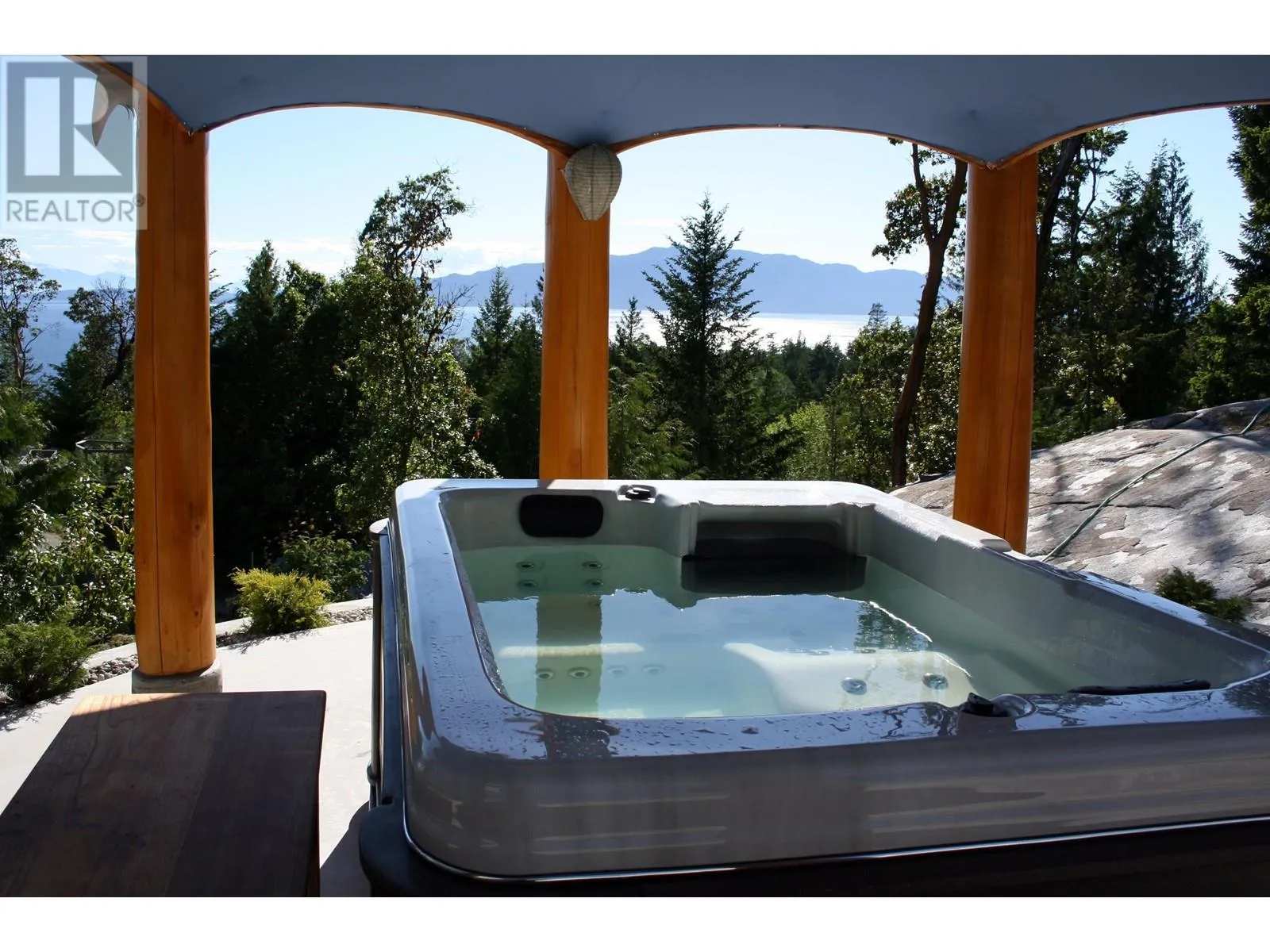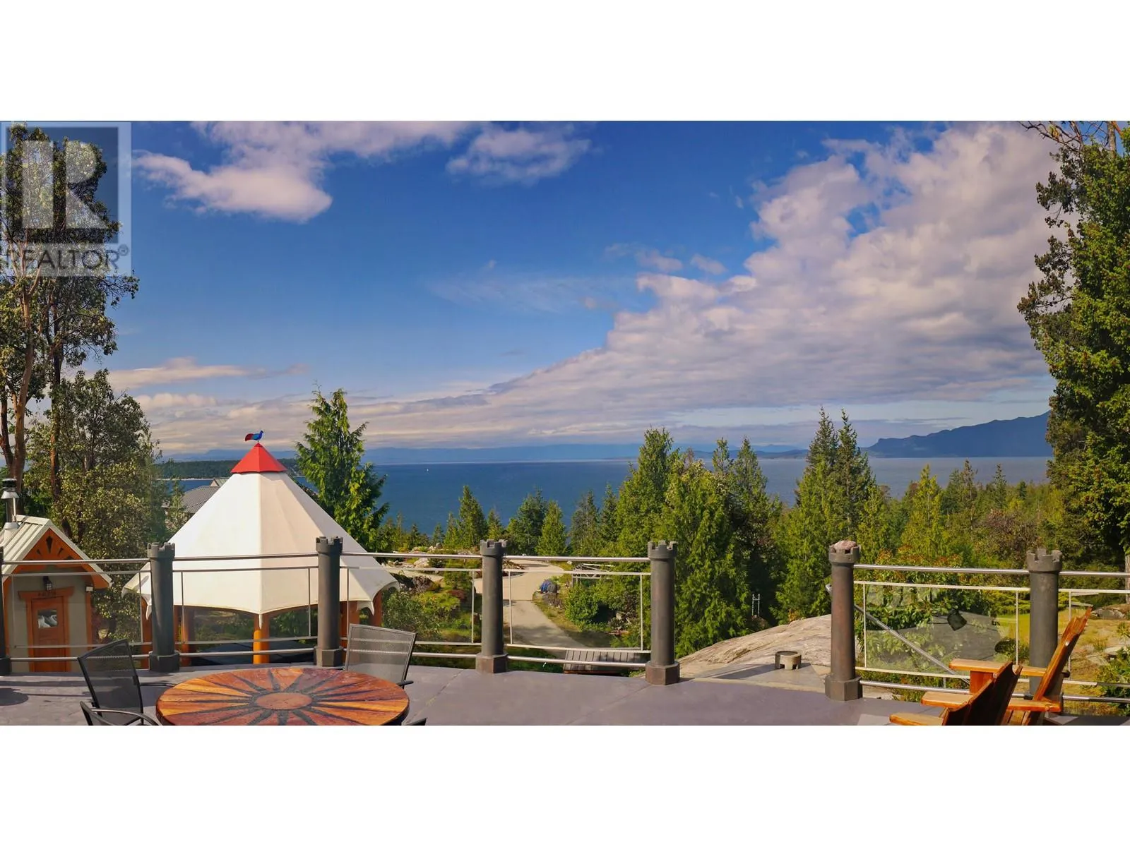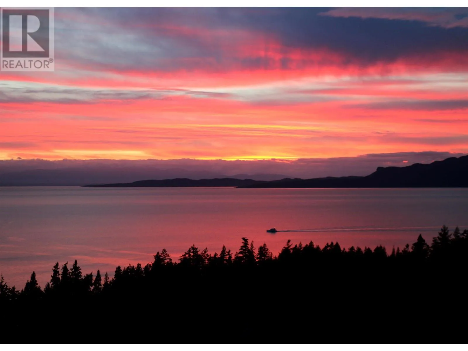This custom-built 3 bedroom, 4 bath 4,225 square ft home, fully furnished, situated on 2 acres blends luxury and nature with breathtaking views of the Salish Sea, Islands, and Caren Range. Hand-poured radiant concrete floors, vaulted ceilings throughout upper level, and unique murals add artistic flair. Enjoy seamless indoor-outdoor living with 10-ft folding doors opening to a sun-drenched patio with panoramic ocean views framed by arbutus trees. Features include geothermal heating, Heat Recovery Ventilation system, drilled well, outdoor wood-fired Finnish sauna, oversized garage, and a tranquil water fall pool. The open-concept living, dining, and kitchen area is bathed in natural light, and a large office/den offers flexibility. A truly exceptional property in a private, natural setting. (id:27476)
