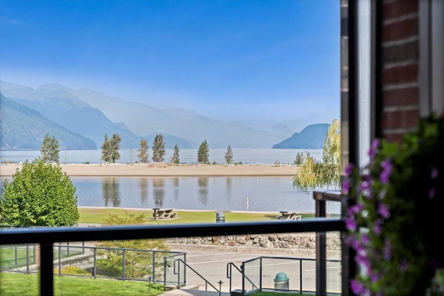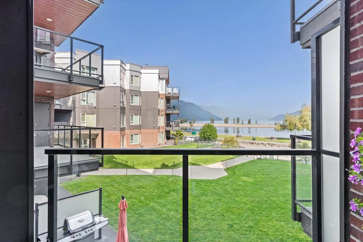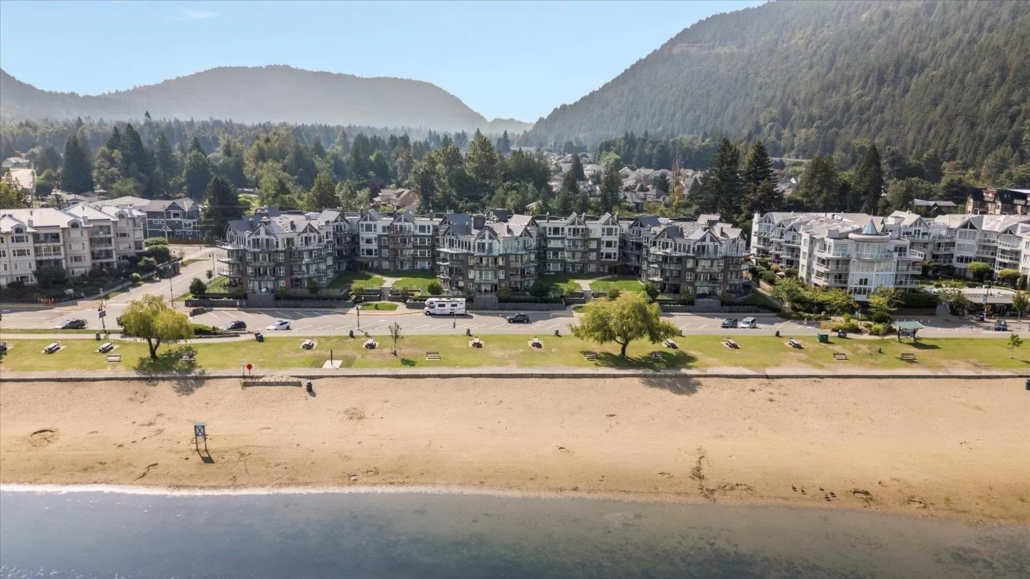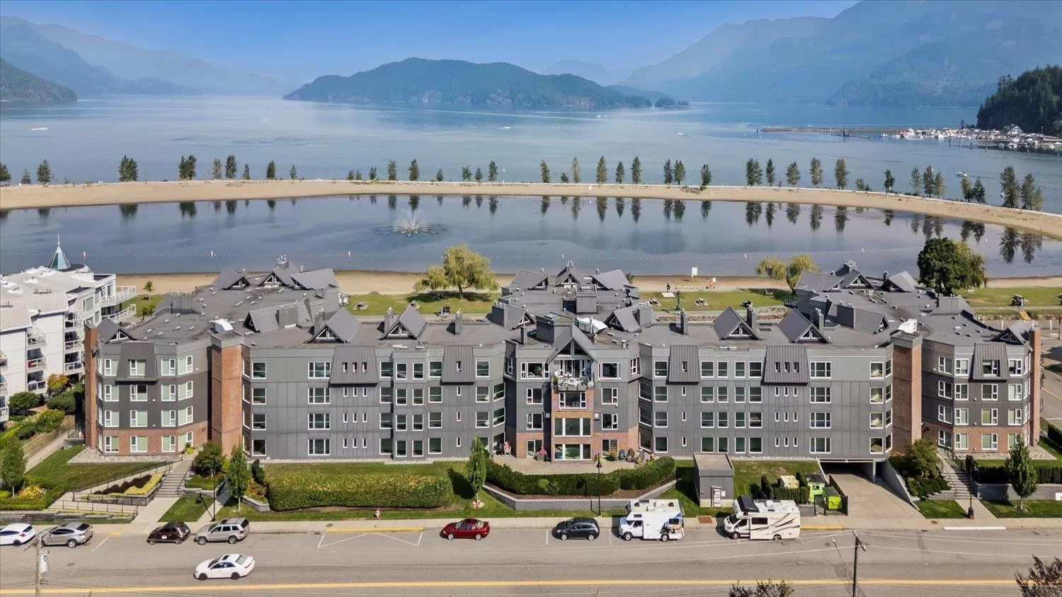 It's all about the view! This 2 bedroom, 1 bath condo features expansive windows framing stunning lake and mountain scenery. The exterior has been fully updated (including rain screen), giving the building a sleek, modern, refreshed appeal. Newer builds simply can't match the size, views, and character of this unit. Natural light pours into the open-concept living room, ideal for entertaining, with a cozy gas fireplace for cool evenings. The kitchen boasts GE Café appliances. Upgraded windows include new motorized blinds and a French door to the balcony. The large primary bedroom also has a patio door to the balcony. With its functional design, amazing outlook, and close access to the beach, marina, & restaurants, this is the perfect year-round home or weekend retreat. (id:27476)