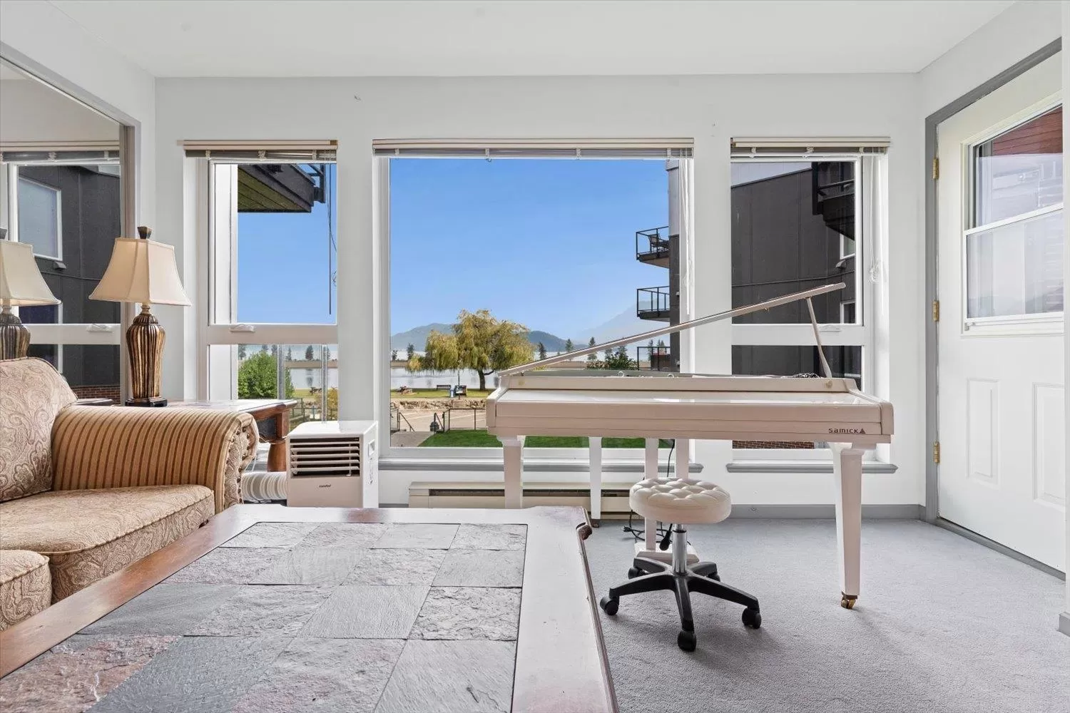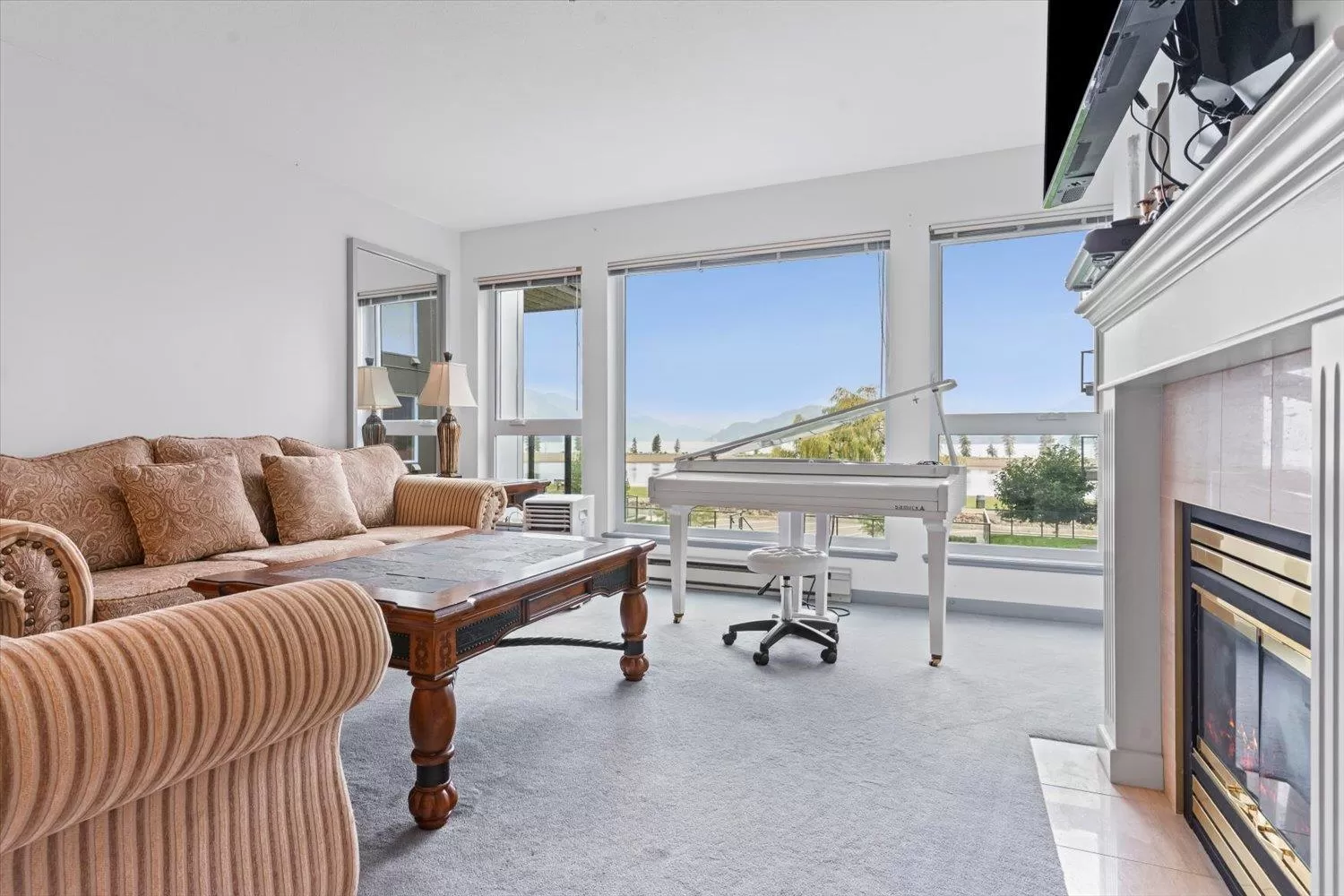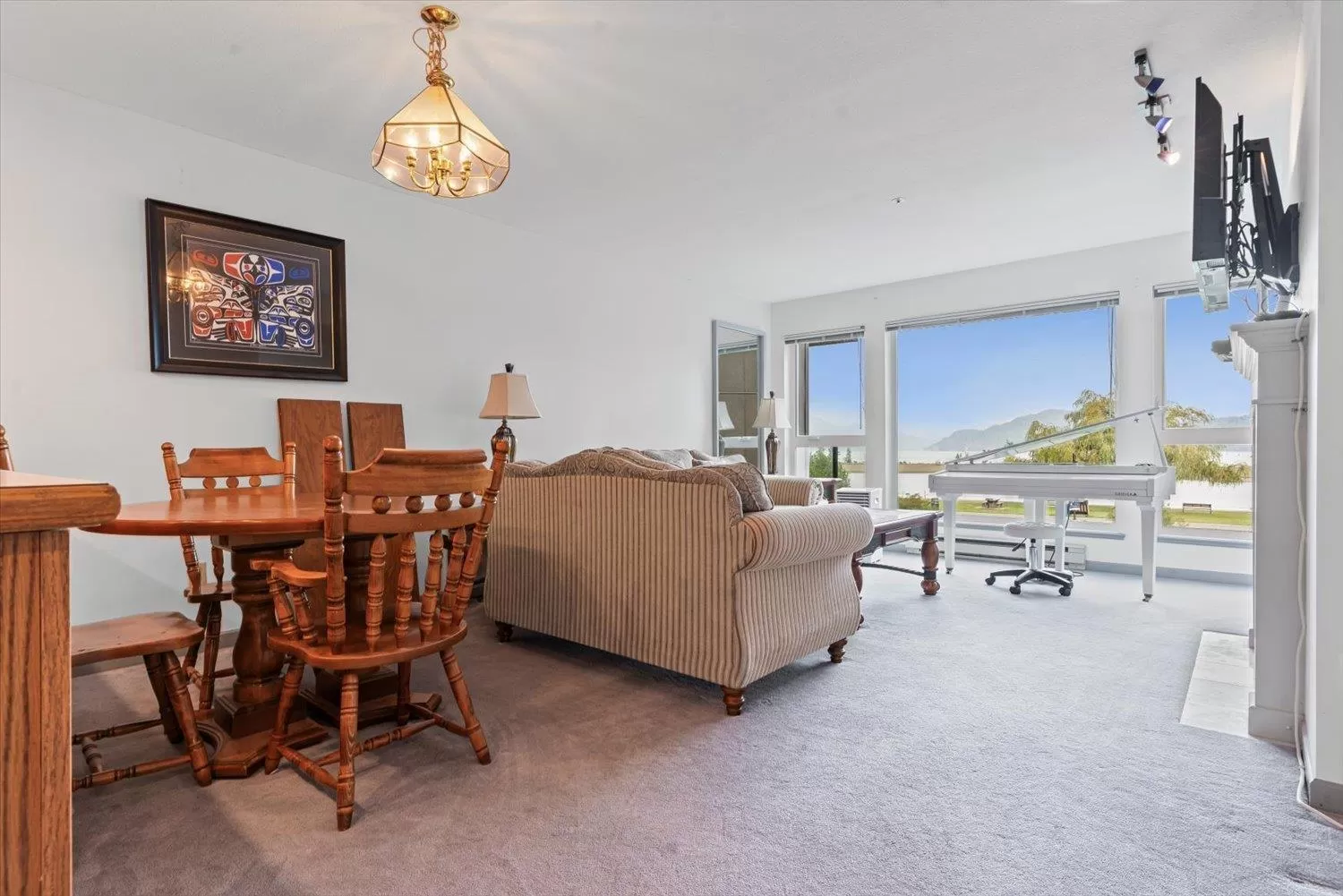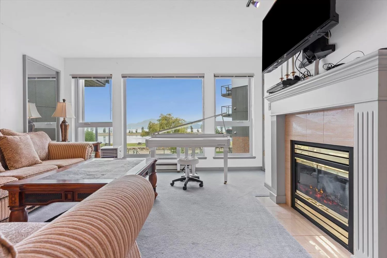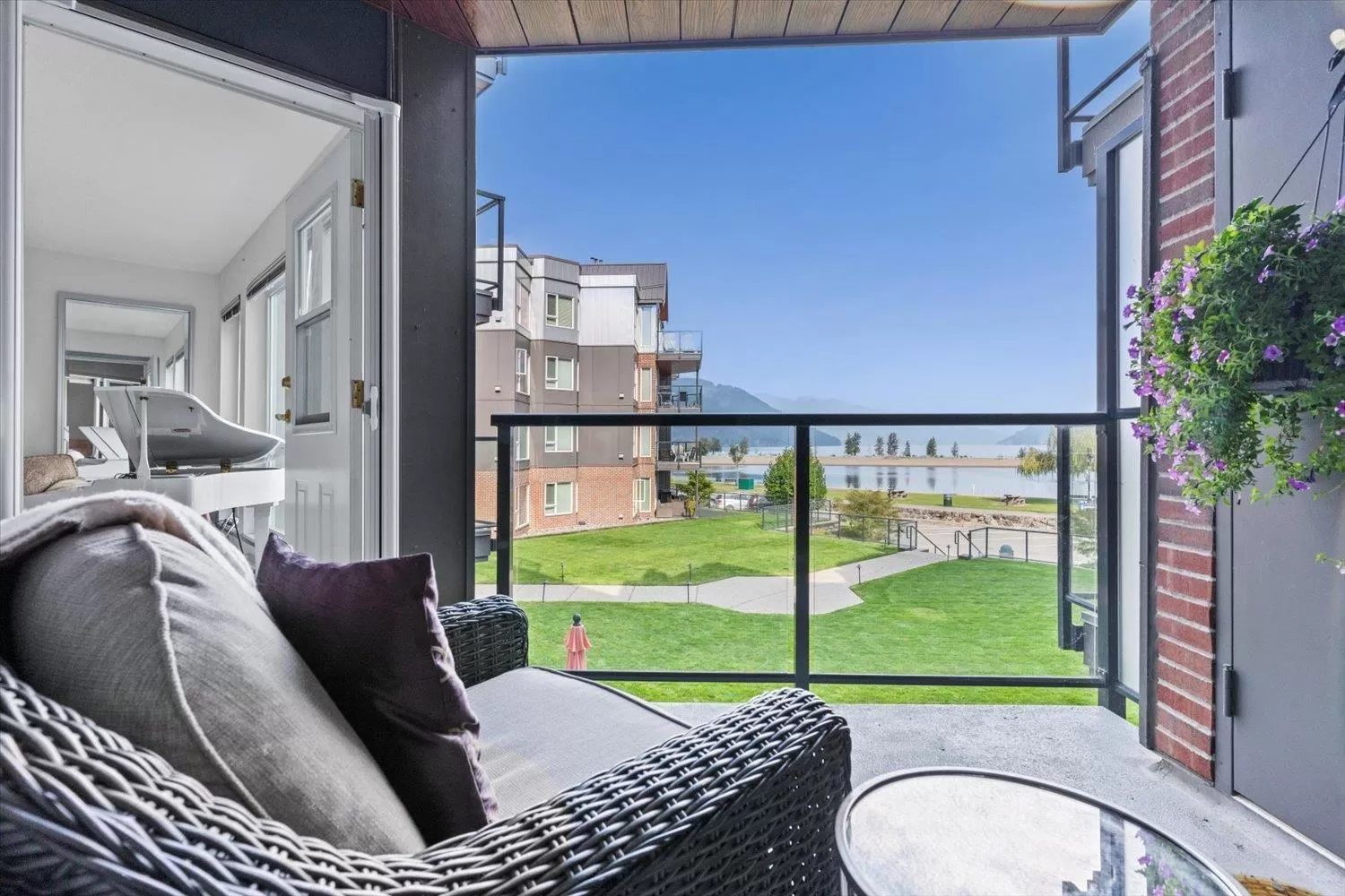 It's all about the view! This 2 bedroom, 1 bath condo features expansive windows framing stunning lake and mountain scenery. The exterior has been fully updated (including rain screen), giving the building a sleek, modern, refreshed appeal. Newer builds simply can't match the size, views, and character of this unit. Natural light pours into the open-concept living room, ideal for entertaining, with a cozy gas fireplace for cool evenings. The kitchen boasts GE Café appliances. Upgraded windows include new motorized blinds and a French door to the balcony. The large primary bedroom also has a patio door to the balcony. With its functional design, amazing outlook, and close access to the beach, marina, & restaurants, this is the perfect year-round home or weekend retreat. (id:27476)