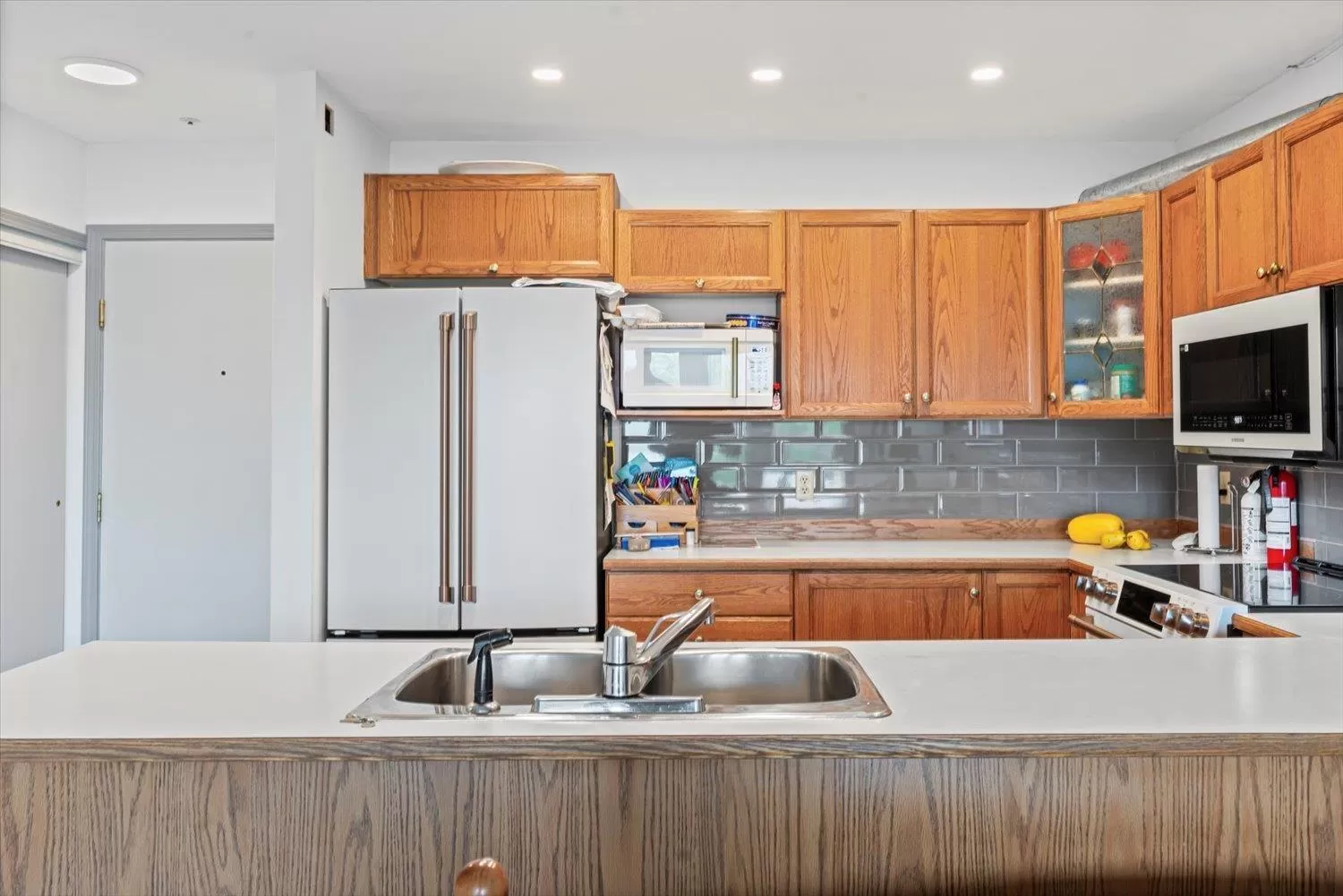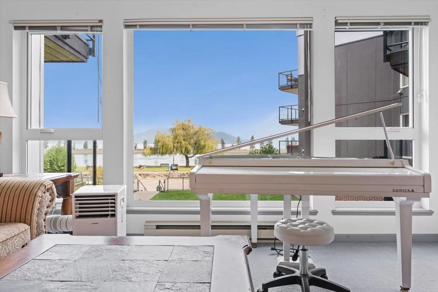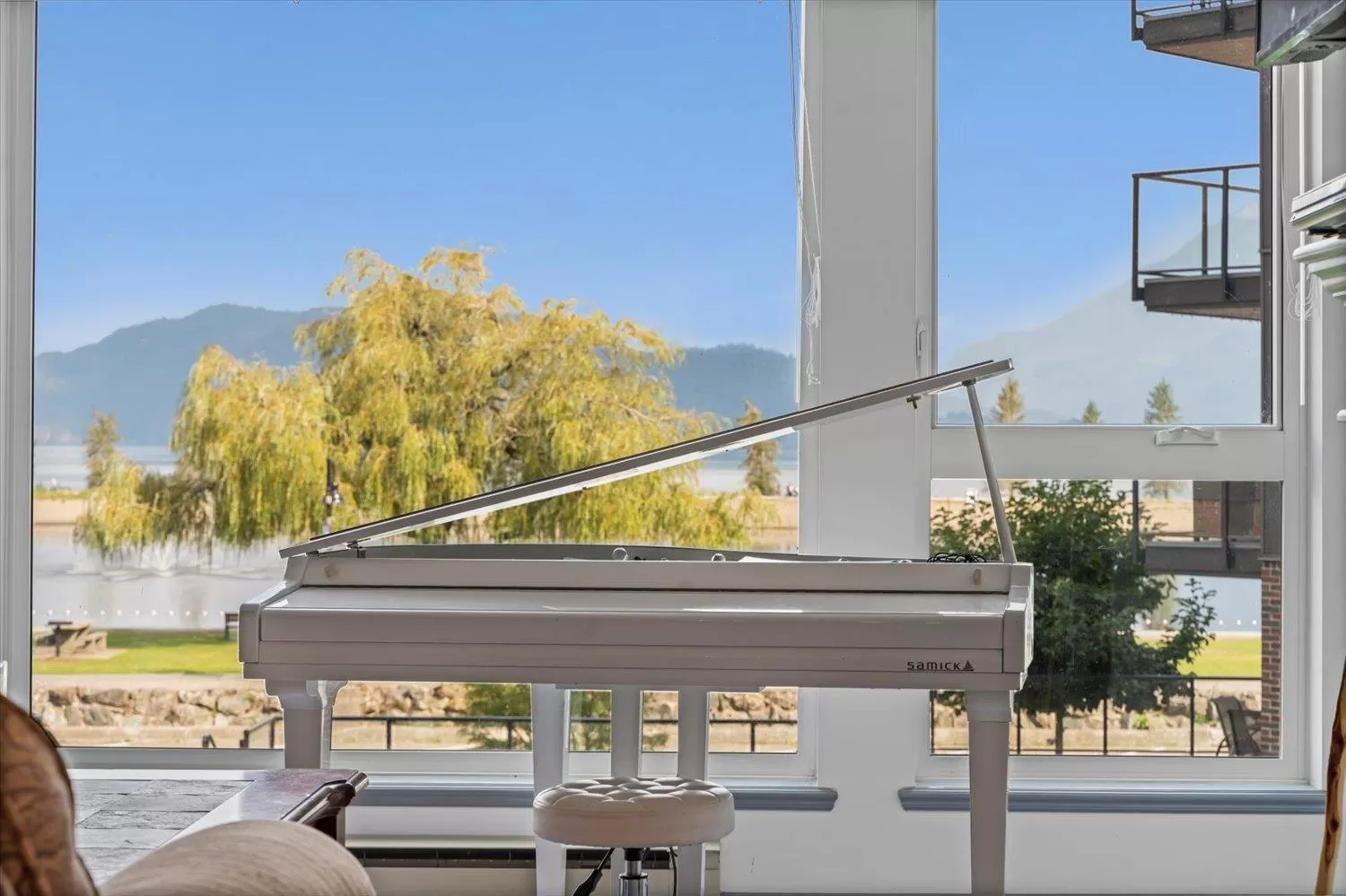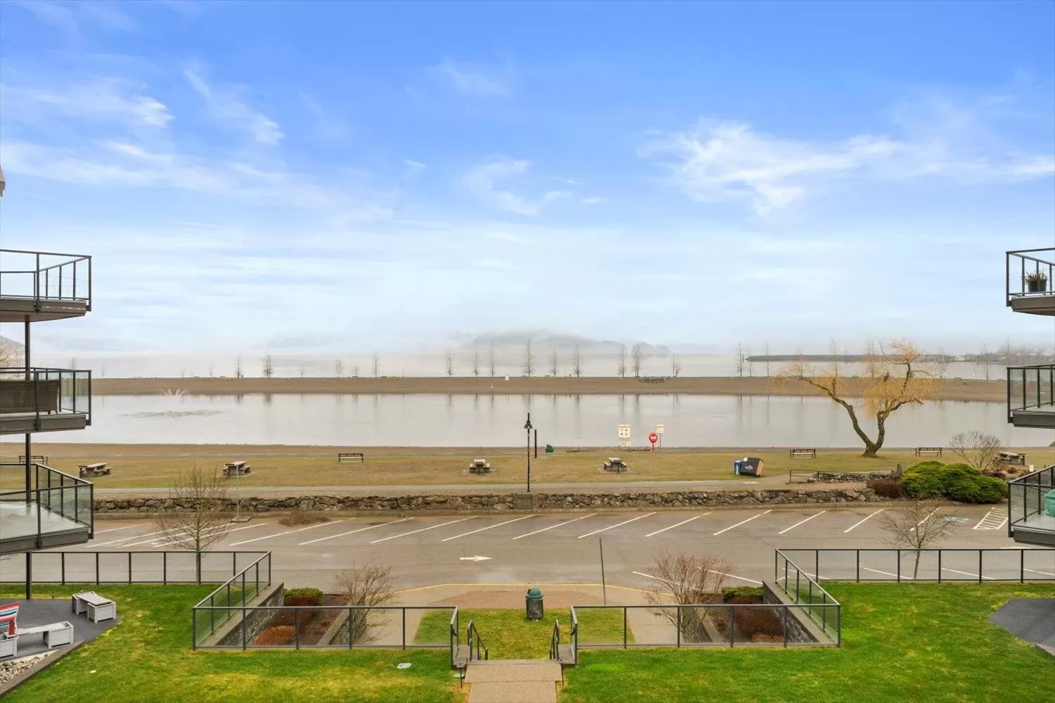 It's all about the view! This 2 bedroom, 1 bath condo features expansive windows framing stunning lake and mountain scenery. The exterior has been fully updated (including rain screen), giving the building a sleek, modern, refreshed appeal. Newer builds simply can't match the size, views, and character of this unit. Natural light pours into the open-concept living room, ideal for entertaining, with a cozy gas fireplace for cool evenings. The kitchen boasts GE Café appliances. Upgraded windows include new motorized blinds and a French door to the balcony. The large primary bedroom also has a patio door to the balcony. With its functional design, amazing outlook, and close access to the beach, marina, & restaurants, this is the perfect year-round home or weekend retreat. (id:27476)