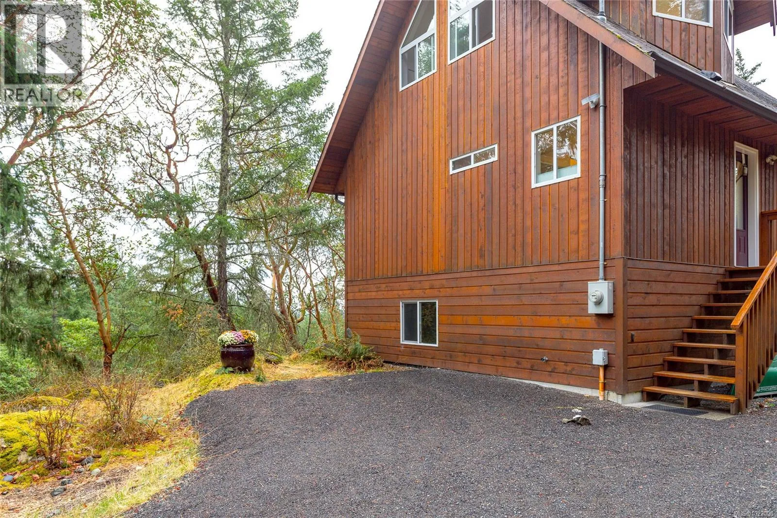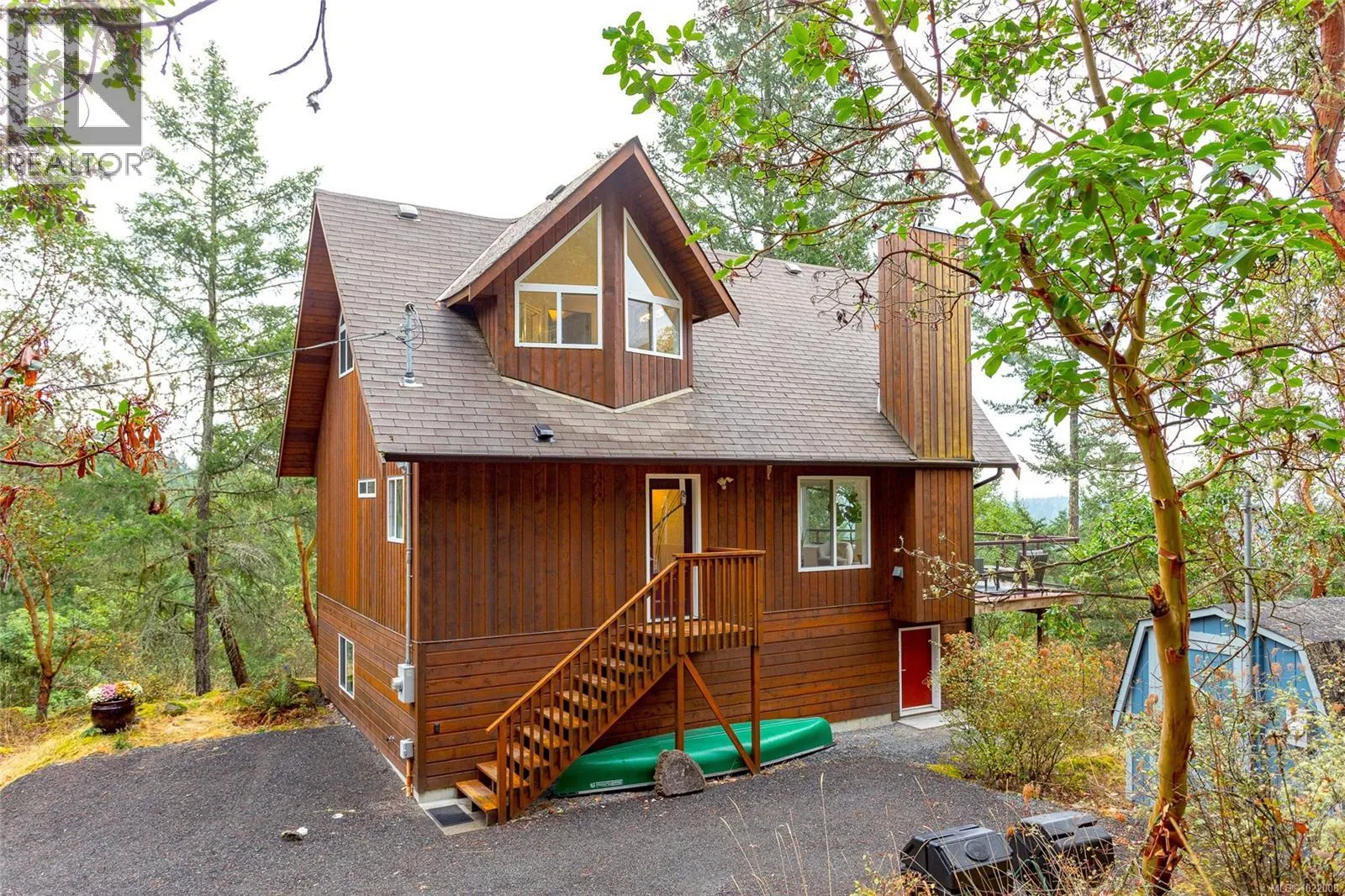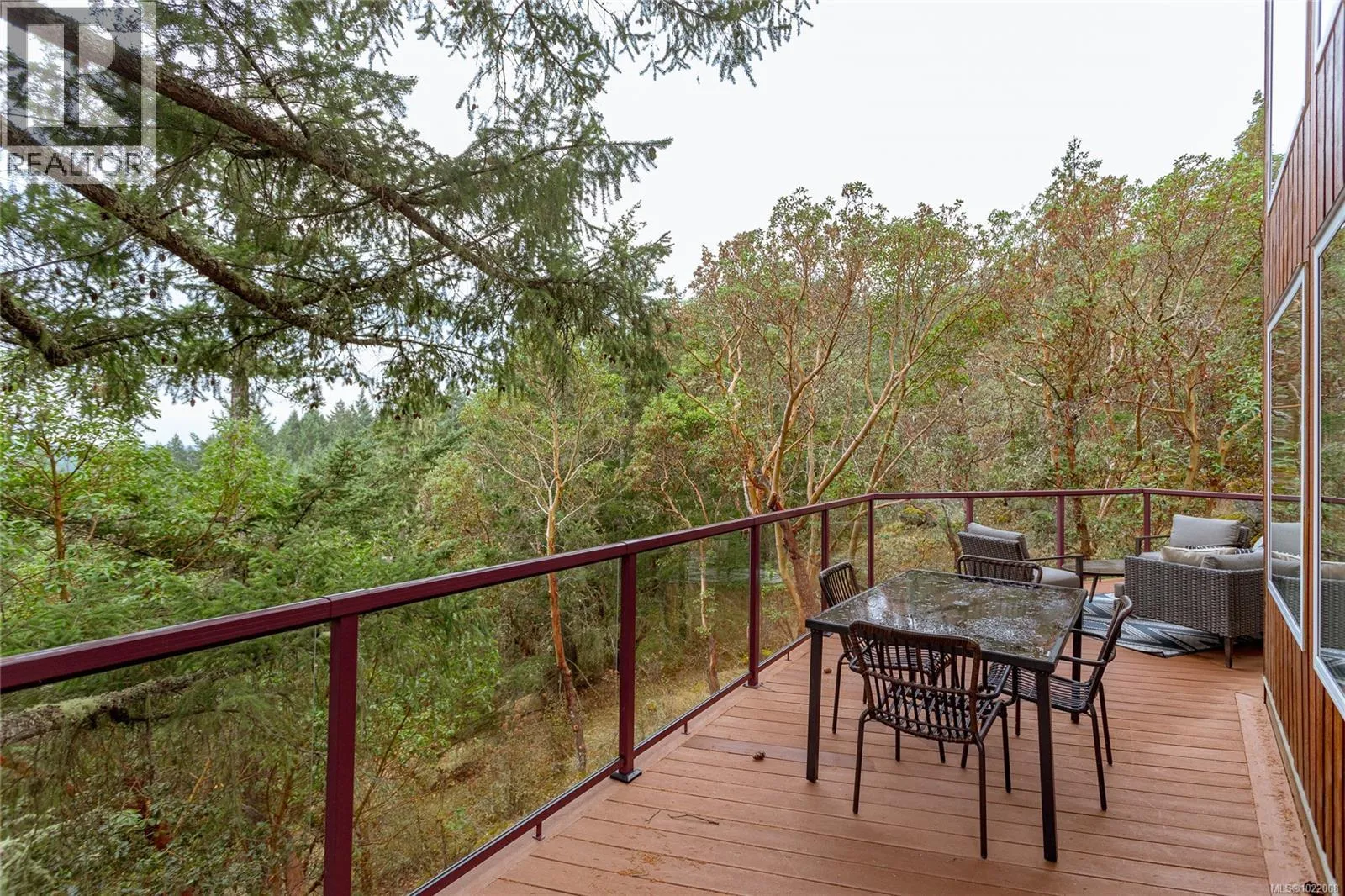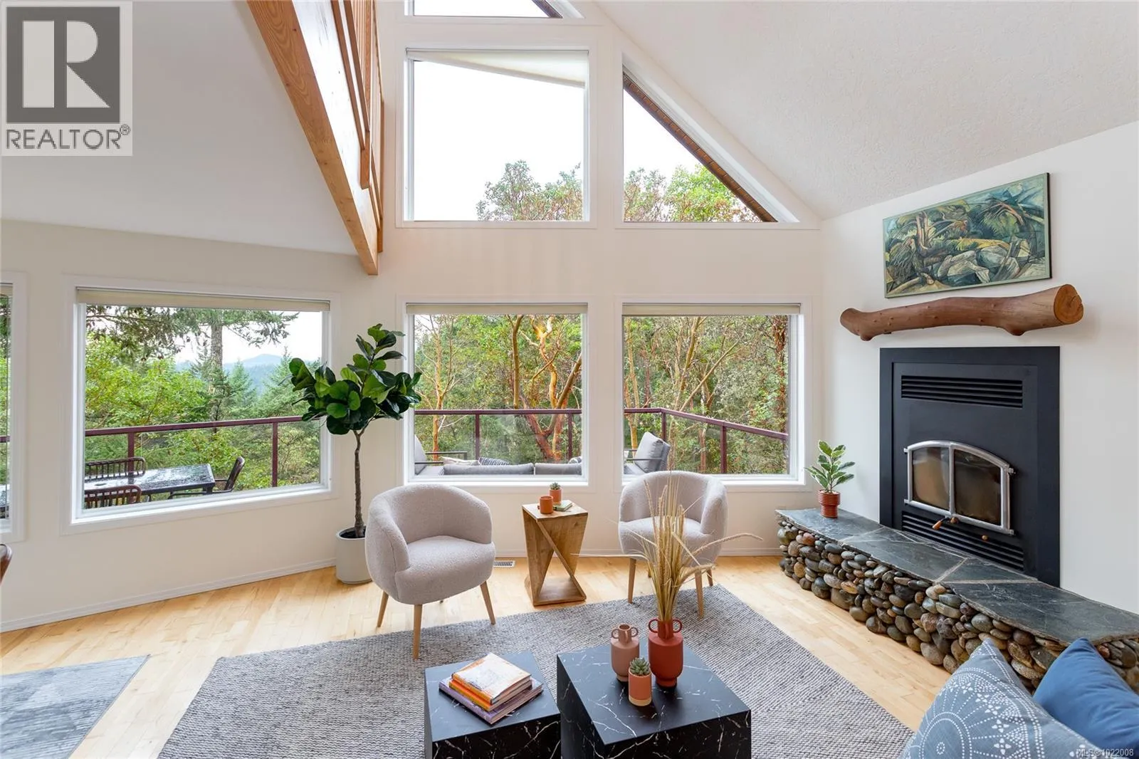 Tucked away in the Eastern Highlands, this inviting 2005 custom cedar home sits on nearly 4 ACRES of pristine woodland, offering a rare sense of privacy while still being just minutes from everyday amenities! Surrounded by mature arbutus and Douglas fir forest, the property feels peaceful and grounded, with nature truly at your doorstep. Perched on a gentle rise above the trees, the home enjoys sweeping outlooks and beautiful sunsets from the expansive SOUTH-FACING wrap-around deck, perfect for entertaining, morning coffee, or quiet evenings soaking in the views. Inside, floor-to-ceiling windows overlook the forest and fill the main living spaces with natural light, creating a seamless connection between indoors and out. Maple hardwood floors, vaulted ceilings with exposed beams, and a striking custom river-rock fireplace with an efficient wood insert add warmth, character, and a sense of timeless craftsmanship. The spacious primary bedroom offers a true retreat, complete with a 3-piece ensuite and a peaceful sitting area framed by floor-to-ceiling windows looking out to the trees. With a HEAT PUMP for year-round comfort and a newly completed driveway, this very special property blends comfort, care, and natural beauty into a private, retreat-like setting. A rare opportunity for those seeking space, serenity, and a meaningful connection to nature, without sacrificing convenience! Book your viewing today! (id:27476)