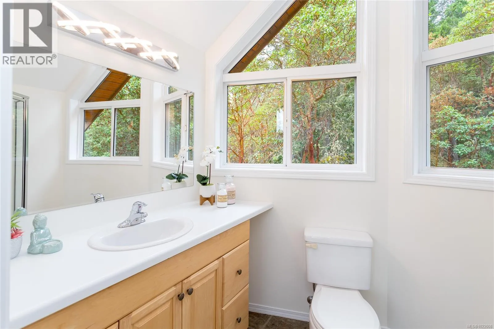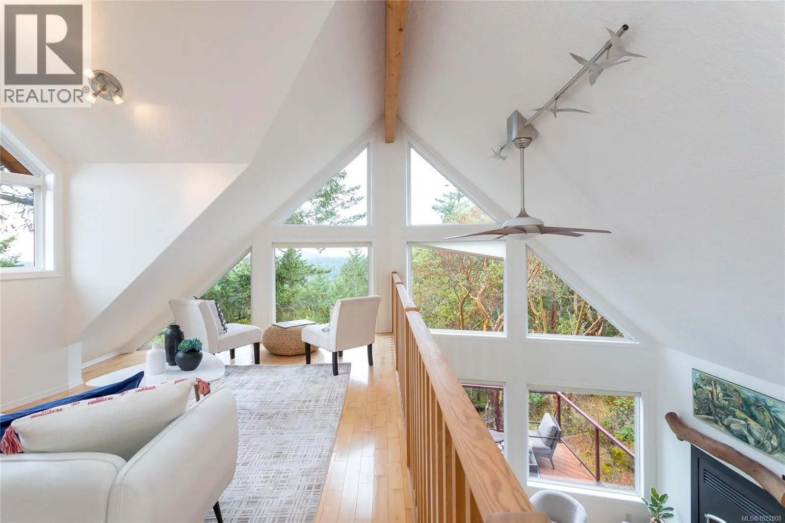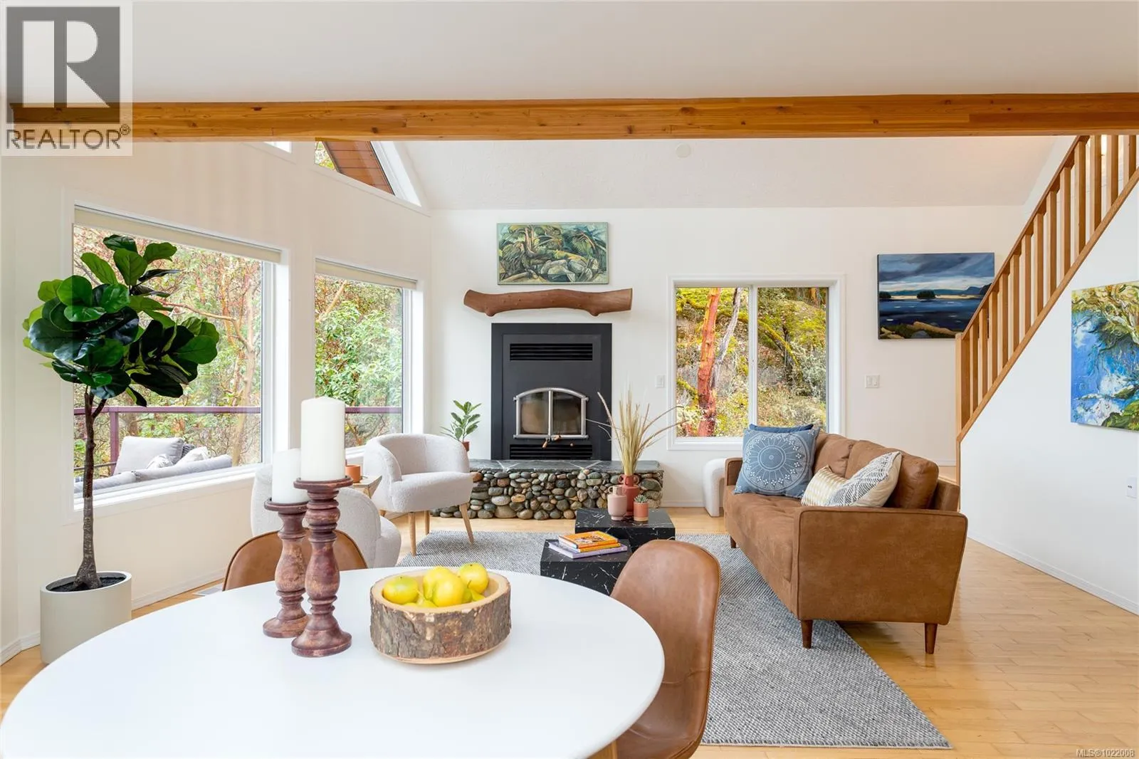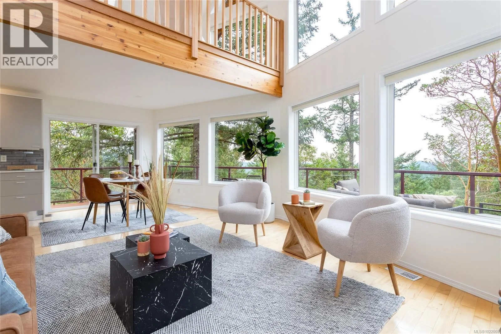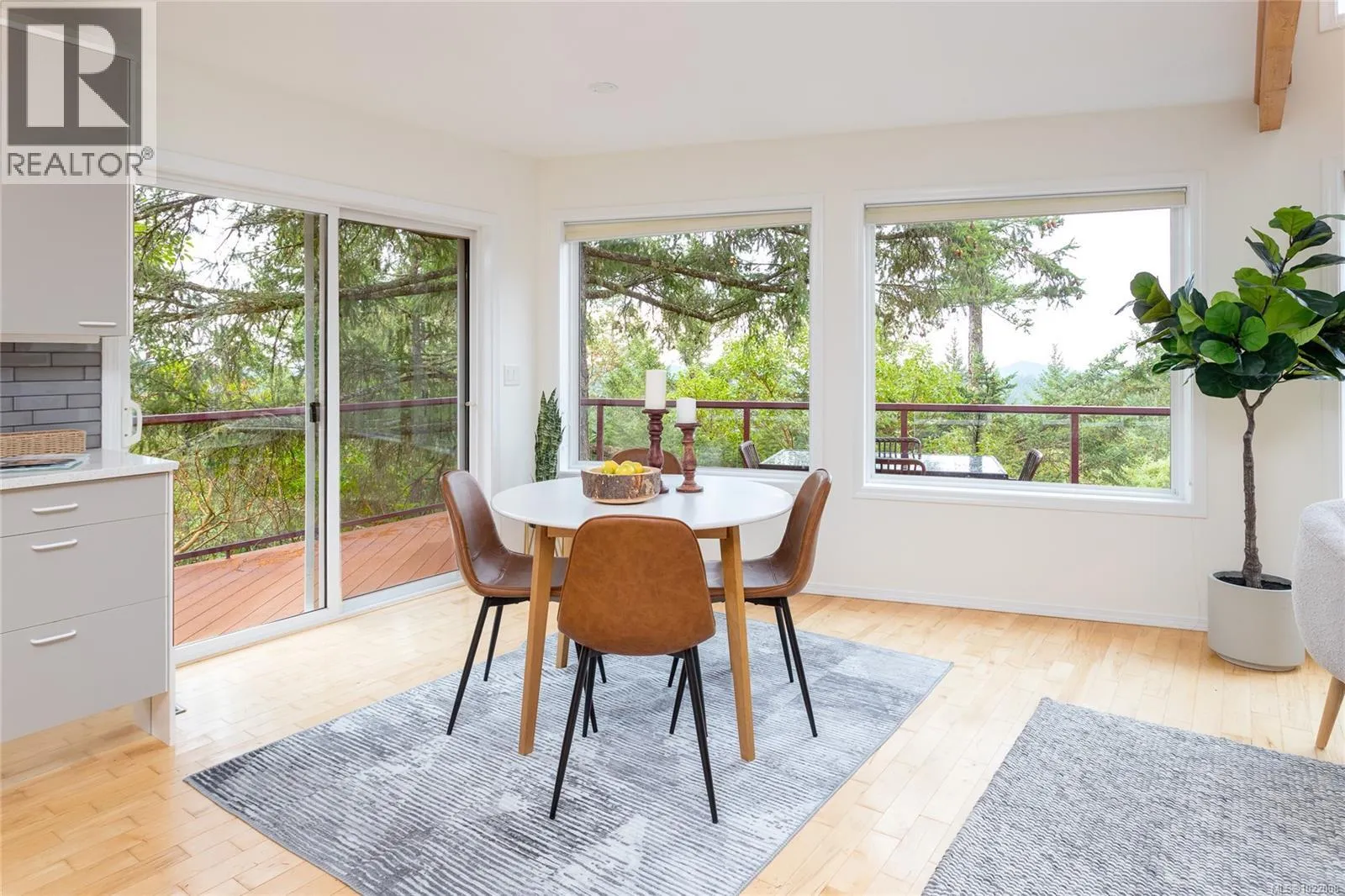 Tucked away in the Eastern Highlands, this inviting 2005 custom cedar home sits on nearly 4 ACRES of pristine woodland, offering a rare sense of privacy while still being just minutes from everyday amenities! Surrounded by mature arbutus and Douglas fir forest, the property feels peaceful and grounded, with nature truly at your doorstep. Perched on a gentle rise above the trees, the home enjoys sweeping outlooks and beautiful sunsets from the expansive SOUTH-FACING wrap-around deck, perfect for entertaining, morning coffee, or quiet evenings soaking in the views. Inside, floor-to-ceiling windows overlook the forest and fill the main living spaces with natural light, creating a seamless connection between indoors and out. Maple hardwood floors, vaulted ceilings with exposed beams, and a striking custom river-rock fireplace with an efficient wood insert add warmth, character, and a sense of timeless craftsmanship. The spacious primary bedroom offers a true retreat, complete with a 3-piece ensuite and a peaceful sitting area framed by floor-to-ceiling windows looking out to the trees. With a HEAT PUMP for year-round comfort and a newly completed driveway, this very special property blends comfort, care, and natural beauty into a private, retreat-like setting. A rare opportunity for those seeking space, serenity, and a meaningful connection to nature, without sacrificing convenience! Book your viewing today! (id:27476)