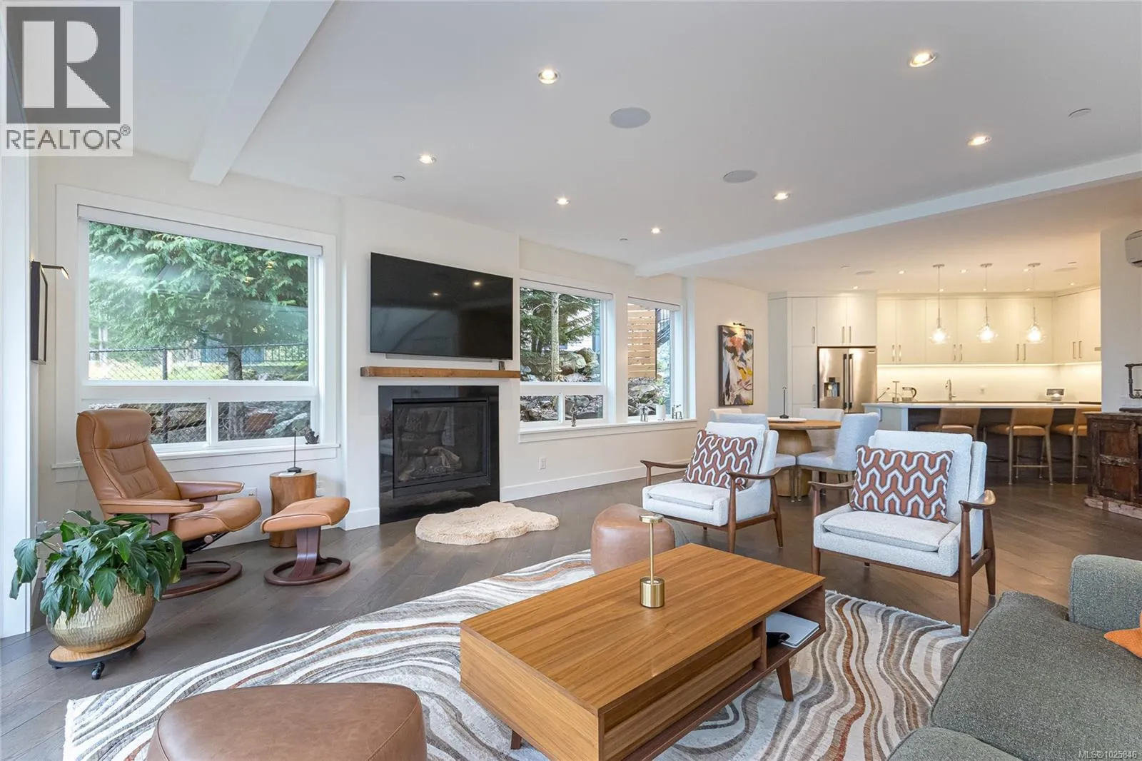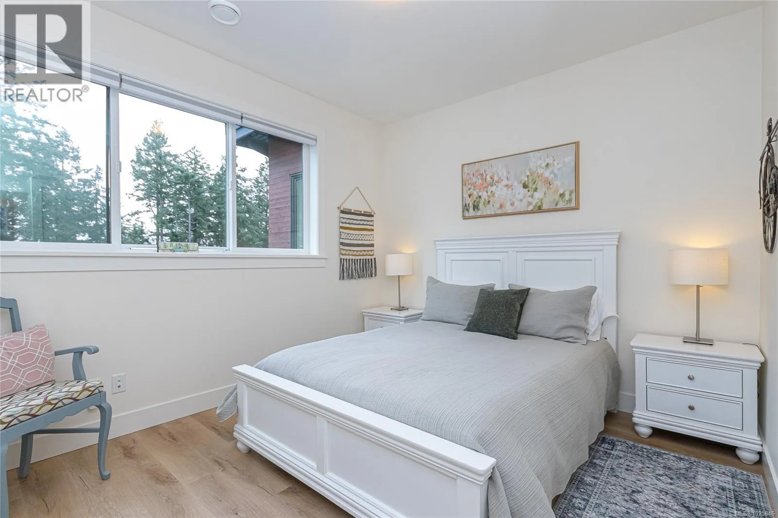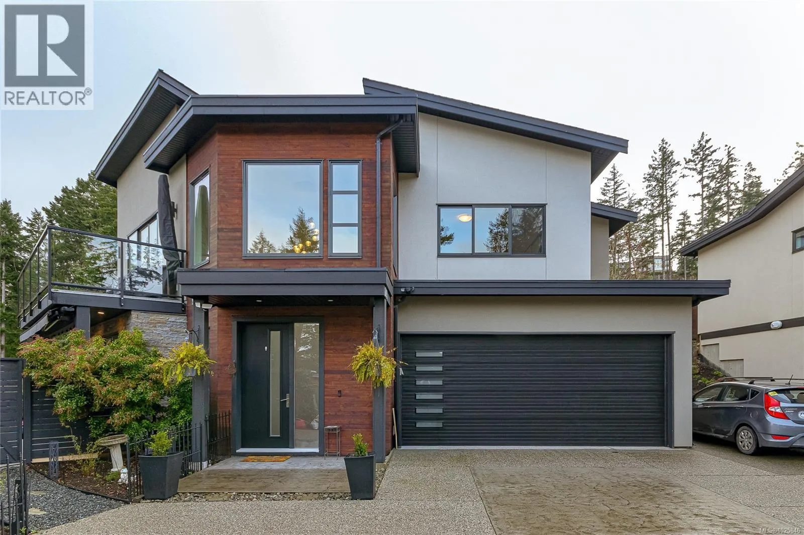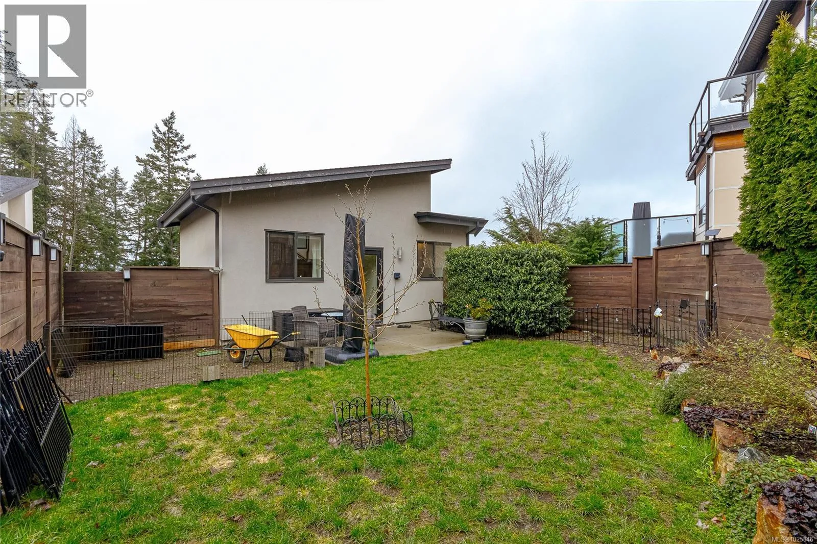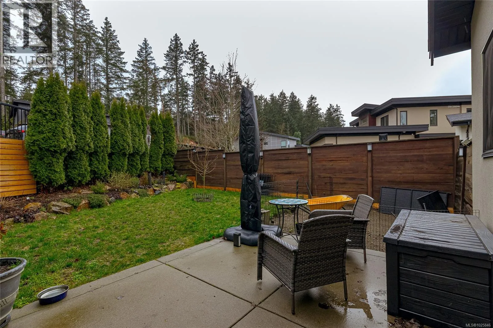 Executive Bear Mountain Resort living with this stunning 3-bedroom, 3-bathroom West Coast Contemporary home in the much sought-after Rivers Crossing community! Offering 2,097 sq ft, this residence features many upgrades and new appliances. Hardwood floors, quartz countertops, and a bright open-concept layout with oversized sliding doors that showcase beautiful forest views and create seamless indoor-outdoor living. The sleek kitchen boasts two-toned cabinetry, stainless steel appliances, and a large island with bar seating. Upstairs offers 3 bedrooms and 2 baths, including a spacious primary suite with walk-in closet, spa-inspired ensuite with standalone tub, and private balcony. Enjoy year-round comfort with a heat pump, plus a double garage with EV charger and wiring for a hot tub. Rare TWO separate, fully fenced yards on each level to enjoy the outdoors. Walk to Westin hotel, golf courses, restaurants, farmer's market, trails, and sports centre with outdoor pool. (id:27476)