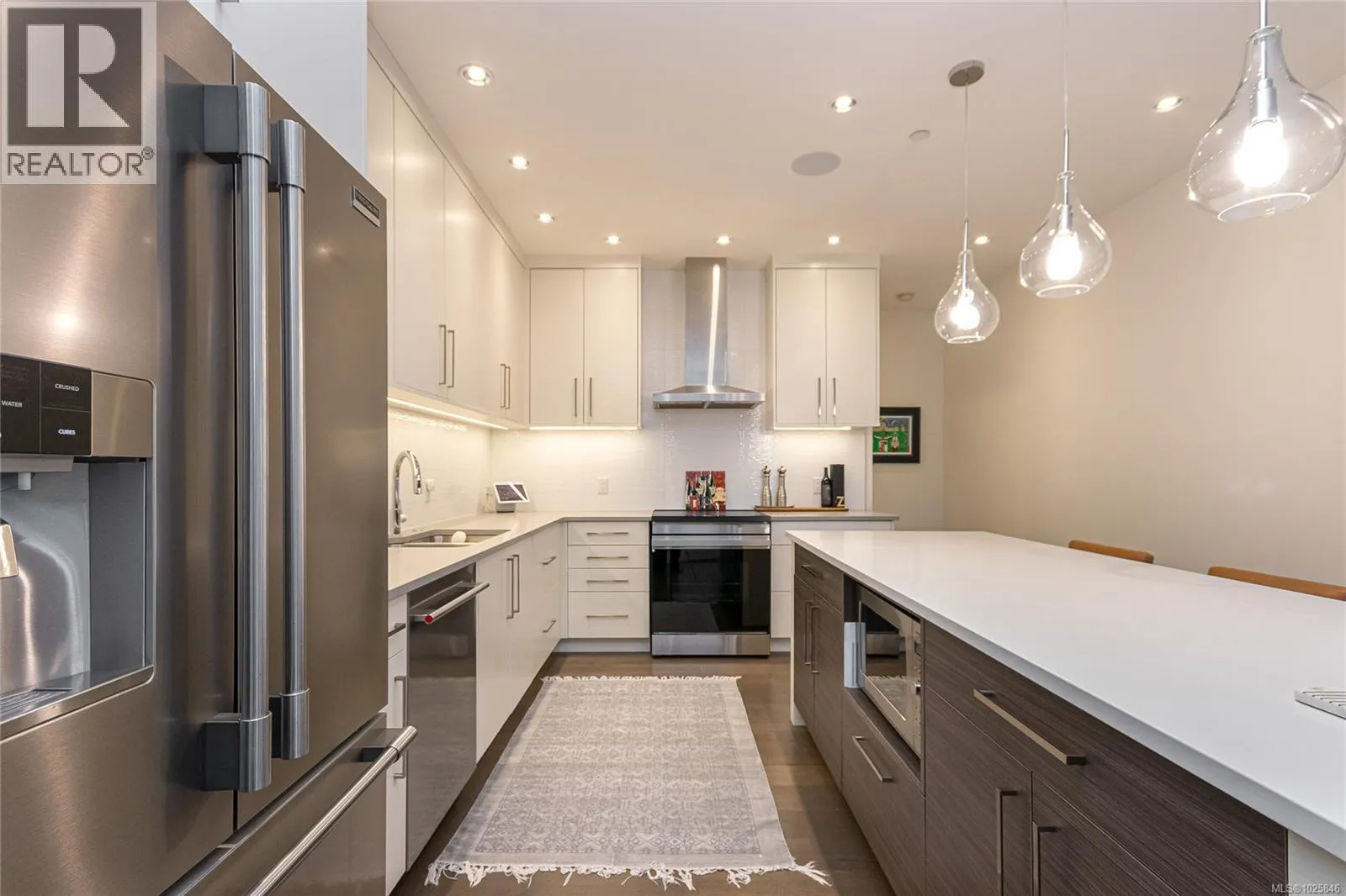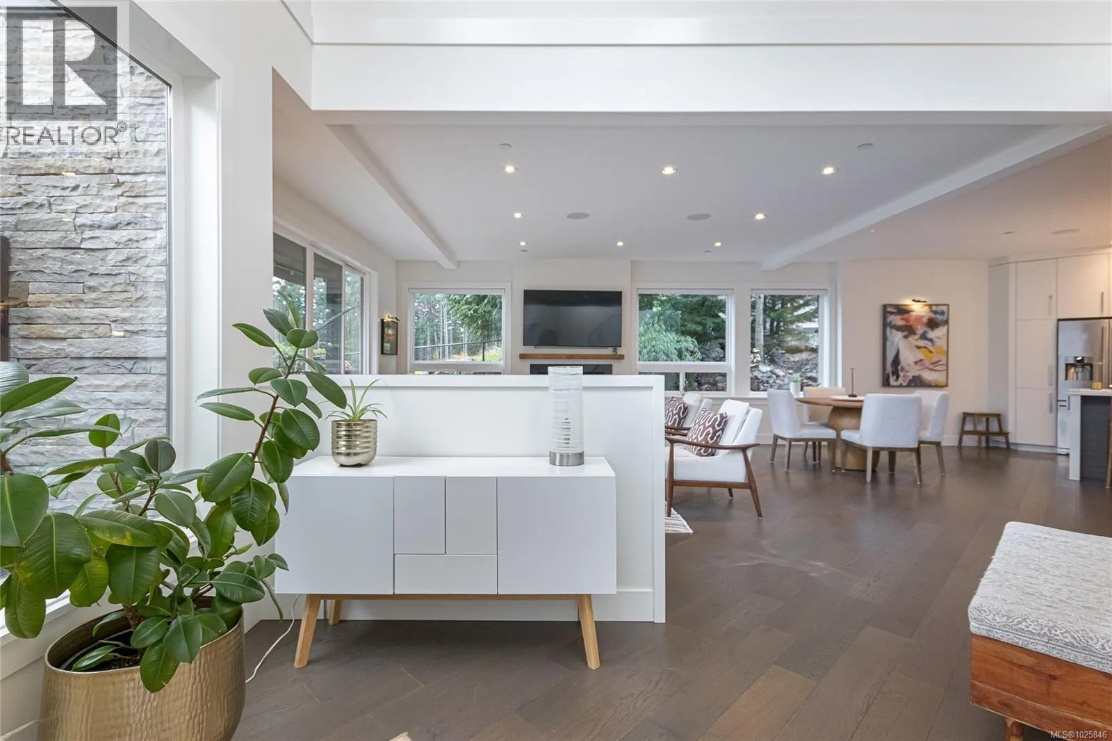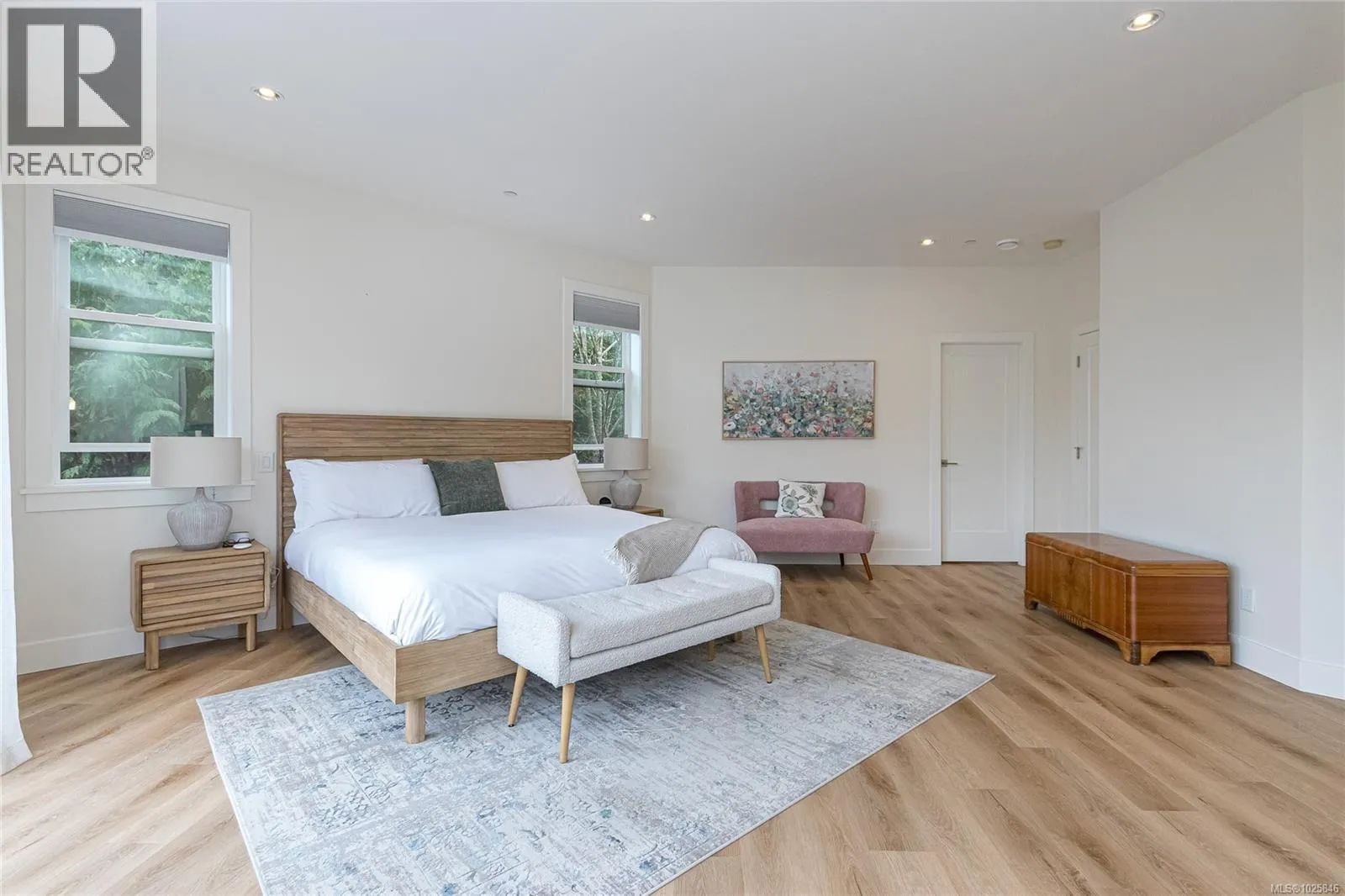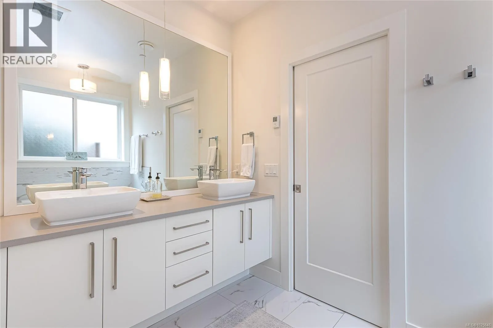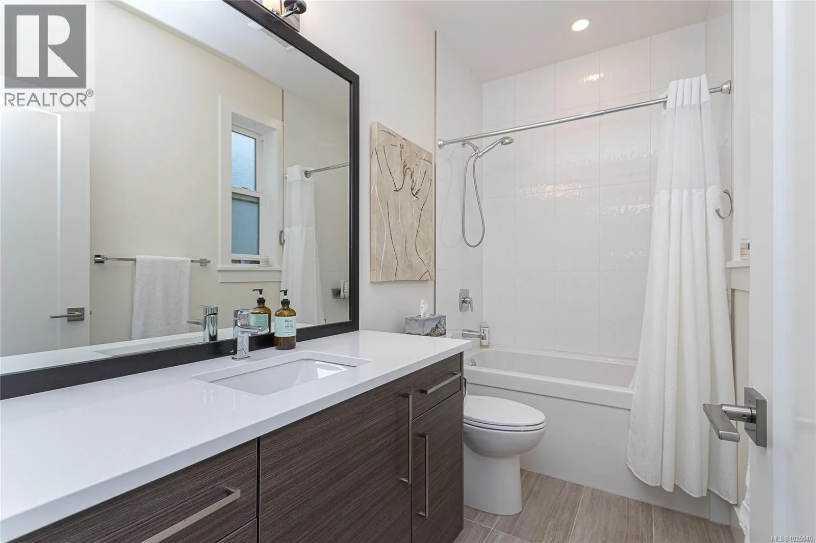 Executive Bear Mountain Resort living with this stunning 3-bedroom, 3-bathroom West Coast Contemporary home in the much sought-after Rivers Crossing community! Offering 2,097 sq ft, this residence features many upgrades and new appliances. Hardwood floors, quartz countertops, and a bright open-concept layout with oversized sliding doors that showcase beautiful forest views and create seamless indoor-outdoor living. The sleek kitchen boasts two-toned cabinetry, stainless steel appliances, and a large island with bar seating. Upstairs offers 3 bedrooms and 2 baths, including a spacious primary suite with walk-in closet, spa-inspired ensuite with standalone tub, and private balcony. Enjoy year-round comfort with a heat pump, plus a double garage with EV charger and wiring for a hot tub. Rare TWO separate, fully fenced yards on each level to enjoy the outdoors. Walk to Westin hotel, golf courses, restaurants, farmer's market, trails, and sports centre with outdoor pool. (id:27476)