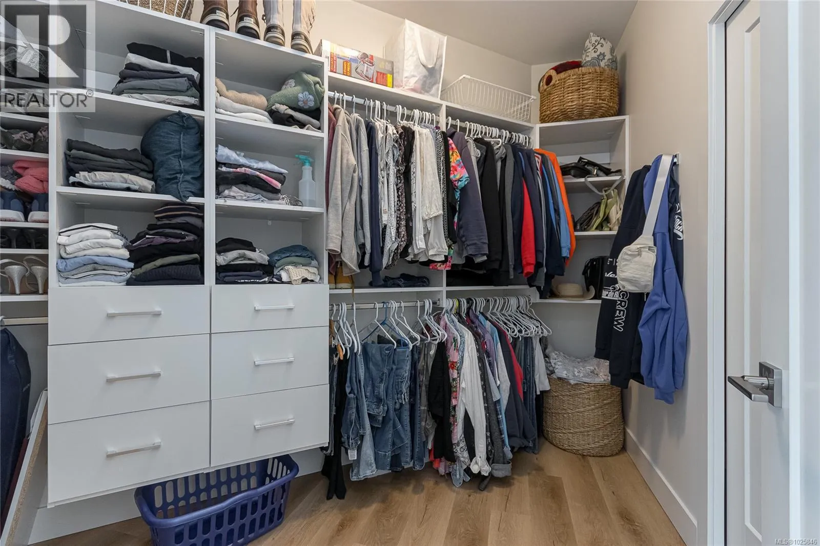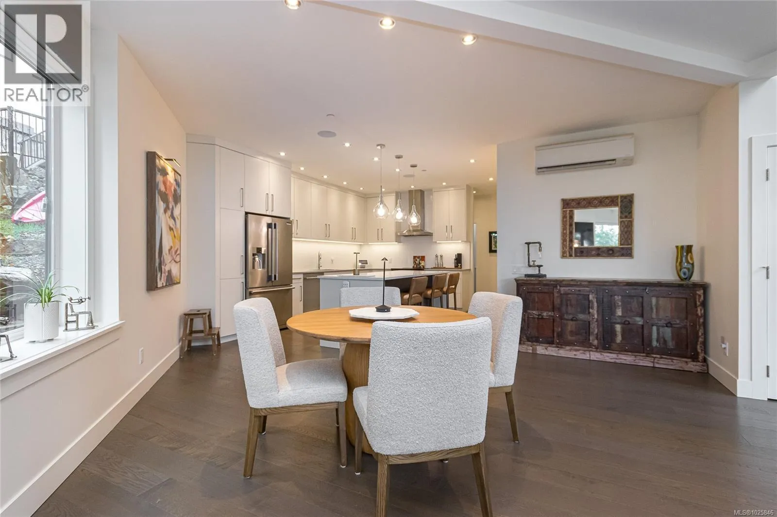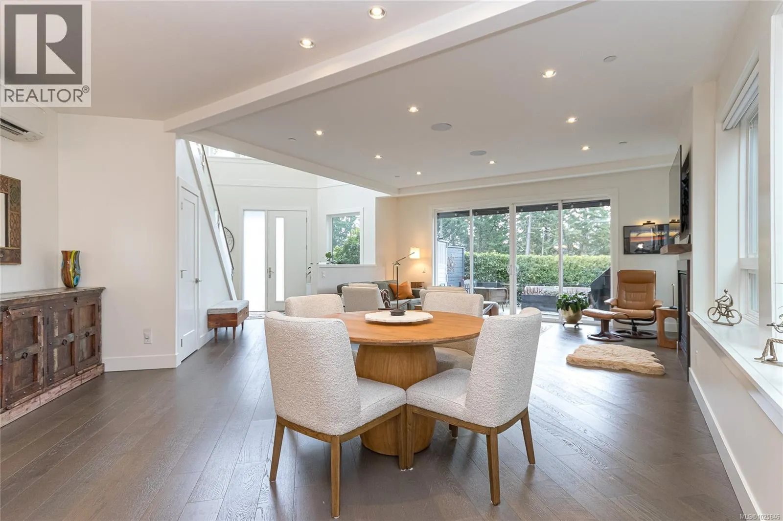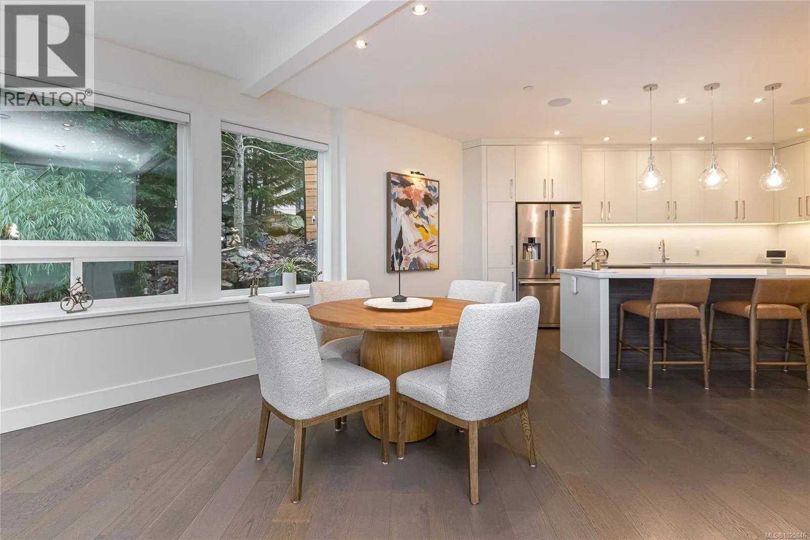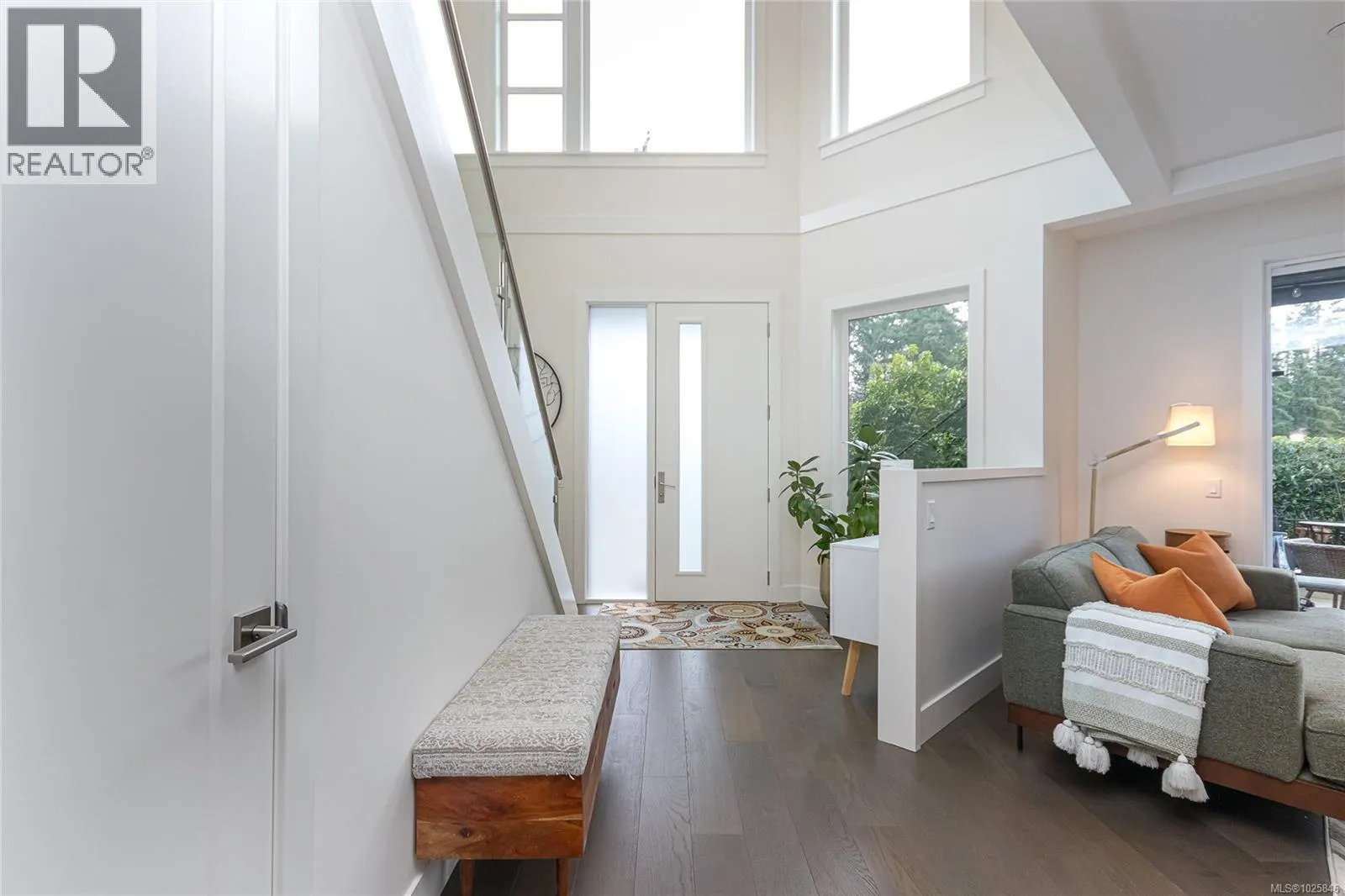 Executive Bear Mountain Resort living with this stunning 3-bedroom, 3-bathroom West Coast Contemporary home in the much sought-after Rivers Crossing community! Offering 2,097 sq ft, this residence features many upgrades and new appliances. Hardwood floors, quartz countertops, and a bright open-concept layout with oversized sliding doors that showcase beautiful forest views and create seamless indoor-outdoor living. The sleek kitchen boasts two-toned cabinetry, stainless steel appliances, and a large island with bar seating. Upstairs offers 3 bedrooms and 2 baths, including a spacious primary suite with walk-in closet, spa-inspired ensuite with standalone tub, and private balcony. Enjoy year-round comfort with a heat pump, plus a double garage with EV charger and wiring for a hot tub. Rare TWO separate, fully fenced yards on each level to enjoy the outdoors. Walk to Westin hotel, golf courses, restaurants, farmer's market, trails, and sports centre with outdoor pool. (id:27476)