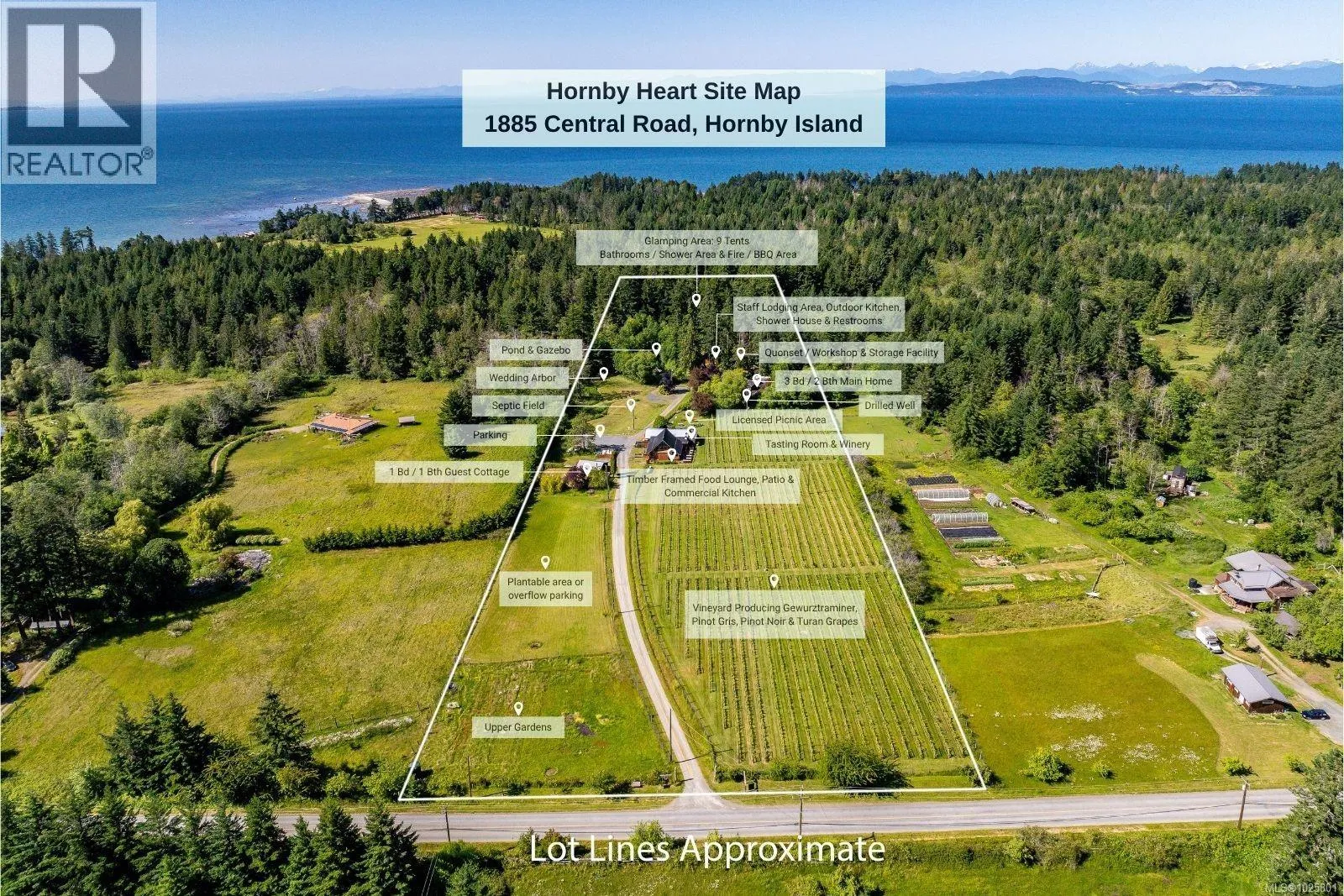 Hornby Heart Vineyard Boutique Vineyard & Lifestyle Retreat on Canadaâs West Coast: Located at 1885 Central Road on beautiful Hornby Island, British Columbia, Hornby Heart Vineyard offers a 10-acre turnkey opportunity combining a boutique vineyard, glamping retreat, and culinary venue. The property features four acres of mature vines, along with a small-batch winery, tasting room, production facility, and picnic license. Accommodations include nine fully furnished luxury glamping tents, a private three-bedroom character home, and an additional one-bedroom guest cabin. A timber-frame restaurant with a chefâs kitchen, Bravo Forno pizza oven, full-service bar, and indoor/outdoor dining areas provide a stunning setting for weddings, private events, and farm-to-table experiences. With established revenue streams from wine sales, lodging, and events, the sale includes the brand, equipment, and loyal clientele, offering seasonal or year-round operating flexibility. Hornby Island is a sought-after destination known for its clear waters, vibrant community, and natural beauty. This is an exceptional lifestyle investment opportunity, also eligible for foreign investors seeking Canadian business immigration options (id:27476)