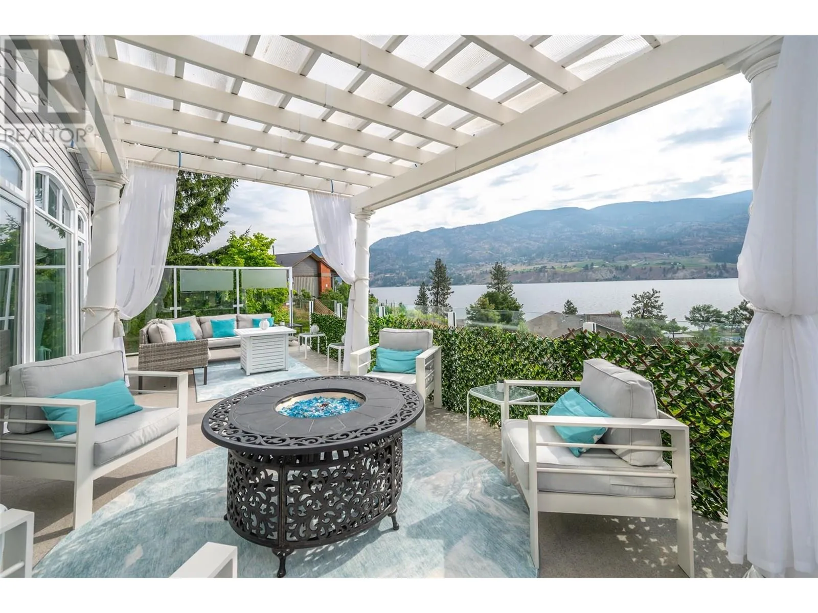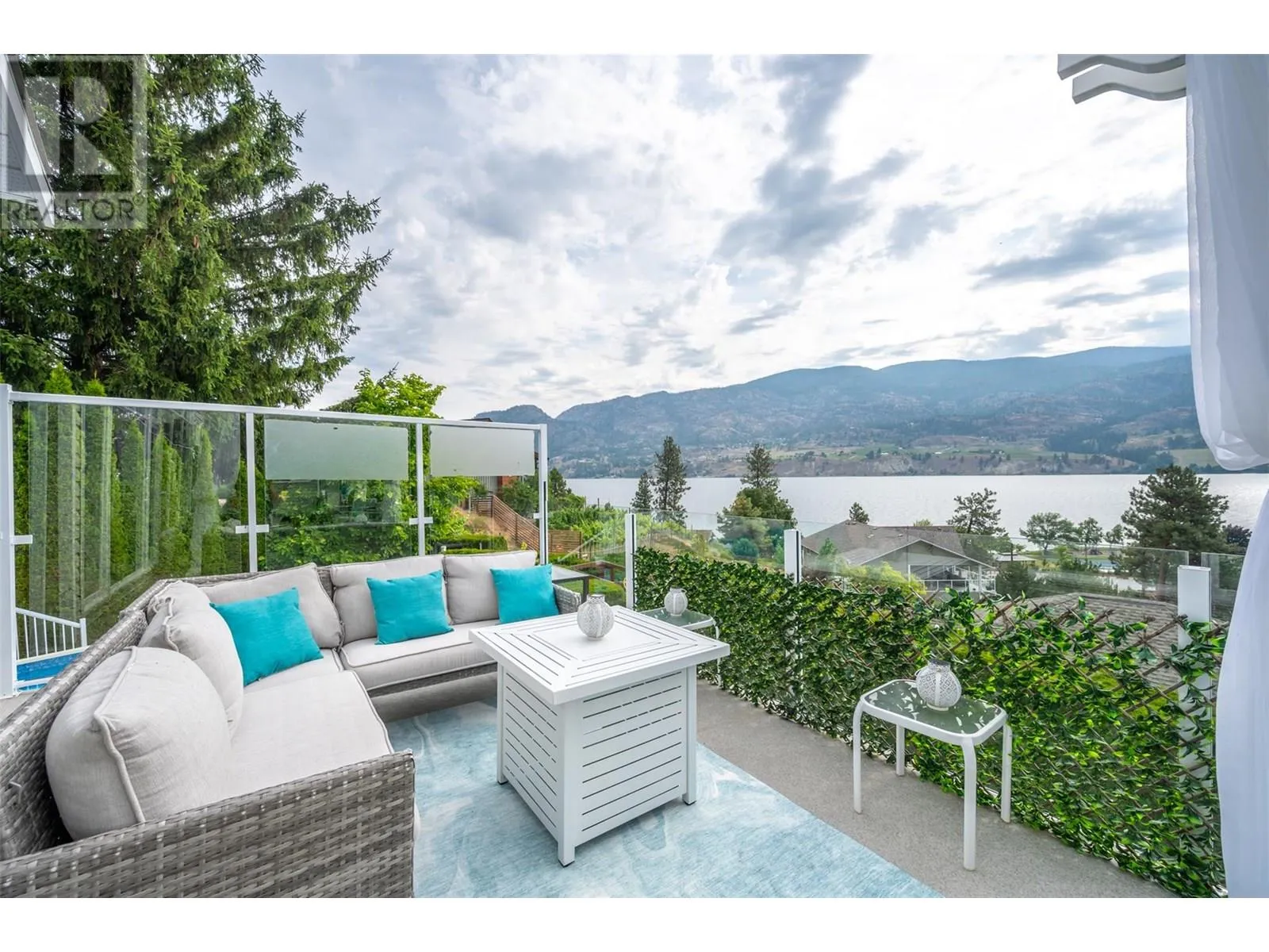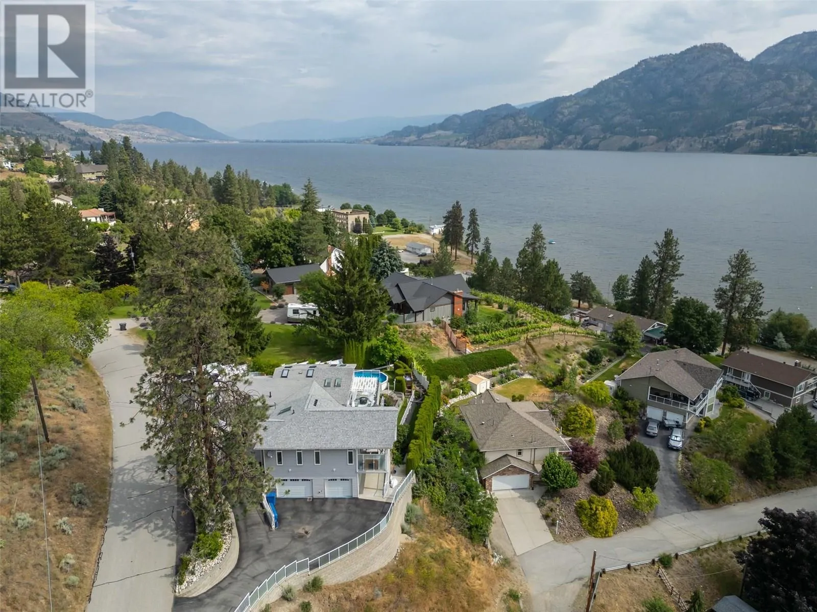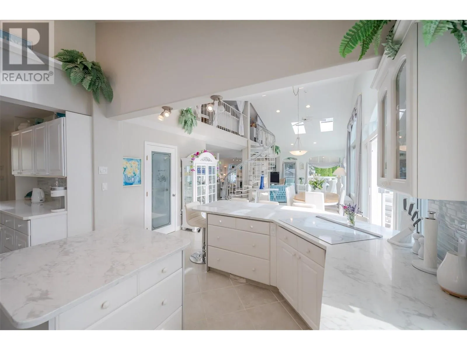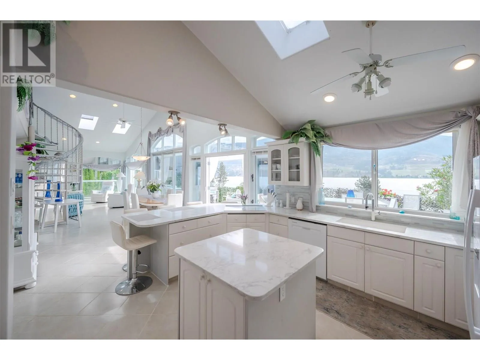 This stunning, entertainerâs dream home offers a spacious open-concept main floor with a bright living and kitchen area featuring a spiral staircase to an upper loft/bedroom. Expansive windows, skylights, and deck access from living areas. The chefâs kitchen boasts a walk-in pantry, island, built-in double oven, electric cooktop, and ample storage, complemented by a wet bar with a double-door fridge, double dishwasher, sink and more storage. The main level includes a luxurious primary suite with balcony access, walk-in closet, and a 5-piece ensuite with a soaker tub, plus two additional bedroomsâone with its own ensuiteâa den, laundry room, and a 3-piece bath. The daylight basement features a large rec room, another bedroom and 4-piece bath, laundry with sink and storage, and a fully equipped in-law suite with its own kitchen, dining, bedroom, and bath. Set on a large lot with lakeviews, mature landscaping, RV and open parking, a double garage with workshop, an above-ground pool, hot tub, covered patio, and multiple outdoor living spaces, this home is ideally located near Kaleden beach and recreationâperfect for those seeking luxury, comfort, and functionality. Contact the listing agent to view! (id:27476)