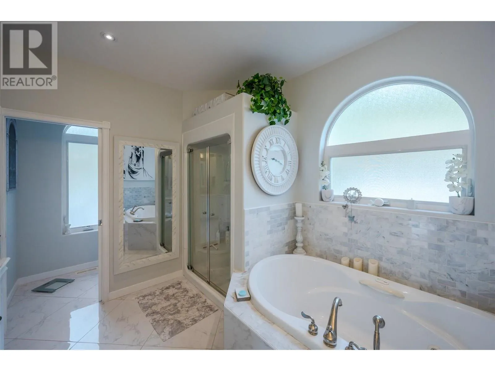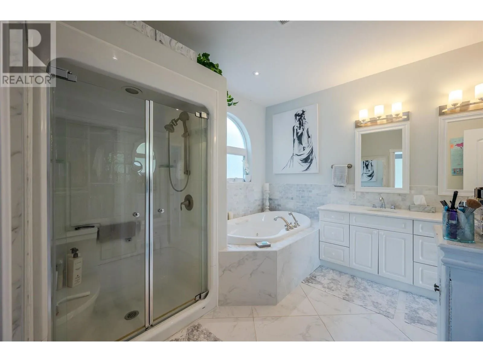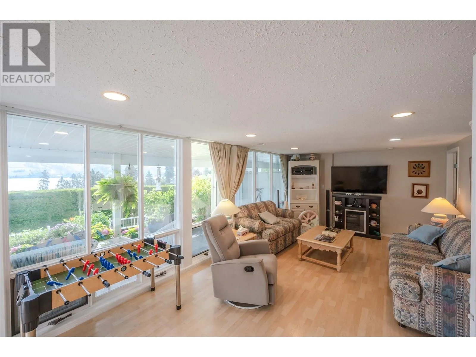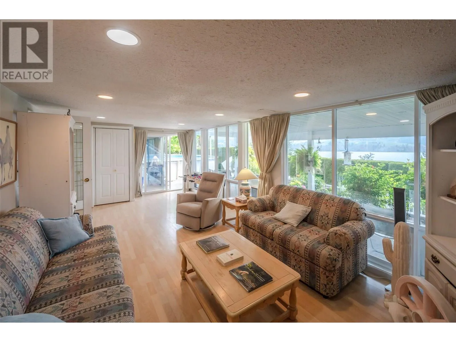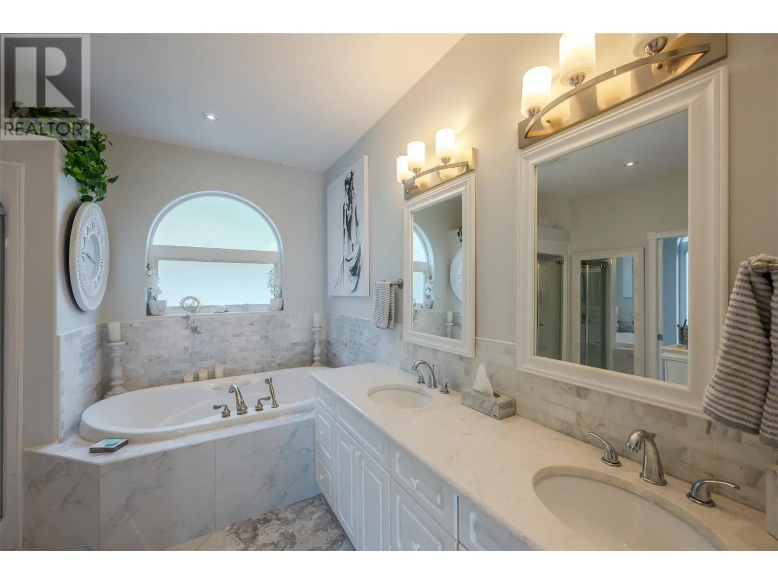 This stunning, entertainerâs dream home offers a spacious open-concept main floor with a bright living and kitchen area featuring a spiral staircase to an upper loft/bedroom. Expansive windows, skylights, and deck access from living areas. The chefâs kitchen boasts a walk-in pantry, island, built-in double oven, electric cooktop, and ample storage, complemented by a wet bar with a double-door fridge, double dishwasher, sink and more storage. The main level includes a luxurious primary suite with balcony access, walk-in closet, and a 5-piece ensuite with a soaker tub, plus two additional bedroomsâone with its own ensuiteâa den, laundry room, and a 3-piece bath. The daylight basement features a large rec room, another bedroom and 4-piece bath, laundry with sink and storage, and a fully equipped in-law suite with its own kitchen, dining, bedroom, and bath. Set on a large lot with lakeviews, mature landscaping, RV and open parking, a double garage with workshop, an above-ground pool, hot tub, covered patio, and multiple outdoor living spaces, this home is ideally located near Kaleden beach and recreationâperfect for those seeking luxury, comfort, and functionality. Contact the listing agent to view! (id:27476)