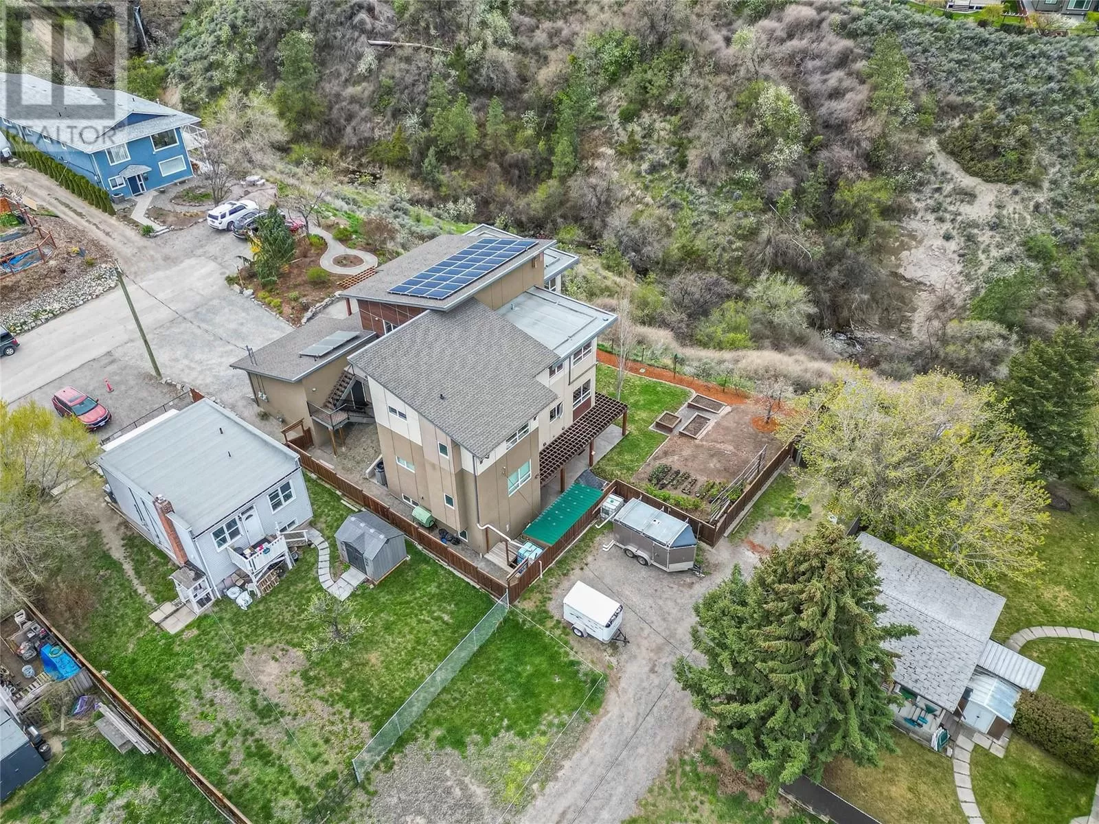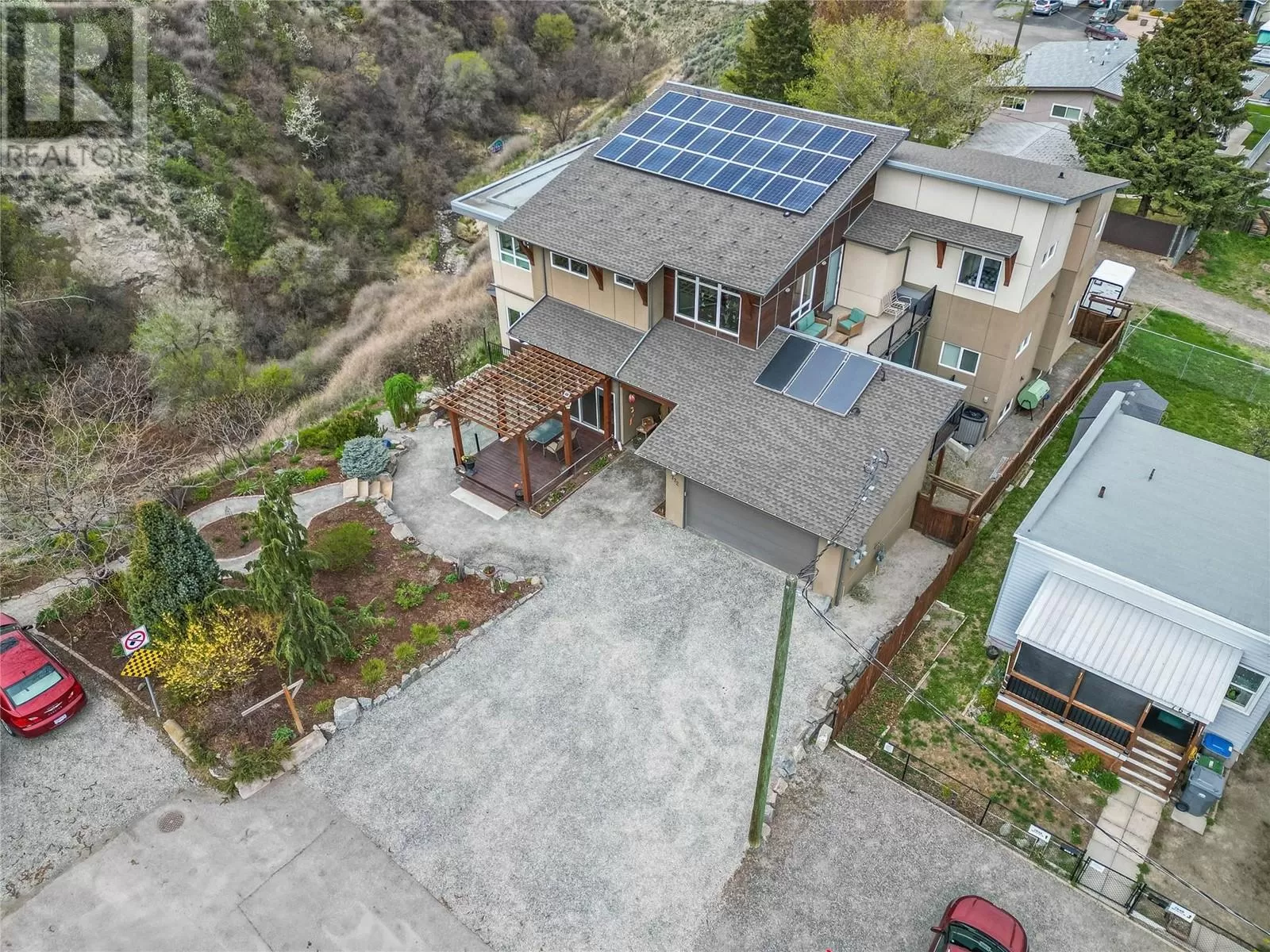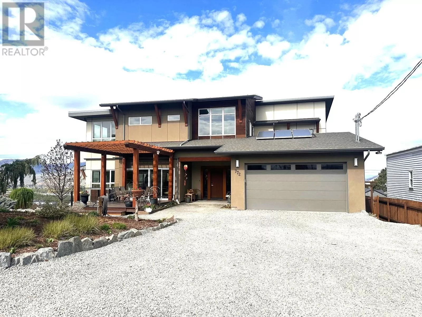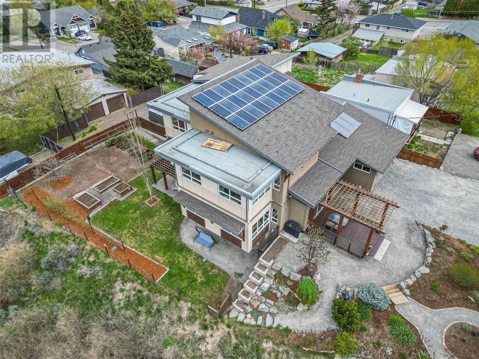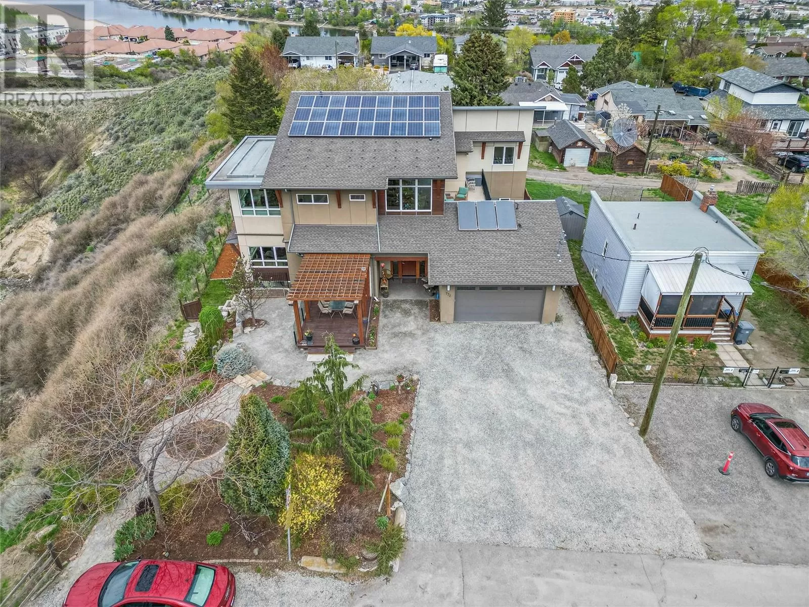 ONE OF A KIND! This is the perfect home for the large family or group living Main floor boasts a breathtaking open plan with huge windows to capture the stunning views. The large island kitchen boasts 2 dishwashers & stainless appliances plus a large walk in pantry for great storage. Wall of cabinets with clever microwave cabinet built in. The spacious living and dining room are great for the largest gatherings with panoramic views from every window. 2 large bedrooms with 4pc ensuites on the main plus 2pc guest bath and office area with outer door. Central shaft for future elevator provides great storage on each level till elevator is desired. Upper floor features 4 more deluxe bedrooms each with a 4pc ensuite and large closet. Upper laundry room, plus a dramatic library that overlooks the vaulted ceiling with feature origami crane mobile. Outer door to relaxation deck and external staircase. Basement level enjoys access to the fenced yard & gardens with UG sprinklers for easy care. 2 more bedrooms down with shared 4pc bath, large rec room and laundry room. This area designed for future suite if desired. Utility room has components for the solar heat recovery system, Central Air, HRV system and extra storage plus featured climate controlled cold room pantry. Property comes with 9 open parking spaces plus double garage. (id:27476)